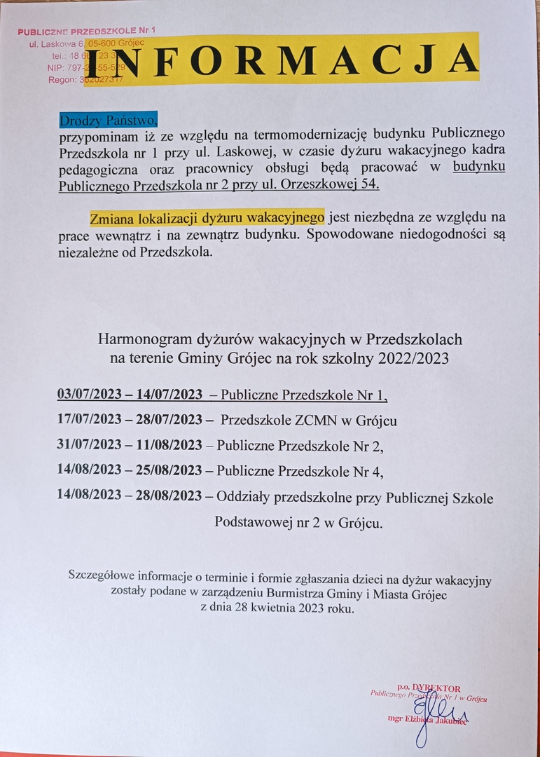 27.04.2023UWAGA !!! UWAGA !!! REKRUTACJA!!! Listy dzieci przyjętych i nieprzyjętych do Publicznego Przedszkola nr 1 w Grójcu umieszczone...