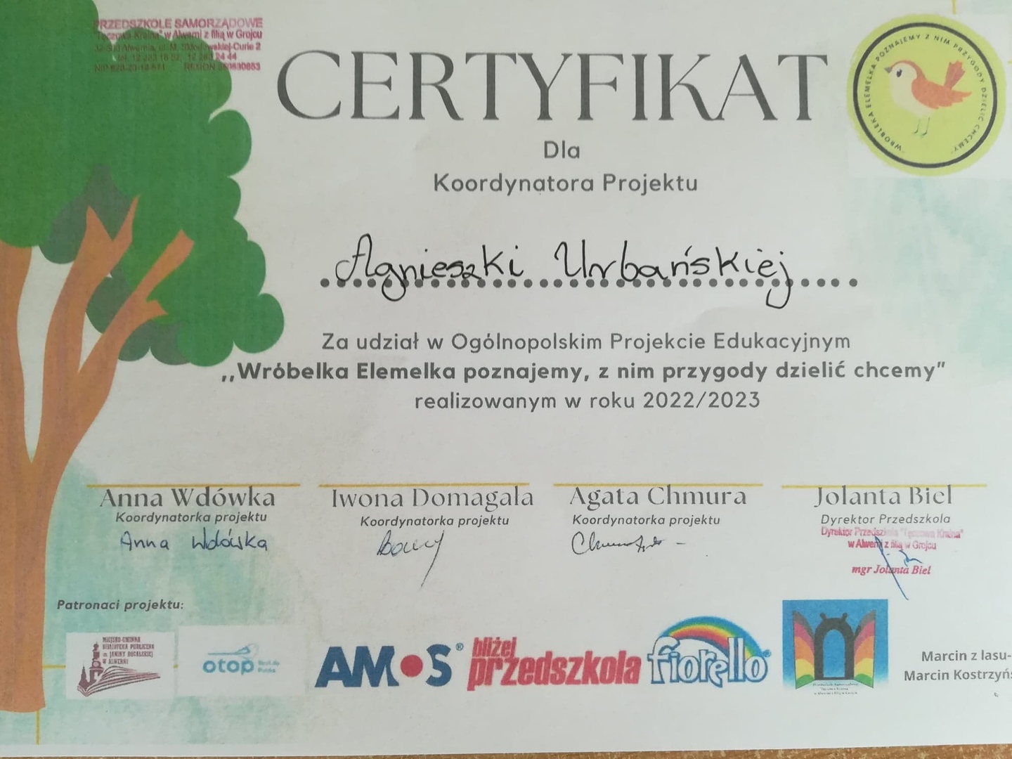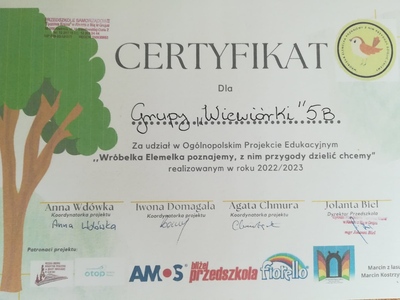 "Wróbelka Elemelka poznajemy z nim przygody dzielić chcemy" Przedszkolaki z grupy 5 latki "Wiewiórki" brały udział w projekcie edukacyjnym. Głównym celem projektu było wprowadzenie dzieci w świat literatury dziecięcej, rozbudzenie ciekawości przyrodniczej, promowanie czytelnictwa, wzbogacenie ogólnej wiedzy o świecie, poznanie roli wróbli w naszym życiu. Dzieci w ciągu roku z wielką przyjemnością wykonywały zadania projektowe.