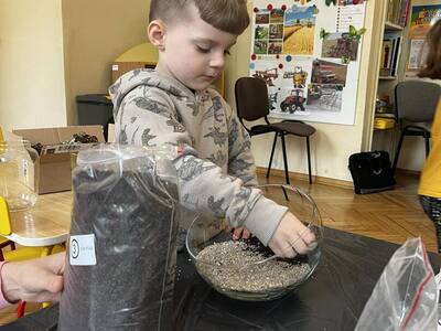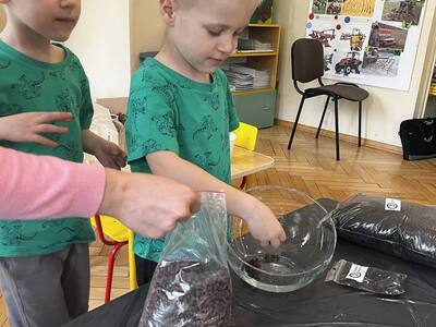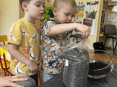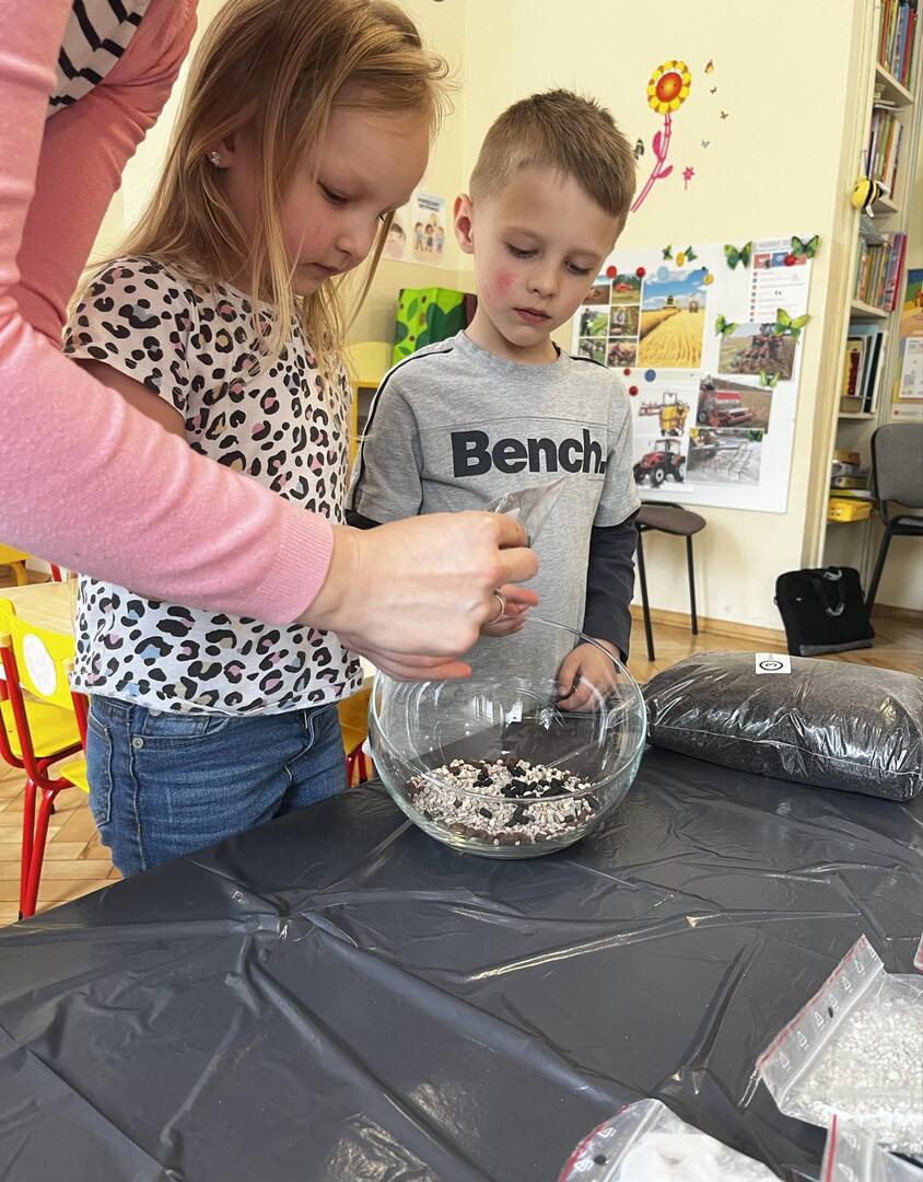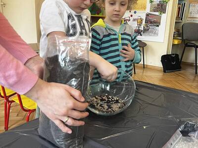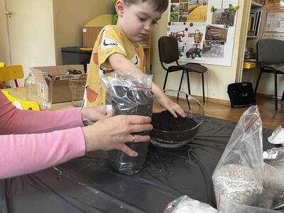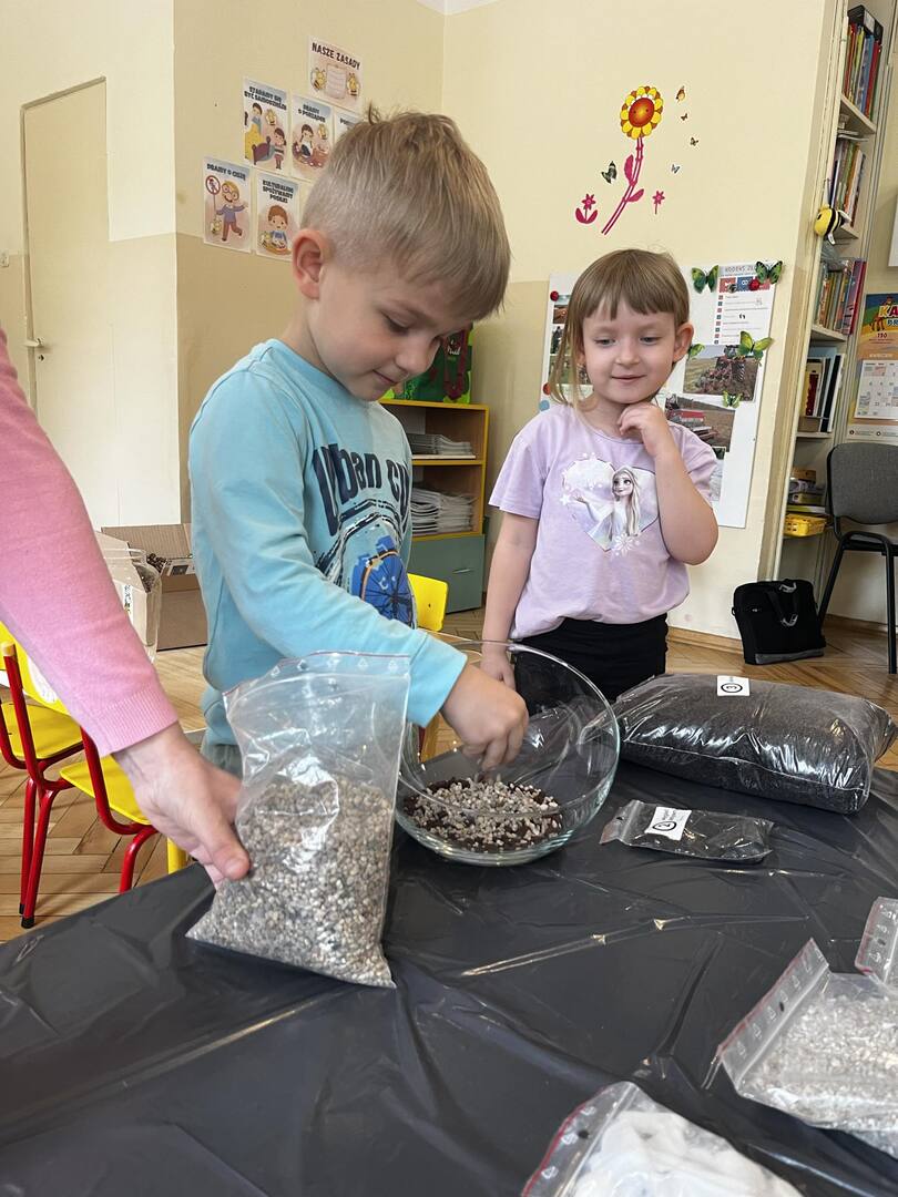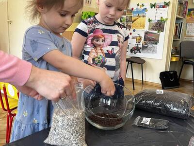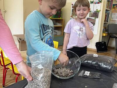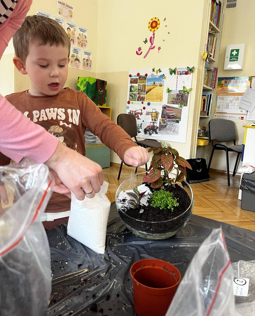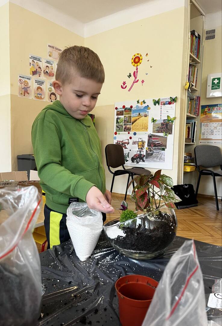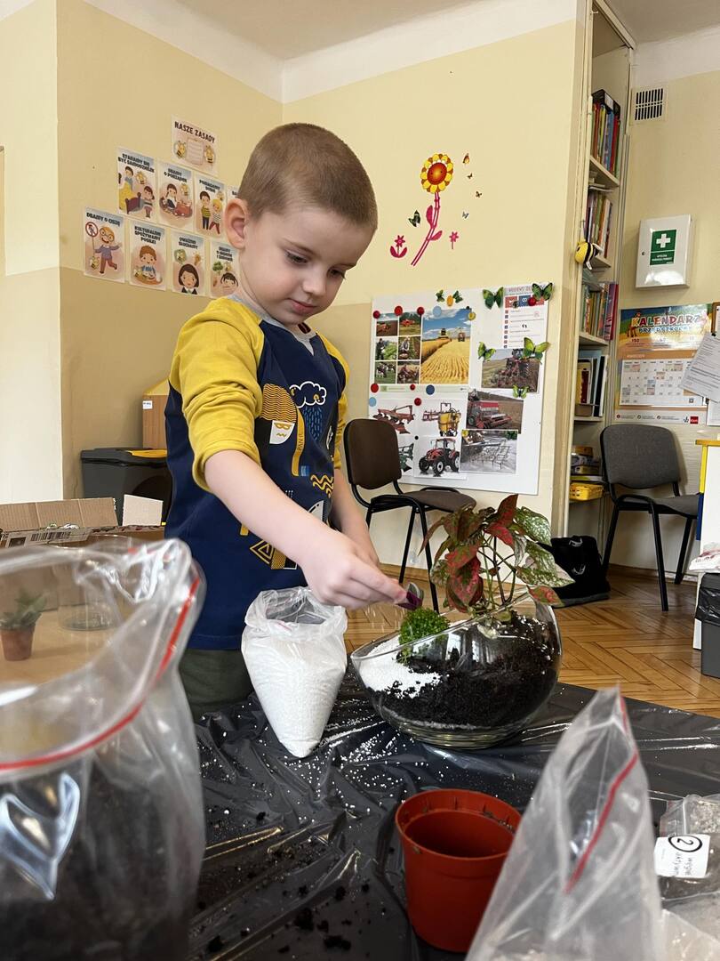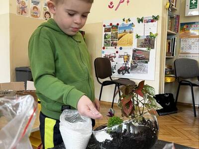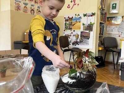 Udział w tworzeniu lasu wzięli wszyscy, każde dziecko dołożyło starań, żeby stworzyć kompozycje z ozdobnych kamyczków, żwiru, ziemi i roślinek.