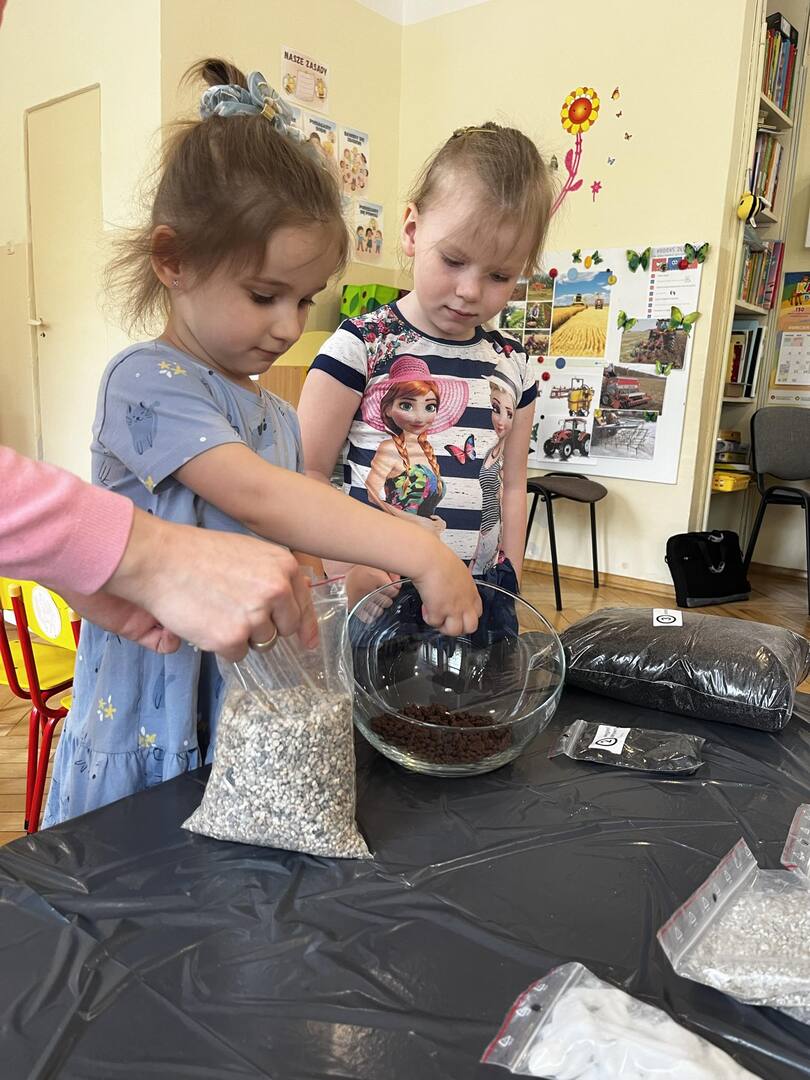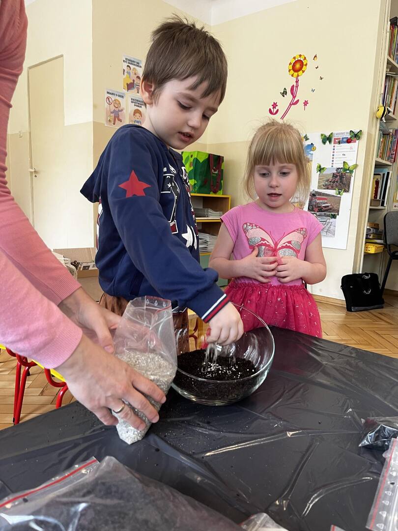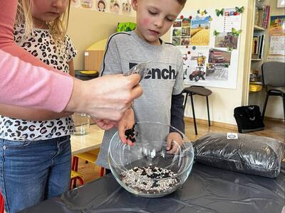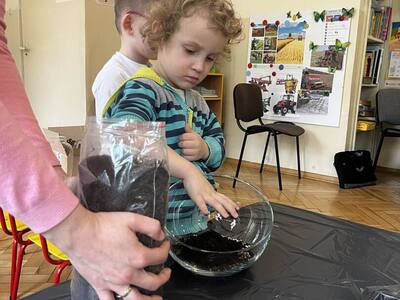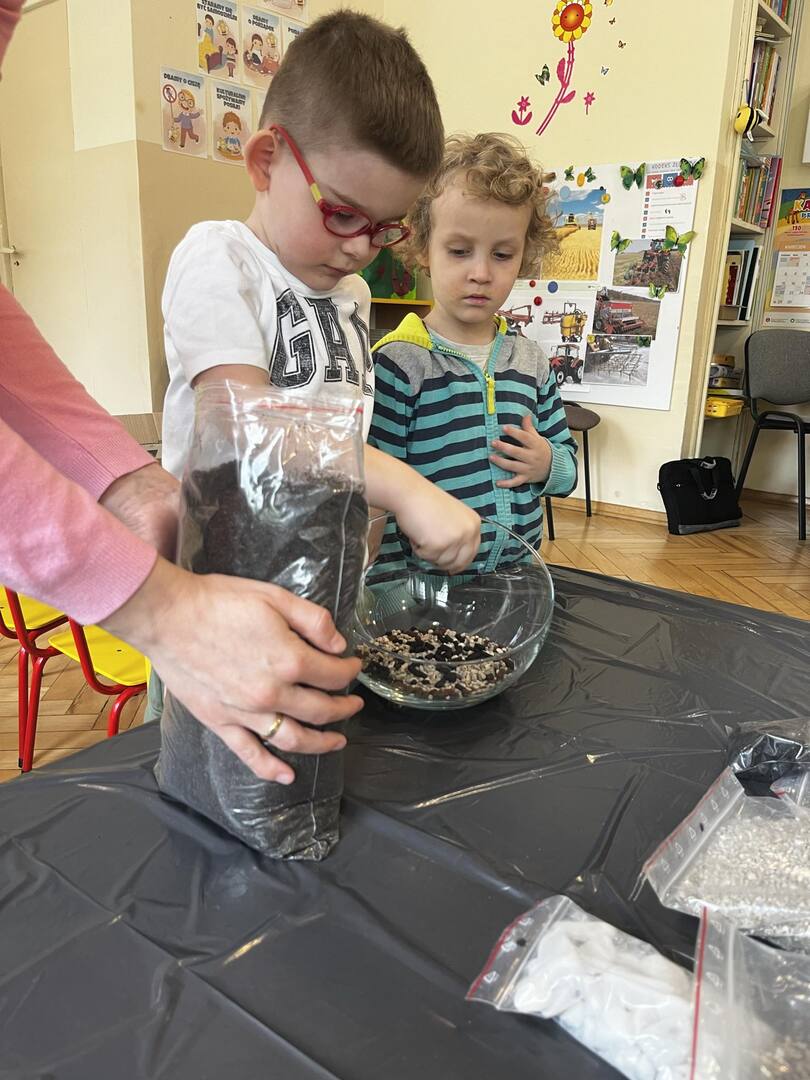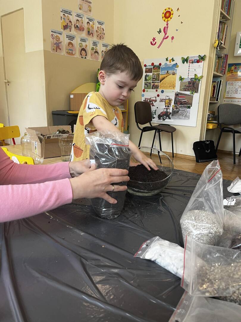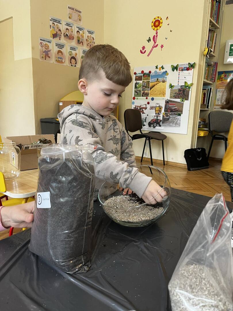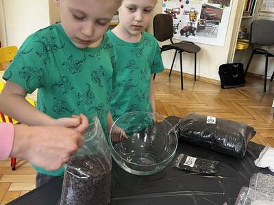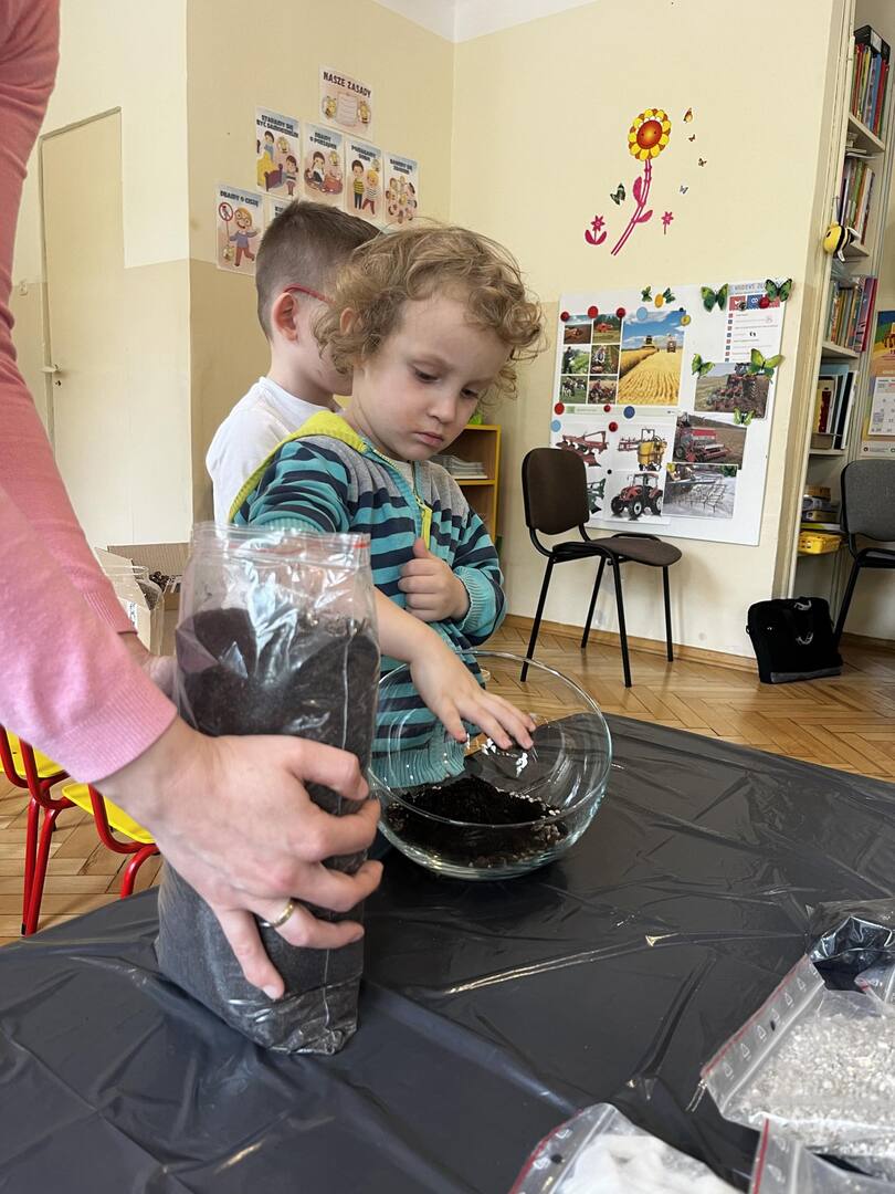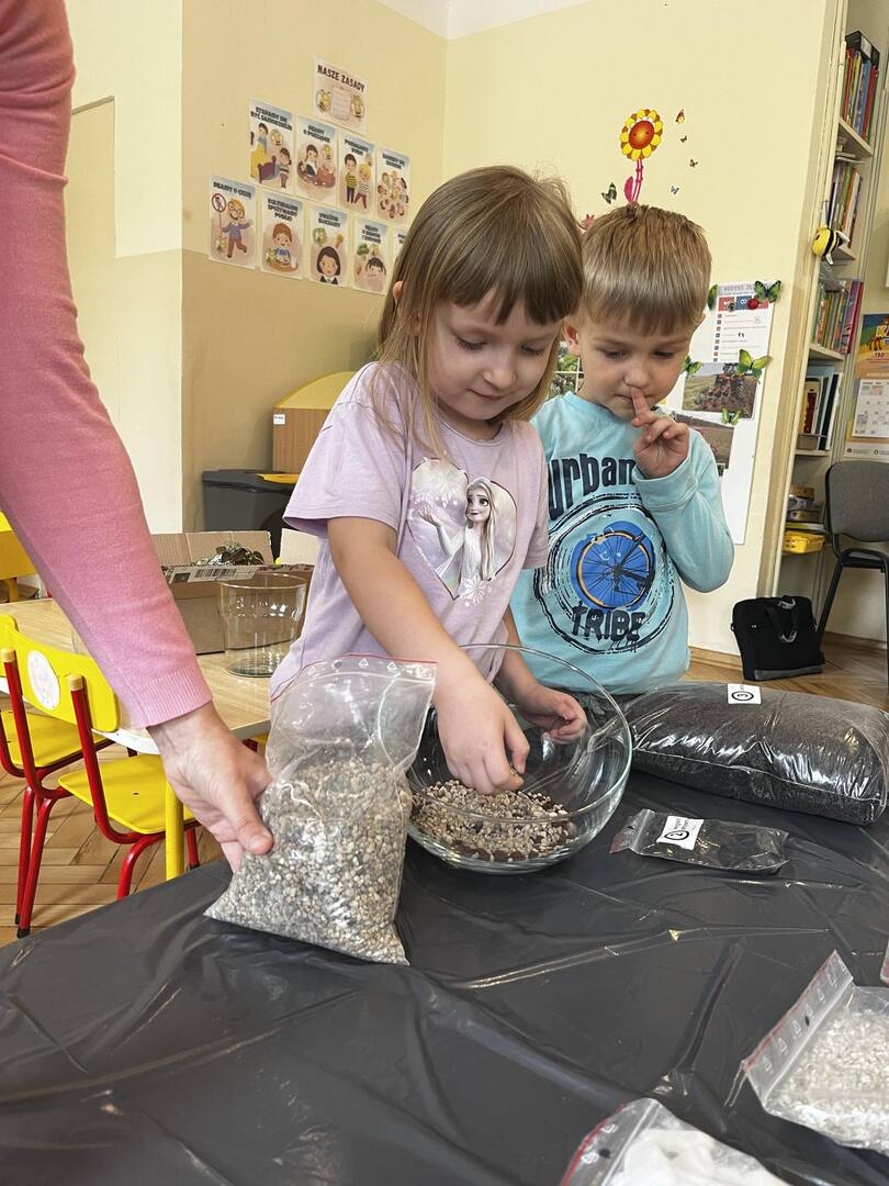 Udział w tworzeniu lasu wzięli wszyscy, każde dziecko dołożyło starań, żeby stworzyć kompozycje z ozdobnych kamyczków, żwiru, ziemi i roślinek.