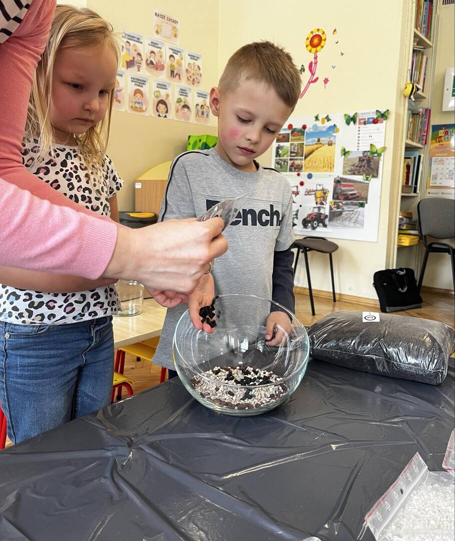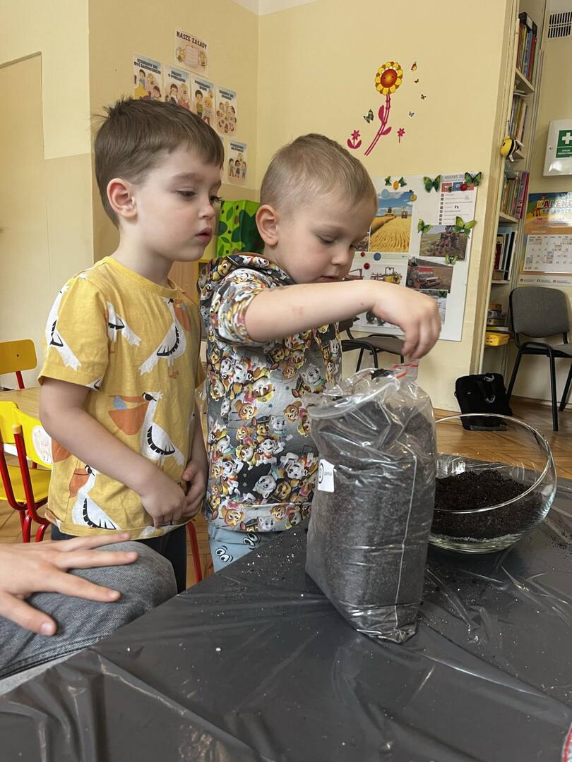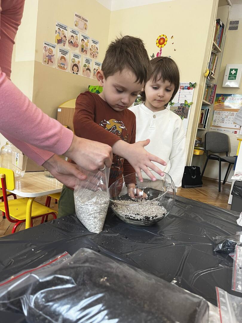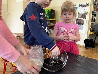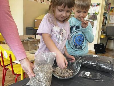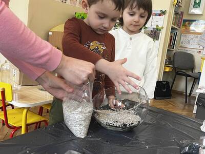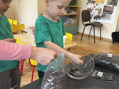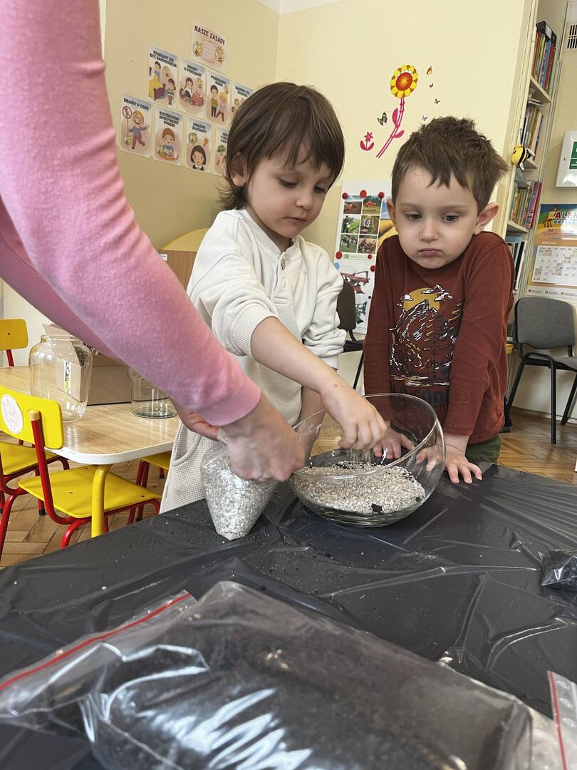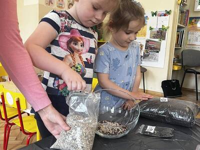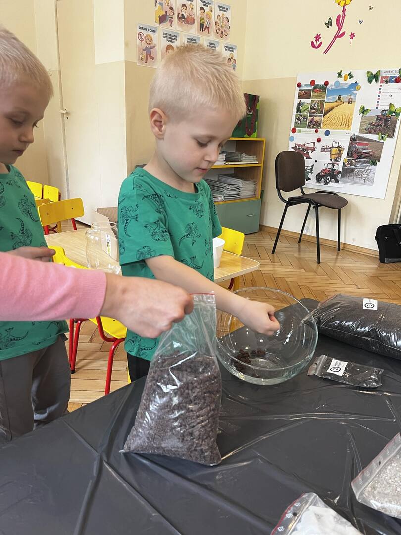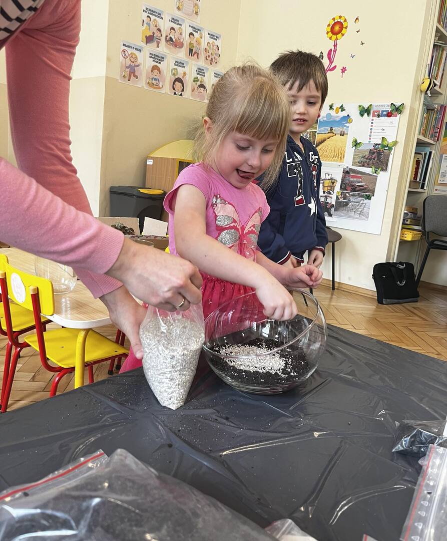 Udział w tworzeniu lasu wzięli wszyscy, każde dziecko dołożyło starań, żeby stworzyć kompozycje z ozdobnych kamyczków, żwiru, ziemi i roślinek.
