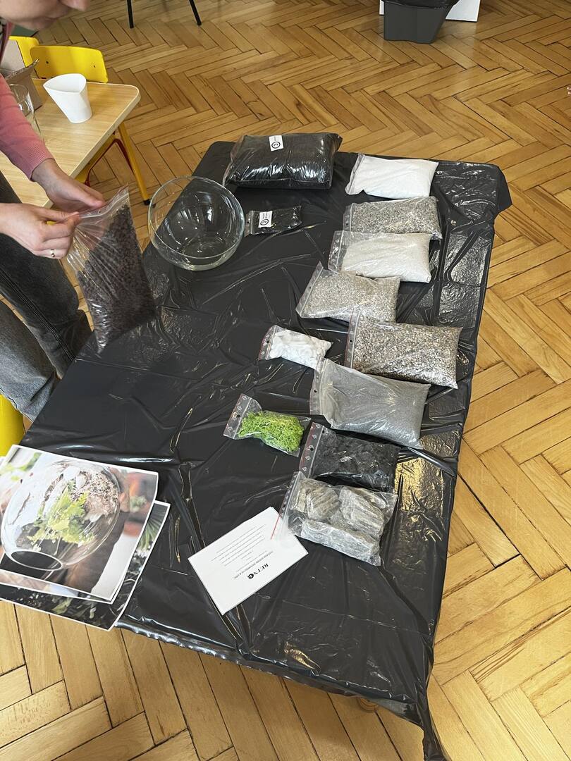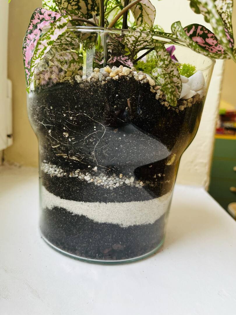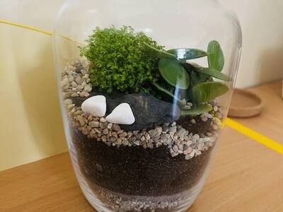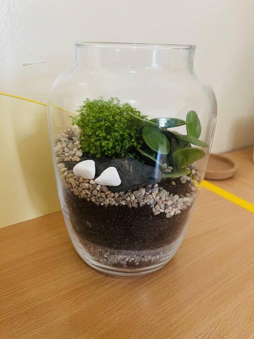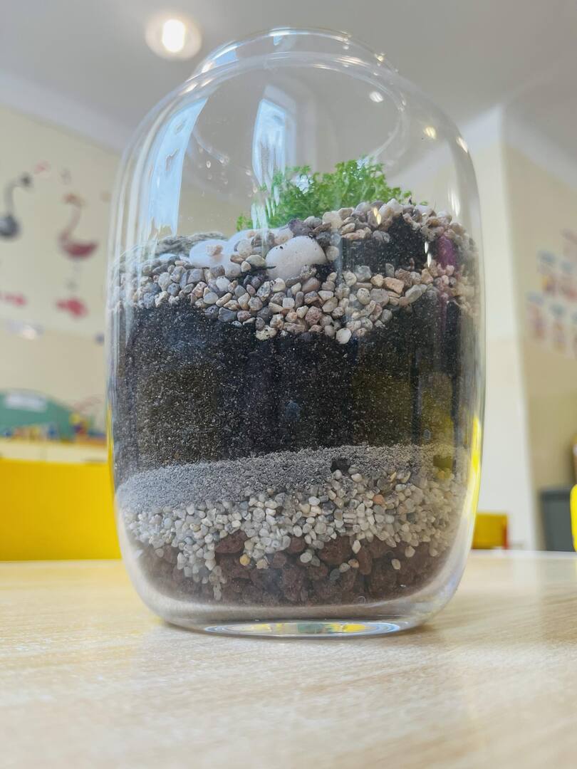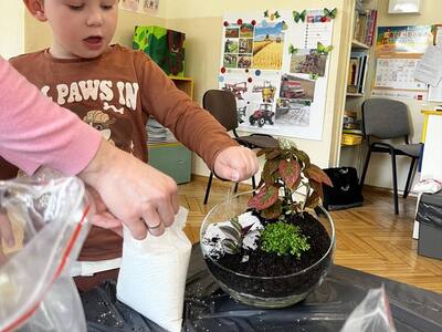 Zabawę rozpoczęliśmy od zrobienia w każdym szklanym naczyniu drenażu, następnie układaliśmy węgiel aktywny i ziemię lub ozdobne różne rodzaje żwiru, dokładaliśmy ziemię i sadziliśmy roślinki, na koniec robiliśmy dekoracje z ozdobnych kamyczków i mchu.