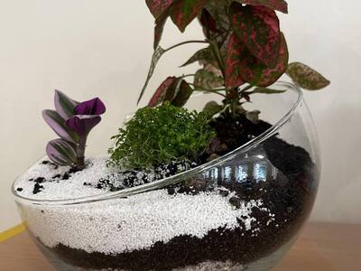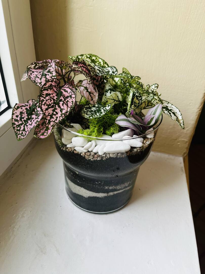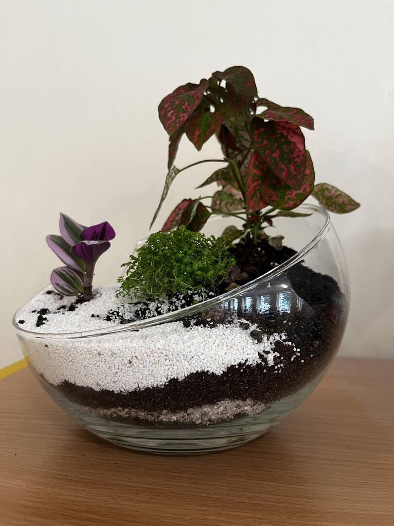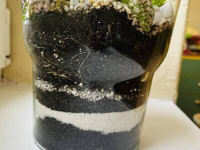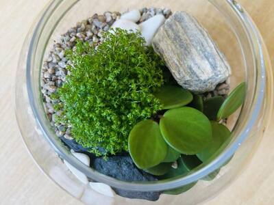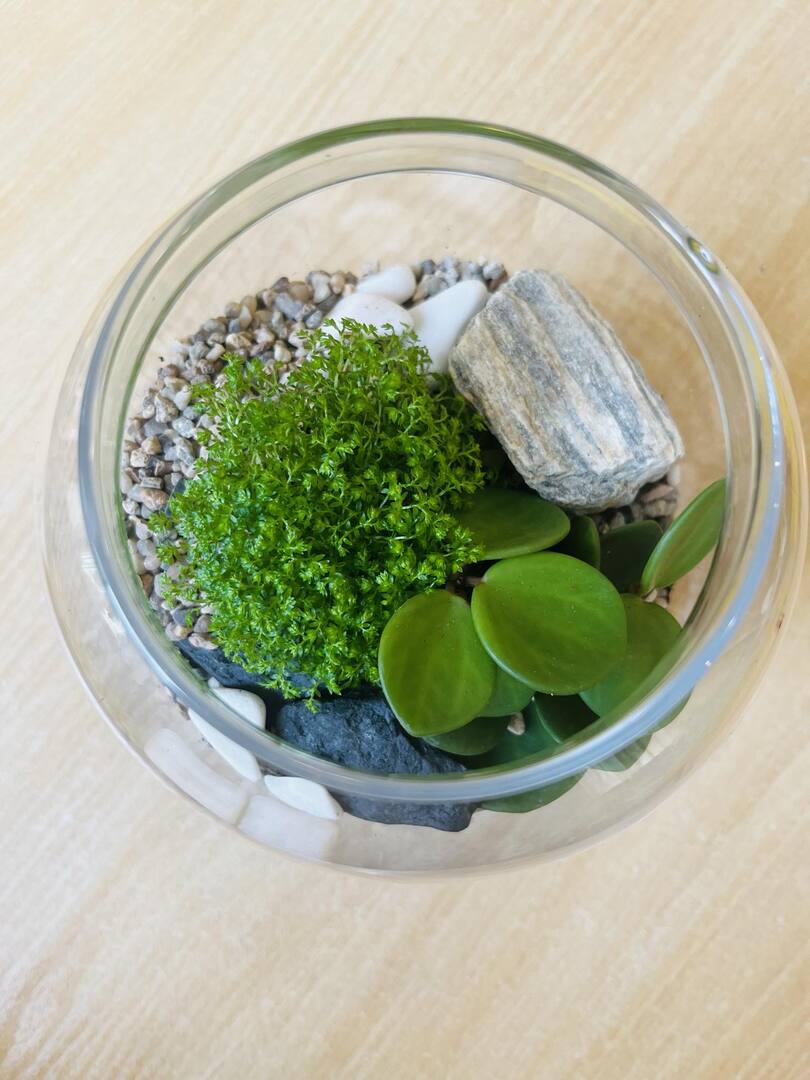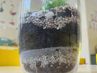 Zabawę rozpoczęliśmy od zrobienia w każdym szklanym naczyniu drenażu, następnie układaliśmy węgiel aktywny i ziemię lub ozdobne różne rodzaje żwiru, dokładaliśmy ziemię i sadziliśmy roślinki, na koniec robiliśmy dekoracje z ozdobnych kamyczków i mchu.