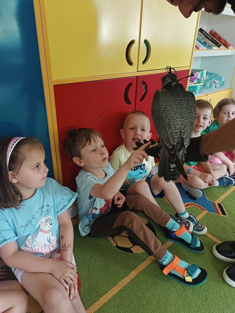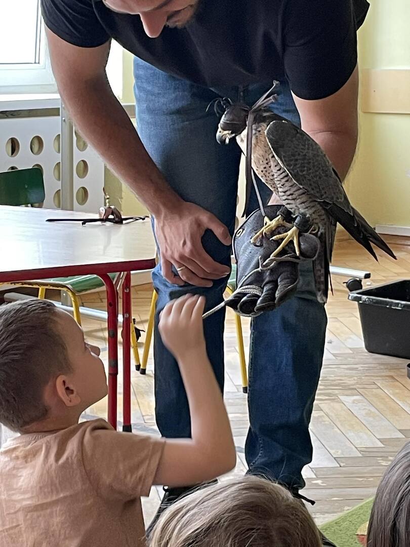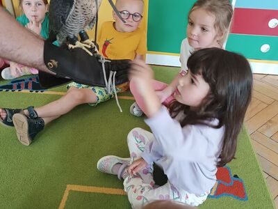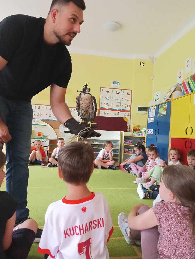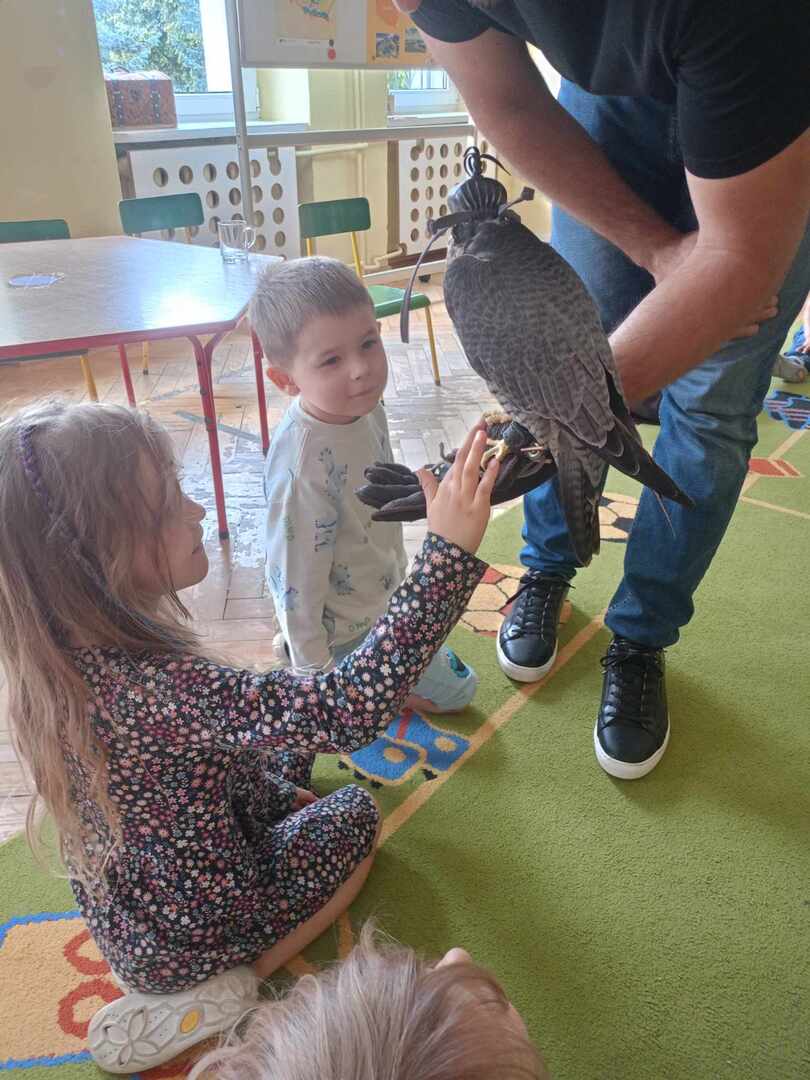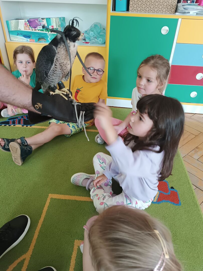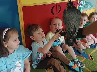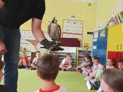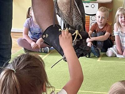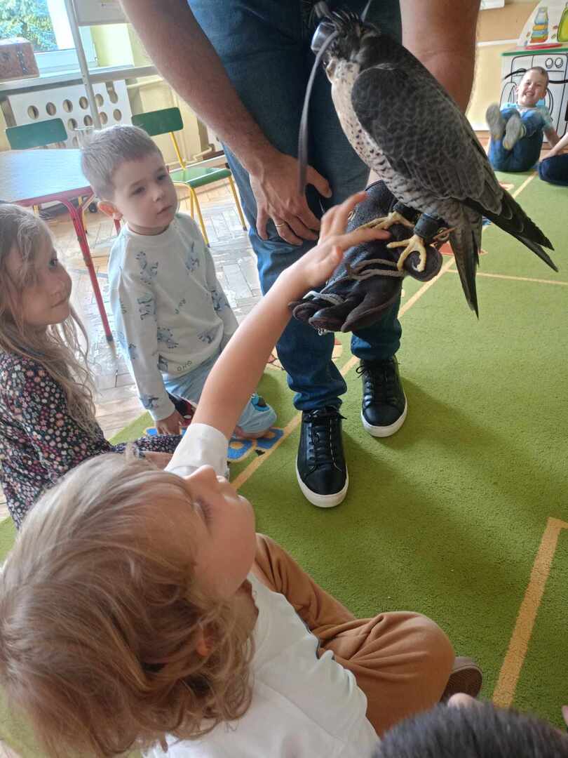 W przedszkolu odbyły się zajęcia edukacyjne pt. "Poznajemy świat ptaków drapieżnych". Na zajęciach dzieci poznały pojęcie "sokolnik". czym taka osoba się zajmuje, jak wygląda praca sokolnika. Dzieci miały możliwość zobaczenia z bliska sokoła. Prowadzący opowiadał także o biologii ptaków drapieżnych w naturalnym środowisku, akcesoriach, które są potrzebne sokolnikom i ciekawostkach ze świata ptaków drapieżnych.