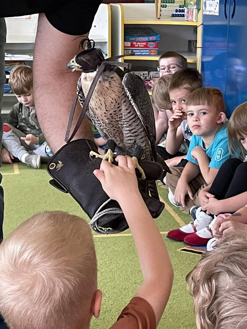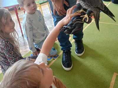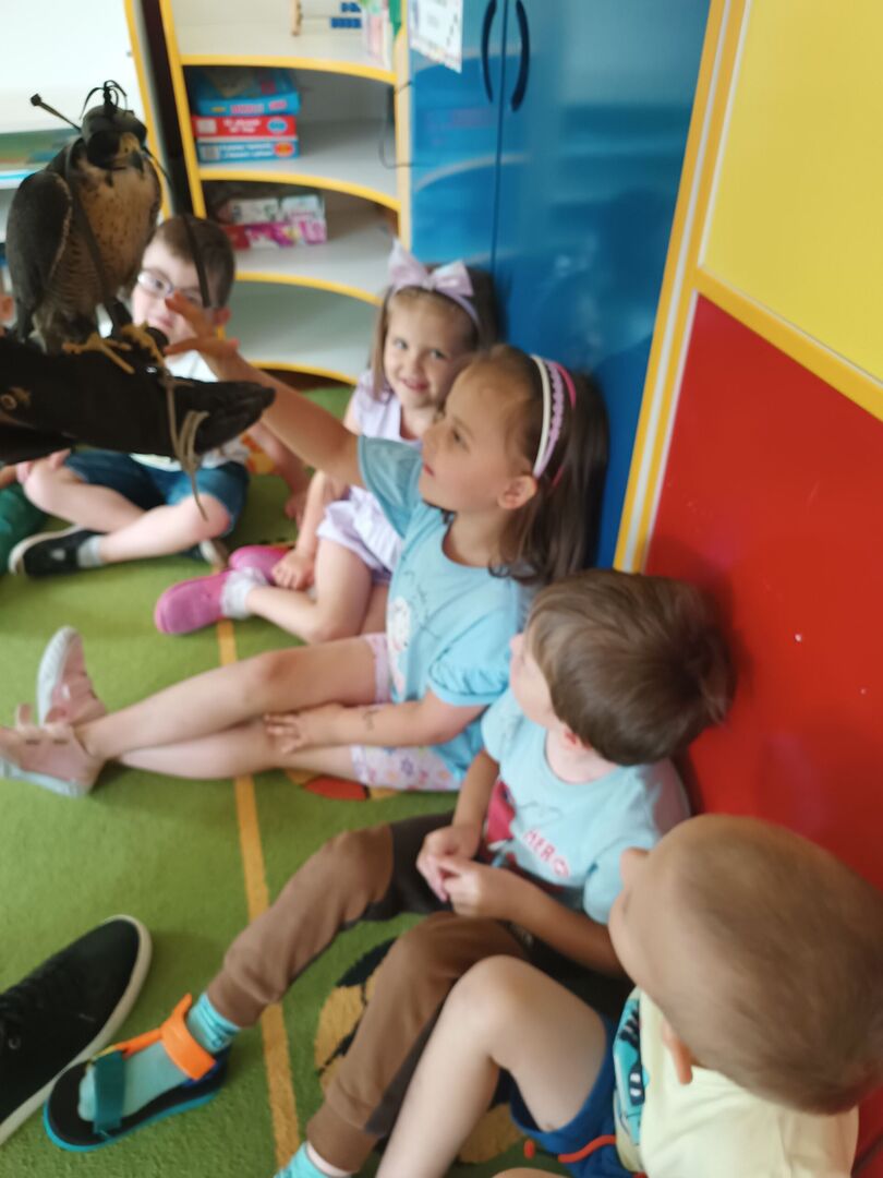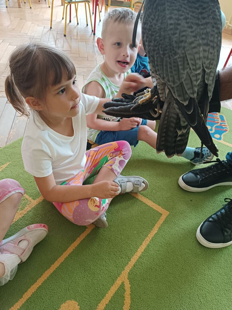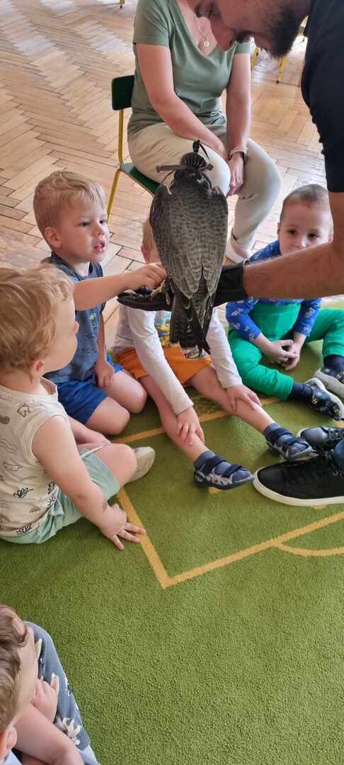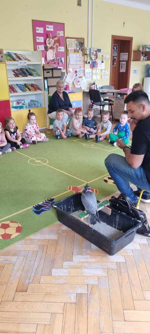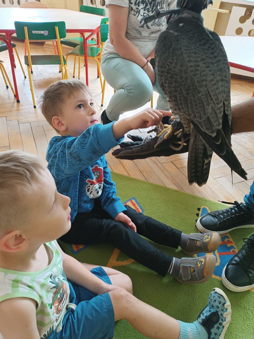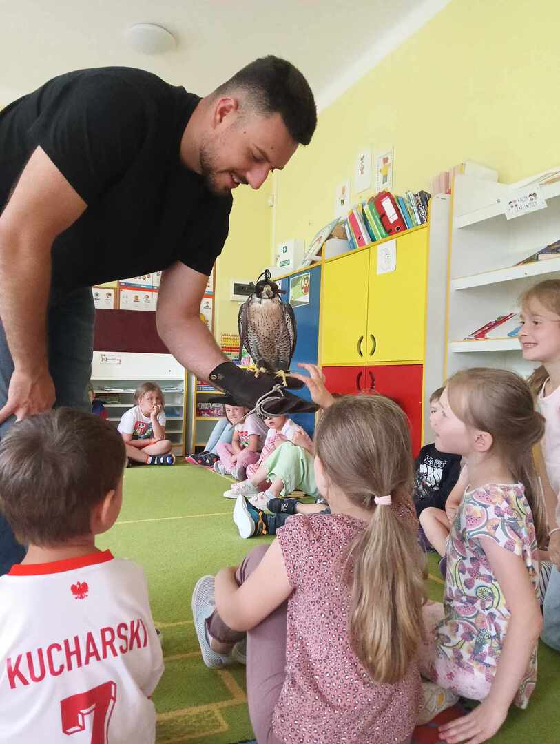 W przedszkolu odbyły się zajęcia edukacyjne pt. "Poznajemy świat ptaków drapieżnych". Na zajęciach dzieci poznały pojęcie "sokolnik". czym taka osoba się zajmuje, jak wygląda praca sokolnika. Dzieci miały możliwość zobaczenia z bliska sokoła. Prowadzący opowiadał także o biologii ptaków drapieżnych w naturalnym środowisku, akcesoriach, które są potrzebne sokolnikom i ciekawostkach ze świata ptaków drapieżnych.