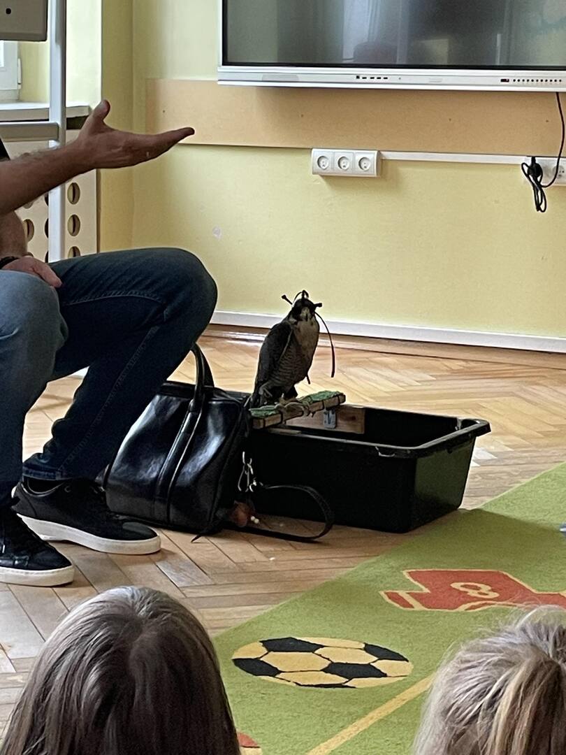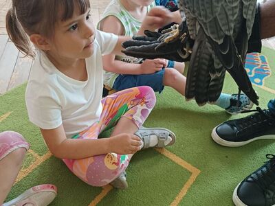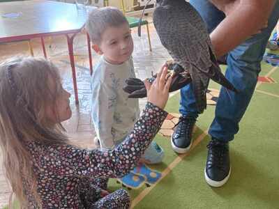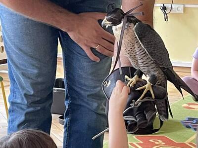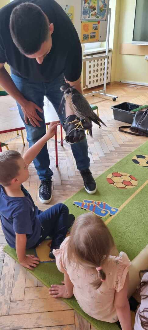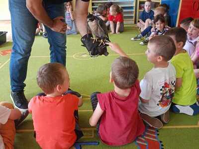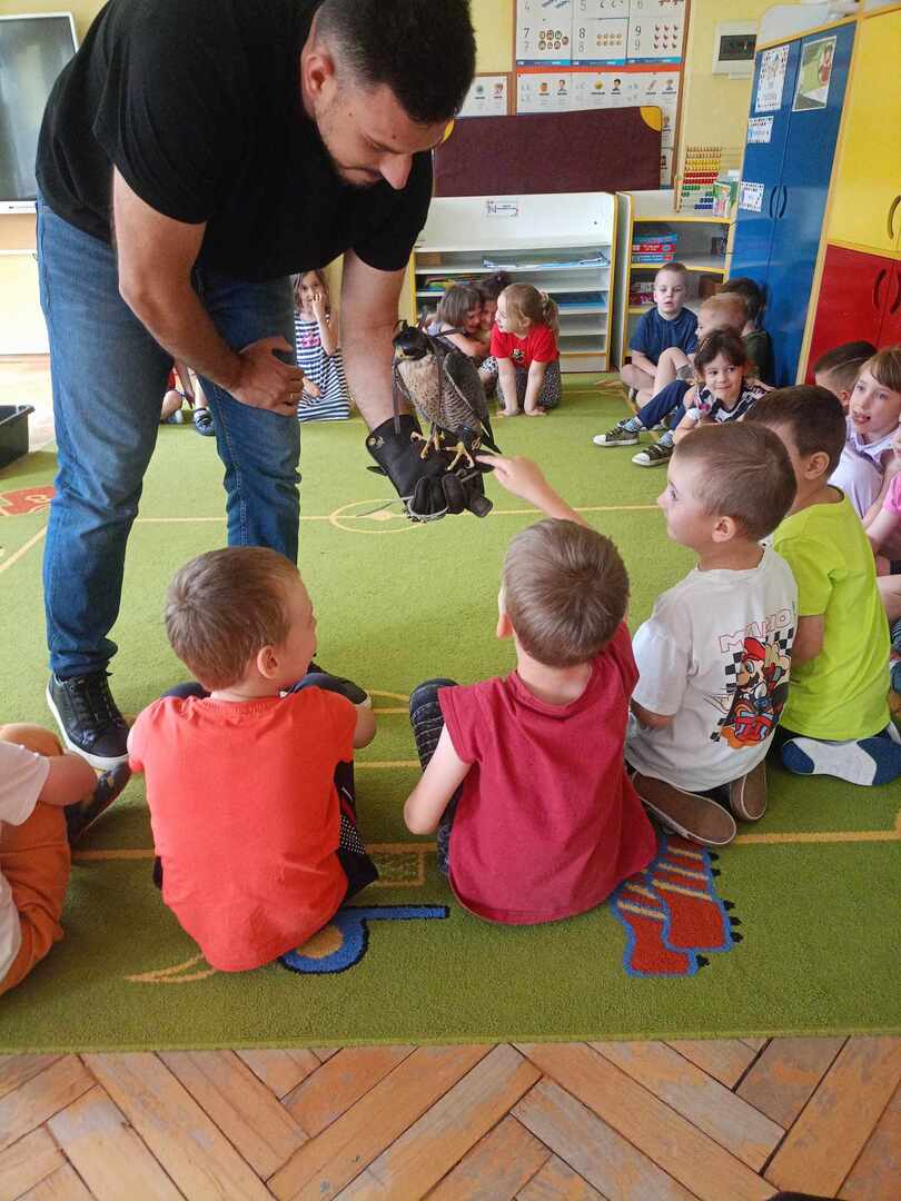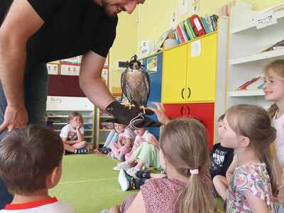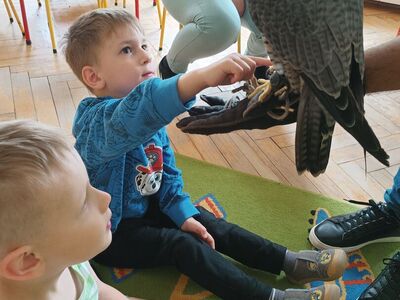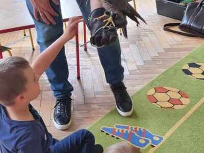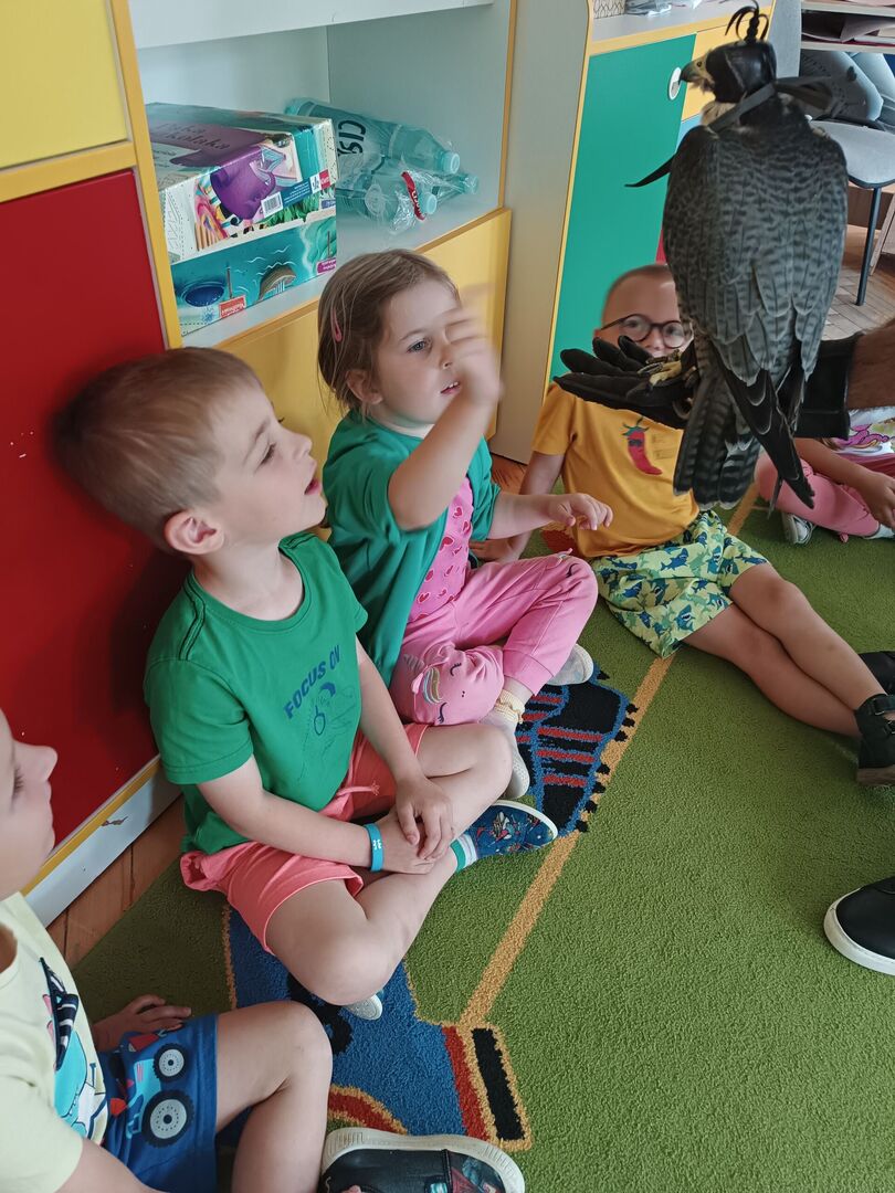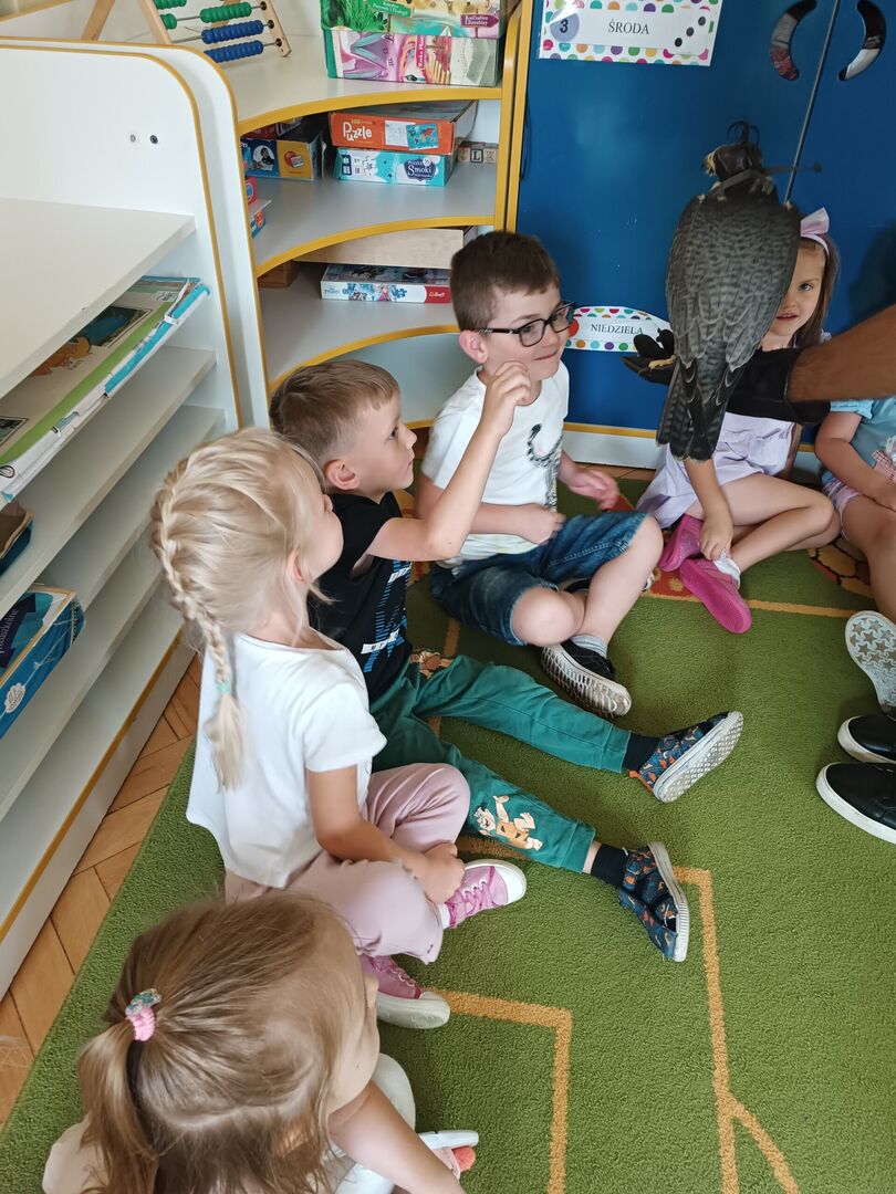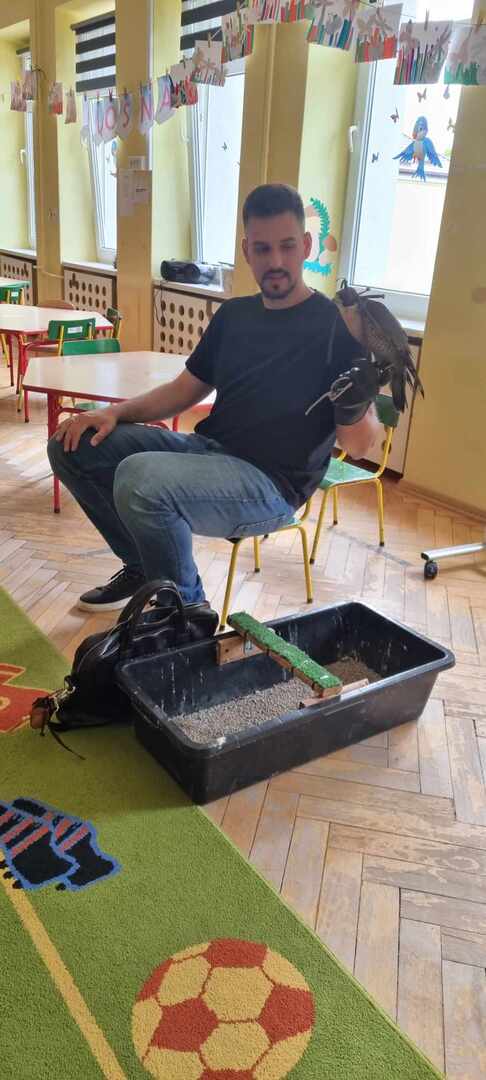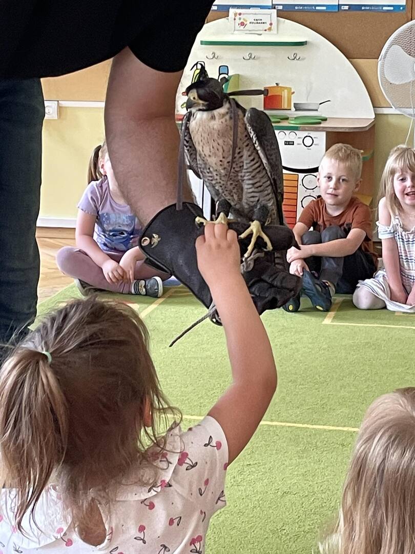 W przedszkolu odbyły się zajęcia edukacyjne pt. "Poznajemy świat ptaków drapieżnych". Na zajęciach dzieci poznały pojęcie "sokolnik". czym taka osoba się zajmuje, jak wygląda praca sokolnika. Dzieci miały możliwość zobaczenia z bliska sokoła. Prowadzący opowiadał także o biologii ptaków drapieżnych w naturalnym środowisku, akcesoriach, które są potrzebne sokolnikom i ciekawostkach ze świata ptaków drapieżnych.