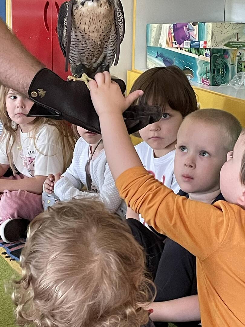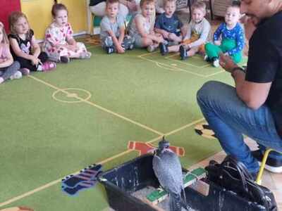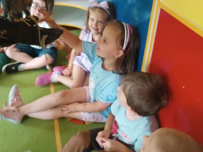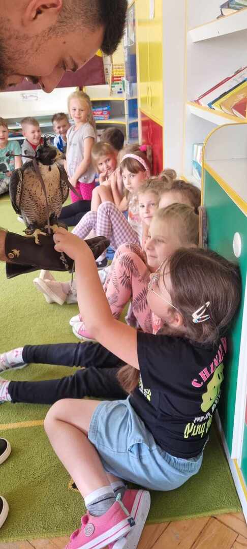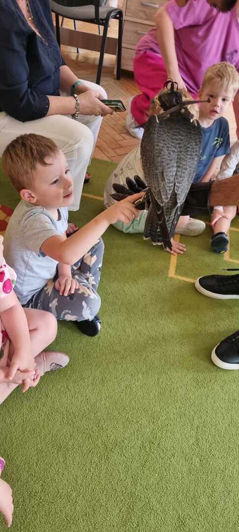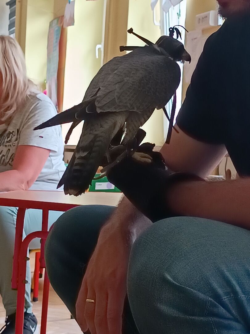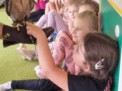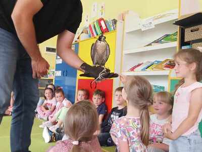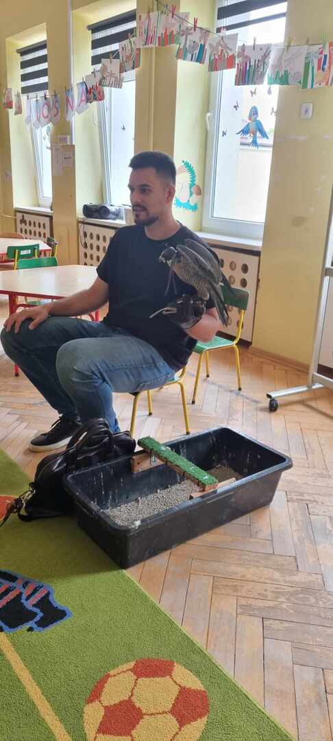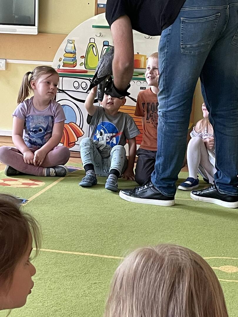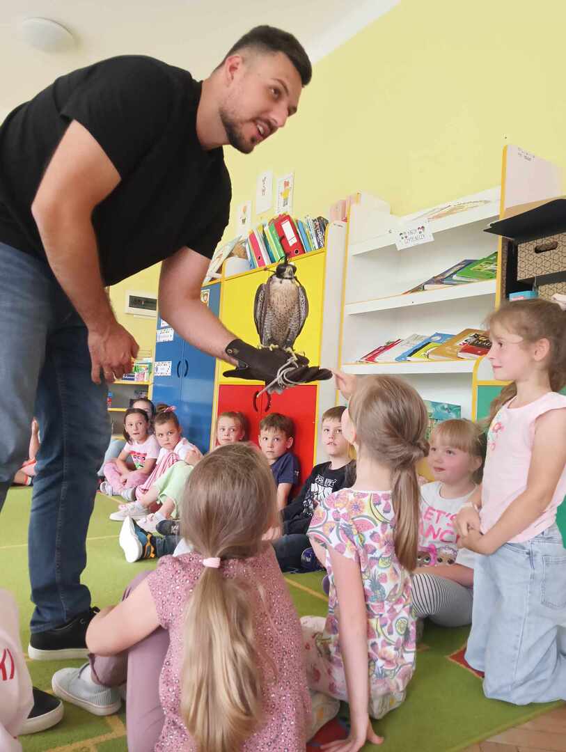 W przedszkolu odbyły się zajęcia edukacyjne pt. "Poznajemy świat ptaków drapieżnych". Na zajęciach dzieci poznały pojęcie "sokolnik". czym taka osoba się zajmuje, jak wygląda praca sokolnika. Dzieci miały możliwość zobaczenia z bliska sokoła. Prowadzący opowiadał także o biologii ptaków drapieżnych w naturalnym środowisku, akcesoriach, które są potrzebne sokolnikom i ciekawostkach ze świata ptaków drapieżnych.
