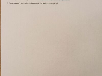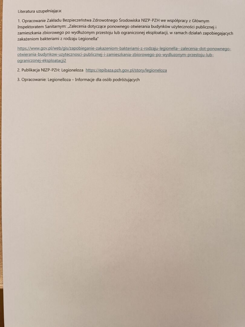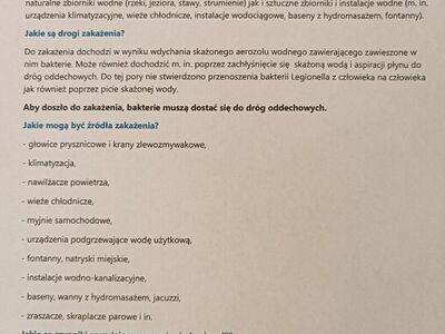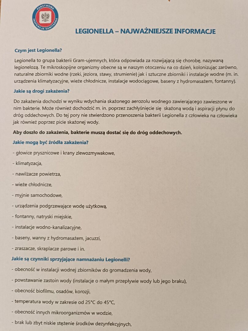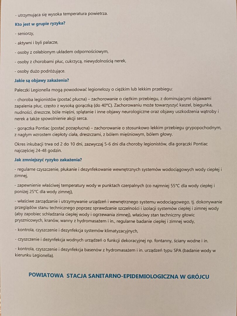 Państwowy Powiatowy Instytut Sanitarny w Grójcu, mając na uwadze zbliżający się sezon letni ( wakacyjny) i występujące w tym okresie wysokie temperatury oraz związany z tym zjawiskiem wzrost ryzyka zachorowań na legionelozę w związku z namnażaniem się bakterii rodzaju Legionella, przesyła w załączeniu materiały edukacyjno-informacyjne