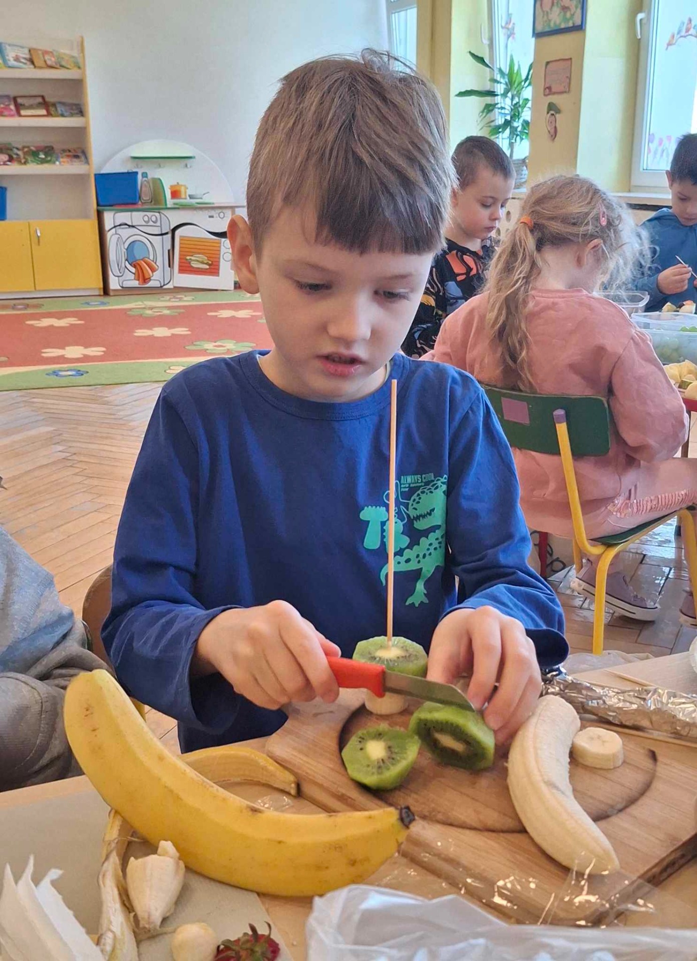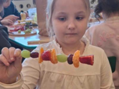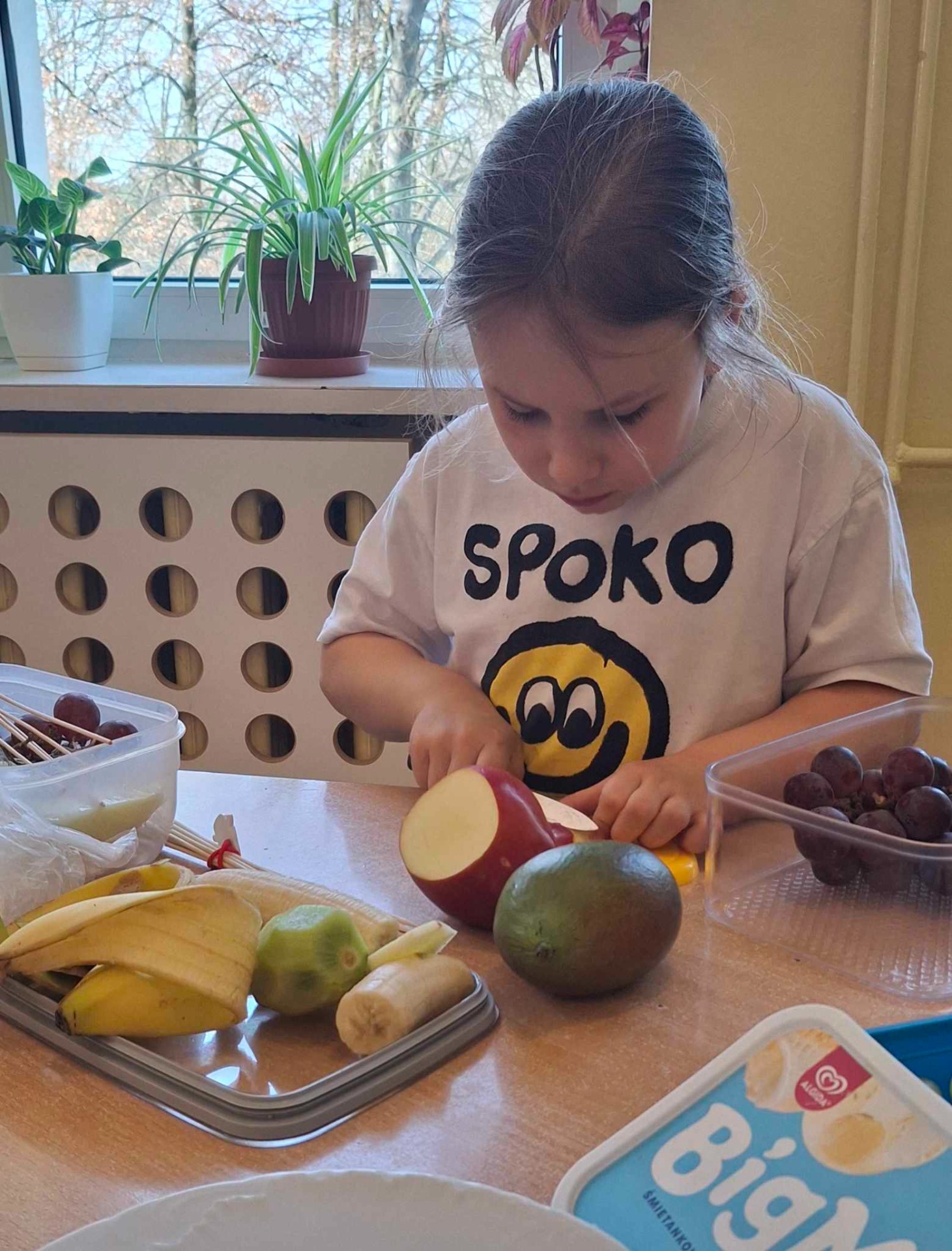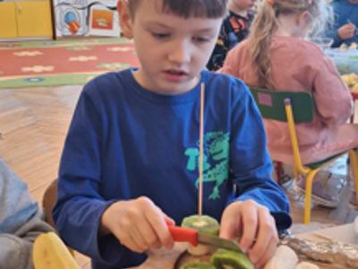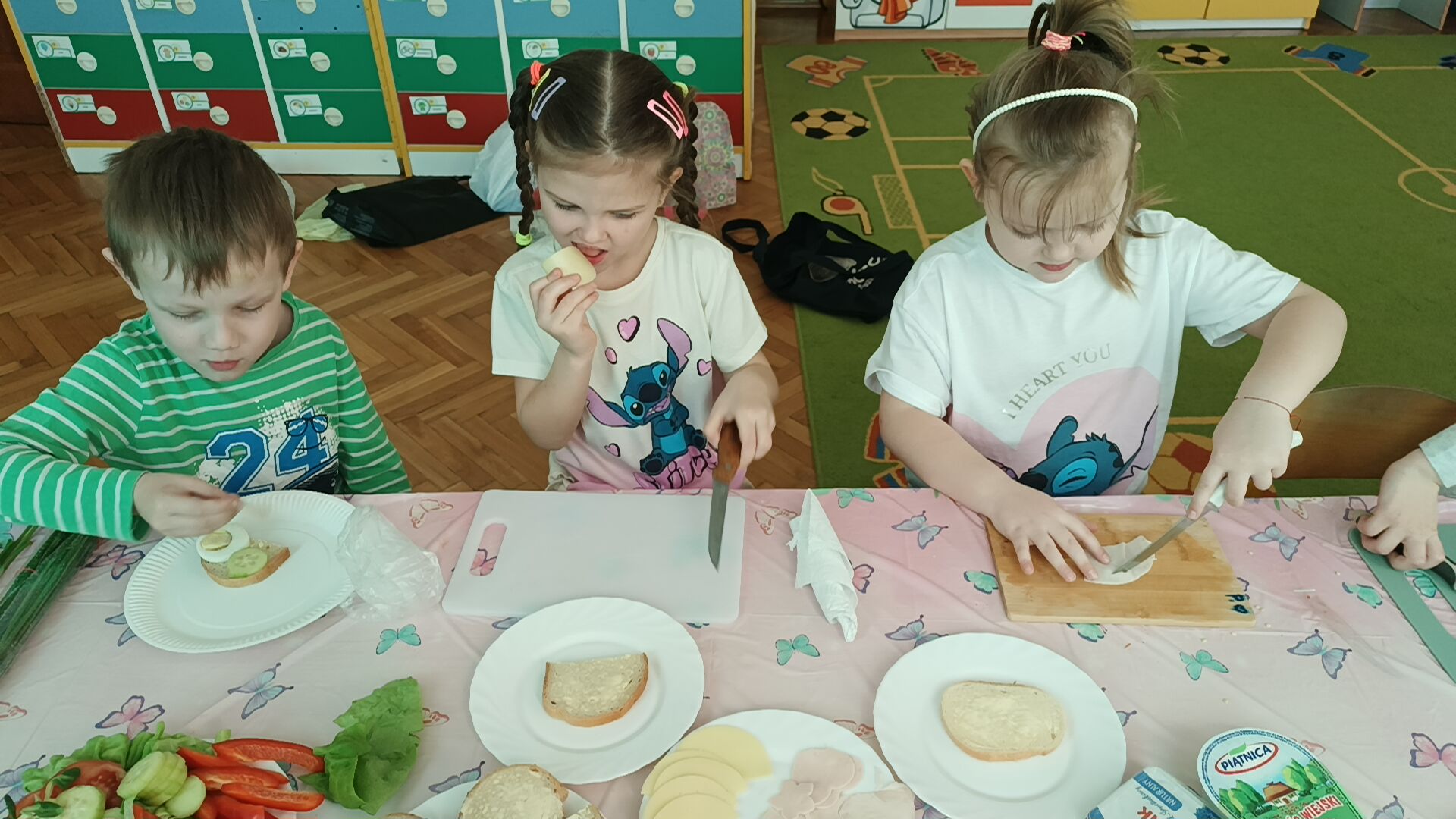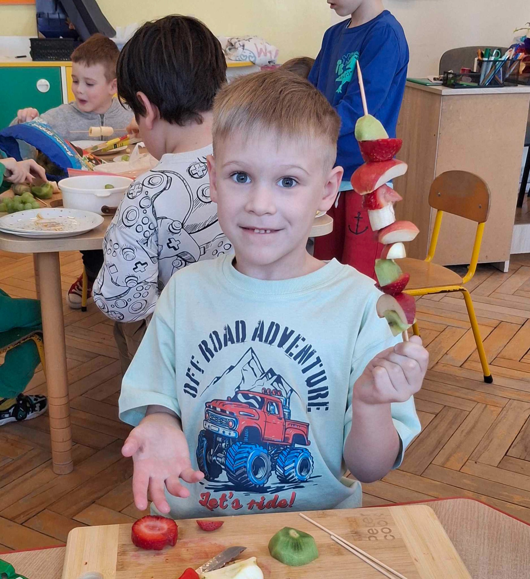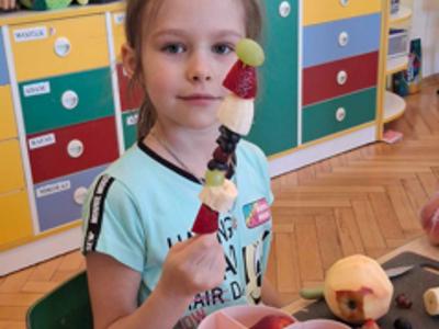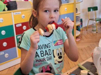 Dzieci z grupy Stokrotki oraz Biedronki w ramach rozmowy o zdrowym od偶ywianiu postanowi艂y samodzielne zrobi膰 pyszne, zdrowe kanapki oraz owocowe szasz艂yki. Najpierw dzieci pozna艂y korzy艣ci wynikaj膮ce ze spo偶ywania zdrowego jedzenia. Dowiedzia艂y si臋 jak wa偶na jest zbilansowana dieta, bogata w produkty zbo偶owe warzywa i owoce. Nast臋pnie przypomnia艂y sobie zasady bezpiecze艅stwa, kt贸rych nale偶y przestrzega膰 podczas pos艂ugiwania si臋 no偶em. Podczas robienia kanapek oraz szasz艂yk贸w kszta艂ci艂y odpowiednie nawyki 偶ywieniowe, rozwija艂y kreatywno艣膰, wyobra藕ni臋 oraz dba艂o艣膰 o higien臋.