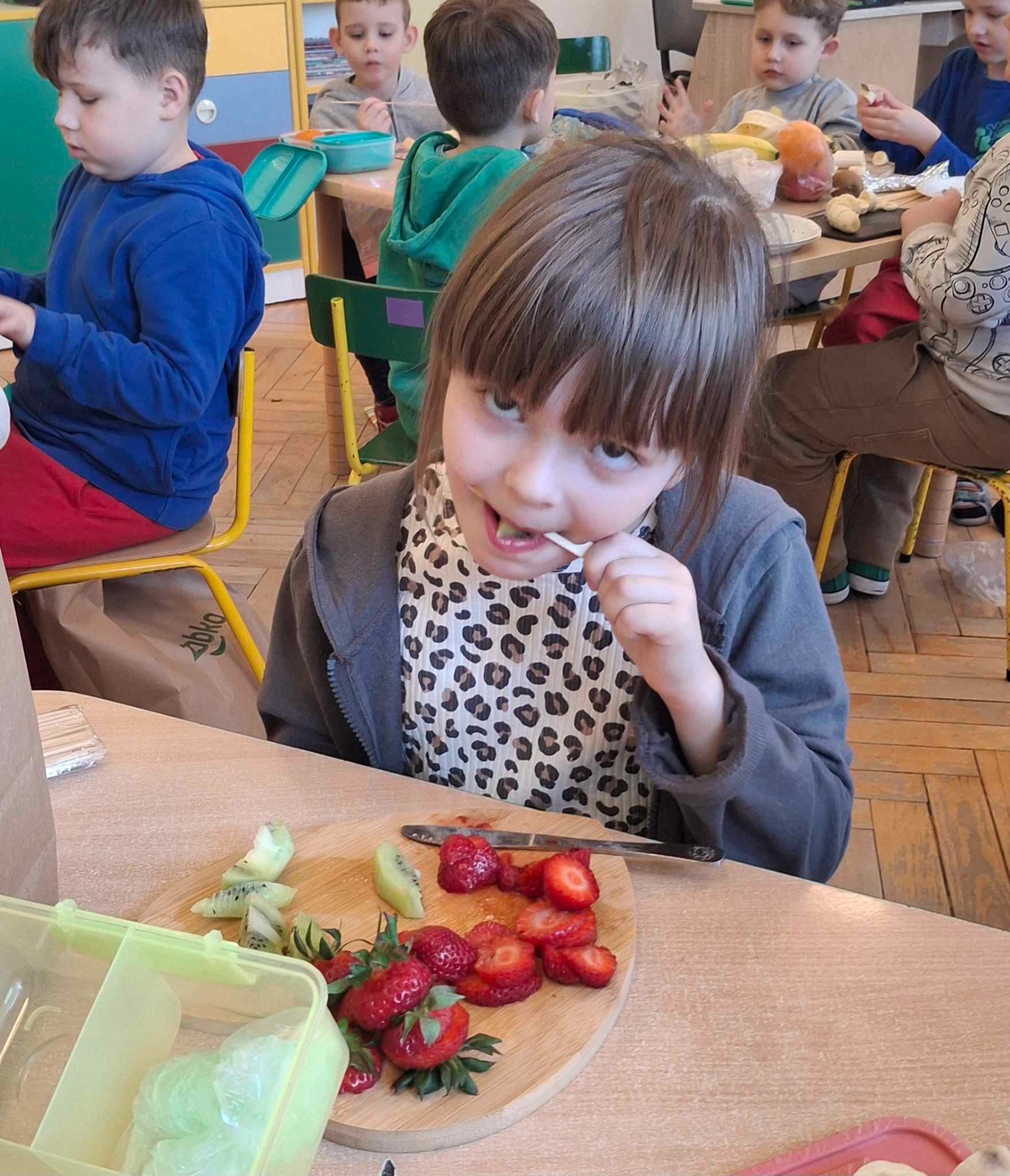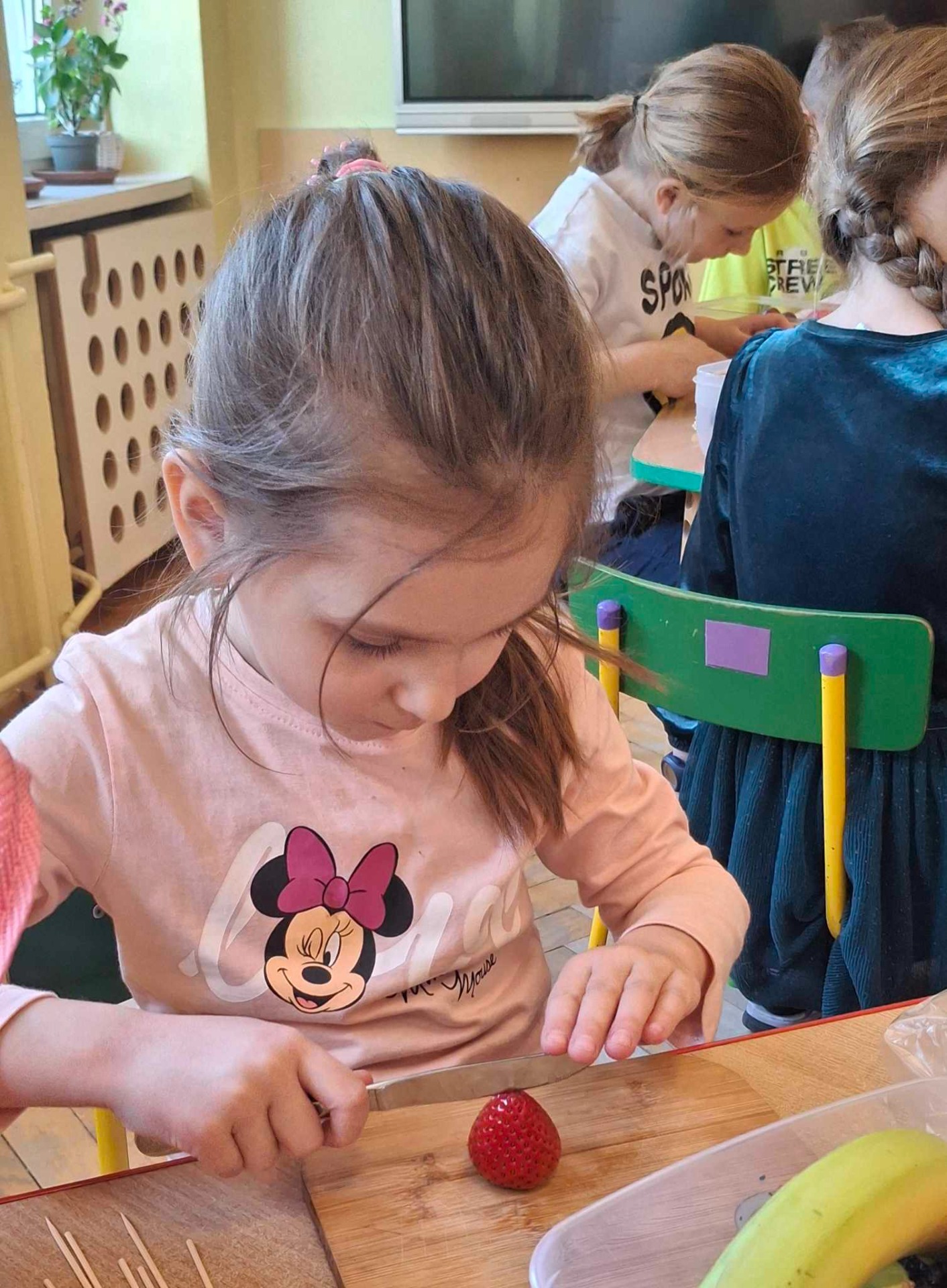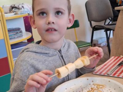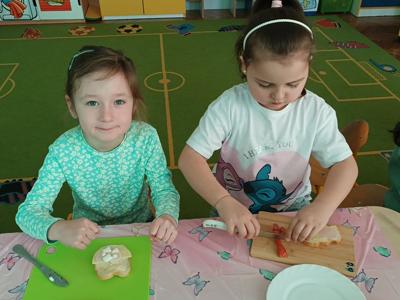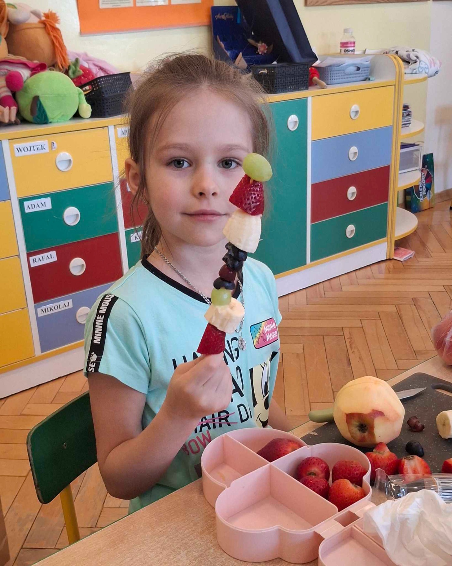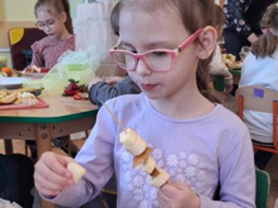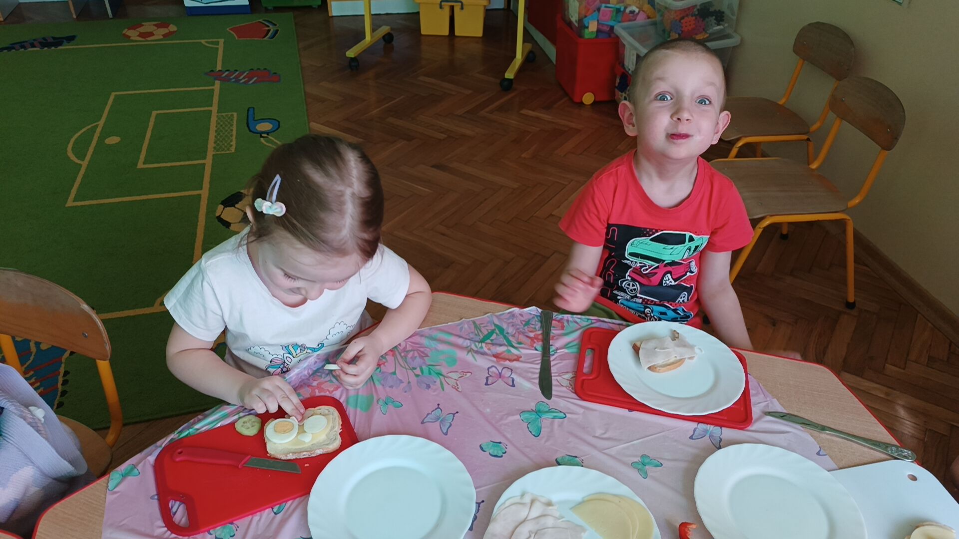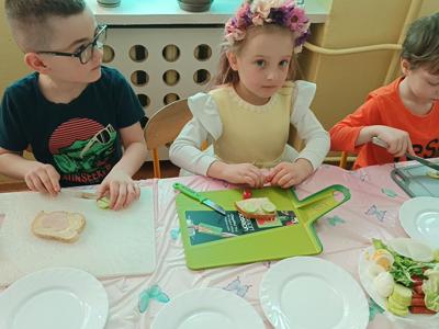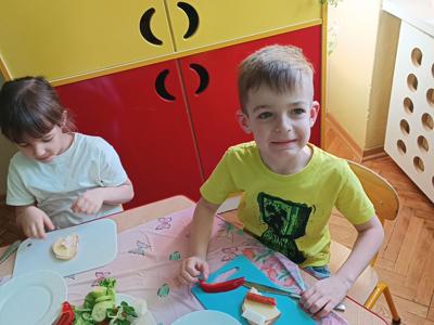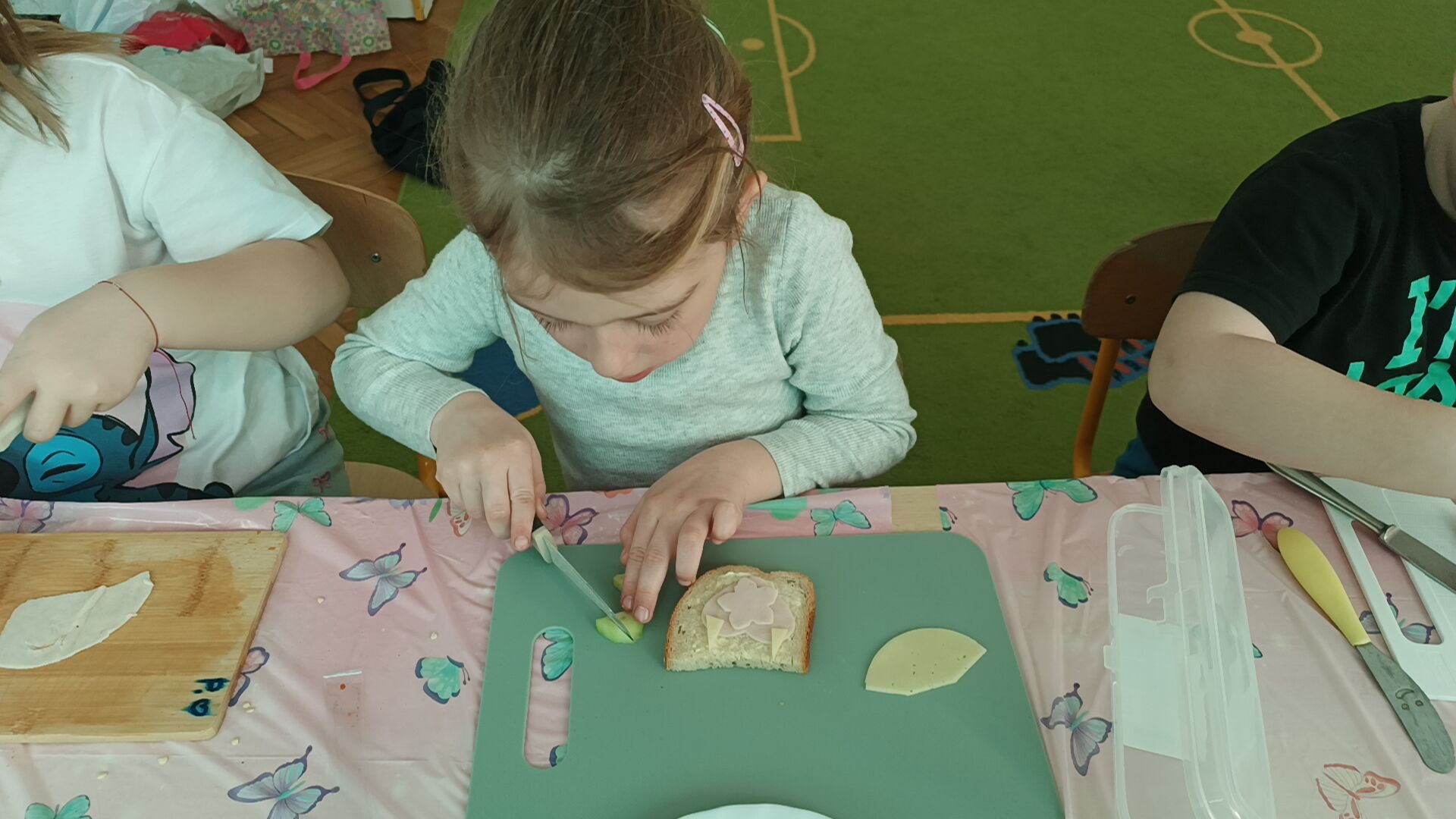Dzieci z grupy Stokrotki oraz Biedronki w ramach rozmowy o zdrowym od偶ywianiu postanowi艂y samodzielne zrobi膰 pyszne, zdrowe kanapki oraz owocowe szasz艂yki. Najpierw dzieci pozna艂y korzy艣ci wynikaj膮ce ze spo偶ywania zdrowego jedzenia. Dowiedzia艂y si臋 jak wa偶na jest zbilansowana dieta, bogata w produkty zbo偶owe warzywa i owoce. Nast臋pnie przypomnia艂y sobie zasady bezpiecze艅stwa, kt贸rych nale偶y przestrzega膰 podczas pos艂ugiwania si臋 no偶em. Podczas robienia kanapek oraz szasz艂yk贸w kszta艂ci艂y odpowiednie nawyki 偶ywieniowe, rozwija艂y kreatywno艣膰, wyobra藕ni臋 oraz dba艂o艣膰 o higien臋.
