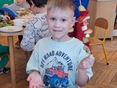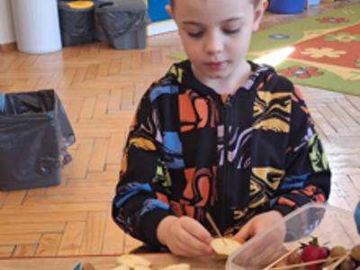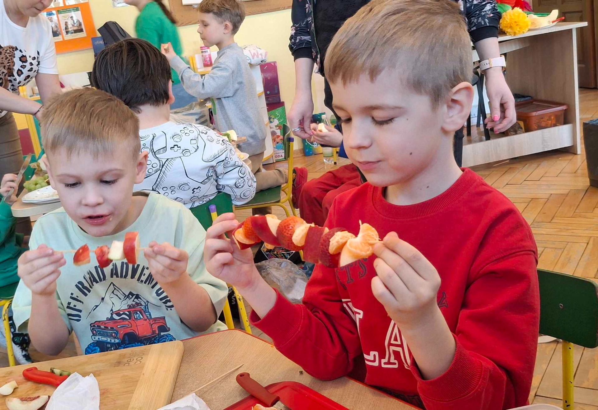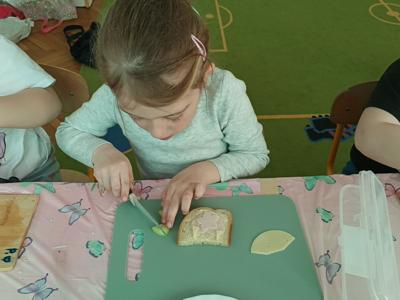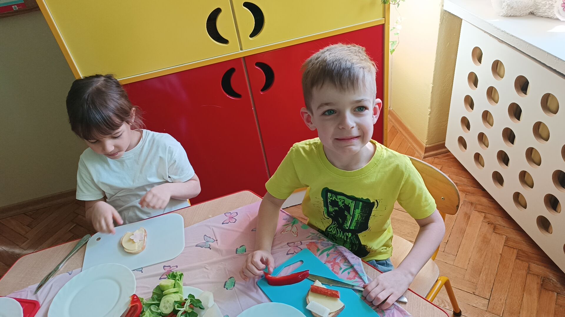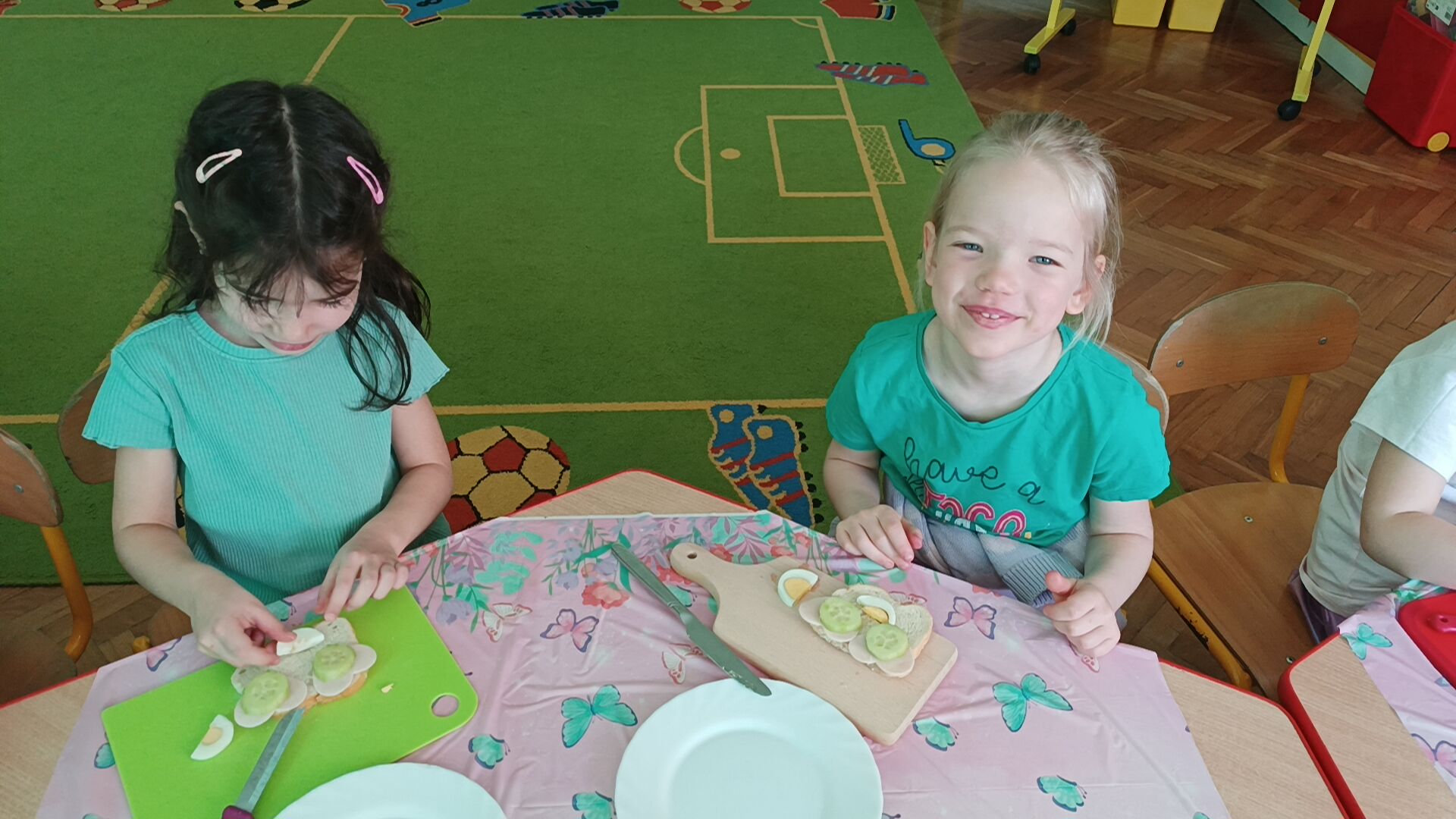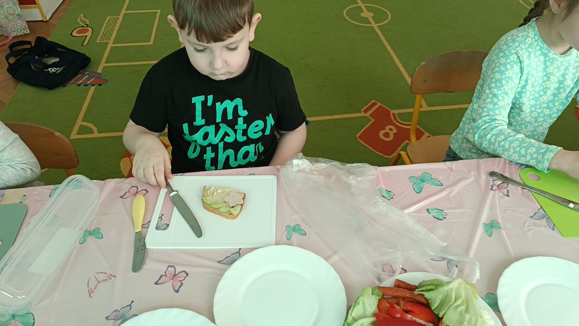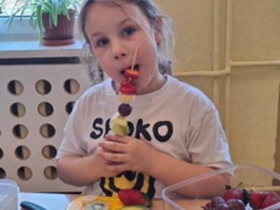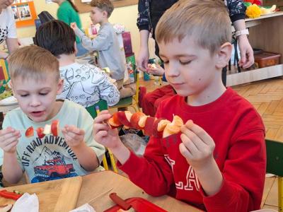 Dzieci z grupy Stokrotki oraz Biedronki w ramach rozmowy o zdrowym od偶ywianiu postanowi艂y samodzielne zrobi膰 pyszne, zdrowe kanapki oraz owocowe szasz艂yki. Najpierw dzieci pozna艂y korzy艣ci wynikaj膮ce ze spo偶ywania zdrowego jedzenia. Dowiedzia艂y si臋 jak wa偶na jest zbilansowana dieta, bogata w produkty zbo偶owe warzywa i owoce. Nast臋pnie przypomnia艂y sobie zasady bezpiecze艅stwa, kt贸rych nale偶y przestrzega膰 podczas pos艂ugiwania si臋 no偶em. Podczas robienia kanapek oraz szasz艂yk贸w kszta艂ci艂y odpowiednie nawyki 偶ywieniowe, rozwija艂y kreatywno艣膰, wyobra藕ni臋 oraz dba艂o艣膰 o higien臋.