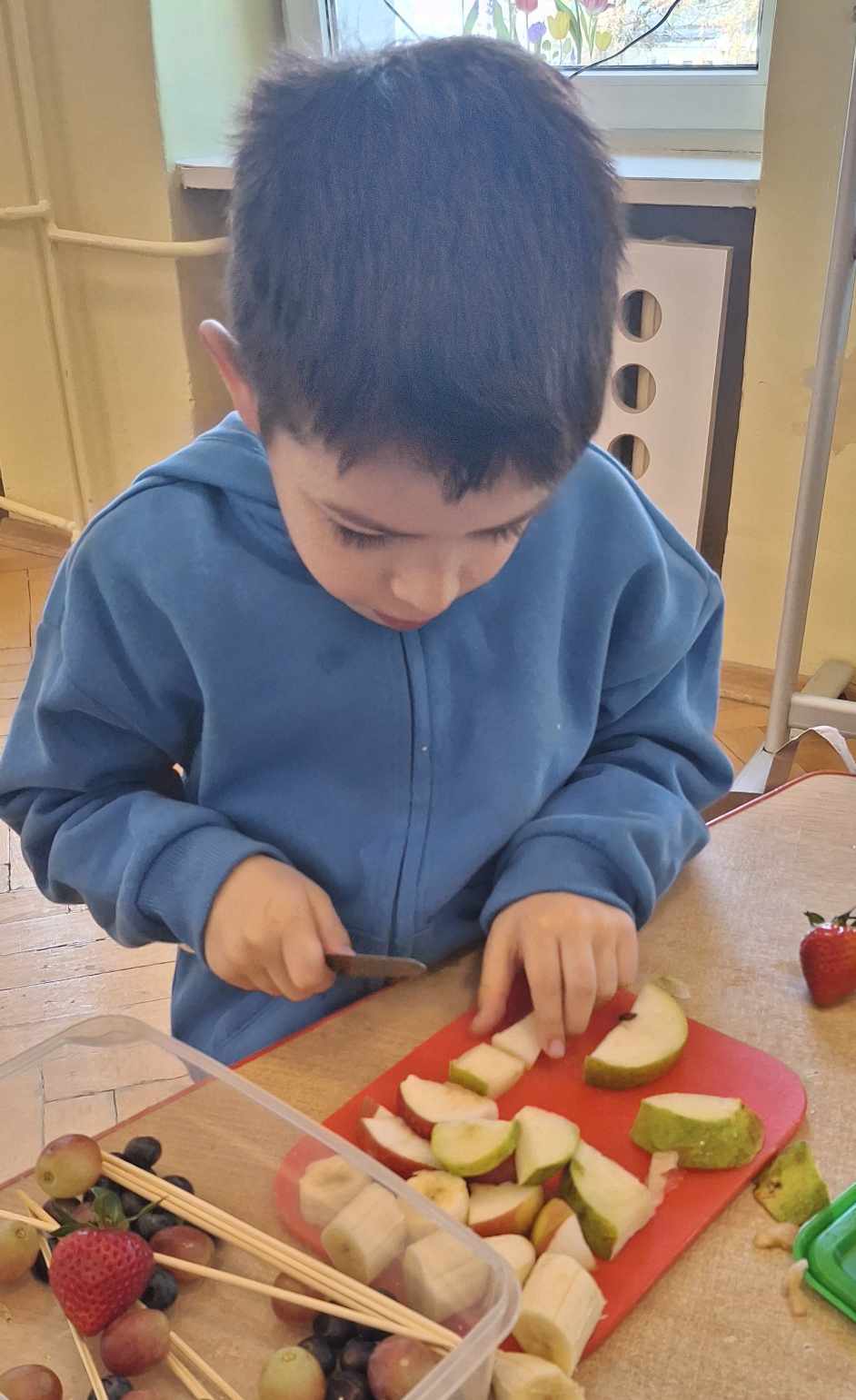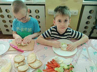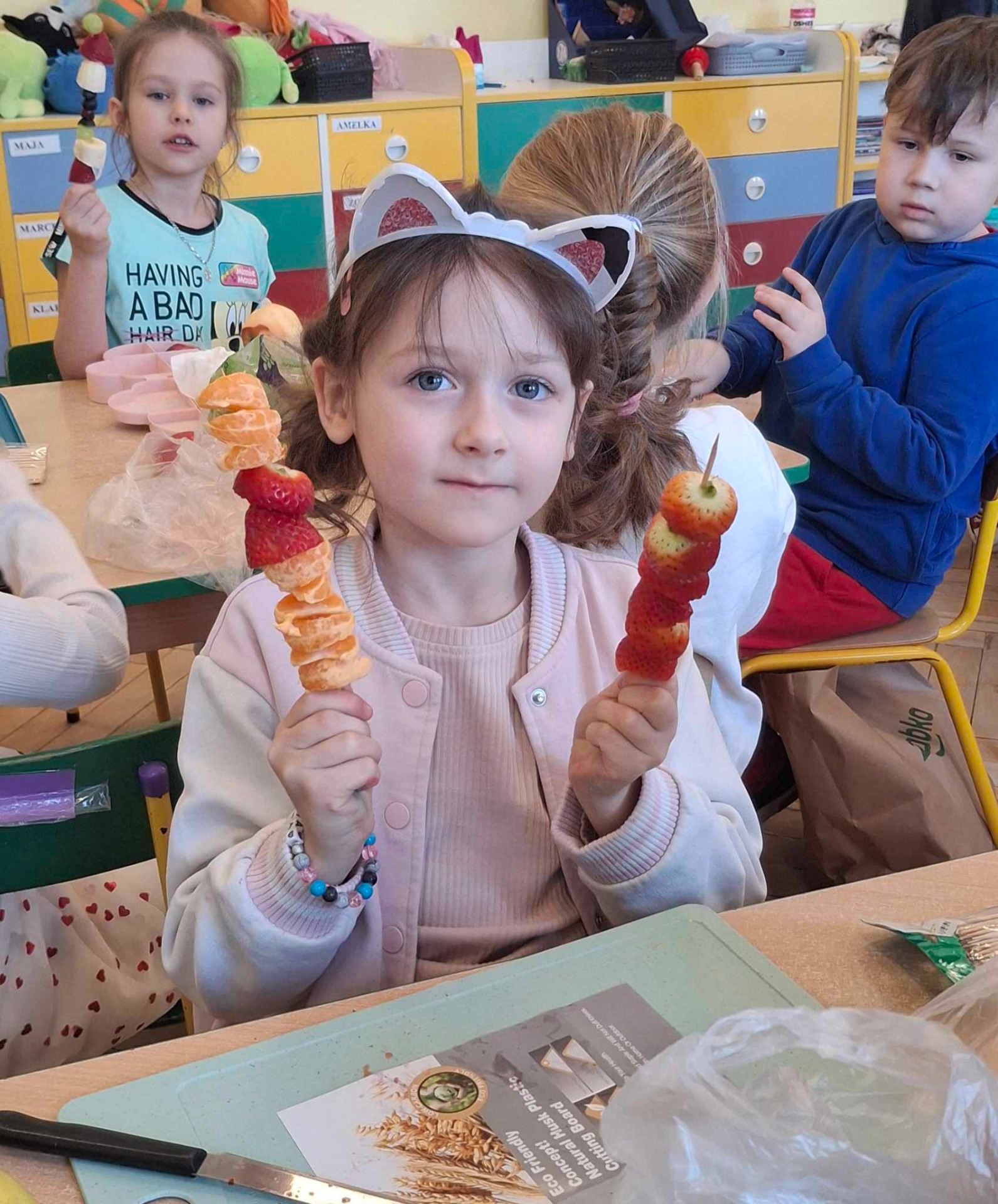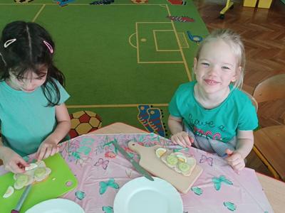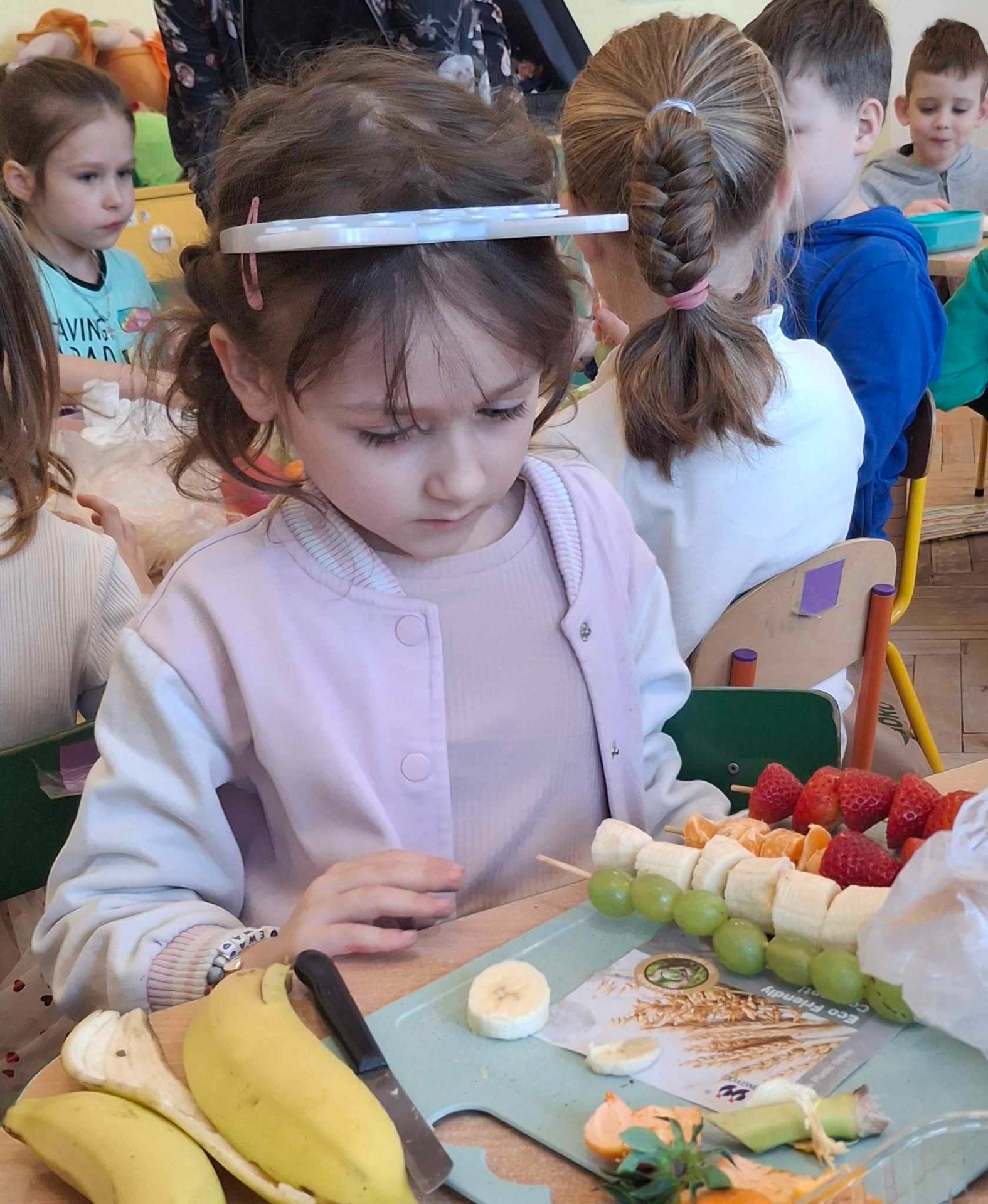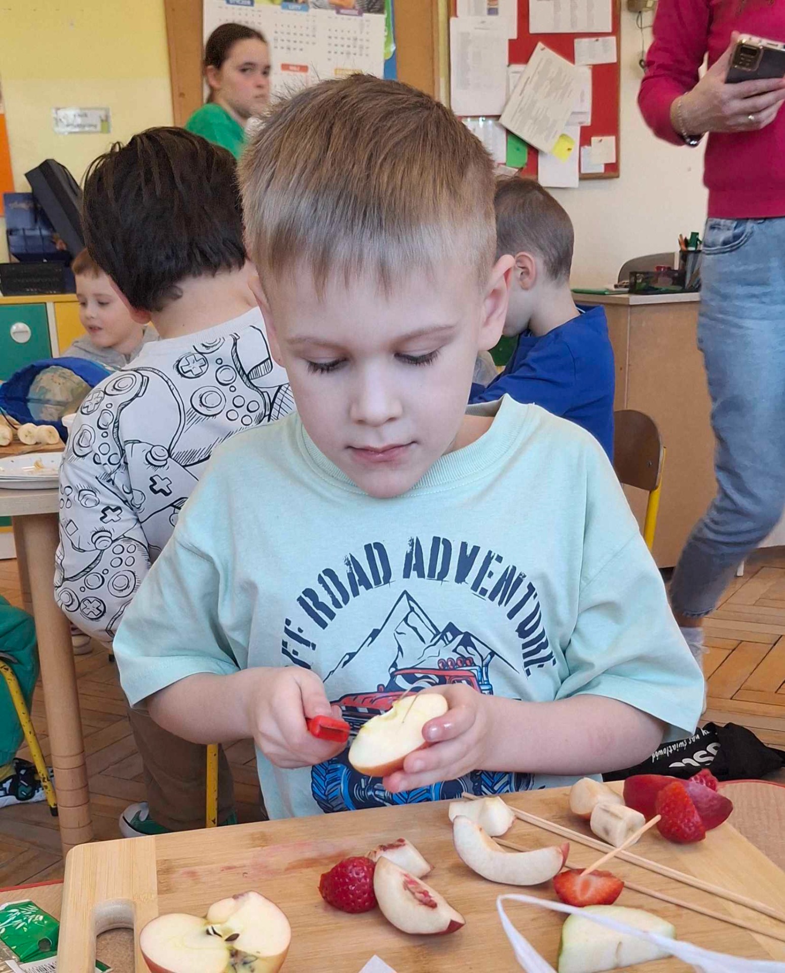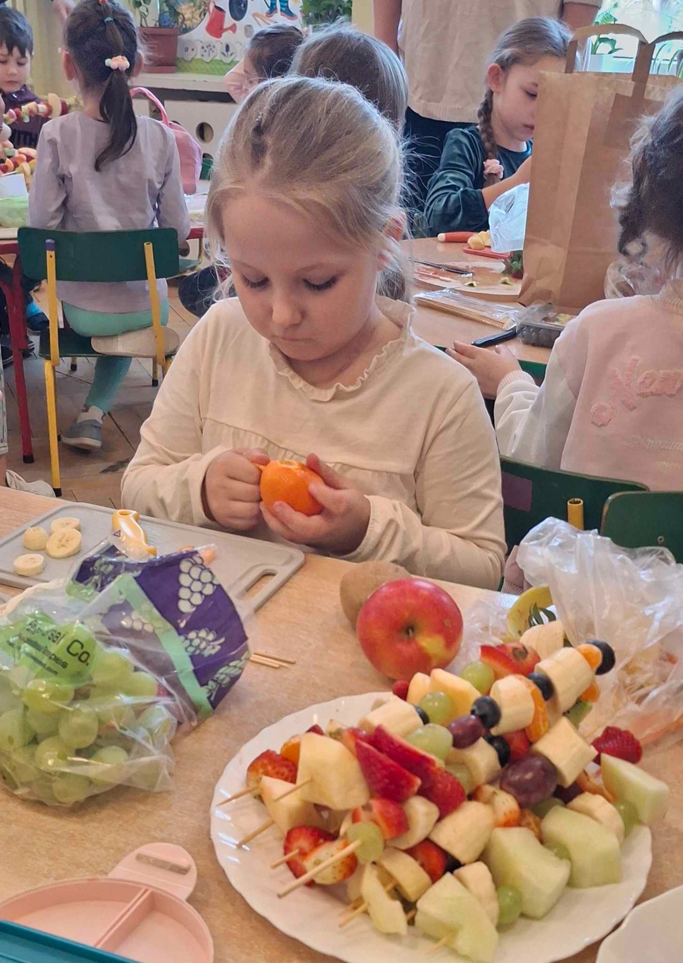 Dzieci z grupy Stokrotki oraz Biedronki w ramach rozmowy o zdrowym od偶ywianiu postanowi艂y samodzielne zrobi膰 pyszne, zdrowe kanapki oraz owocowe szasz艂yki. Najpierw dzieci pozna艂y korzy艣ci wynikaj膮ce ze spo偶ywania zdrowego jedzenia. Dowiedzia艂y si臋 jak wa偶na jest zbilansowana dieta, bogata w produkty zbo偶owe warzywa i owoce. Nast臋pnie przypomnia艂y sobie zasady bezpiecze艅stwa, kt贸rych nale偶y przestrzega膰 podczas pos艂ugiwania si臋 no偶em. Podczas robienia kanapek oraz szasz艂yk贸w kszta艂ci艂y odpowiednie nawyki 偶ywieniowe, rozwija艂y kreatywno艣膰, wyobra藕ni臋 oraz dba艂o艣膰 o higien臋.