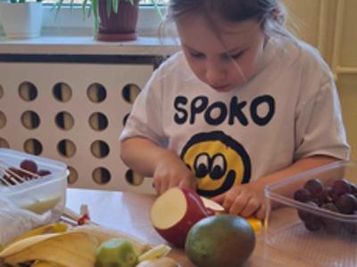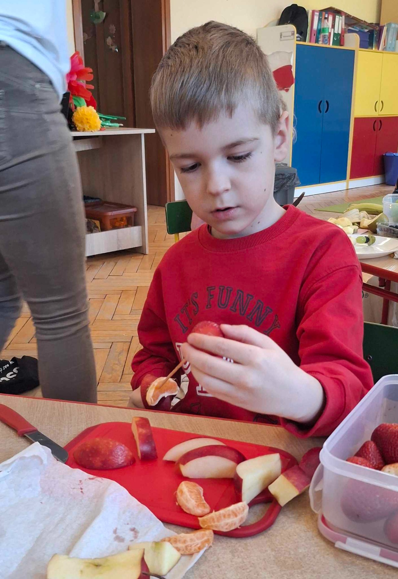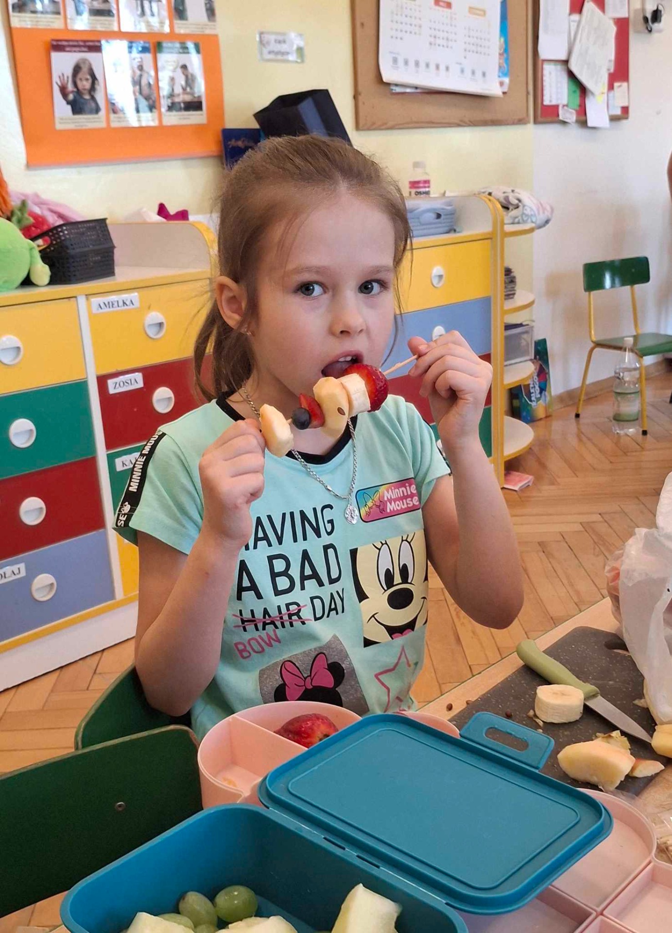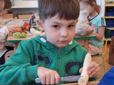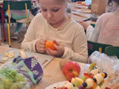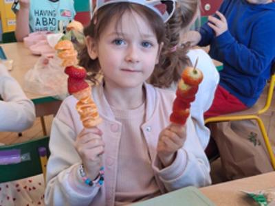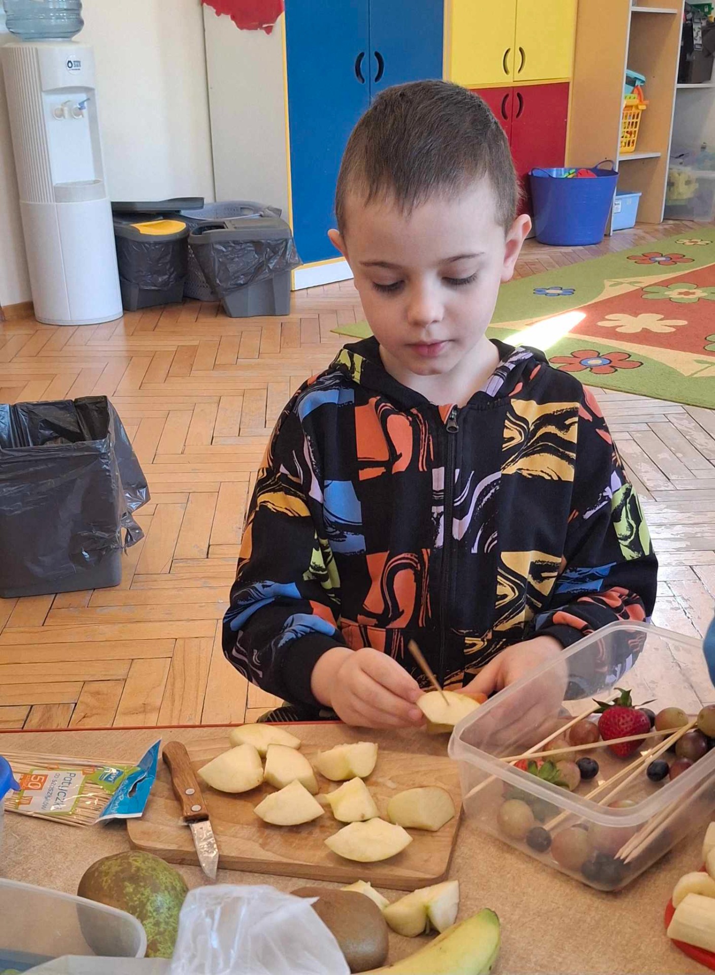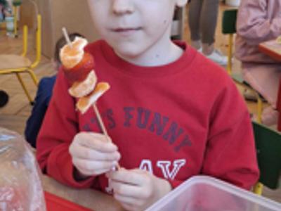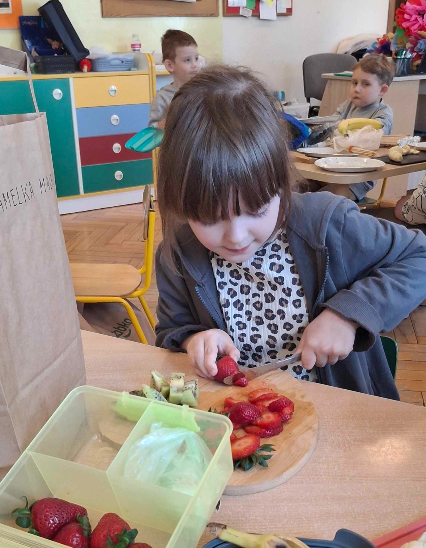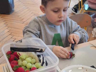 Dzieci z grupy Stokrotki oraz Biedronki w ramach rozmowy o zdrowym od偶ywianiu postanowi艂y samodzielne zrobi膰 pyszne, zdrowe kanapki oraz owocowe szasz艂yki. Najpierw dzieci pozna艂y korzy艣ci wynikaj膮ce ze spo偶ywania zdrowego jedzenia. Dowiedzia艂y si臋 jak wa偶na jest zbilansowana dieta, bogata w produkty zbo偶owe warzywa i owoce. Nast臋pnie przypomnia艂y sobie zasady bezpiecze艅stwa, kt贸rych nale偶y przestrzega膰 podczas pos艂ugiwania si臋 no偶em. Podczas robienia kanapek oraz szasz艂yk贸w kszta艂ci艂y odpowiednie nawyki 偶ywieniowe, rozwija艂y kreatywno艣膰, wyobra藕ni臋 oraz dba艂o艣膰 o higien臋.