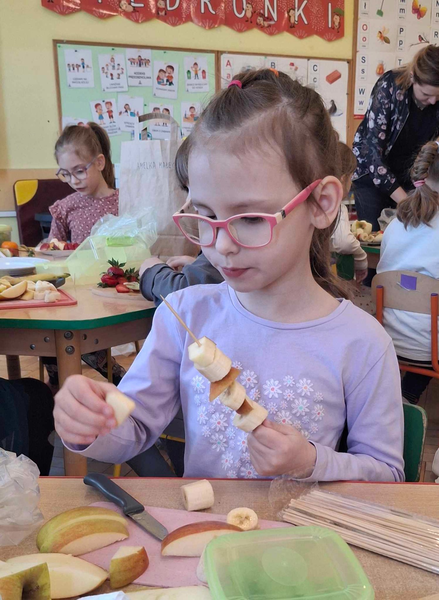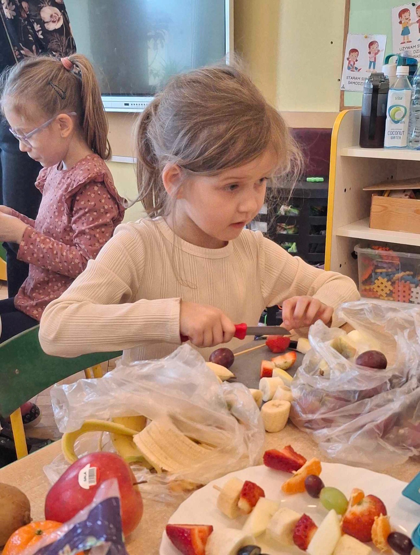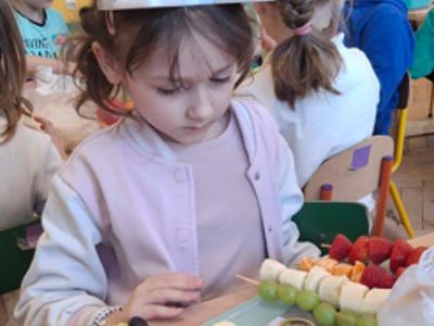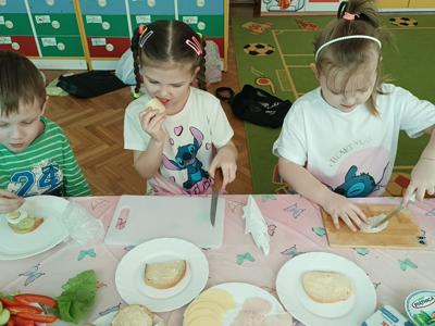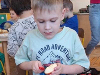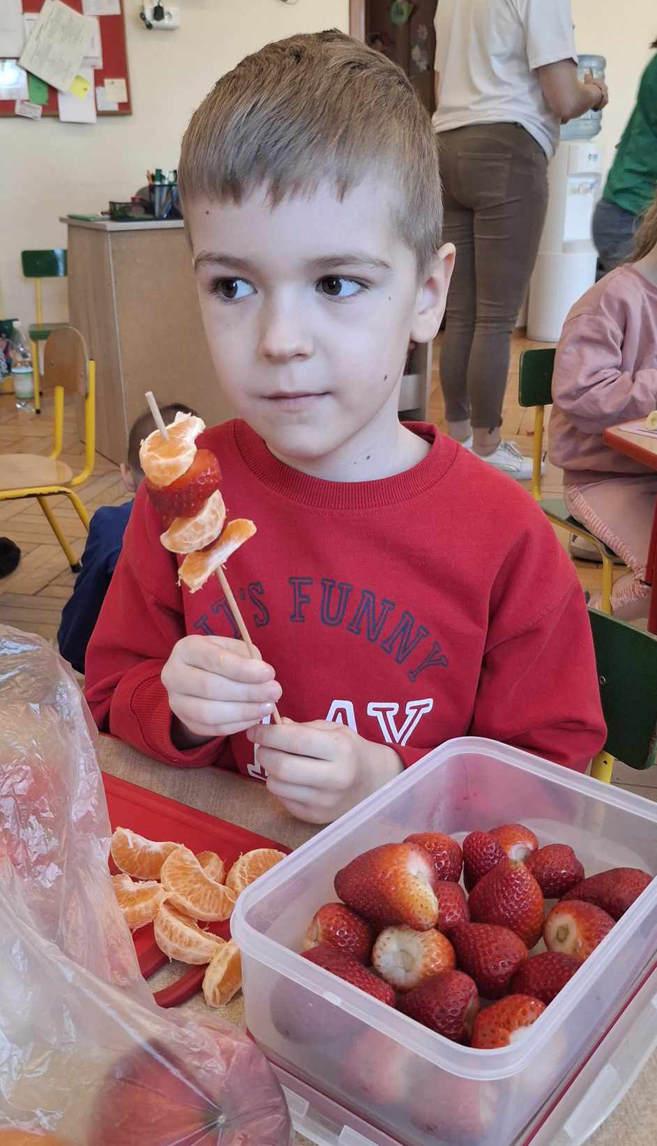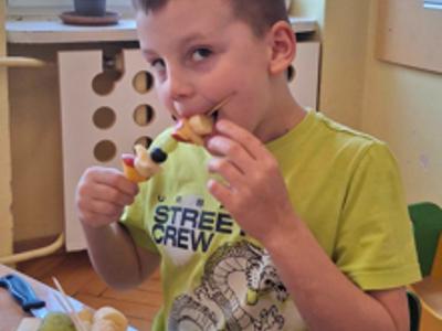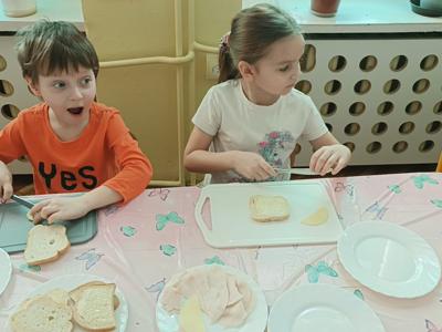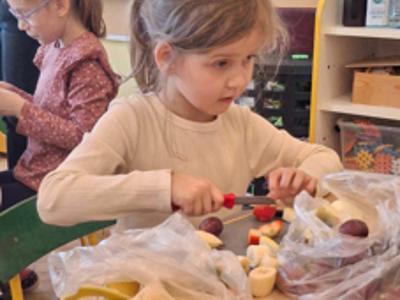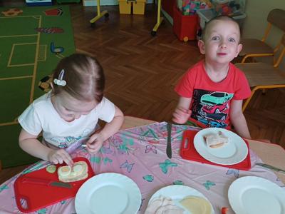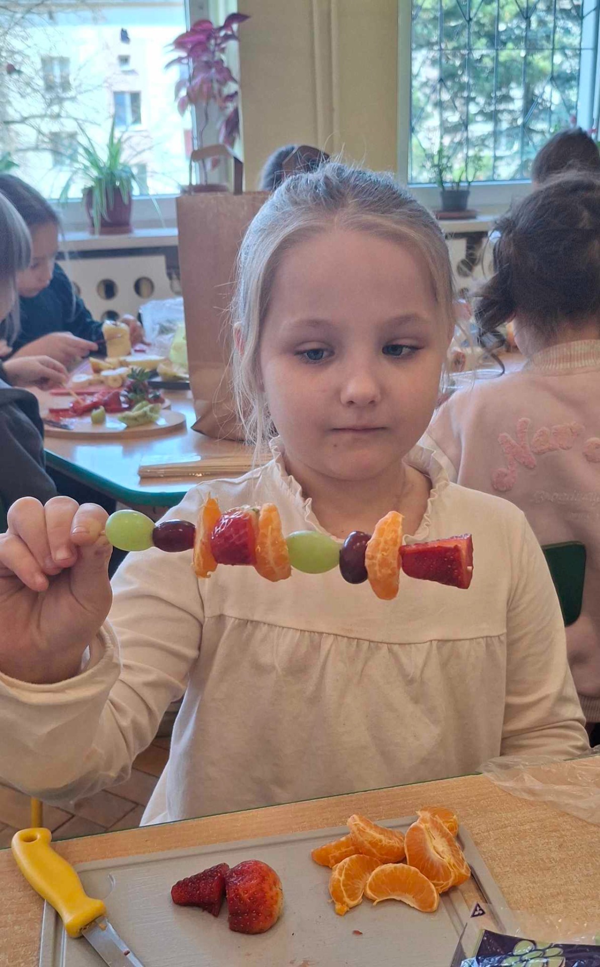 Dzieci z grupy Stokrotki oraz Biedronki w ramach rozmowy o zdrowym od偶ywianiu postanowi艂y samodzielne zrobi膰 pyszne, zdrowe kanapki oraz owocowe szasz艂yki. Najpierw dzieci pozna艂y korzy艣ci wynikaj膮ce ze spo偶ywania zdrowego jedzenia. Dowiedzia艂y si臋 jak wa偶na jest zbilansowana dieta, bogata w produkty zbo偶owe warzywa i owoce. Nast臋pnie przypomnia艂y sobie zasady bezpiecze艅stwa, kt贸rych nale偶y przestrzega膰 podczas pos艂ugiwania si臋 no偶em. Podczas robienia kanapek oraz szasz艂yk贸w kszta艂ci艂y odpowiednie nawyki 偶ywieniowe, rozwija艂y kreatywno艣膰, wyobra藕ni臋 oraz dba艂o艣膰 o higien臋.