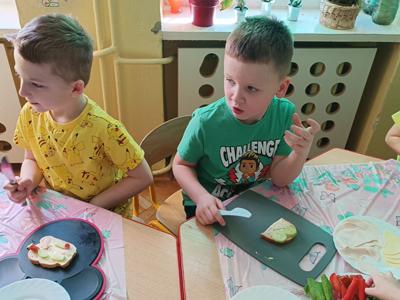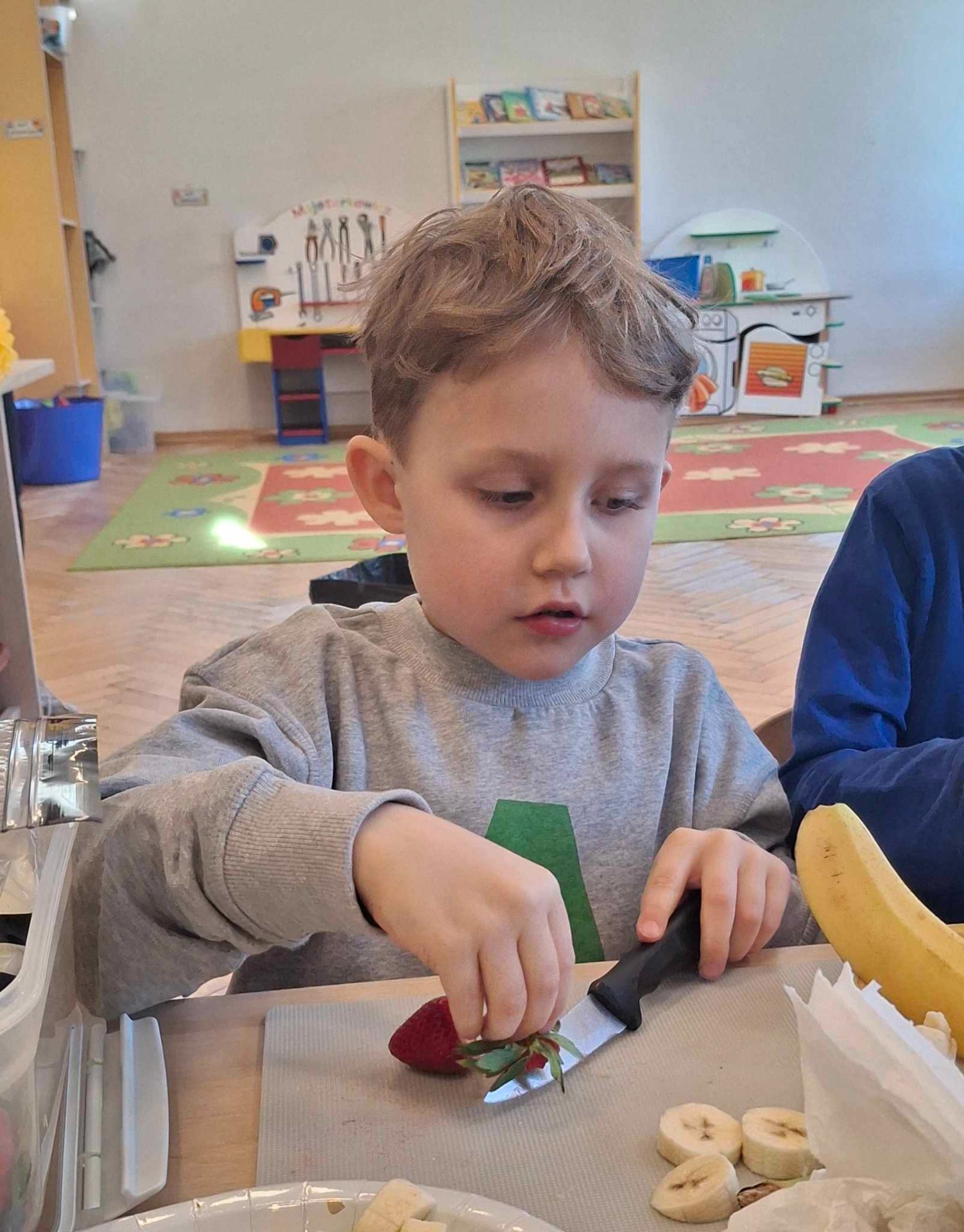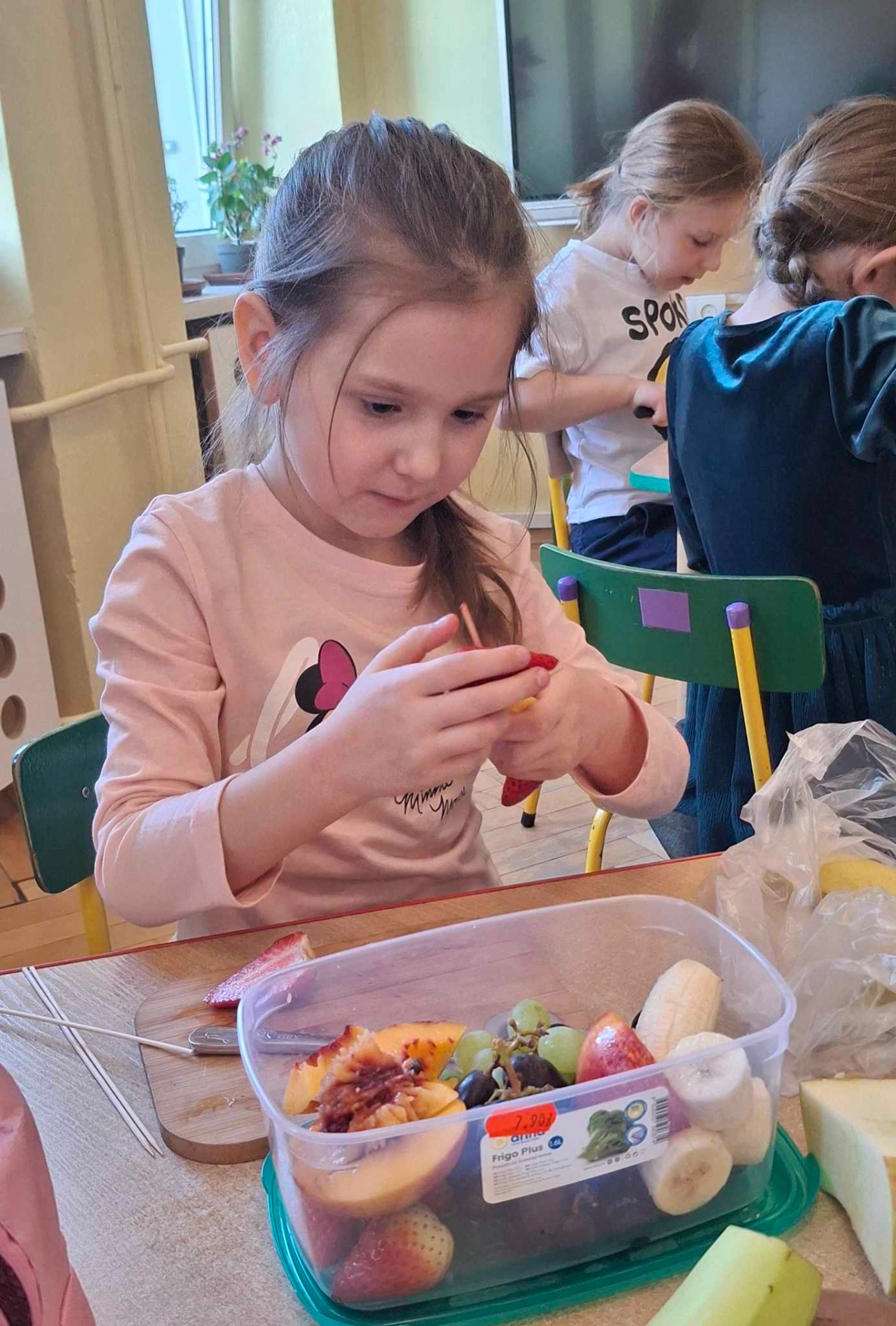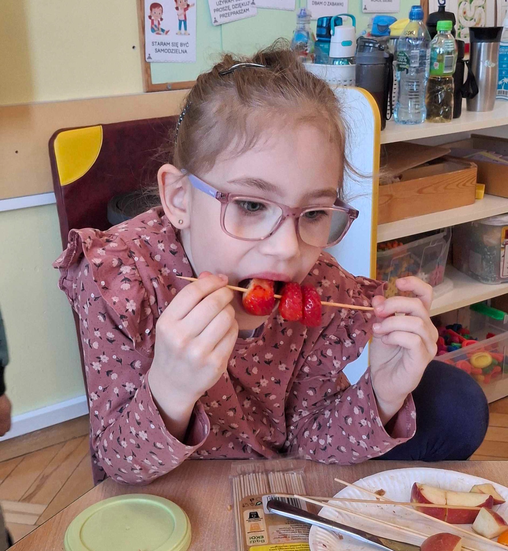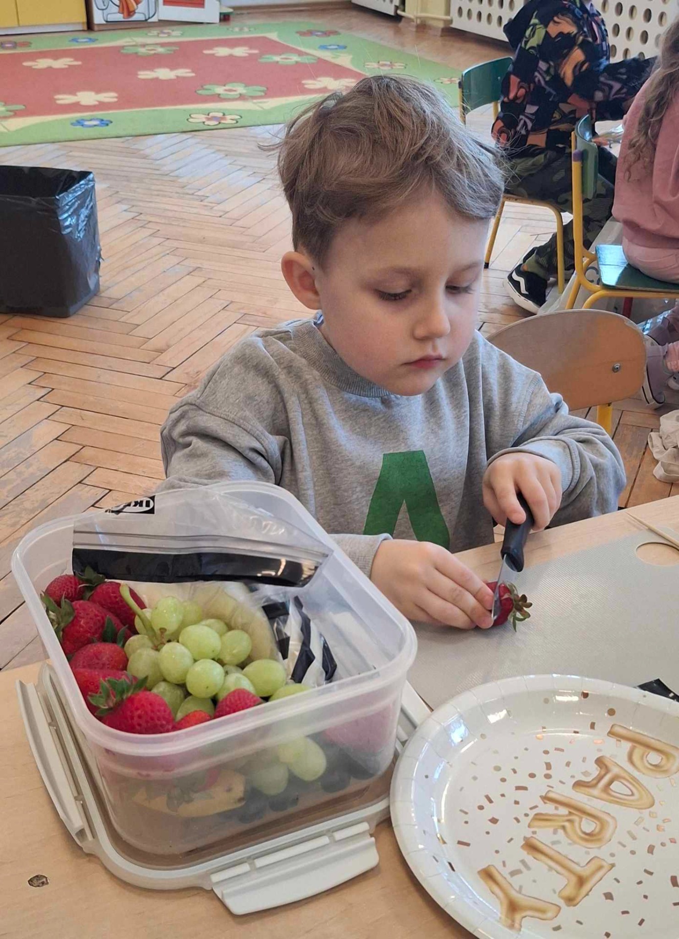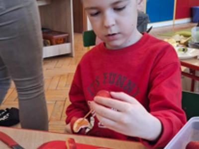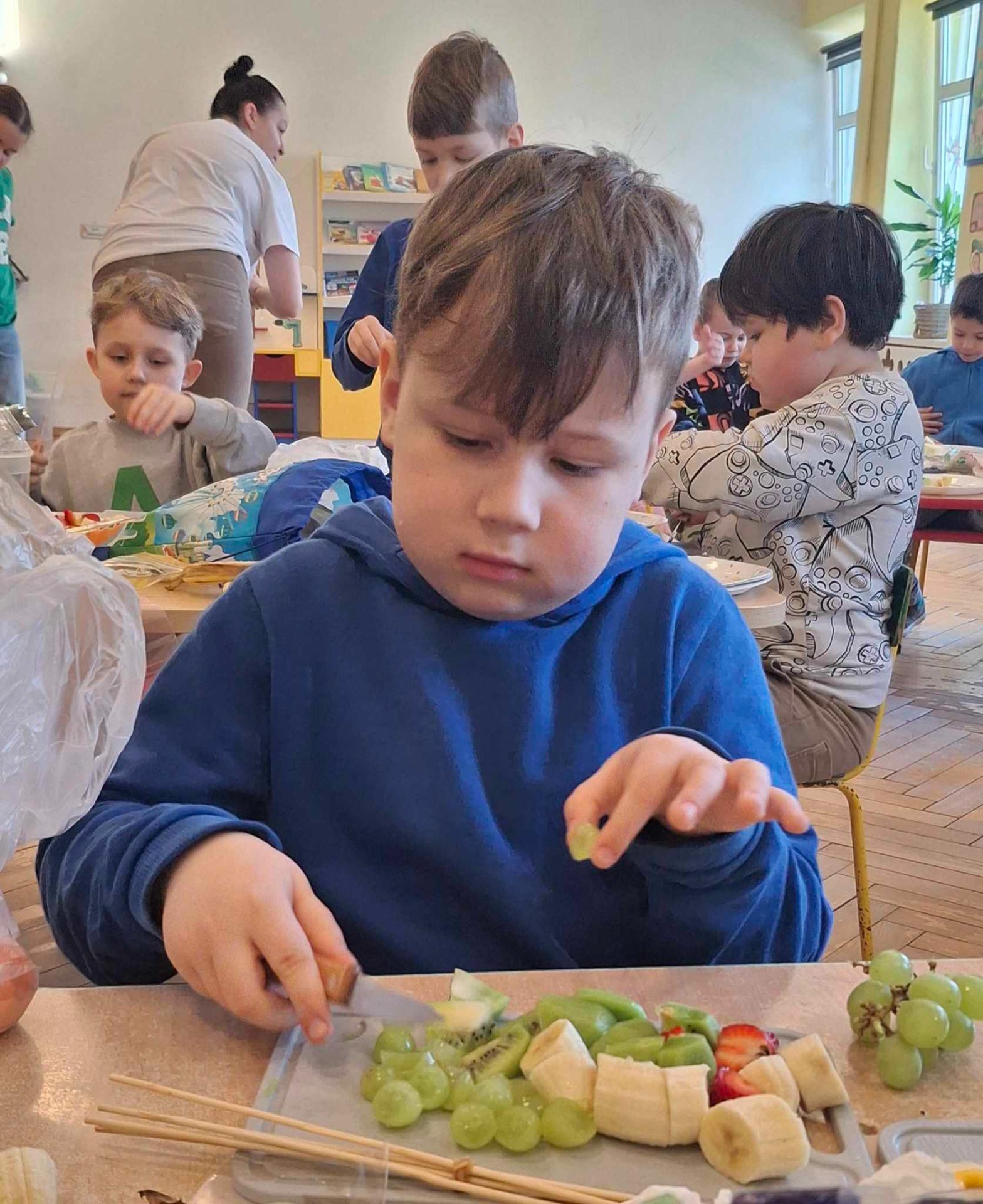 Dzieci z grupy Stokrotki oraz Biedronki w ramach rozmowy o zdrowym od偶ywianiu postanowi艂y samodzielne zrobi膰 pyszne, zdrowe kanapki oraz owocowe szasz艂yki. Najpierw dzieci pozna艂y korzy艣ci wynikaj膮ce ze spo偶ywania zdrowego jedzenia. Dowiedzia艂y si臋 jak wa偶na jest zbilansowana dieta, bogata w produkty zbo偶owe warzywa i owoce. Nast臋pnie przypomnia艂y sobie zasady bezpiecze艅stwa, kt贸rych nale偶y przestrzega膰 podczas pos艂ugiwania si臋 no偶em. Podczas robienia kanapek oraz szasz艂yk贸w kszta艂ci艂y odpowiednie nawyki 偶ywieniowe, rozwija艂y kreatywno艣膰, wyobra藕ni臋 oraz dba艂o艣膰 o higien臋.