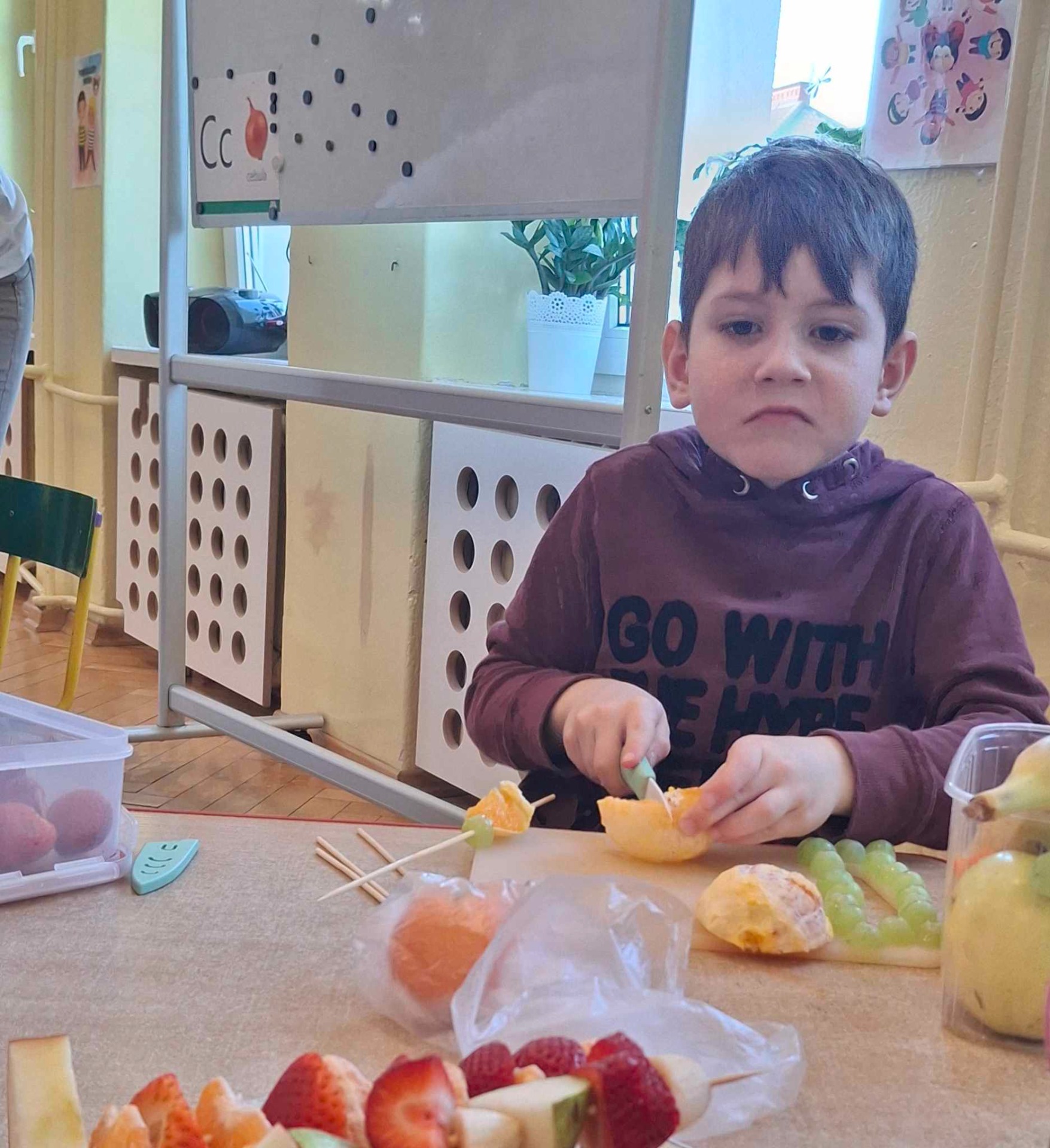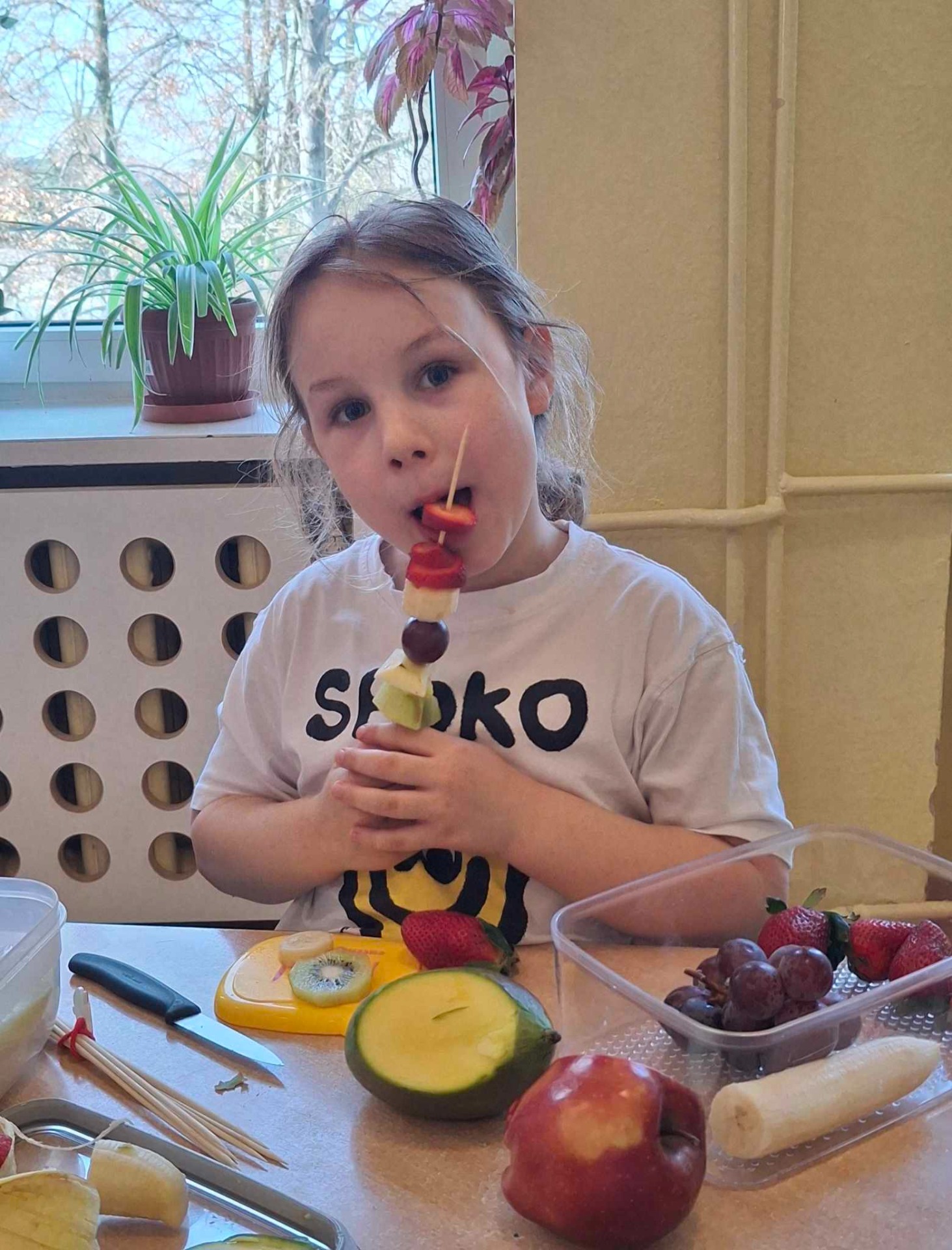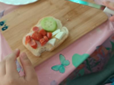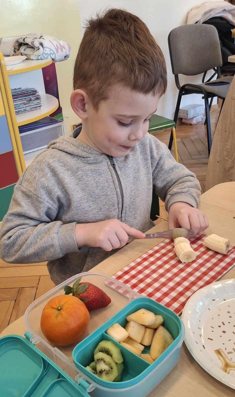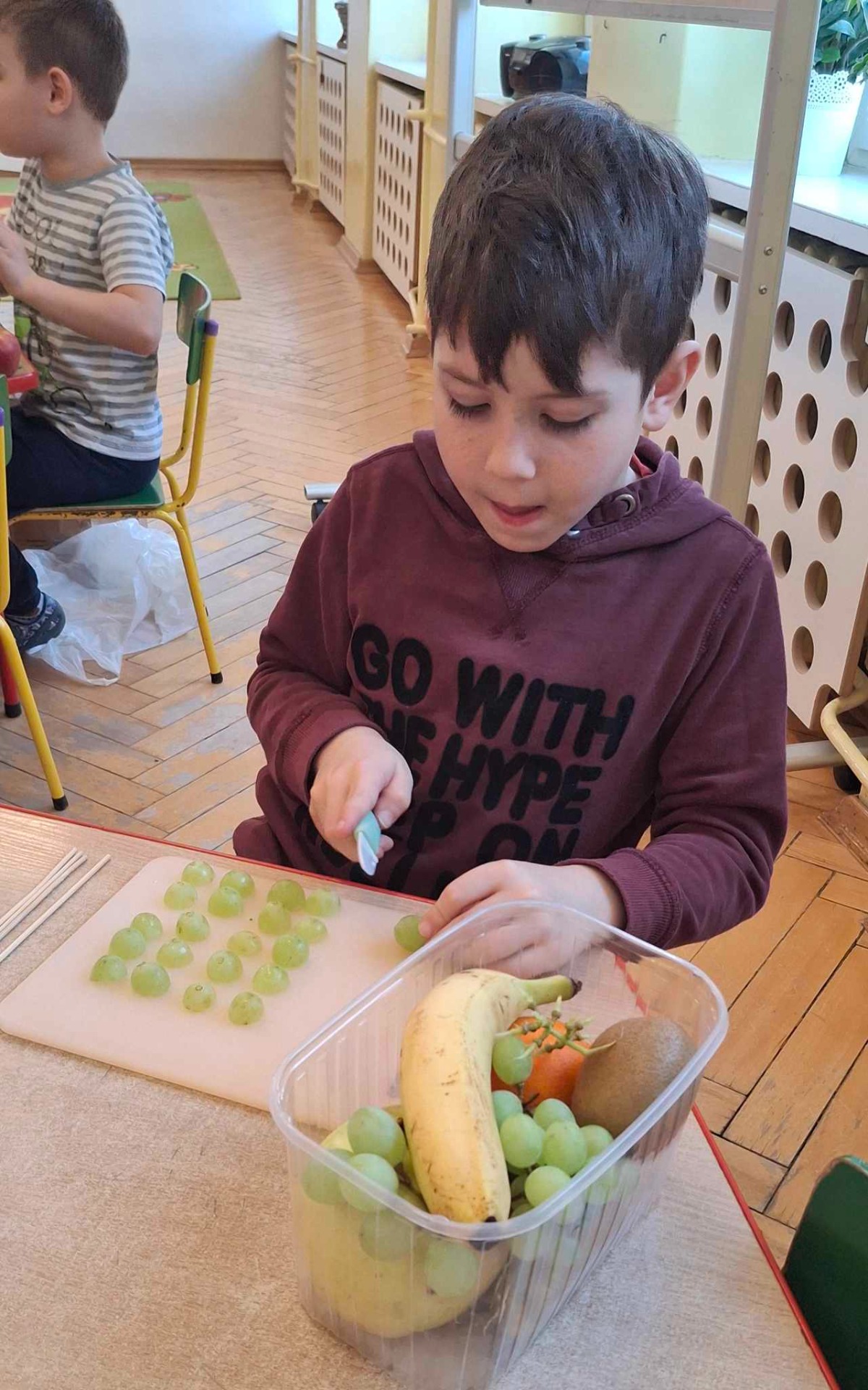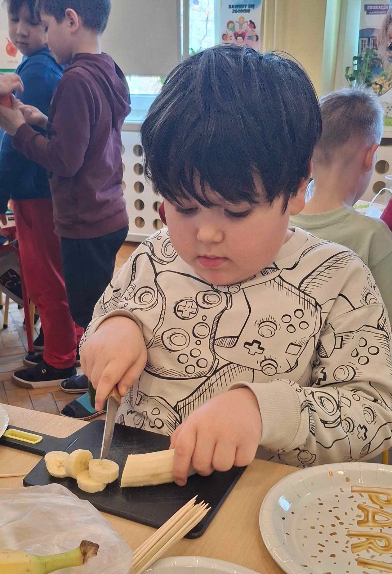 Dzieci z grupy Stokrotki oraz Biedronki w ramach rozmowy o zdrowym od偶ywianiu postanowi艂y samodzielne zrobi膰 pyszne, zdrowe kanapki oraz owocowe szasz艂yki. Najpierw dzieci pozna艂y korzy艣ci wynikaj膮ce ze spo偶ywania zdrowego jedzenia. Dowiedzia艂y si臋 jak wa偶na jest zbilansowana dieta, bogata w produkty zbo偶owe warzywa i owoce. Nast臋pnie przypomnia艂y sobie zasady bezpiecze艅stwa, kt贸rych nale偶y przestrzega膰 podczas pos艂ugiwania si臋 no偶em. Podczas robienia kanapek oraz szasz艂yk贸w kszta艂ci艂y odpowiednie nawyki 偶ywieniowe, rozwija艂y kreatywno艣膰, wyobra藕ni臋 oraz dba艂o艣膰 o higien臋.