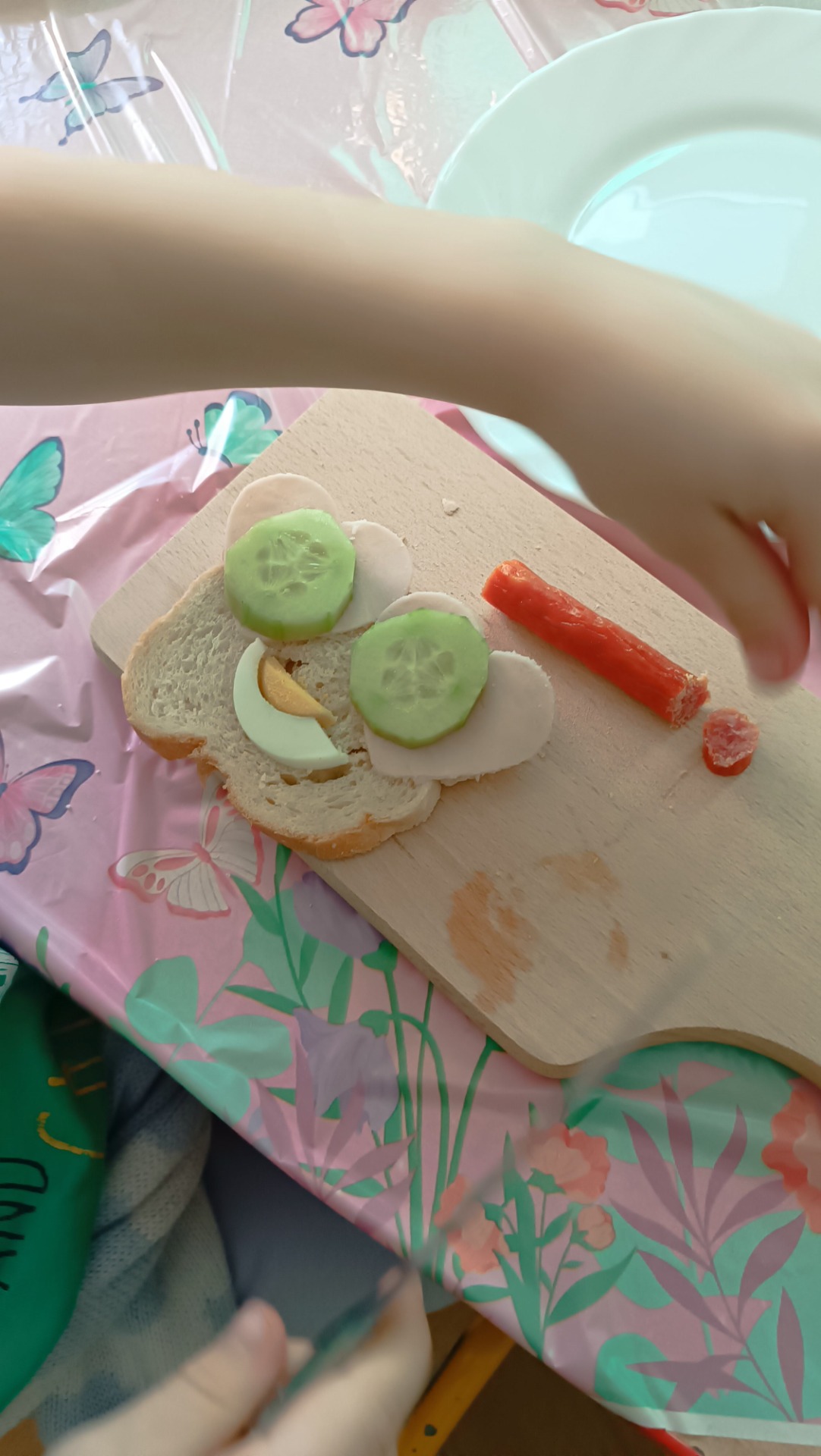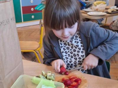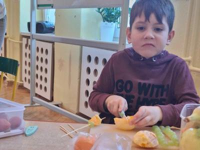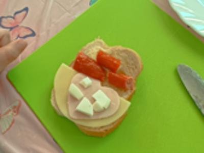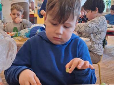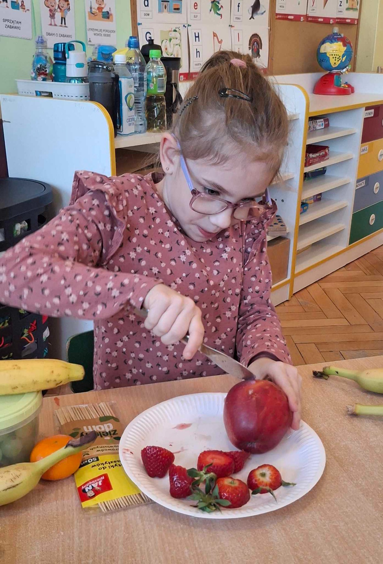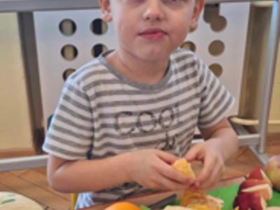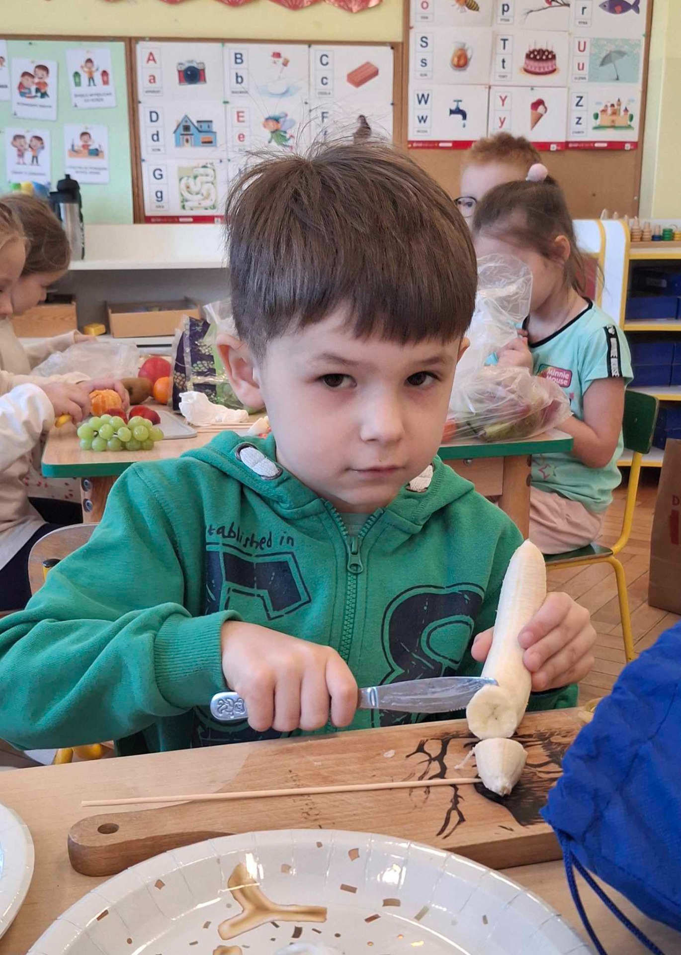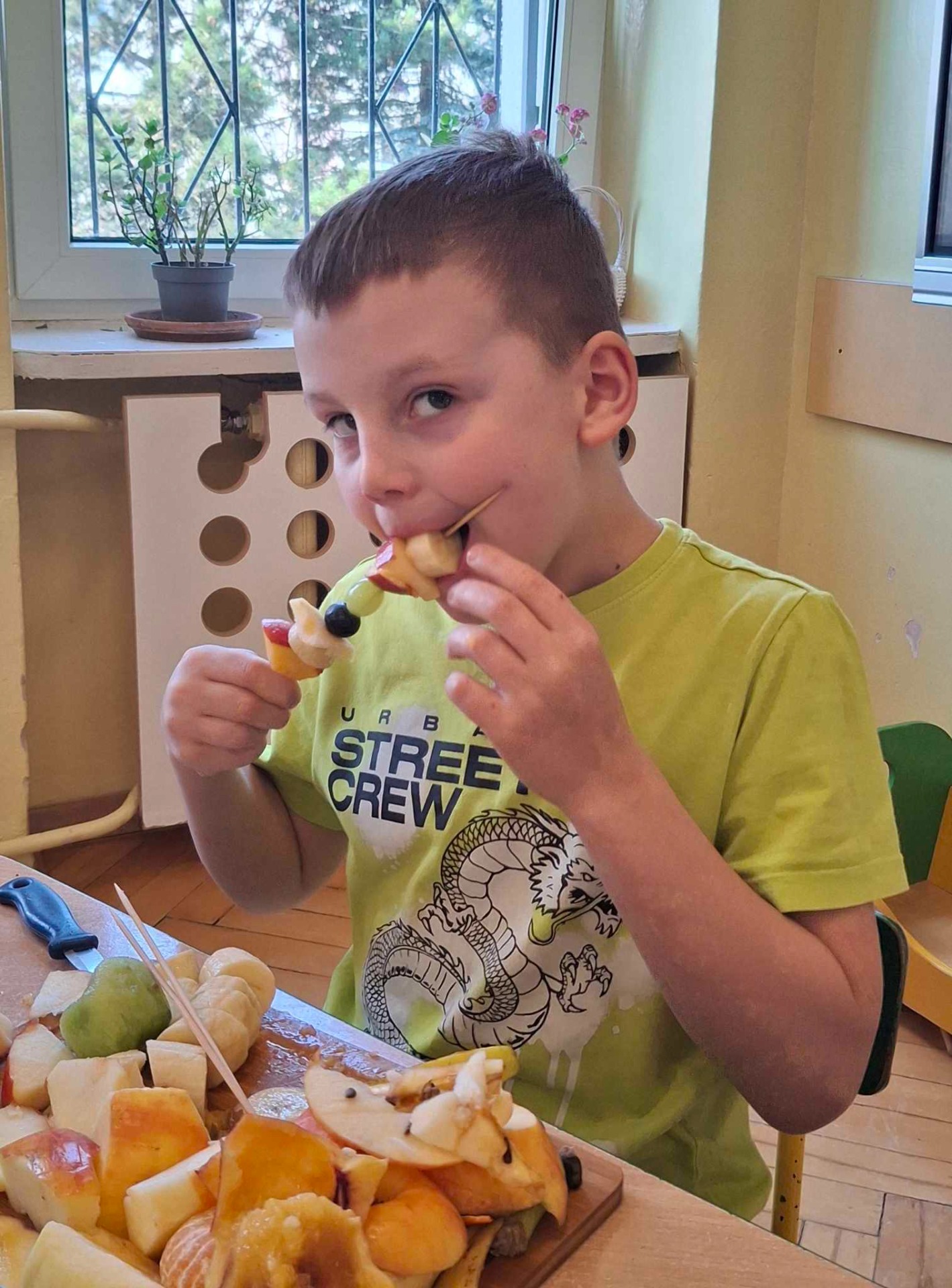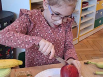 Dzieci z grupy Stokrotki oraz Biedronki w ramach rozmowy o zdrowym od偶ywianiu postanowi艂y samodzielne zrobi膰 pyszne, zdrowe kanapki oraz owocowe szasz艂yki. Najpierw dzieci pozna艂y korzy艣ci wynikaj膮ce ze spo偶ywania zdrowego jedzenia. Dowiedzia艂y si臋 jak wa偶na jest zbilansowana dieta, bogata w produkty zbo偶owe warzywa i owoce. Nast臋pnie przypomnia艂y sobie zasady bezpiecze艅stwa, kt贸rych nale偶y przestrzega膰 podczas pos艂ugiwania si臋 no偶em. Podczas robienia kanapek oraz szasz艂yk贸w kszta艂ci艂y odpowiednie nawyki 偶ywieniowe, rozwija艂y kreatywno艣膰, wyobra藕ni臋 oraz dba艂o艣膰 o higien臋.