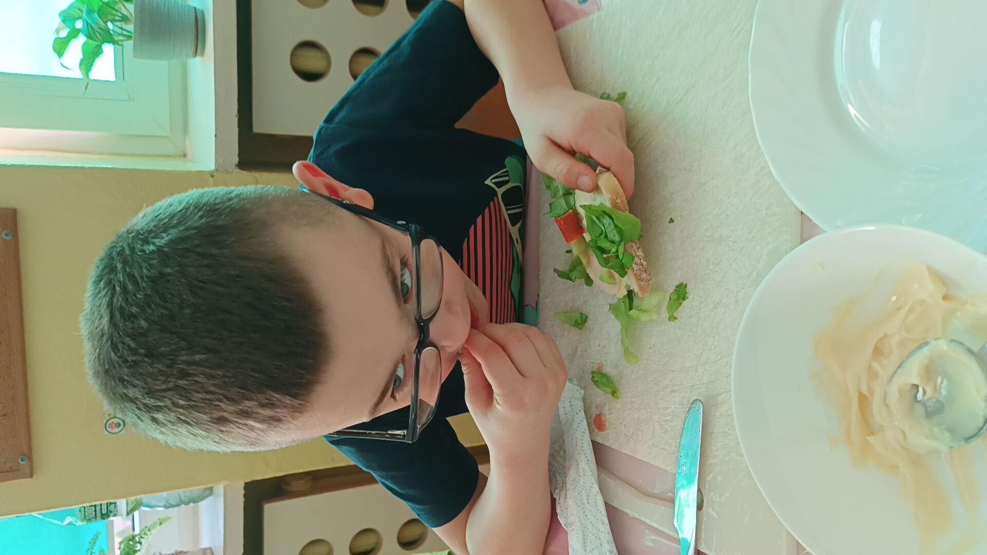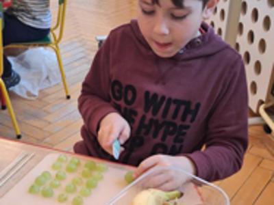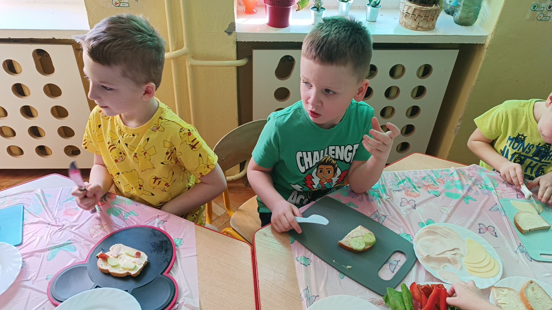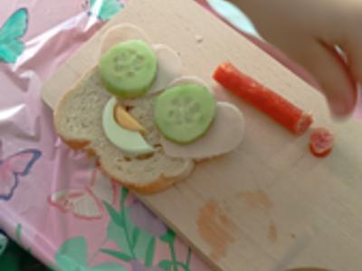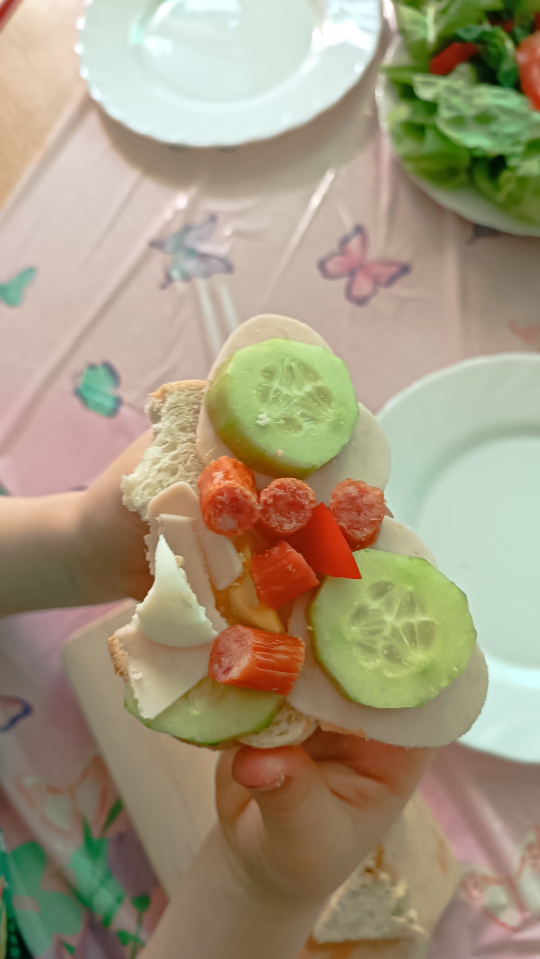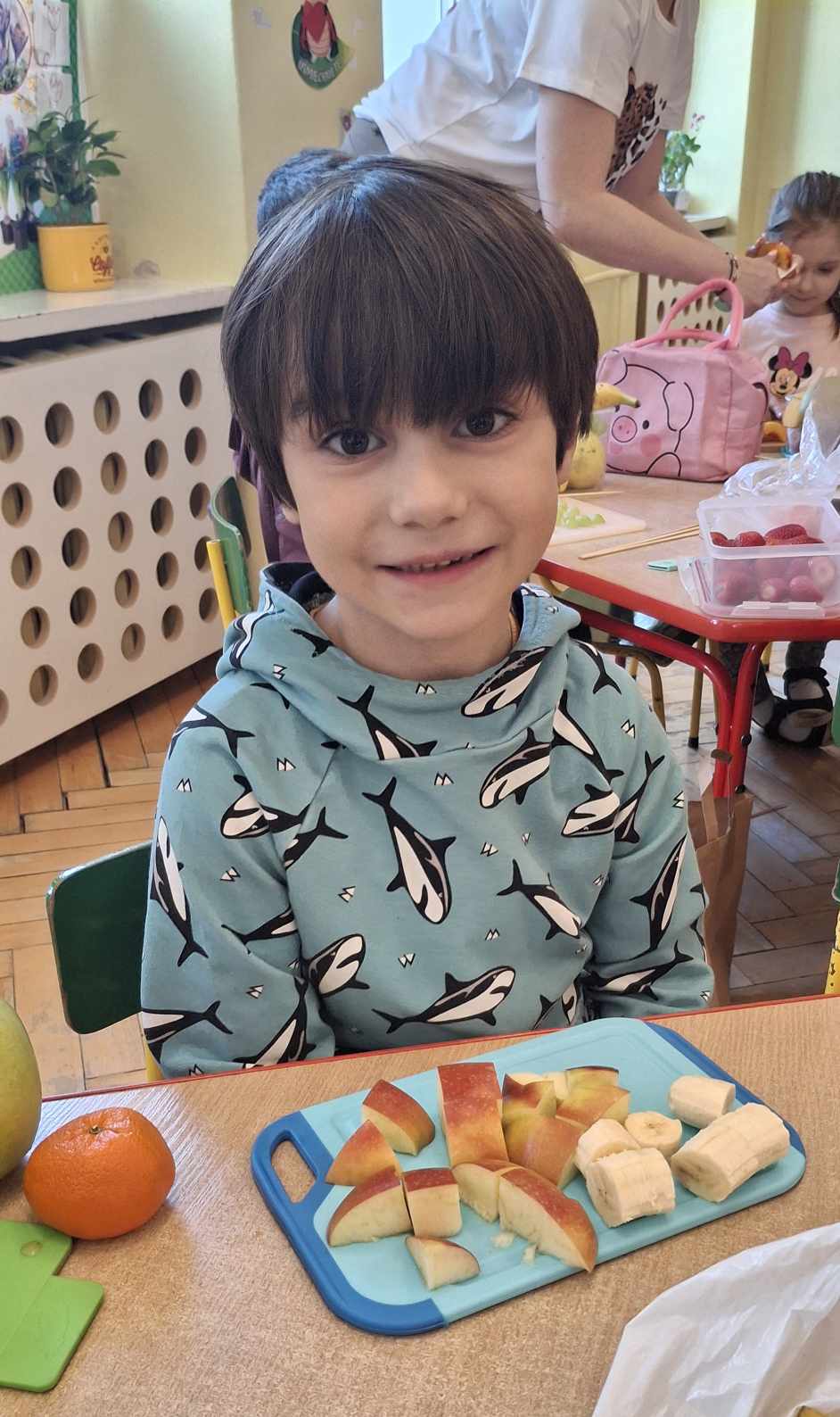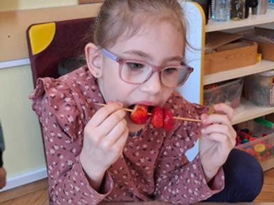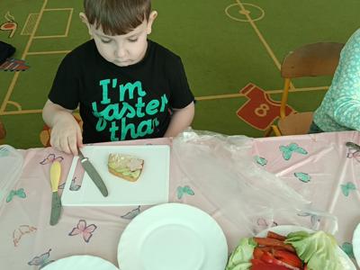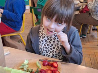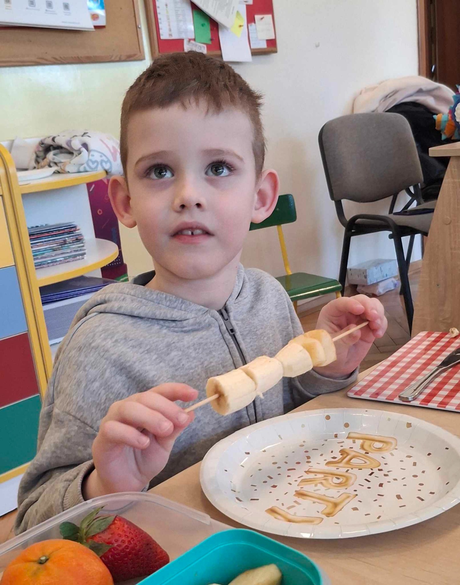 Dzieci z grupy Stokrotki oraz Biedronki w ramach rozmowy o zdrowym od偶ywianiu postanowi艂y samodzielne zrobi膰 pyszne, zdrowe kanapki oraz owocowe szasz艂yki. Najpierw dzieci pozna艂y korzy艣ci wynikaj膮ce ze spo偶ywania zdrowego jedzenia. Dowiedzia艂y si臋 jak wa偶na jest zbilansowana dieta, bogata w produkty zbo偶owe warzywa i owoce. Nast臋pnie przypomnia艂y sobie zasady bezpiecze艅stwa, kt贸rych nale偶y przestrzega膰 podczas pos艂ugiwania si臋 no偶em. Podczas robienia kanapek oraz szasz艂yk贸w kszta艂ci艂y odpowiednie nawyki 偶ywieniowe, rozwija艂y kreatywno艣膰, wyobra藕ni臋 oraz dba艂o艣膰 o higien臋.
