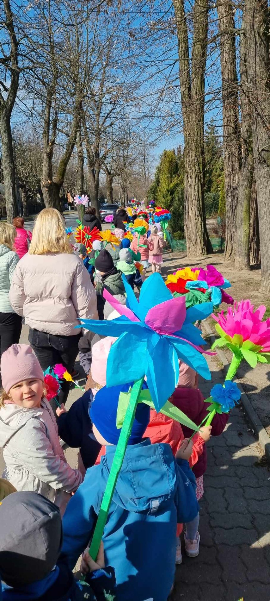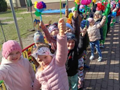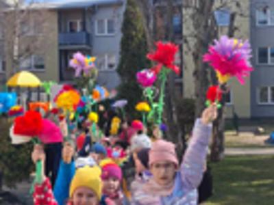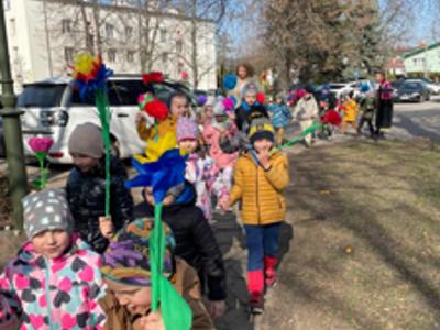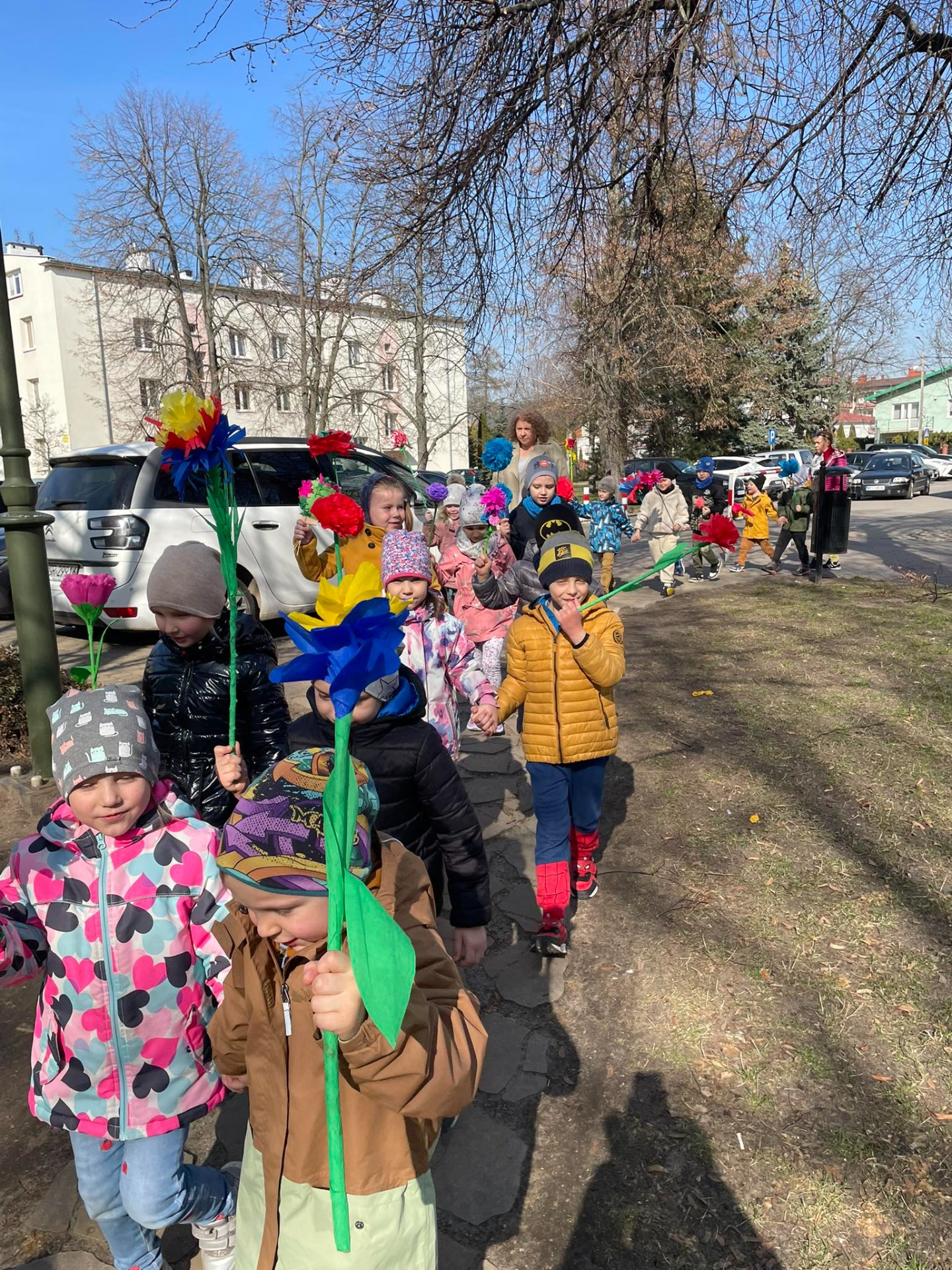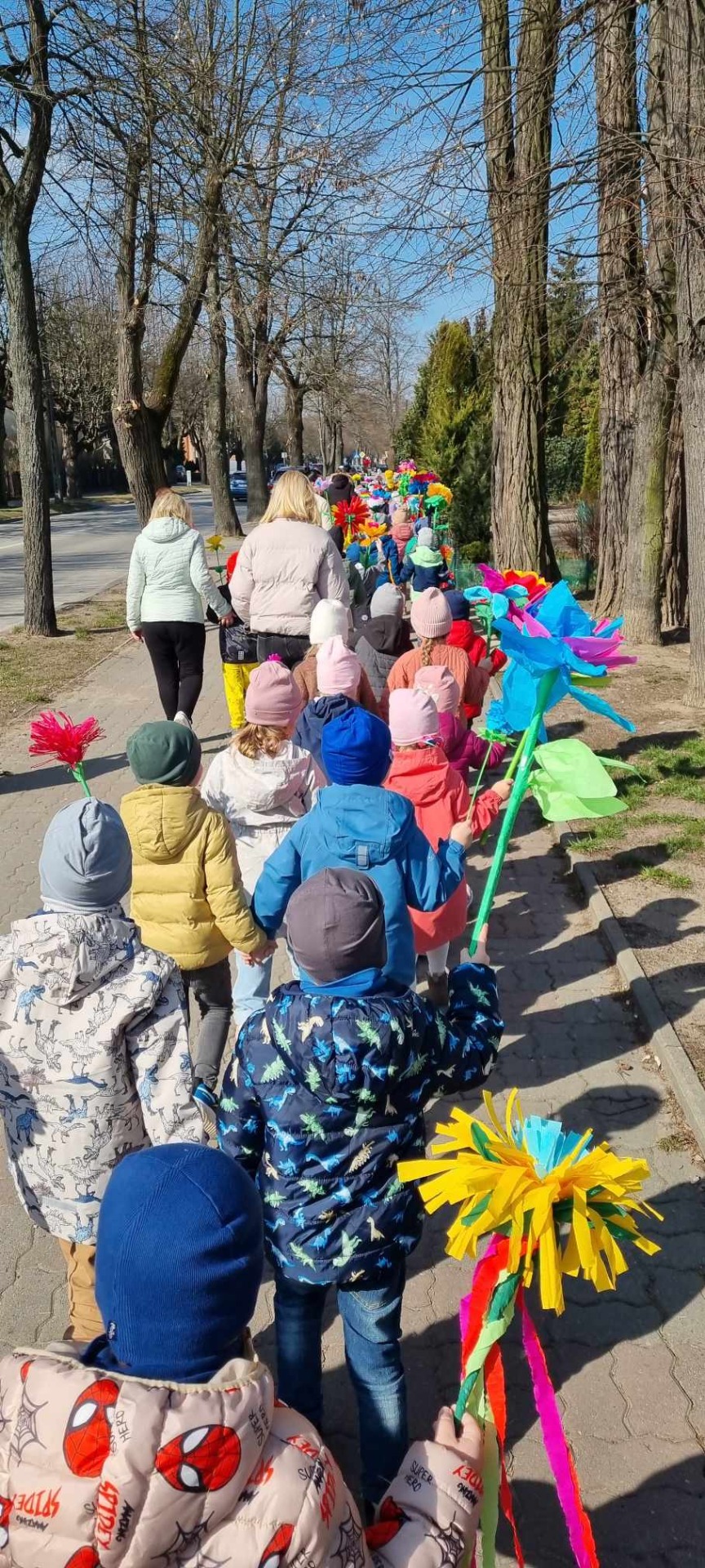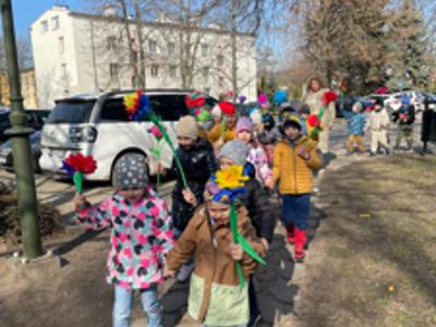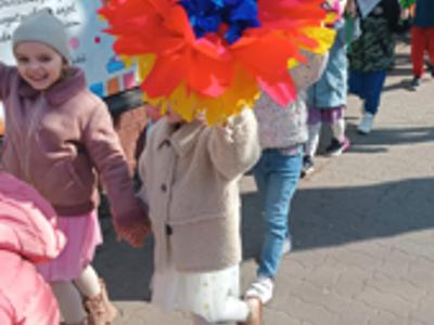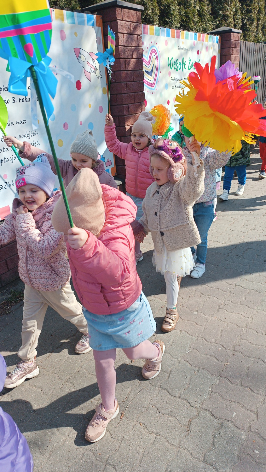 21 marca w pierwszy dzień kalendarzowej wiosny dzieci z wszystkich grup wyruszyły barwnym korowodem, aby powitać wiosnę.