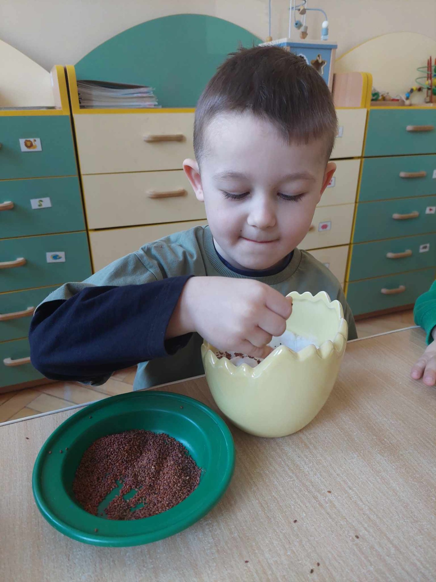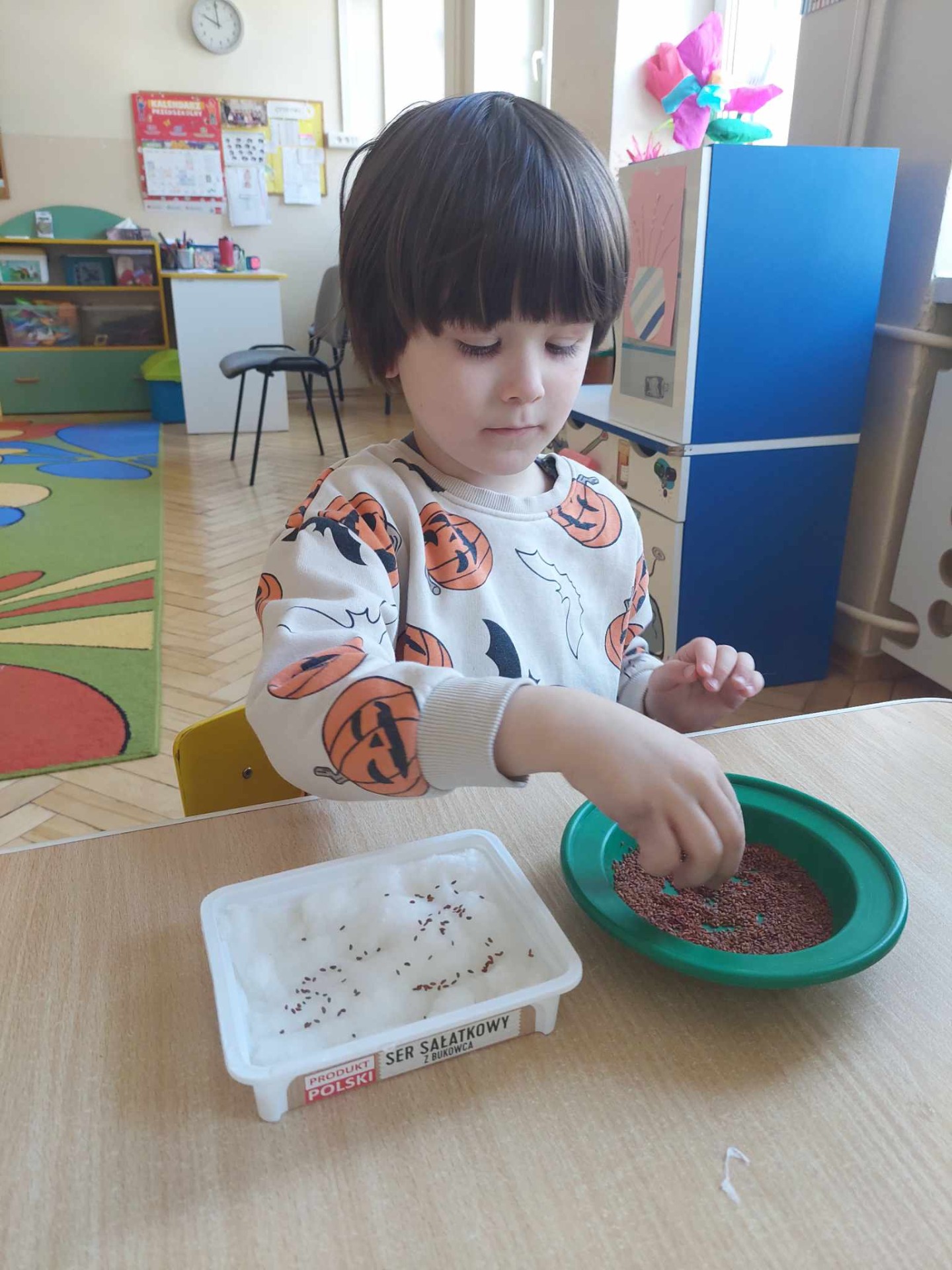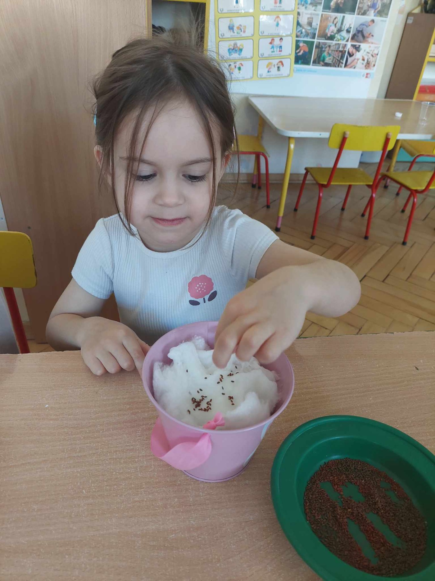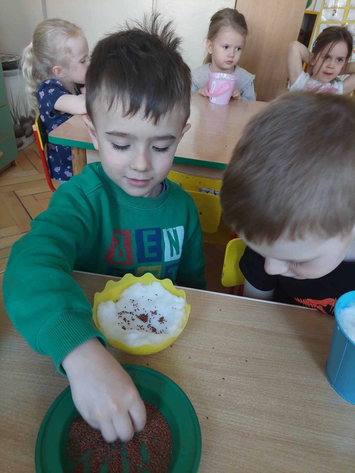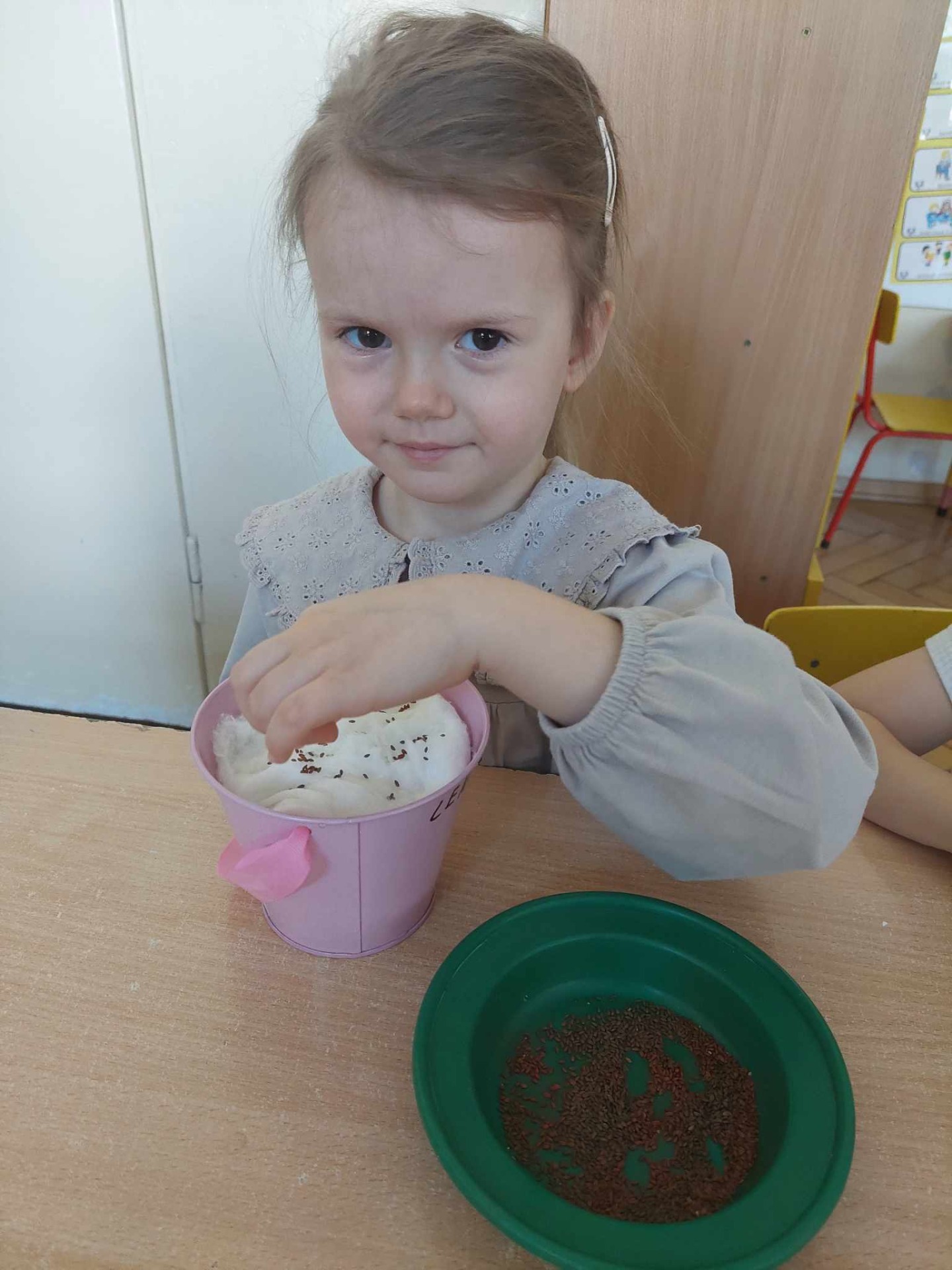 Dzieci z radością i dużym zaangażowaniem zasiały zdrową i przepyszną rzeżuchę. Przedszkolaki doskonale poradziły sobie z zadaniem. Potrzebowały do tego małych plastikowych pojemników, waty kosmetycznej, nasion rzeżuchy oraz wody. Teraz codziennie będą ją podlewać i obserwować jak rośnie.