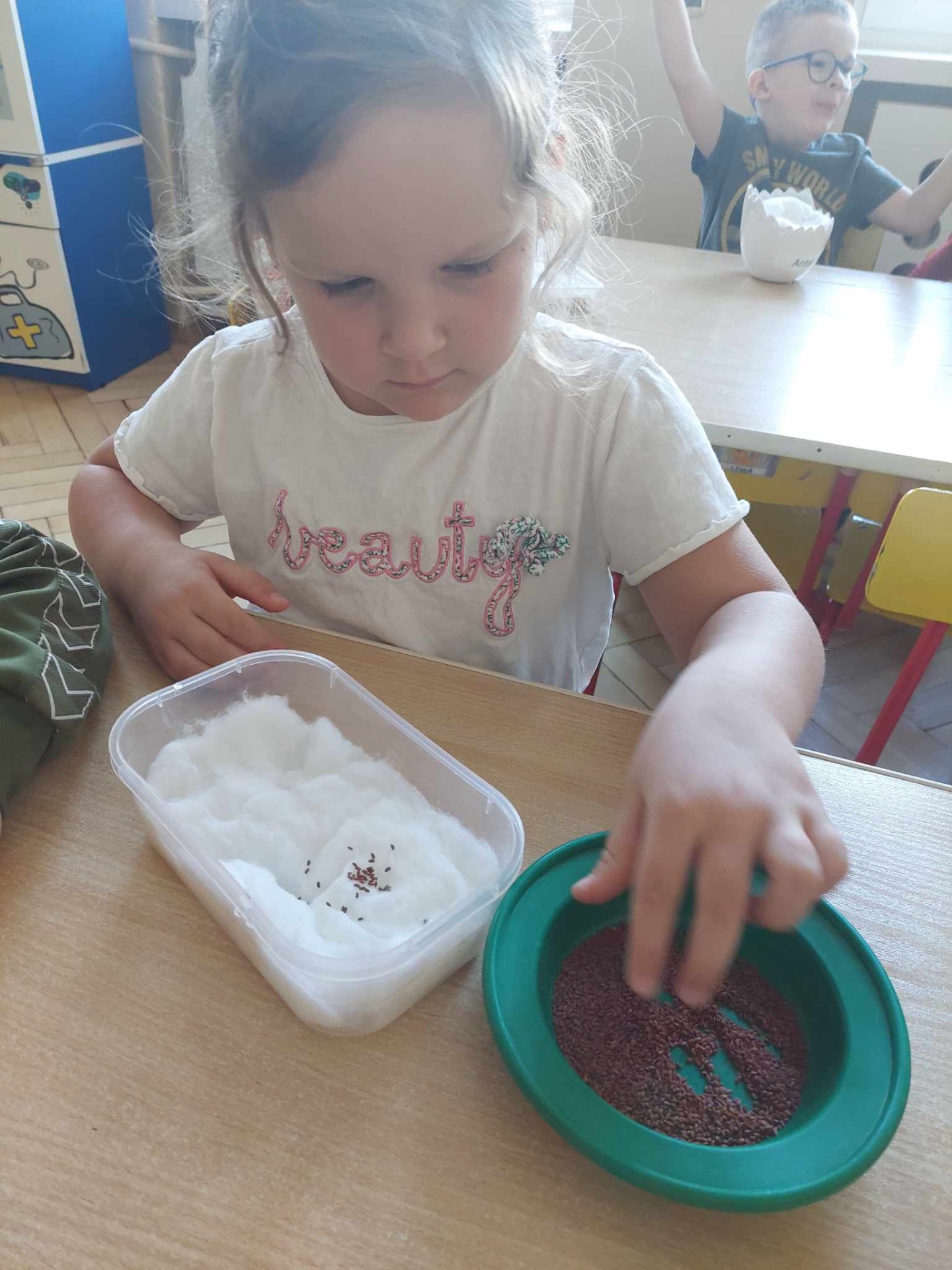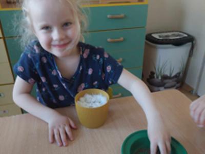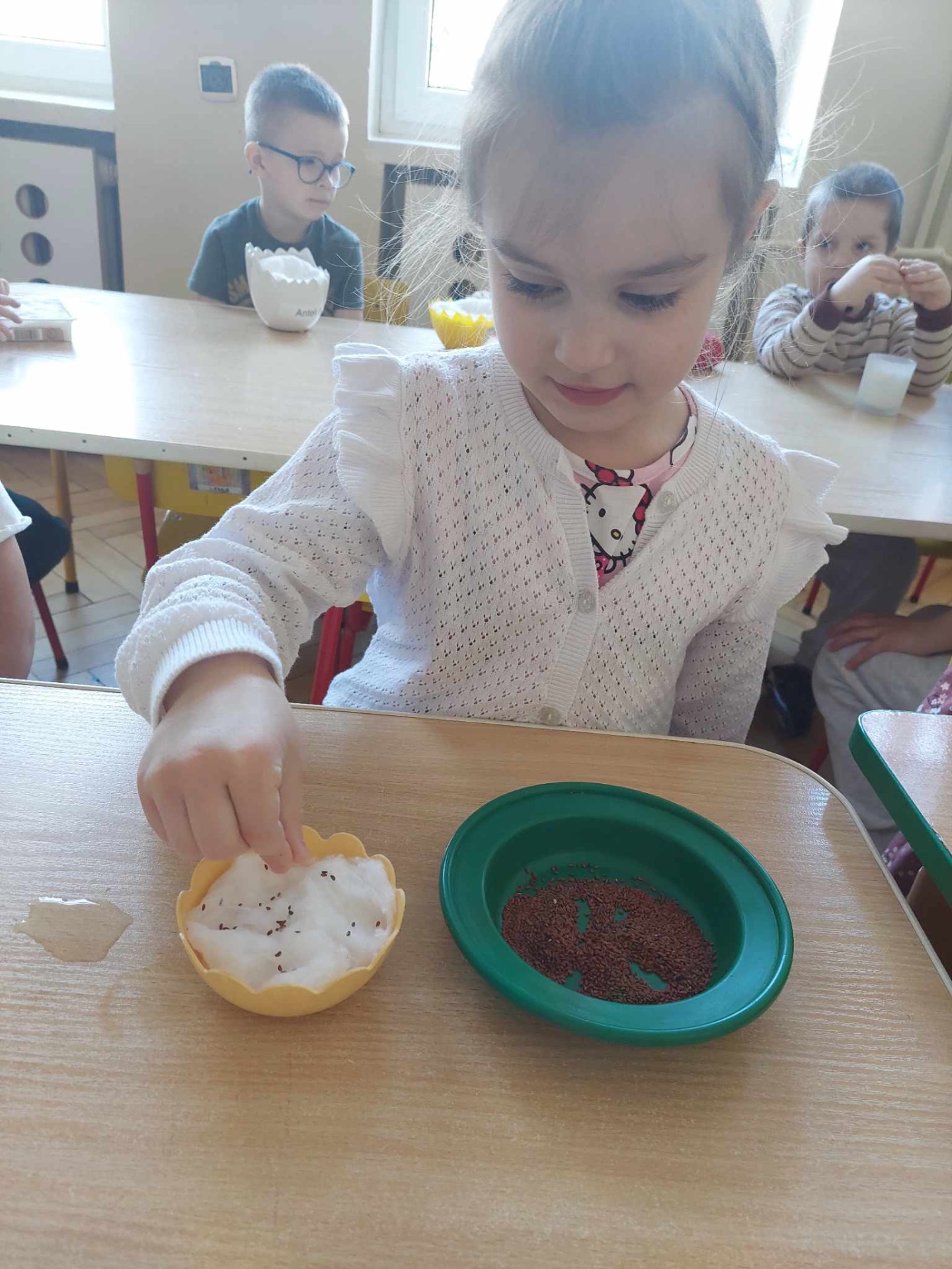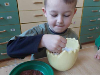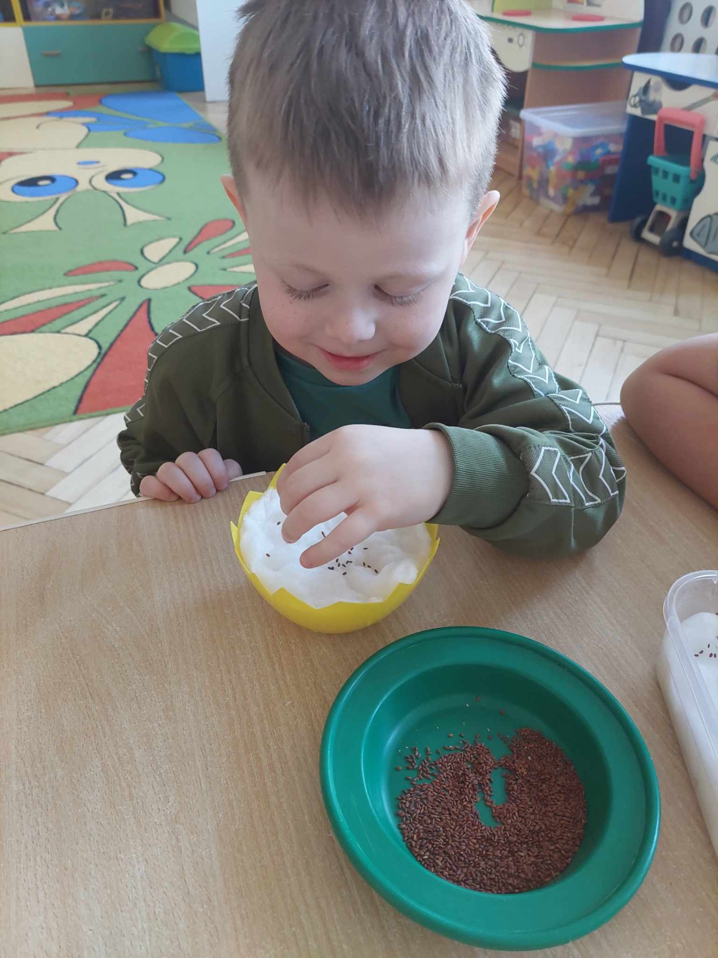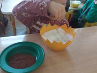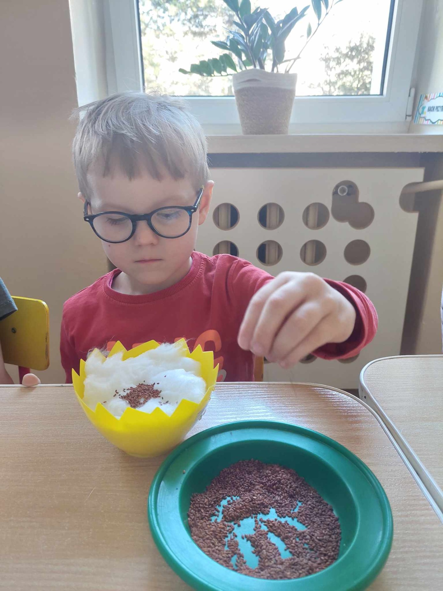 Dzieci z radością i dużym zaangażowaniem zasiały zdrową i przepyszną rzeżuchę. Przedszkolaki doskonale poradziły sobie z zadaniem. Potrzebowały do tego małych plastikowych pojemników, waty kosmetycznej, nasion rzeżuchy oraz wody. Teraz codziennie będą ją podlewać i obserwować jak rośnie.