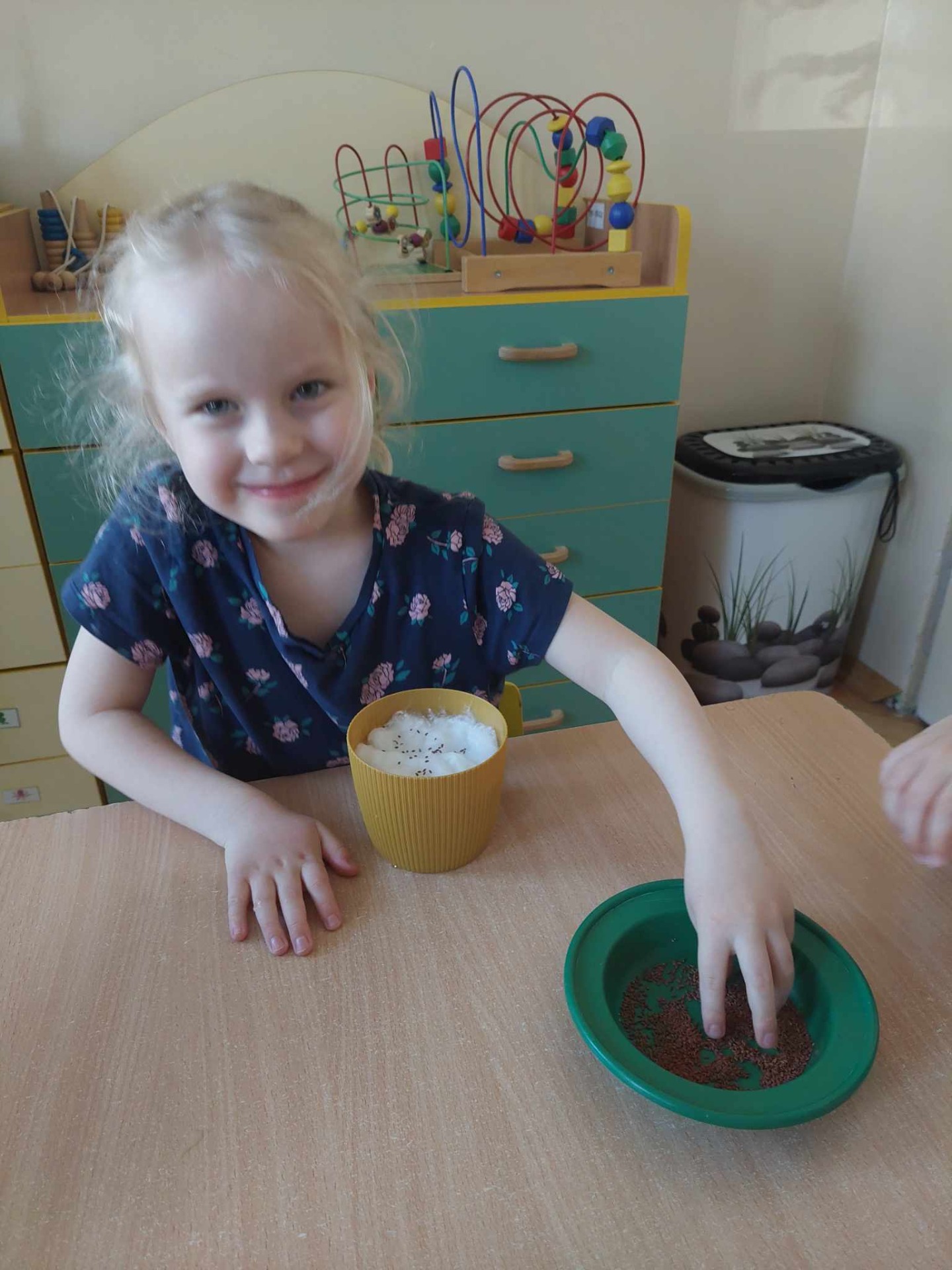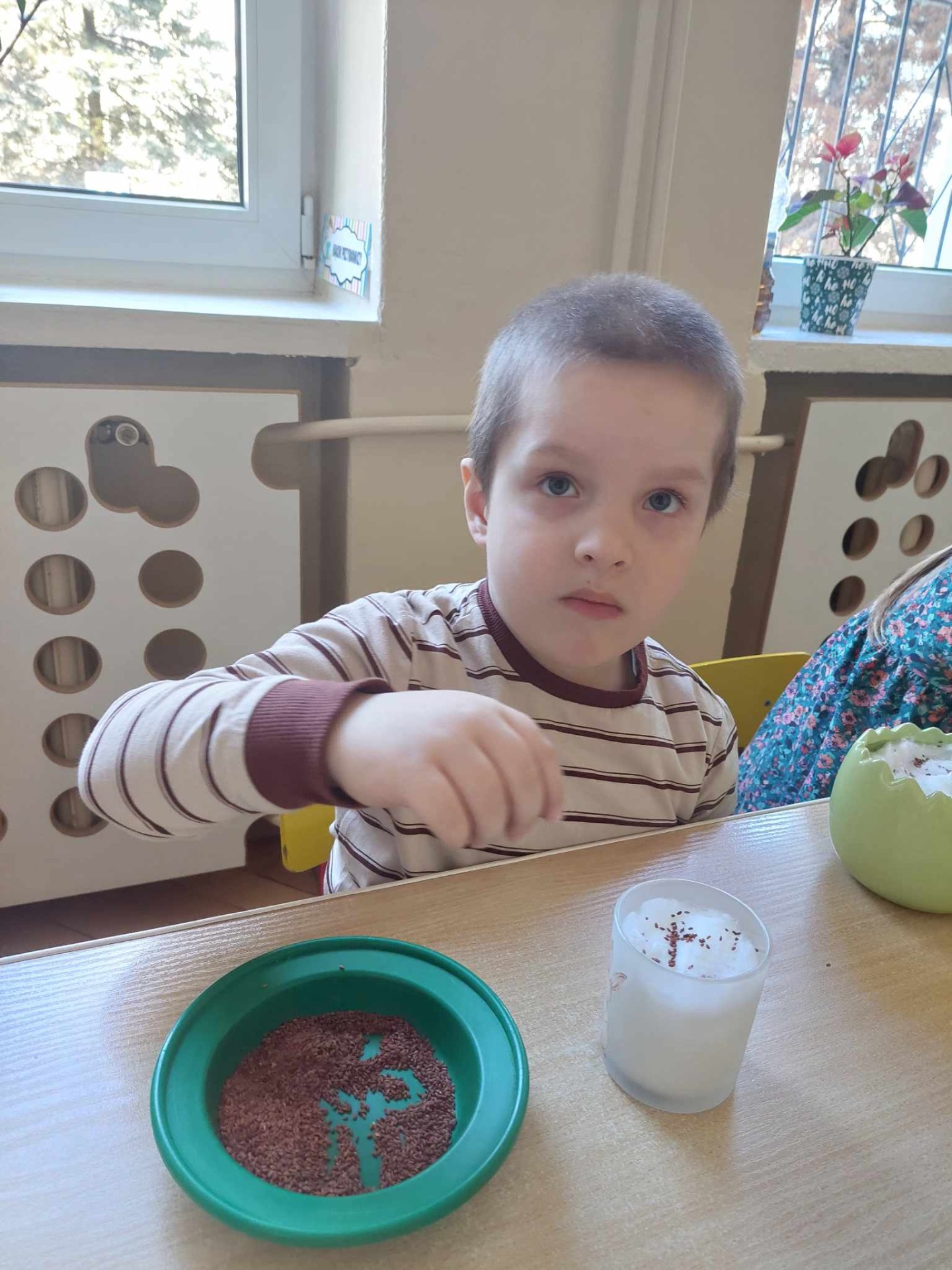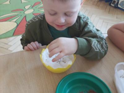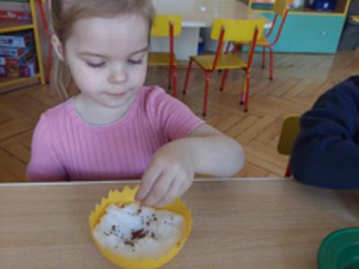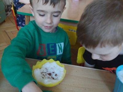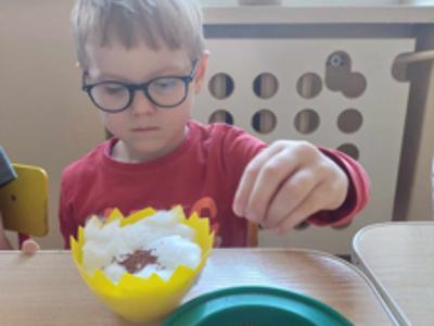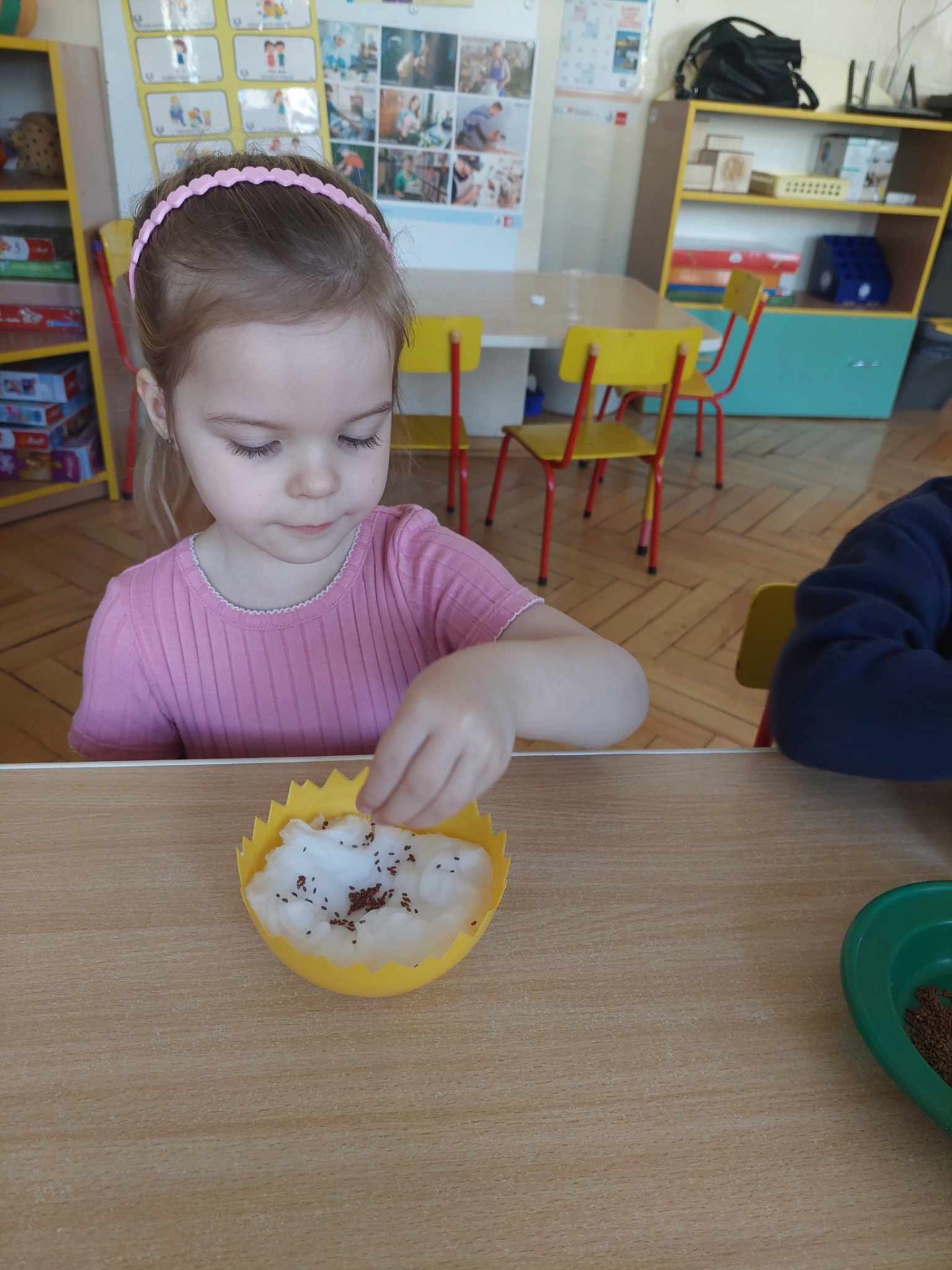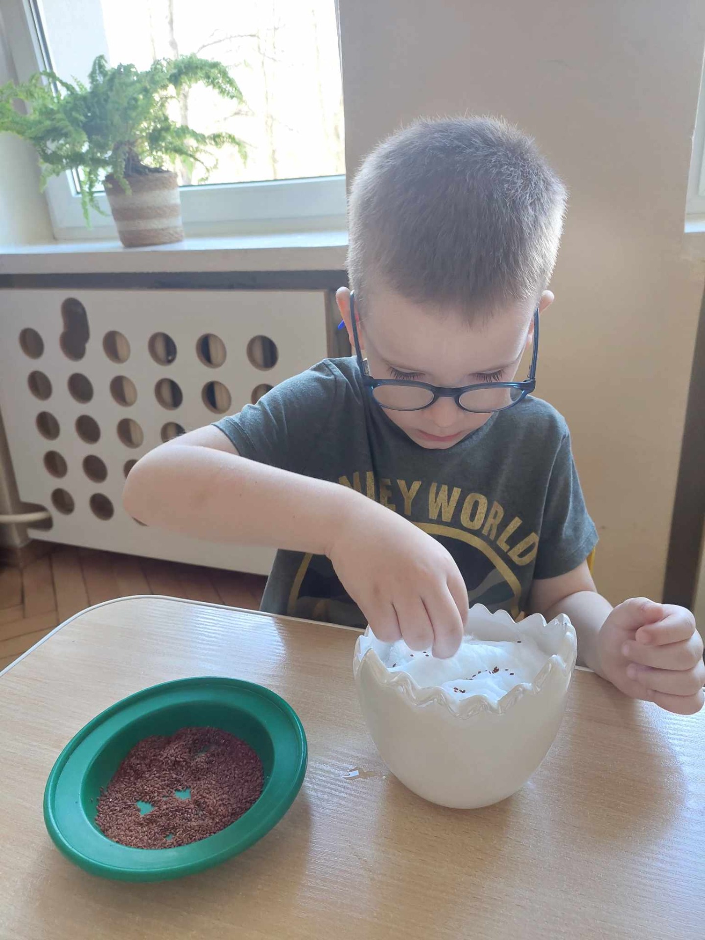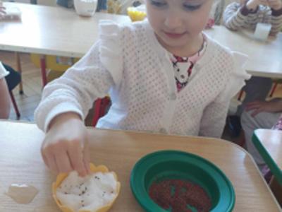 Dzieci z radością i dużym zaangażowaniem zasiały zdrową i przepyszną rzeżuchę. Przedszkolaki doskonale poradziły sobie z zadaniem. Potrzebowały do tego małych plastikowych pojemników, waty kosmetycznej, nasion rzeżuchy oraz wody. Teraz codziennie będą ją podlewać i obserwować jak rośnie.