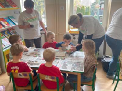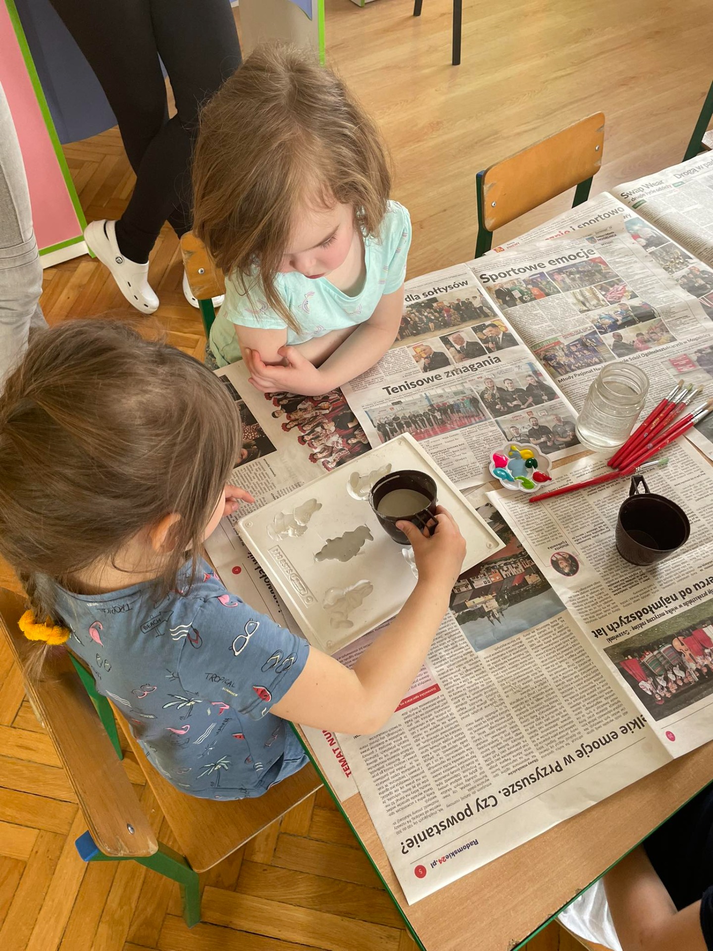Przedszkolaki podczas warsztatu poznały proces powstania odlewów gipsowych, począwszy od przygotowania masy gipsowej po gotowe odlewy. Łopatkami mieszały masę gipsową, nakładały do formy i wygładzały, by w każdej foremce był gips.