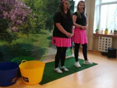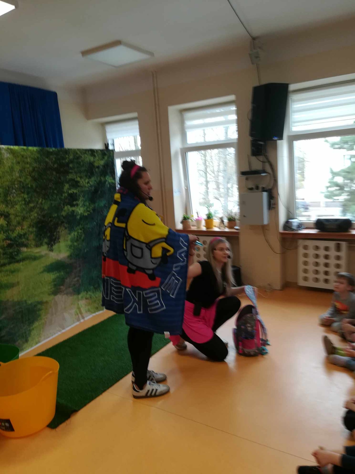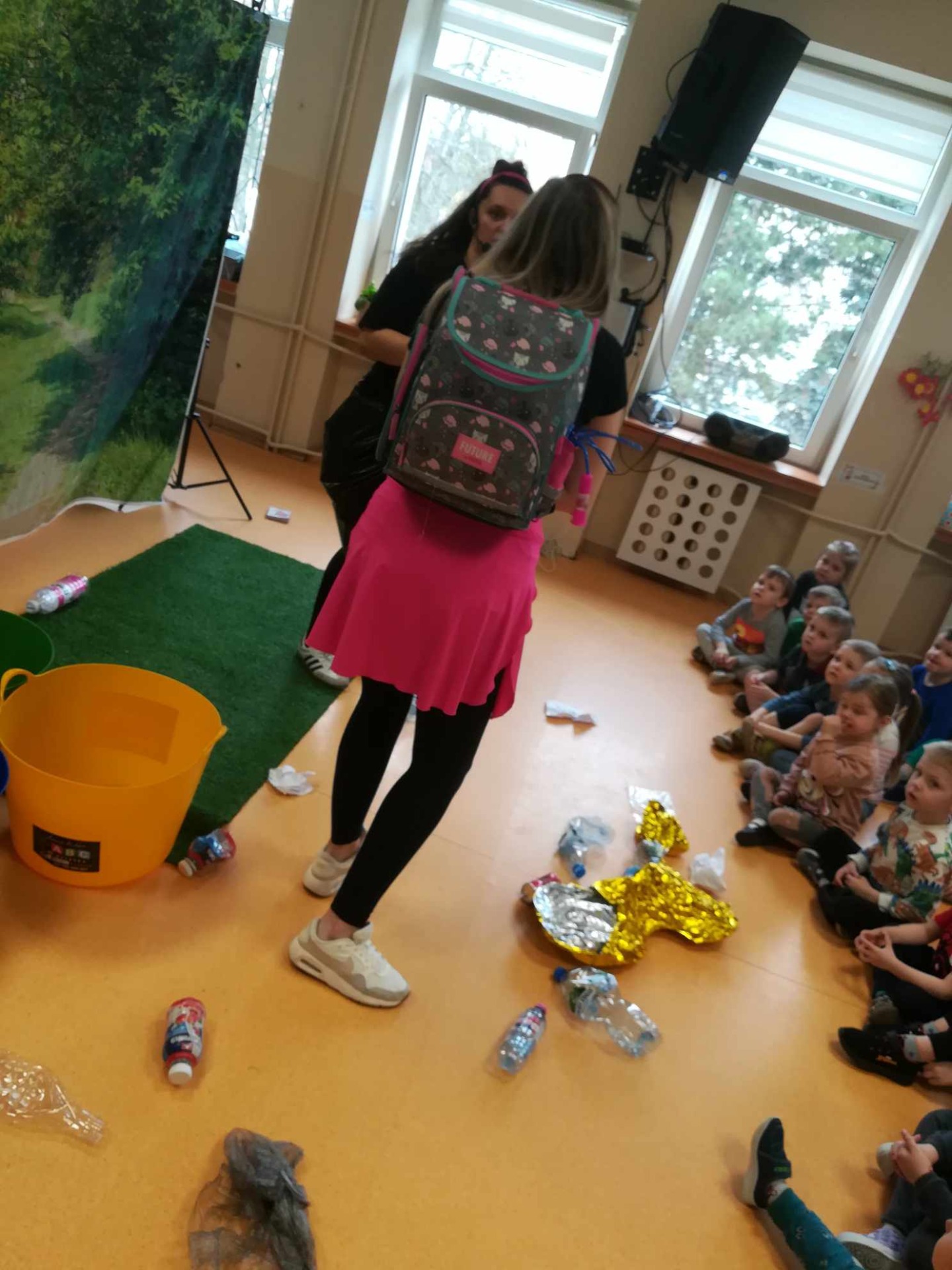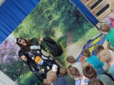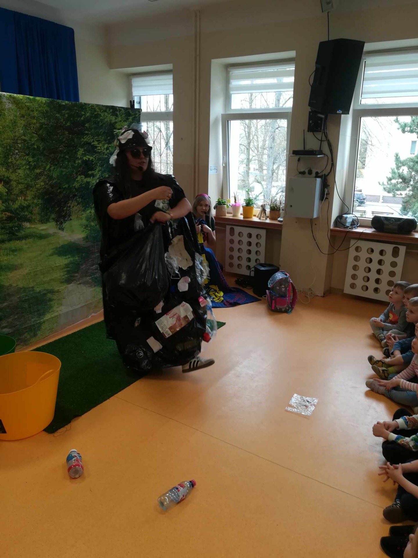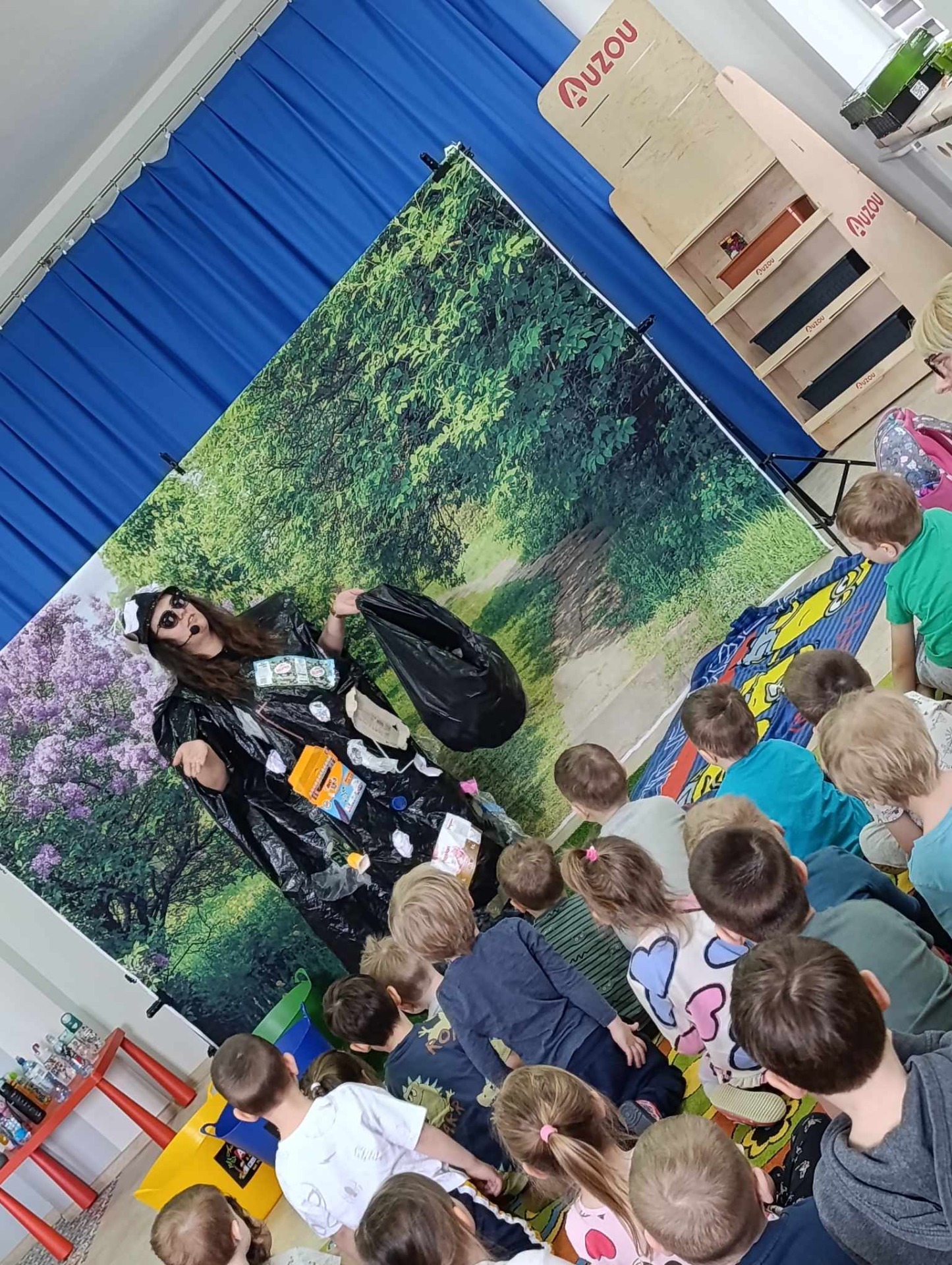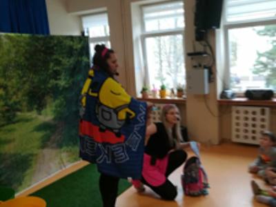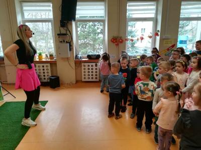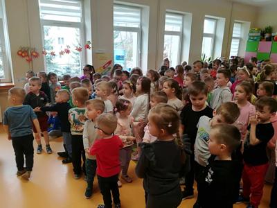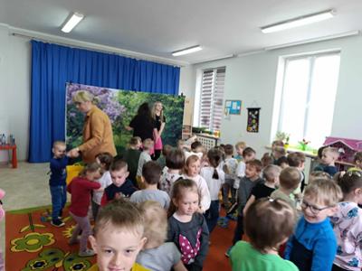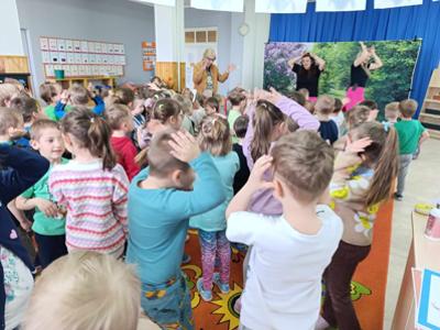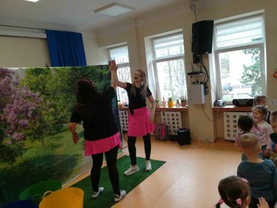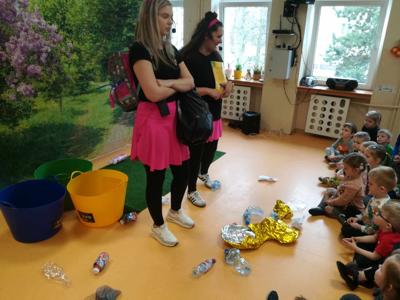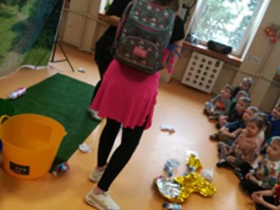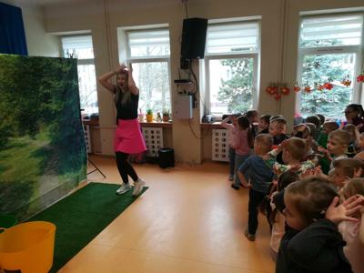Dziś wszystkie przedszkolaki zebrały się w jednej sali, by obejrzeć zapowiedziane wcześniej przedstawienie „Król Śmieci” wystawiane przez animatorki ABC z Warki. Był to spektakl angażujący wszystkie dzieci, dzięki wspólnym tańcom, zabawom, czy przeróżnym zagadkom.