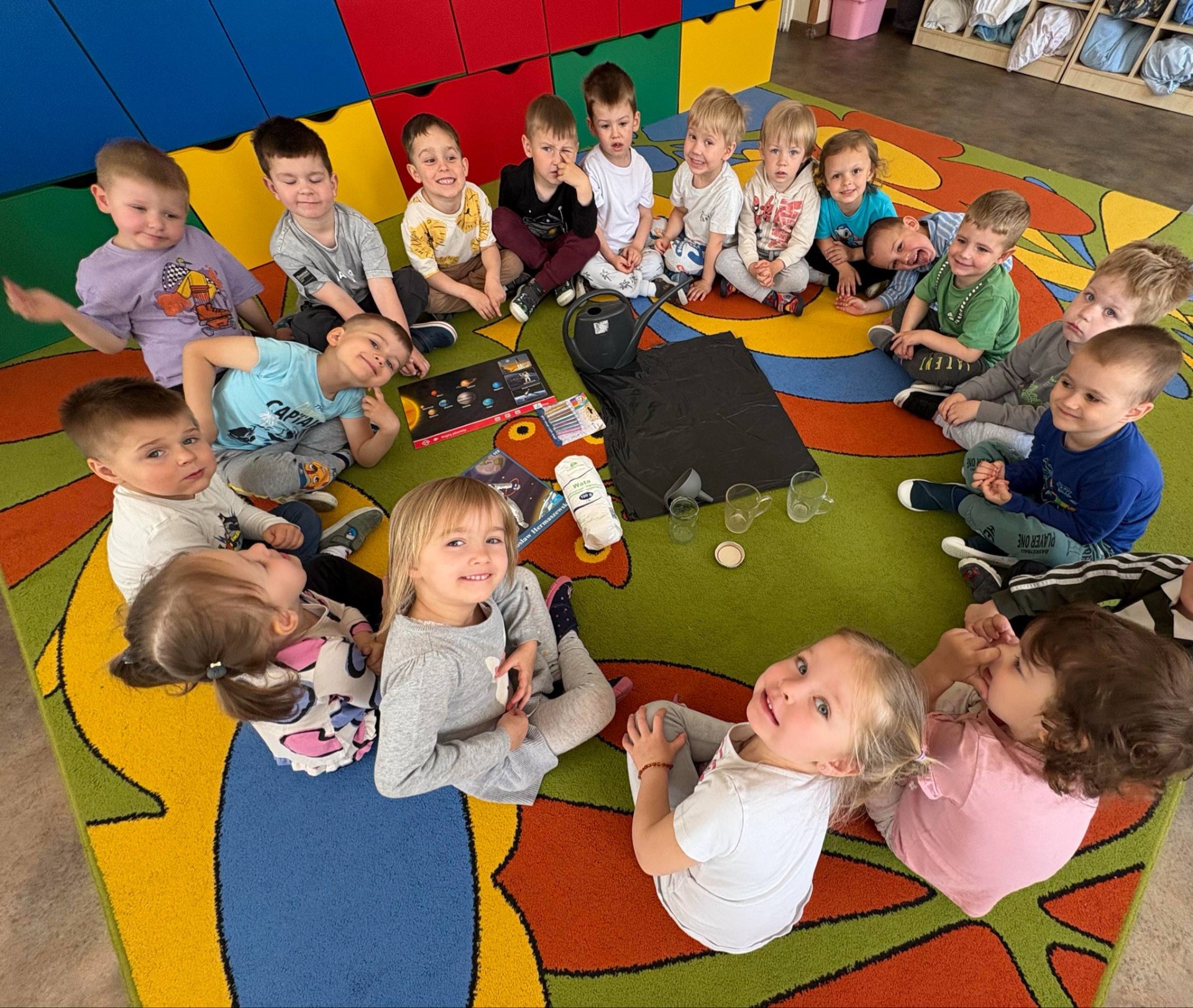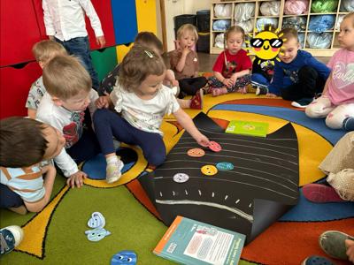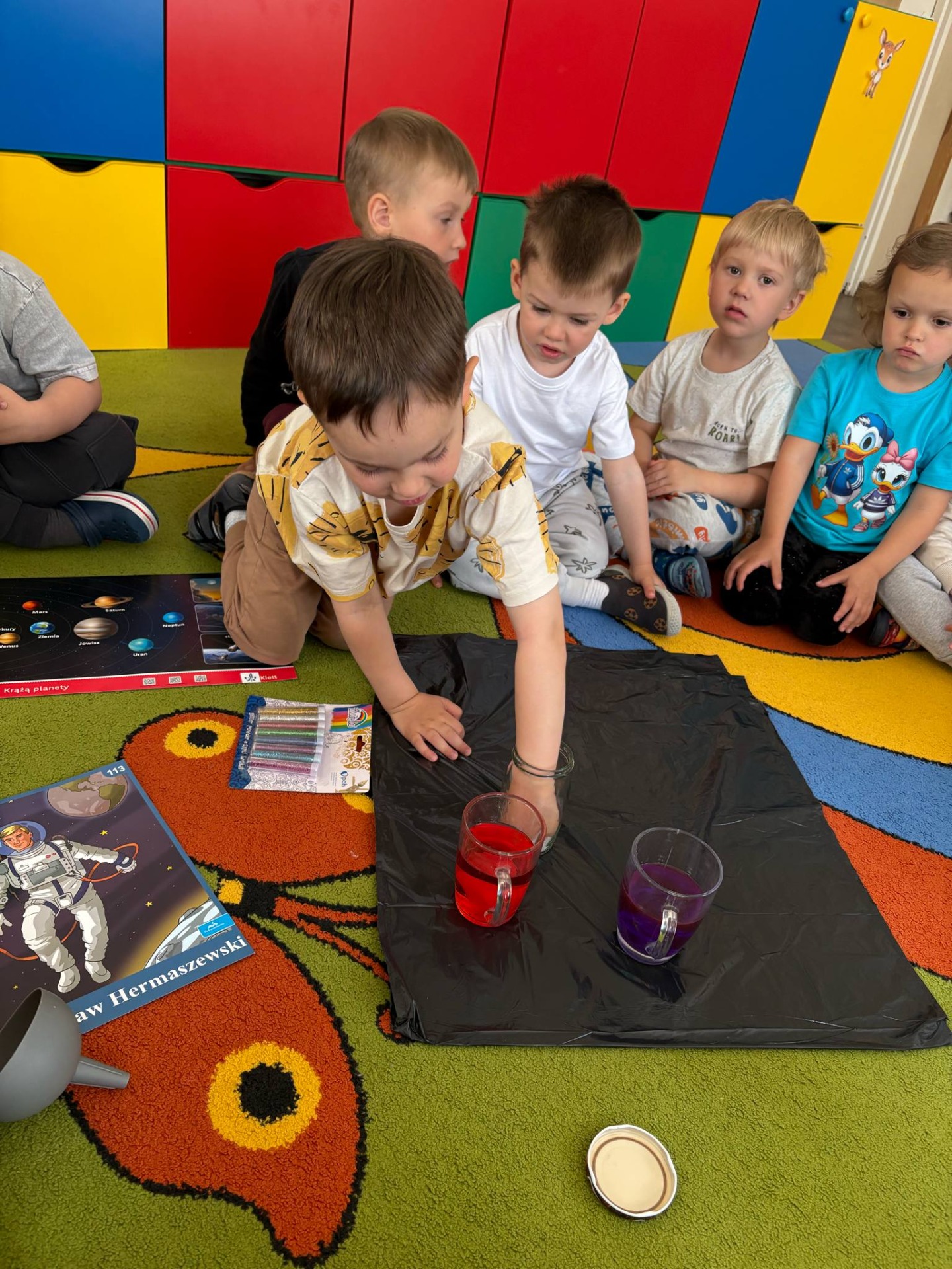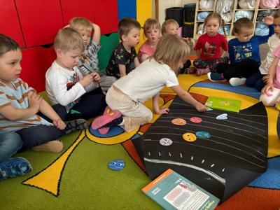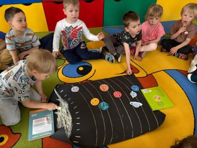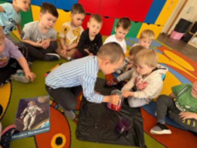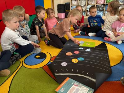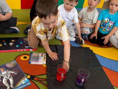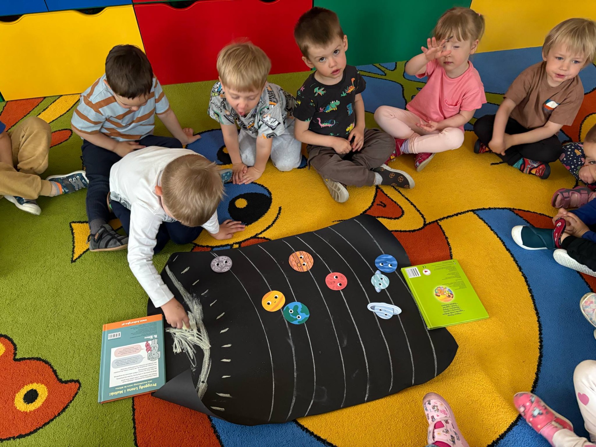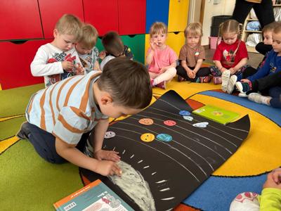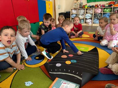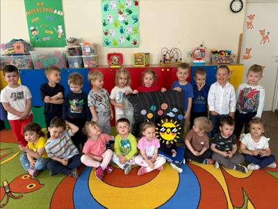 W tym tygodniu grupa „Sarenki” wyruszy艂a w dalek膮 podró偶 aby zwiedzi膰 kosmos. Zaj臋cia mia艂y na celu zach臋cenie do poznawania i odkrywania tajemnic Wszech艣wiata. Przedszkolaki dowiedzia艂y si臋 czym jest kosmos, jak wygl膮da i gdzie on tak w艂a艣ciwie jest. Dzieci ogl膮da艂y ilustracje i plakaty przedstawiaj膮ce Uk艂ad S艂oneczny. Pozna艂y równie偶 ciekawostki o planetach, bra艂y udzia艂 w zabawach ruchowych. Wielk膮 rado艣膰 sprawi艂o dzieciom s艂uchanie piosenki: „W uk艂adzie s艂onecznym". Ca艂a grupa zrobi艂a pi臋kny plakat Uk艂adu S艂onecznego oraz Kosmos w s艂oiku.