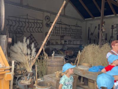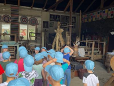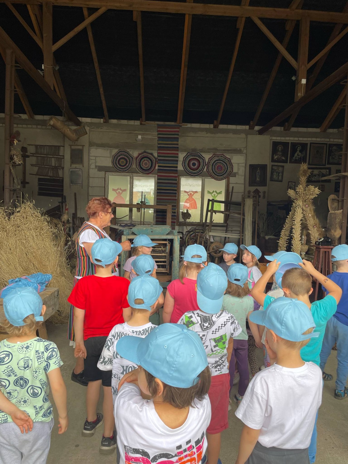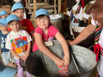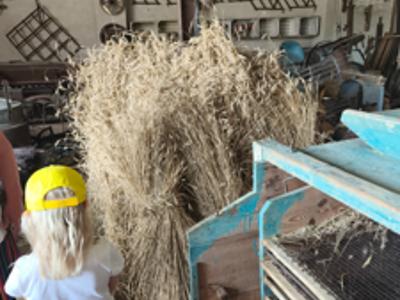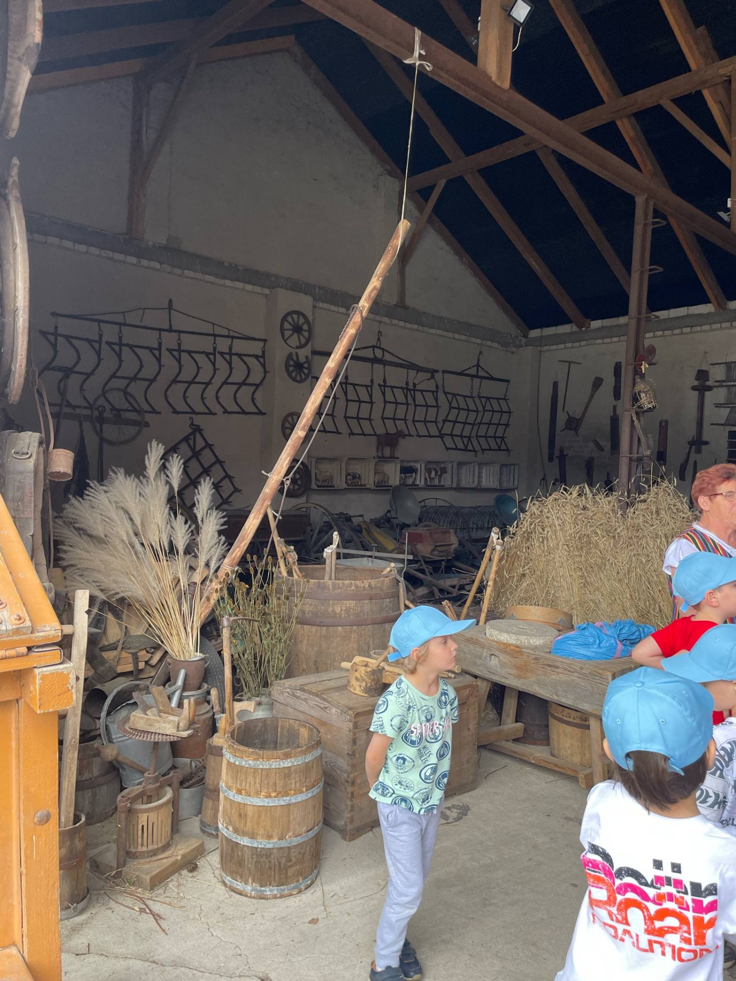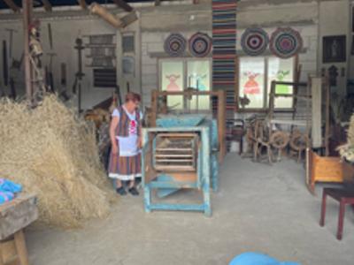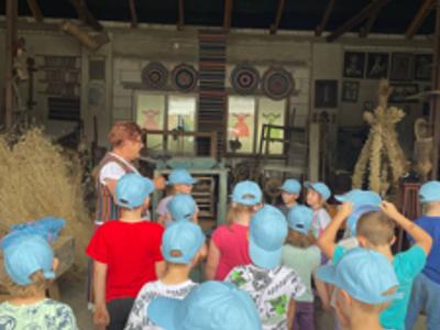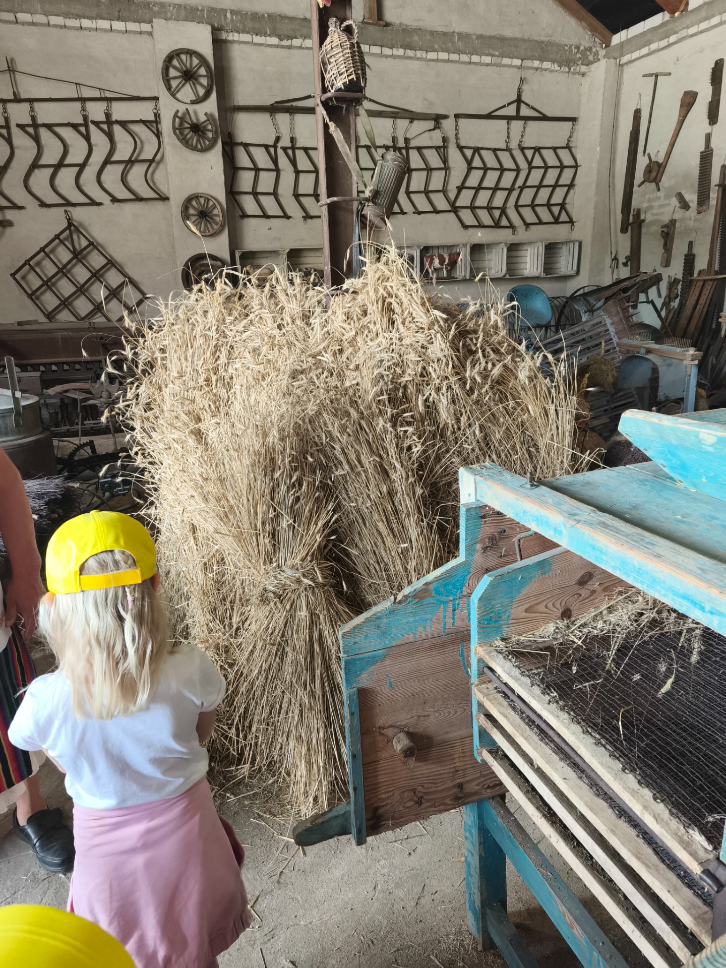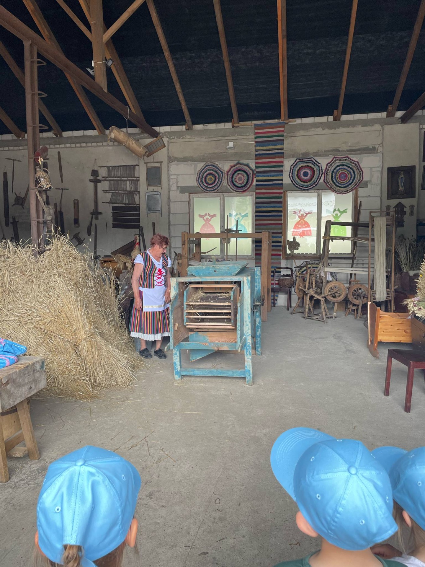 - zobaczyły jak żyli kiedyś rolnicy i mieszkańcy wsi, zwiedzając stodołę z maszynami i urządzeniami rolniczymi i wyposażeniem dawnej chałupy. Poznały sposoby zastosowania maszyn i upraw zboża ich rodzaje,, młocka cepami, warsztat tkacki - przędzenie na kołowrotku i tkanie na krosnach, pranie na tarze.