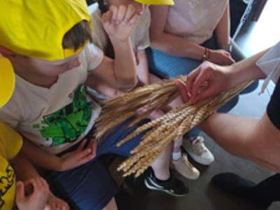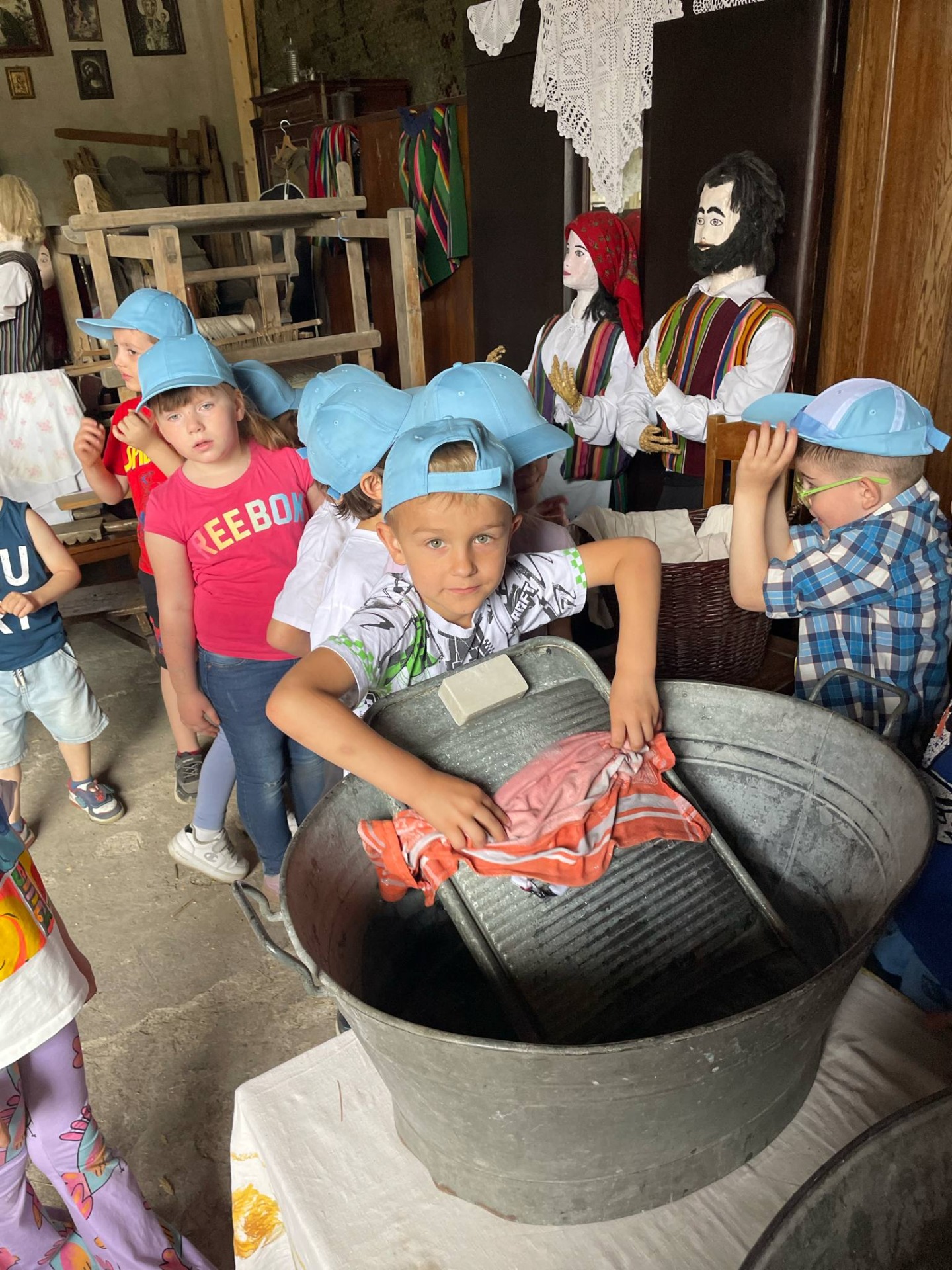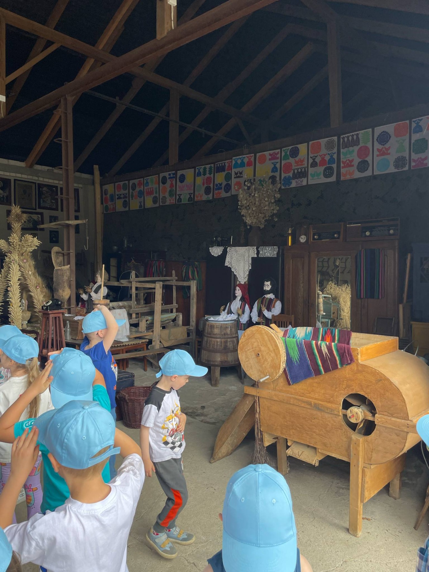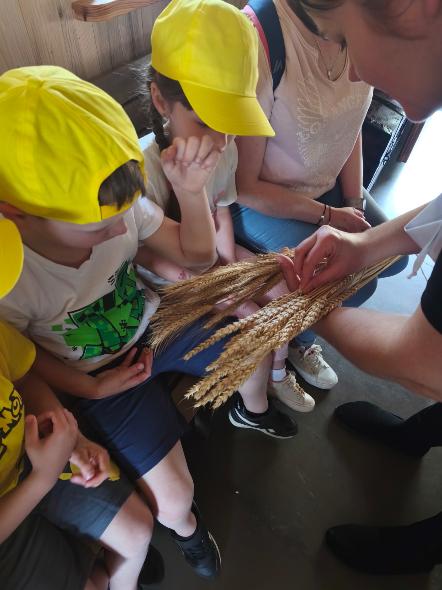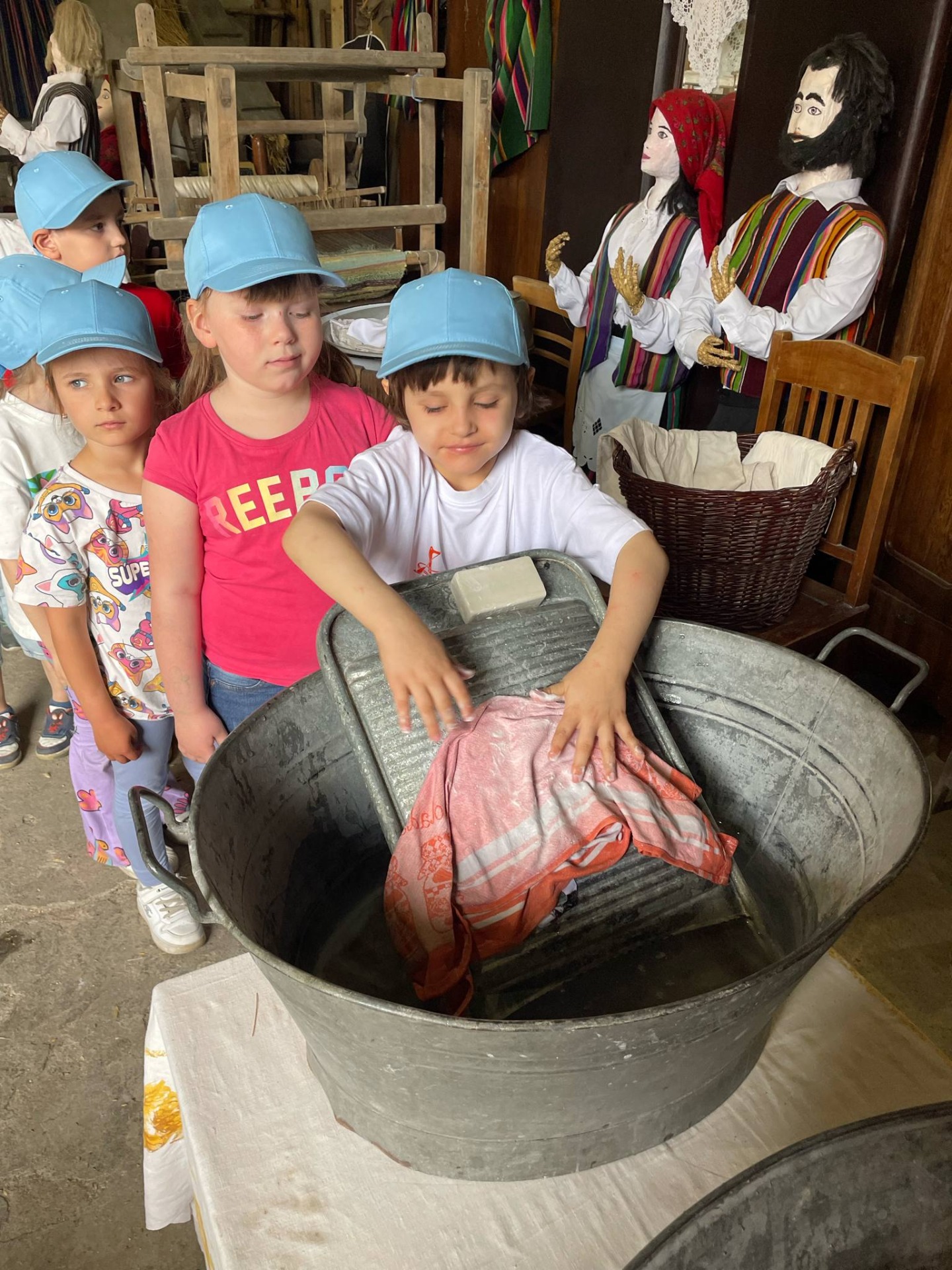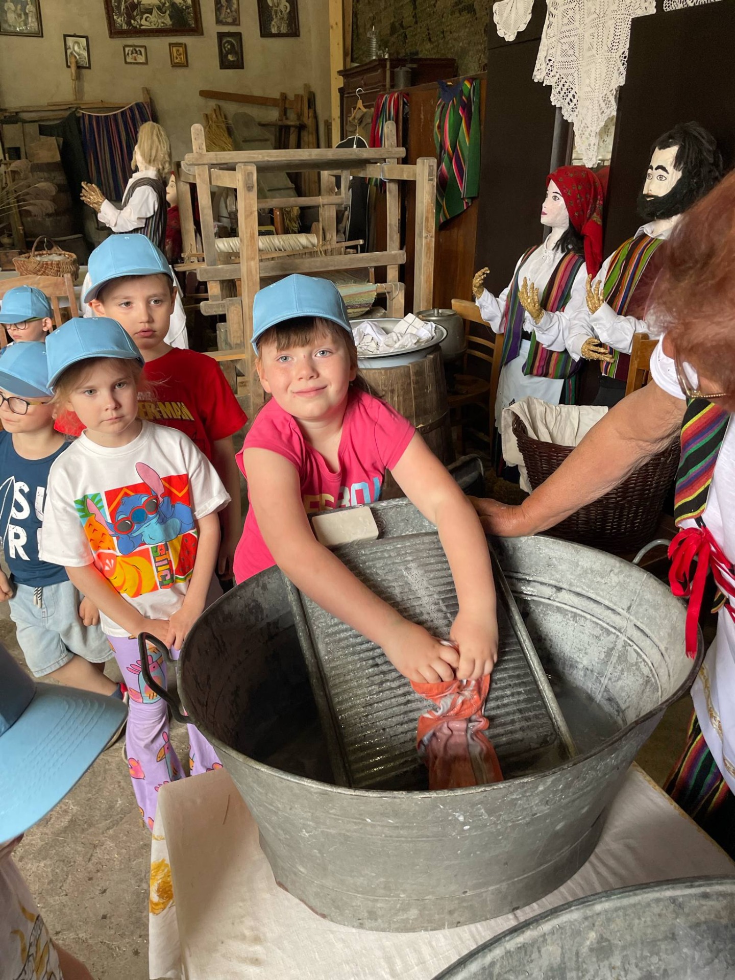 - zobaczyły jak żyli kiedyś rolnicy i mieszkańcy wsi, zwiedzając stodołę z maszynami i urządzeniami rolniczymi i wyposażeniem dawnej chałupy. Poznały sposoby zastosowania maszyn i upraw zboża ich rodzaje,, młocka cepami, warsztat tkacki - przędzenie na kołowrotku i tkanie na krosnach, pranie na tarze.