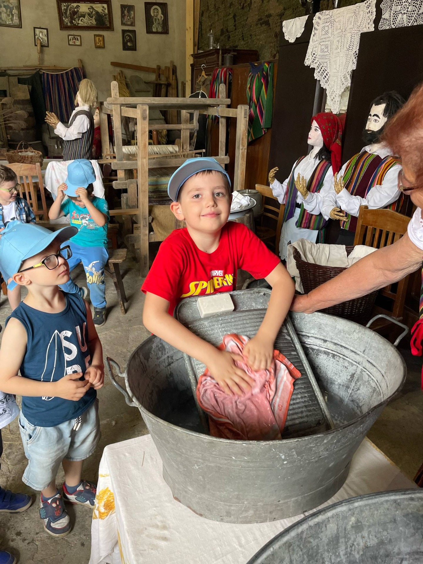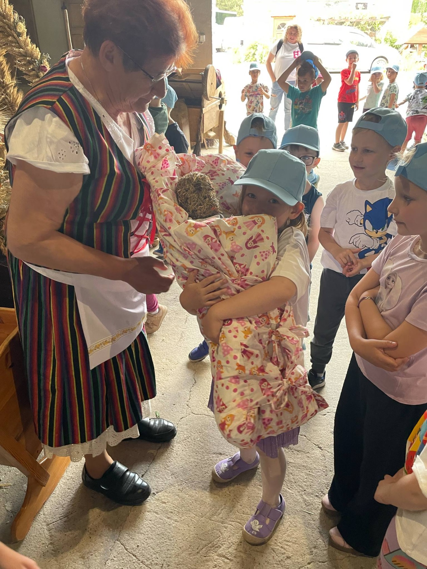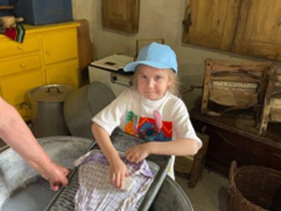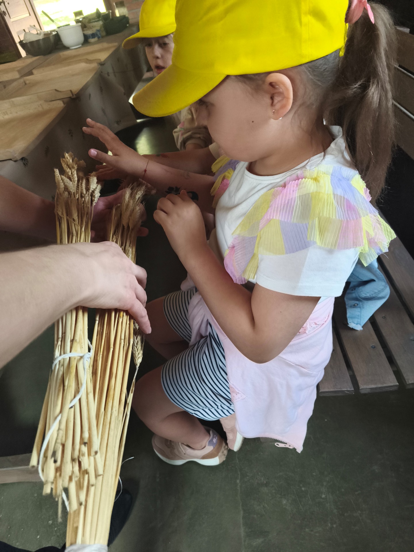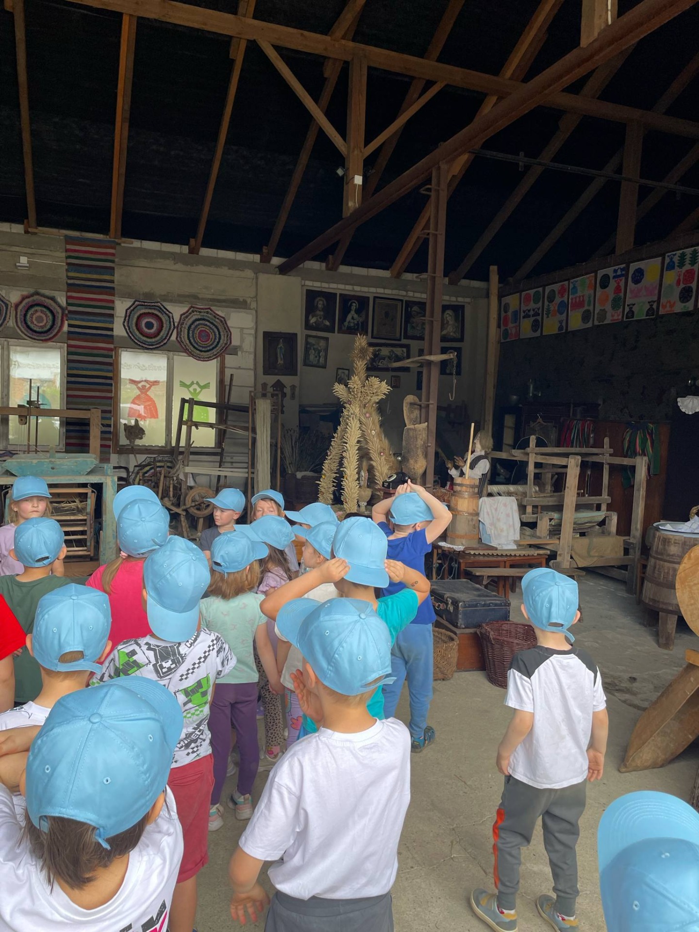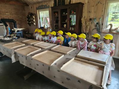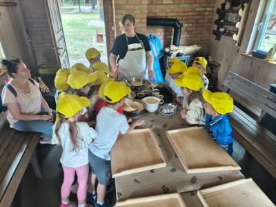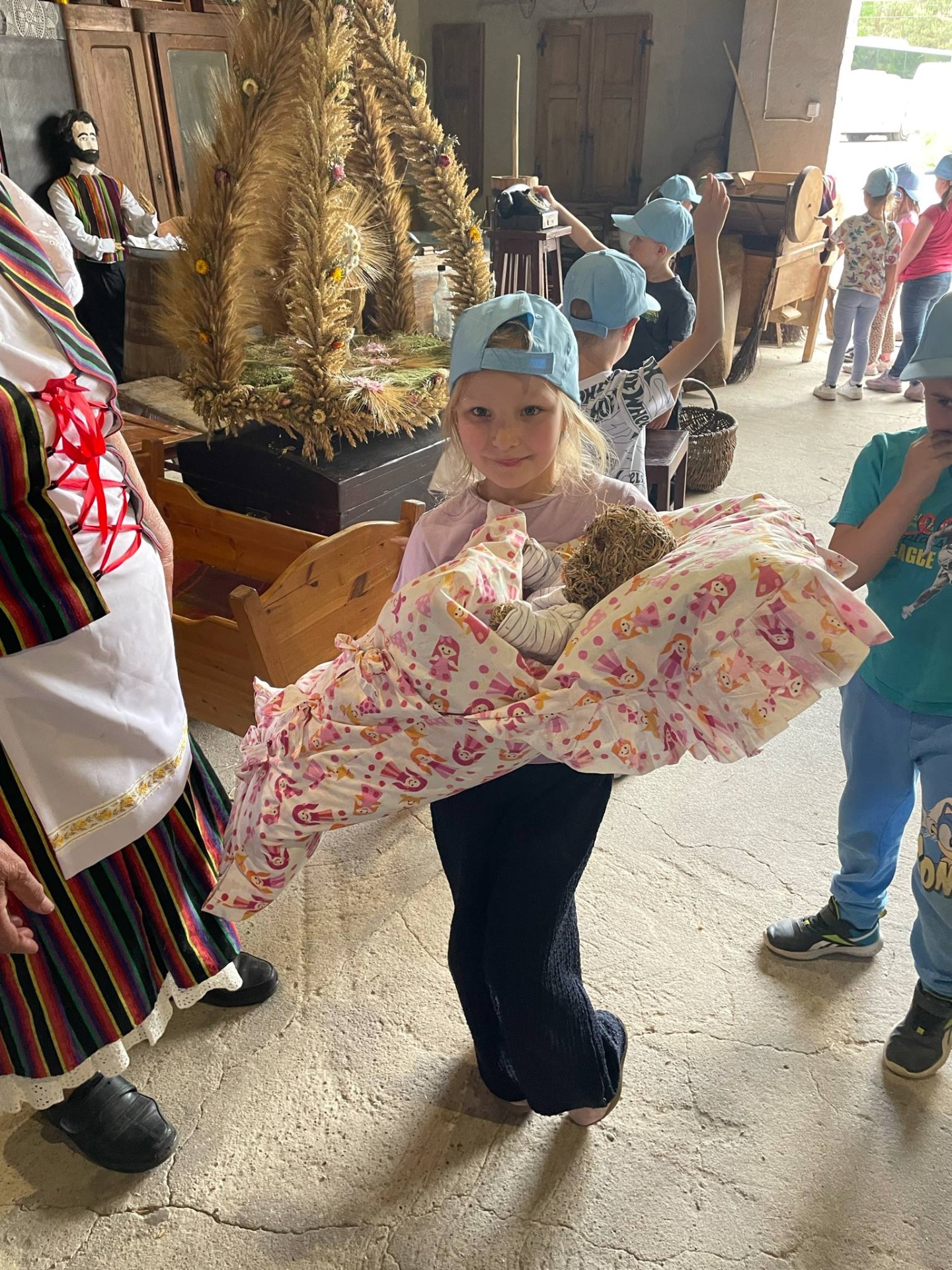 - zobaczyły jak żyli kiedyś rolnicy i mieszkańcy wsi, zwiedzając stodołę z maszynami i urządzeniami rolniczymi i wyposażeniem dawnej chałupy. Poznały sposoby zastosowania maszyn i upraw zboża ich rodzaje,, młocka cepami, warsztat tkacki - przędzenie na kołowrotku i tkanie na krosnach, pranie na tarze.