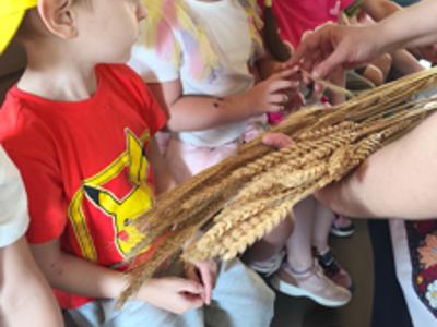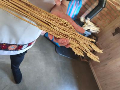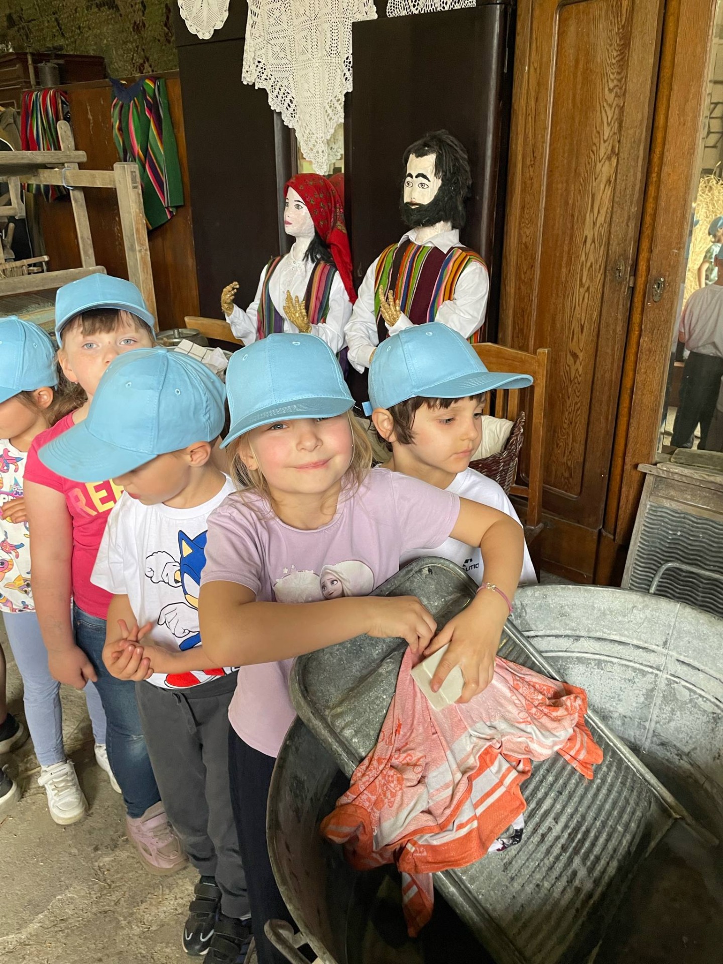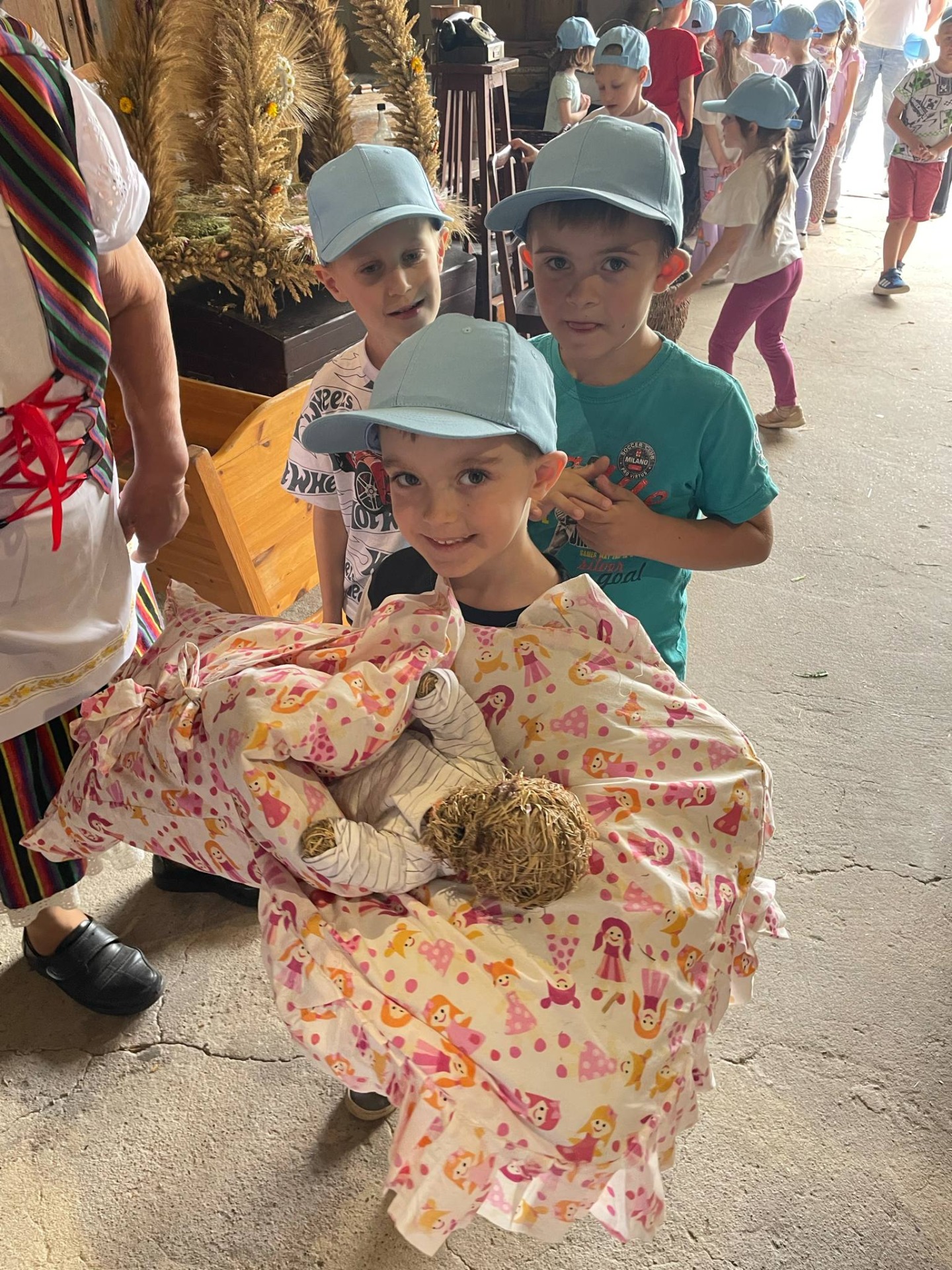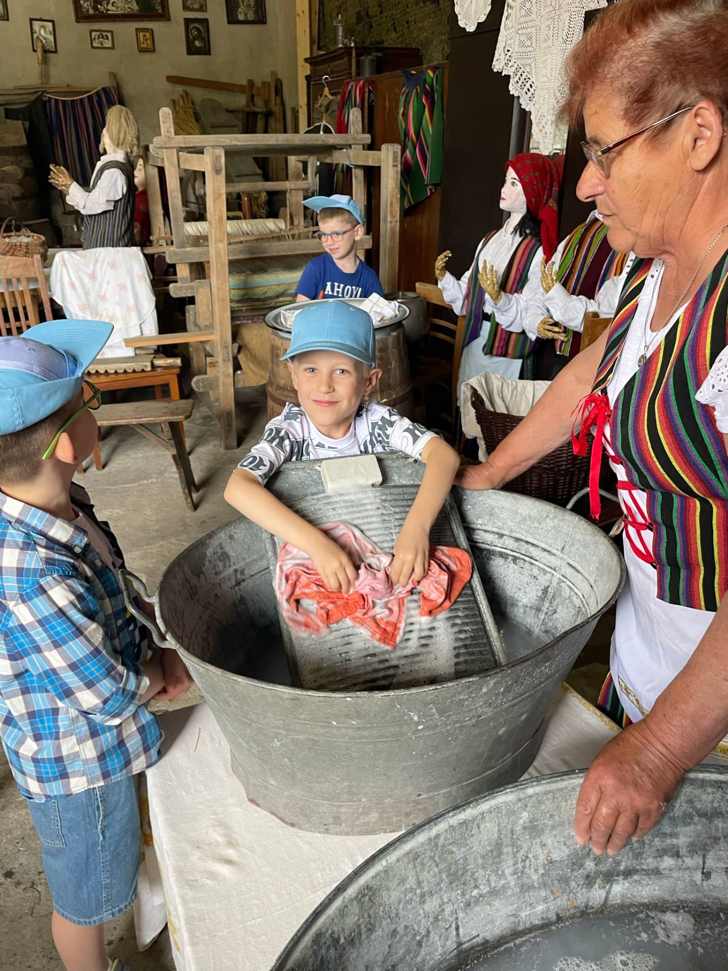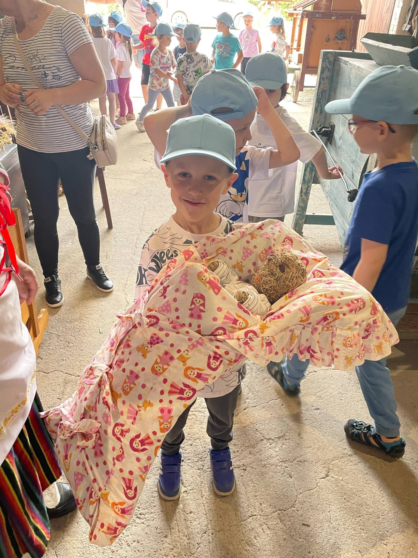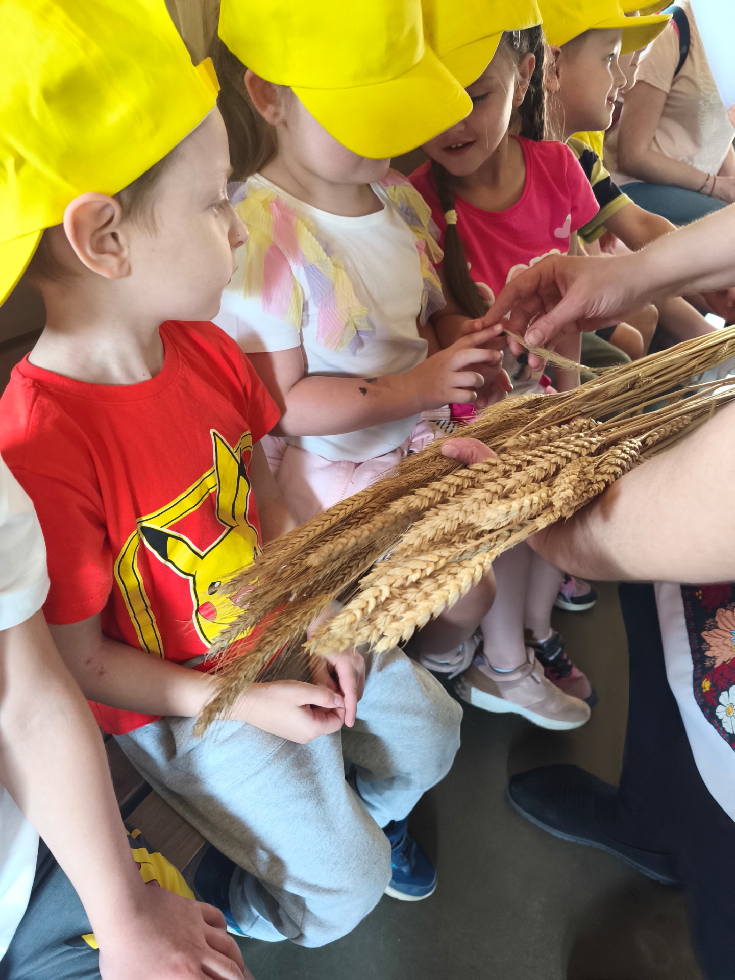 - zobaczyły jak żyli kiedyś rolnicy i mieszkańcy wsi, zwiedzając stodołę z maszynami i urządzeniami rolniczymi i wyposażeniem dawnej chałupy. Poznały sposoby zastosowania maszyn i upraw zboża ich rodzaje,, młocka cepami, warsztat tkacki - przędzenie na kołowrotku i tkanie na krosnach, pranie na tarze.