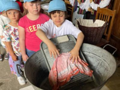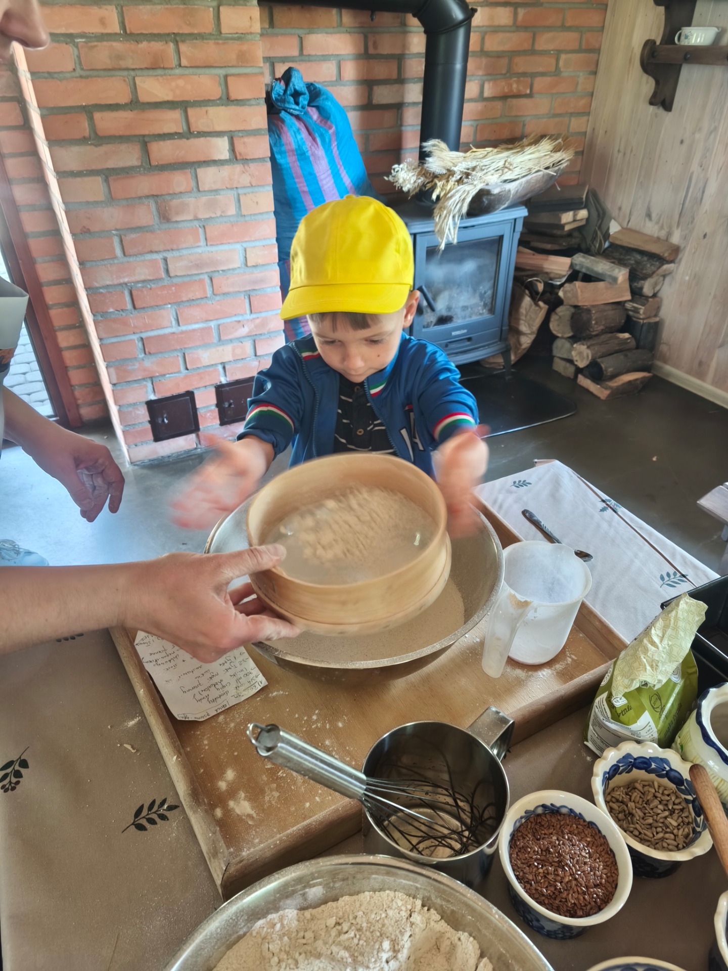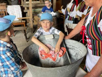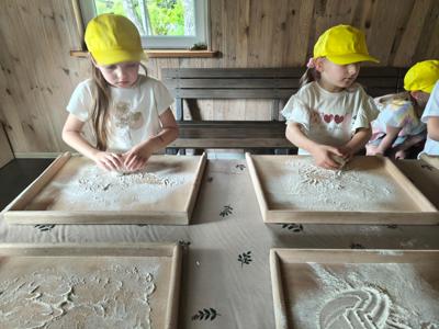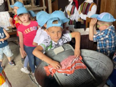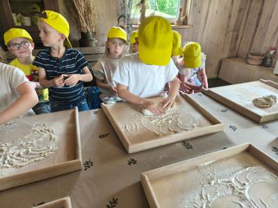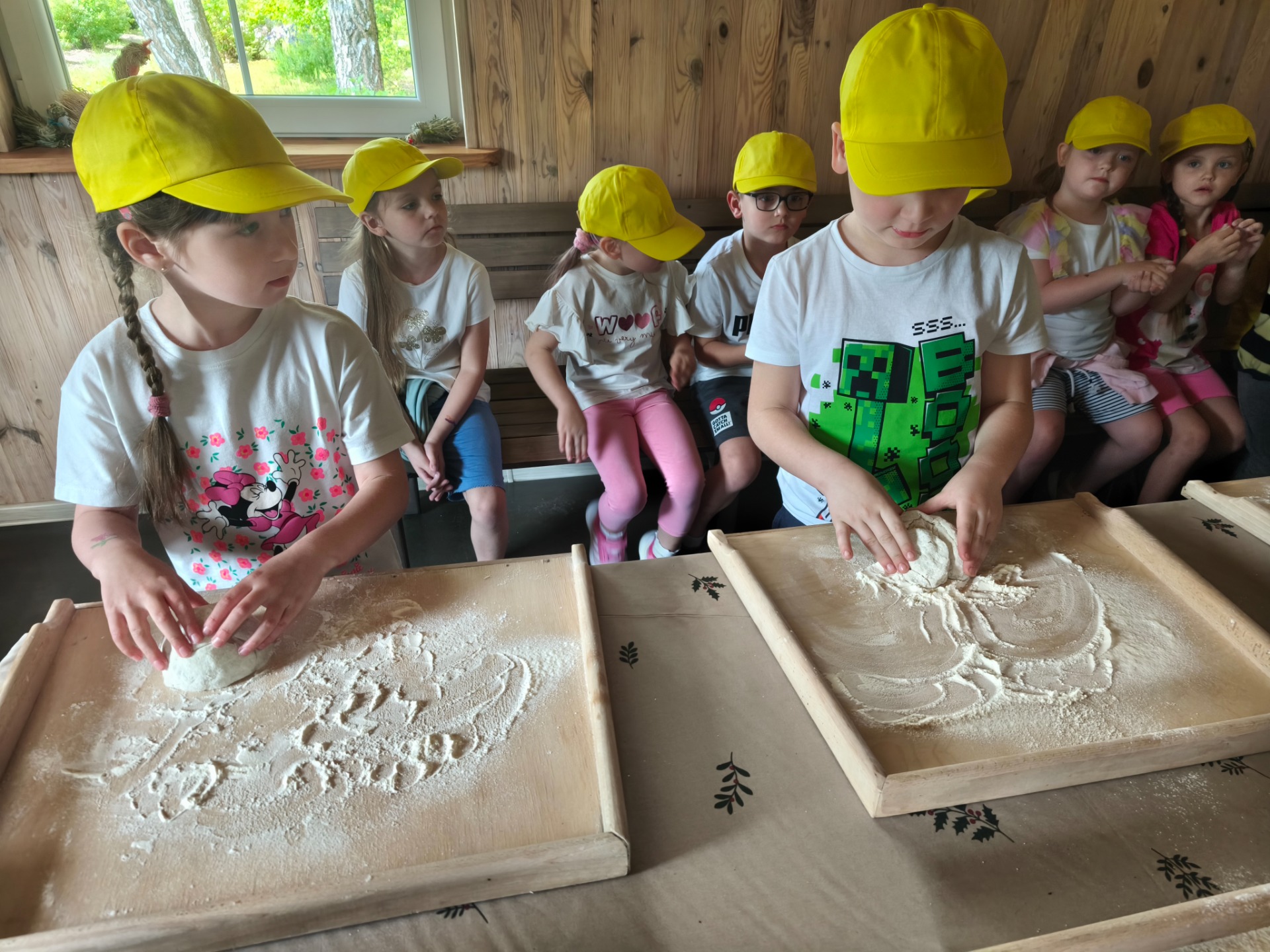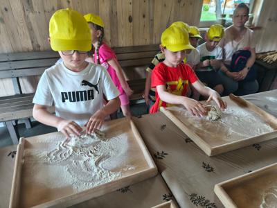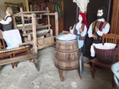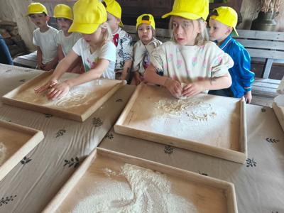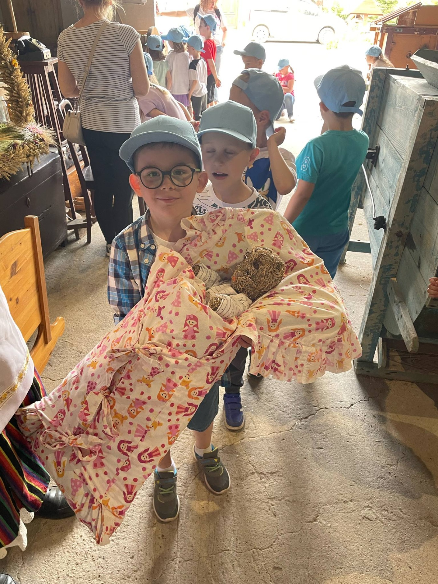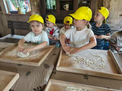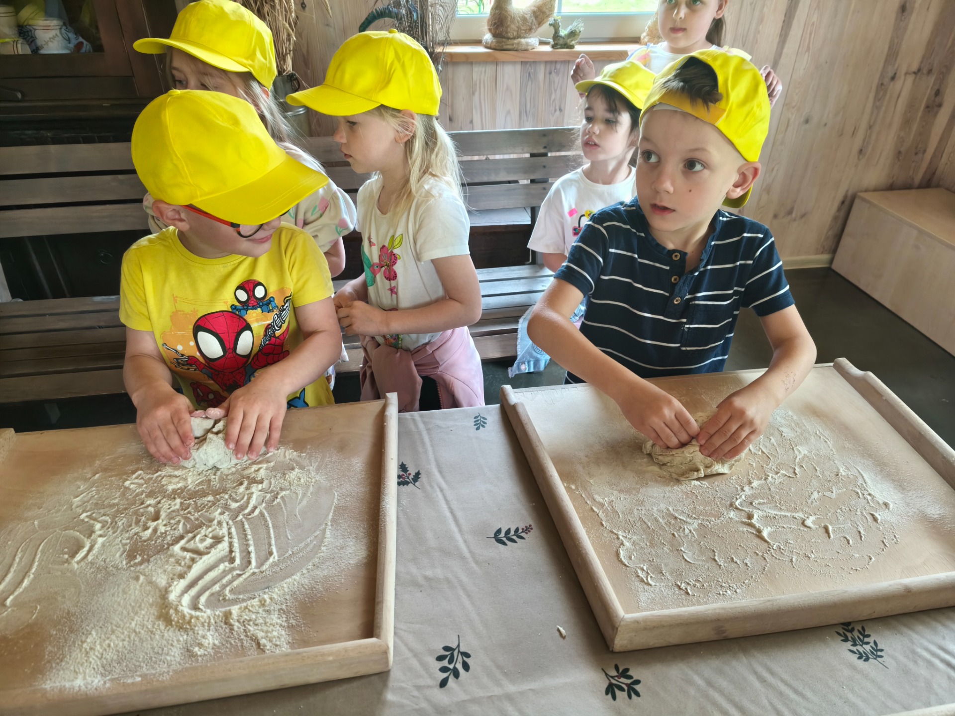 - zobaczyły jak żyli kiedyś rolnicy i mieszkańcy wsi, zwiedzając stodołę z maszynami i urządzeniami rolniczymi i wyposażeniem dawnej chałupy. Poznały sposoby zastosowania maszyn i upraw zboża ich rodzaje,, młocka cepami, warsztat tkacki - przędzenie na kołowrotku i tkanie na krosnach, pranie na tarze.