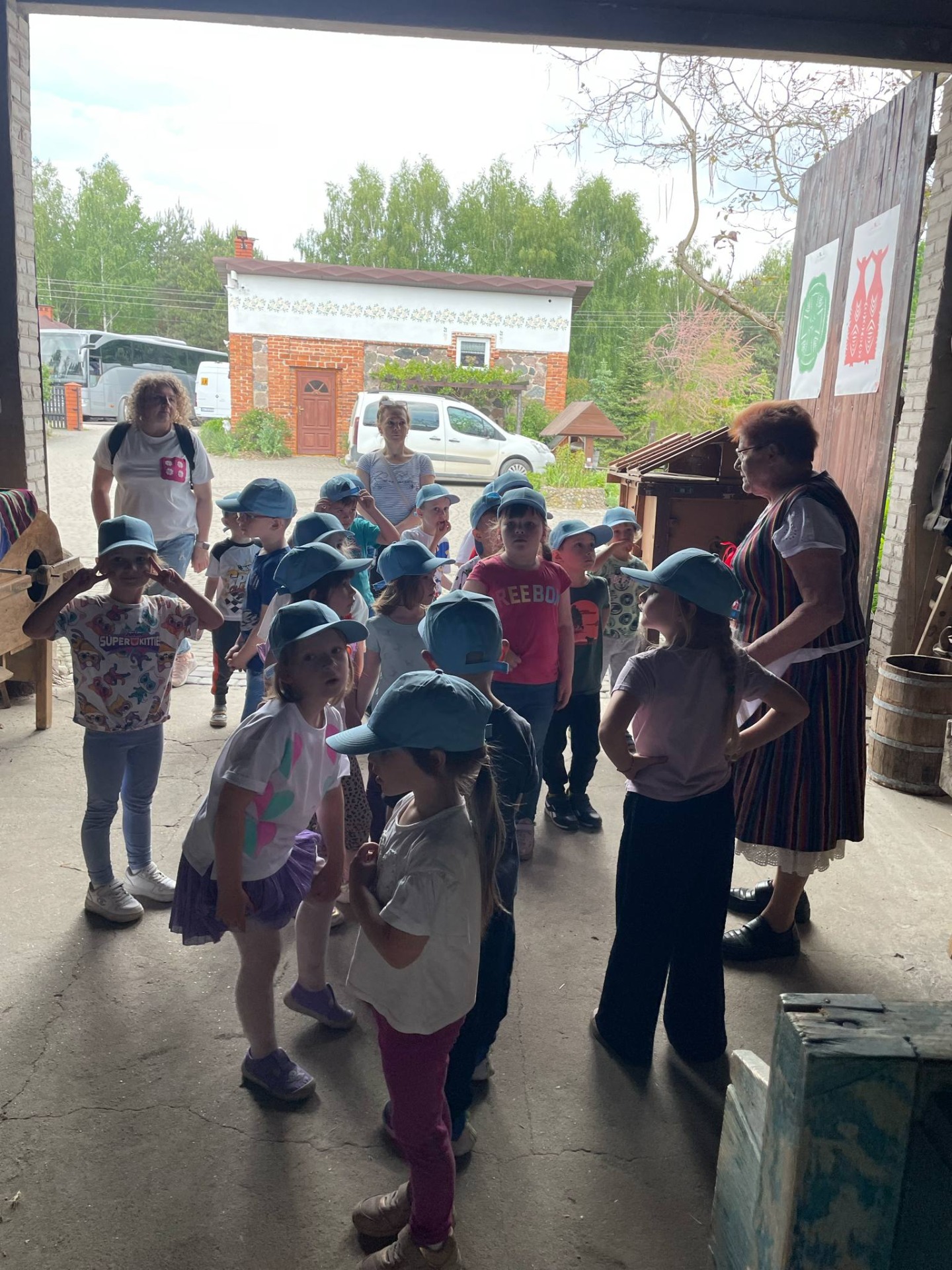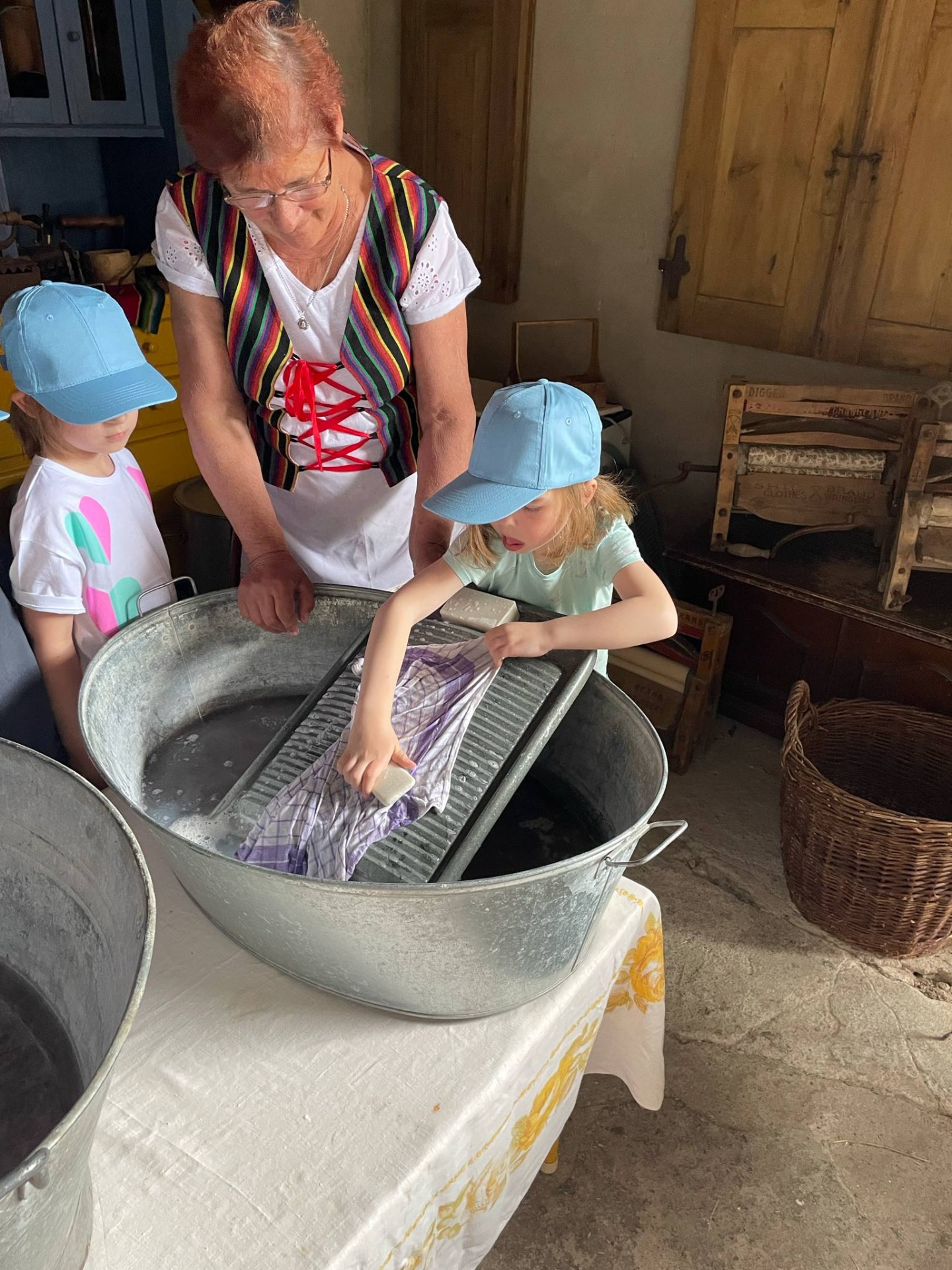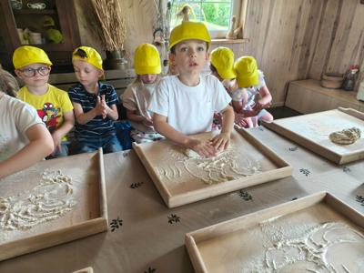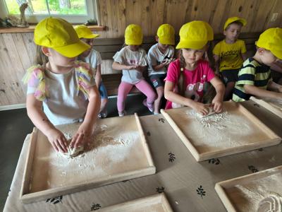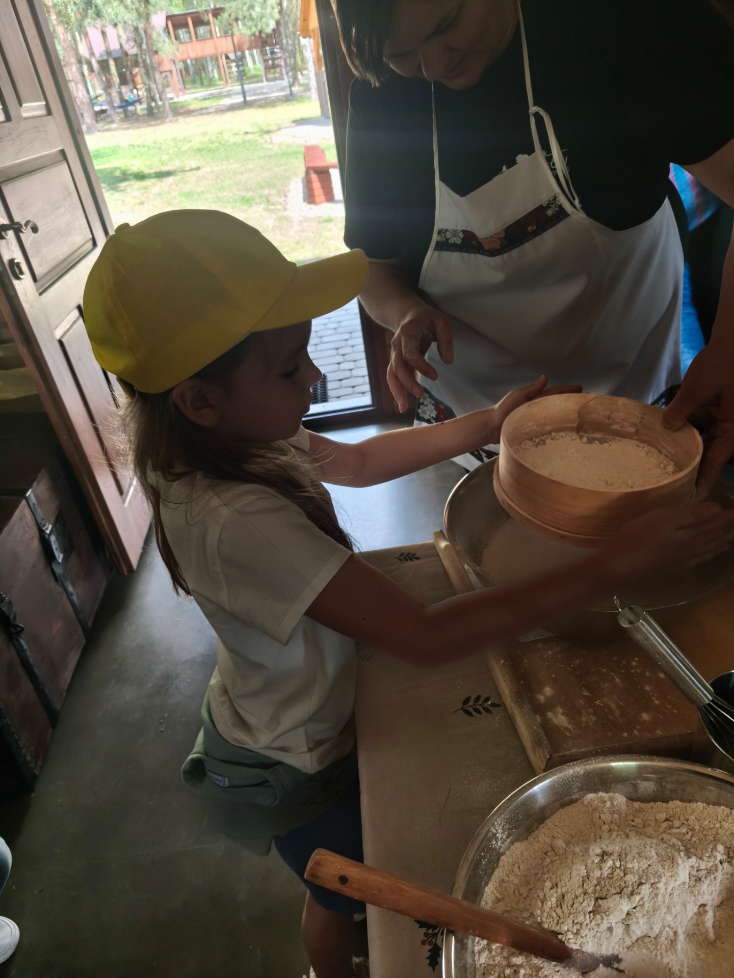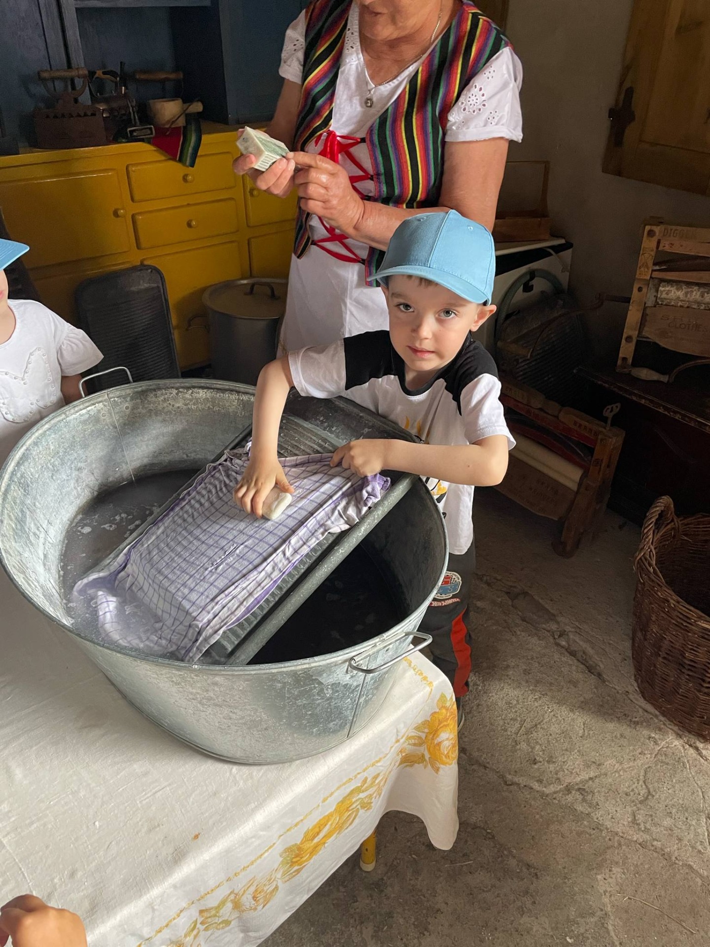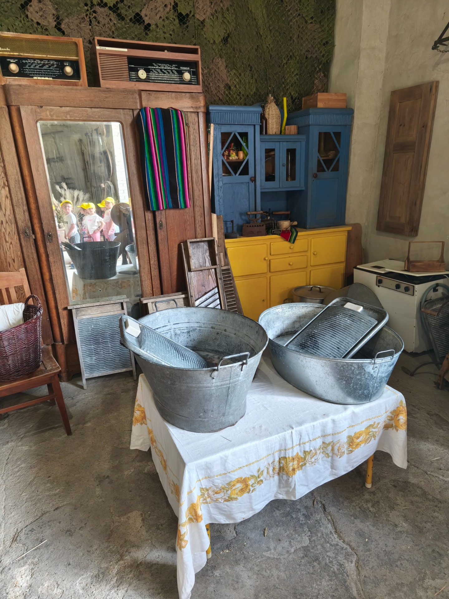 - zobaczyły jak żyli kiedyś rolnicy i mieszkańcy wsi, zwiedzając stodołę z maszynami i urządzeniami rolniczymi i wyposażeniem dawnej chałupy. Poznały sposoby zastosowania maszyn i upraw zboża ich rodzaje,, młocka cepami, warsztat tkacki - przędzenie na kołowrotku i tkanie na krosnach, pranie na tarze.