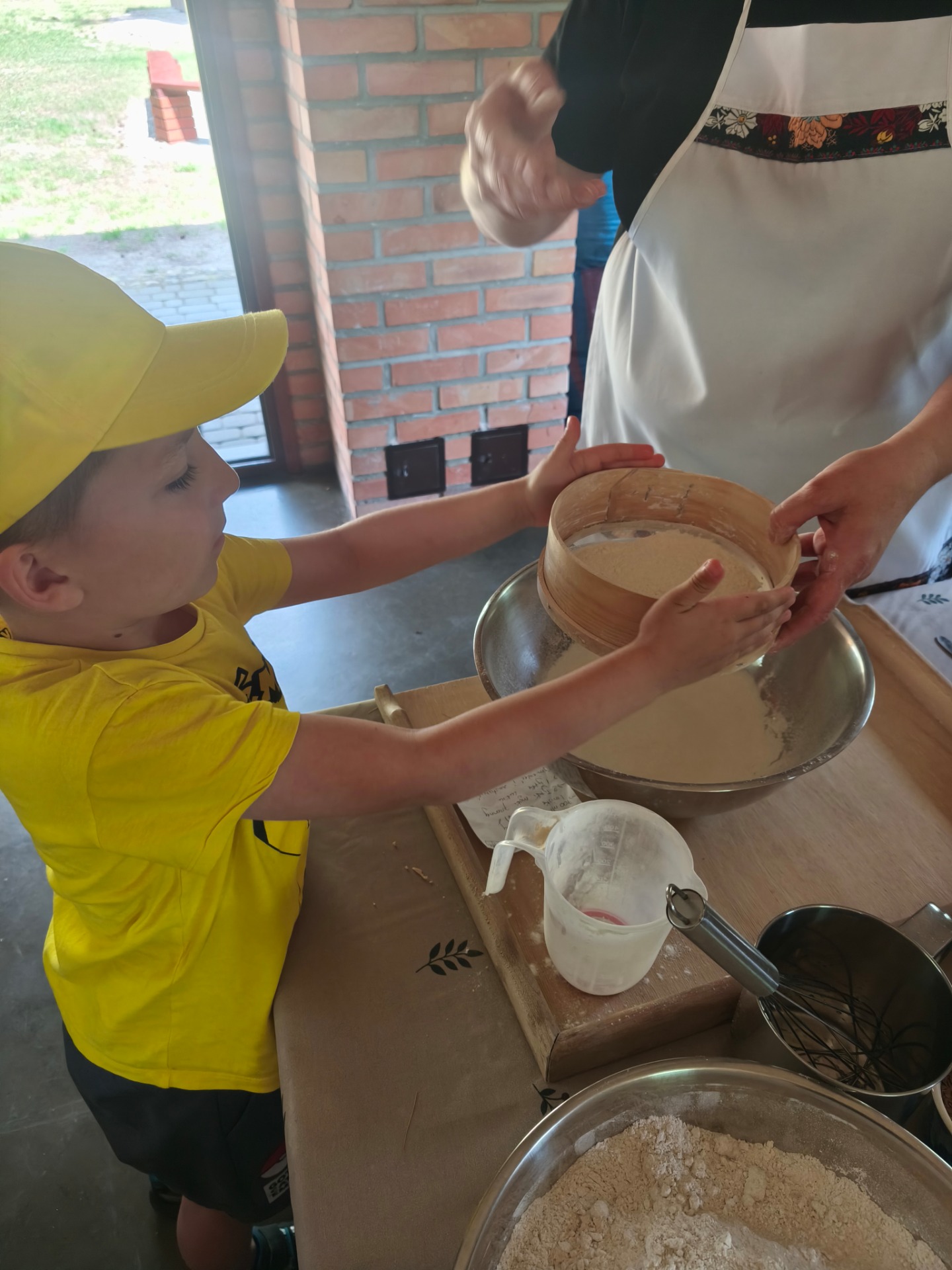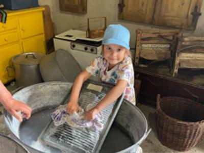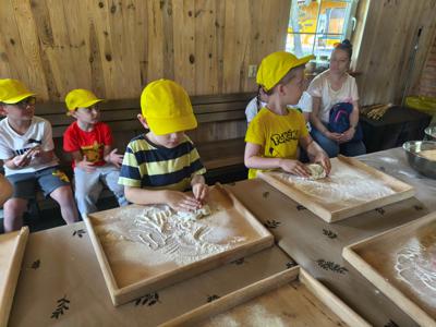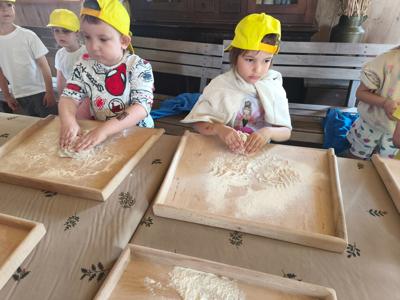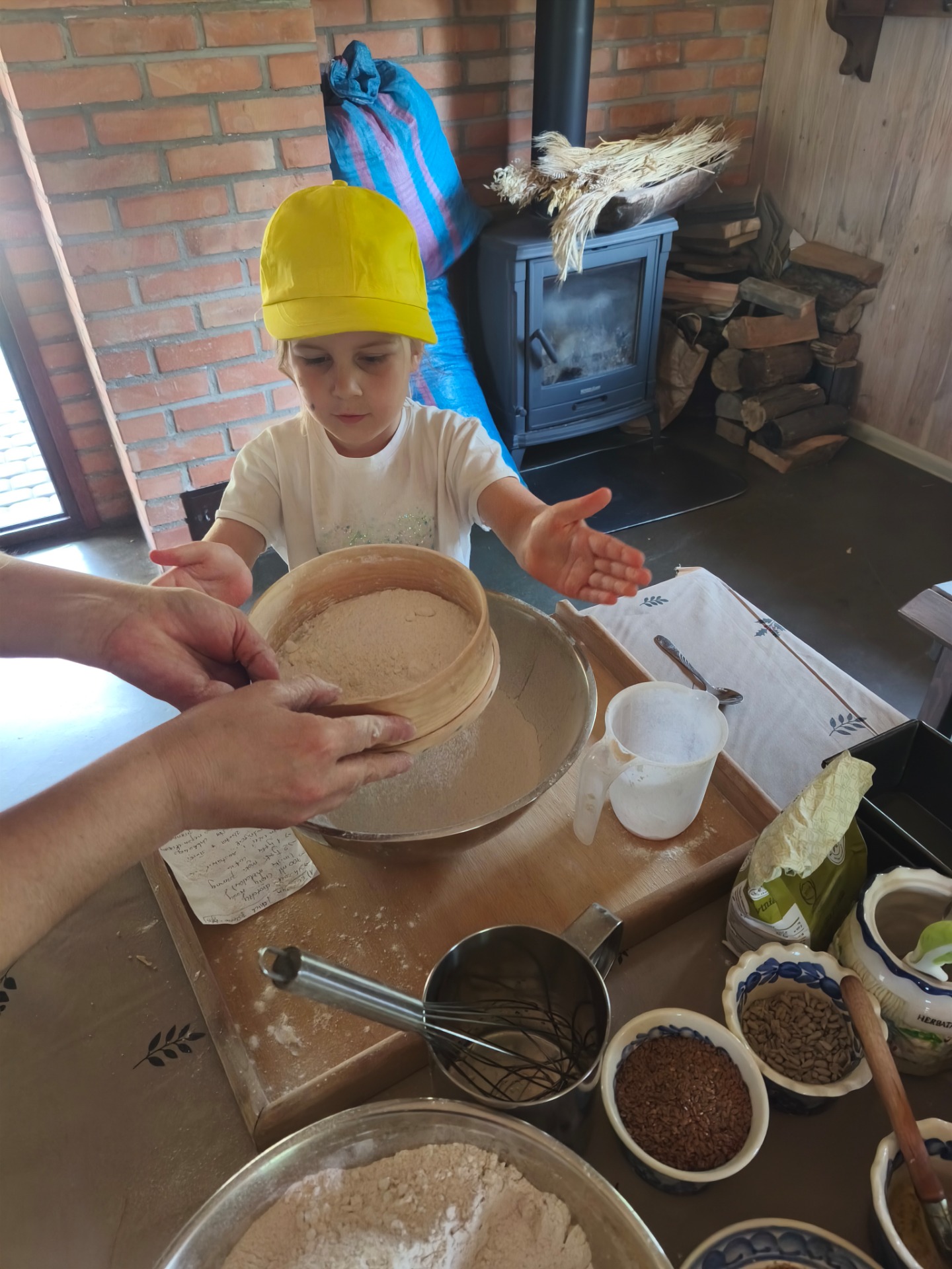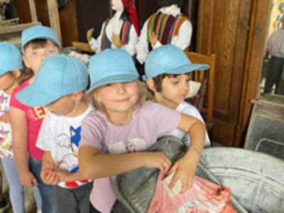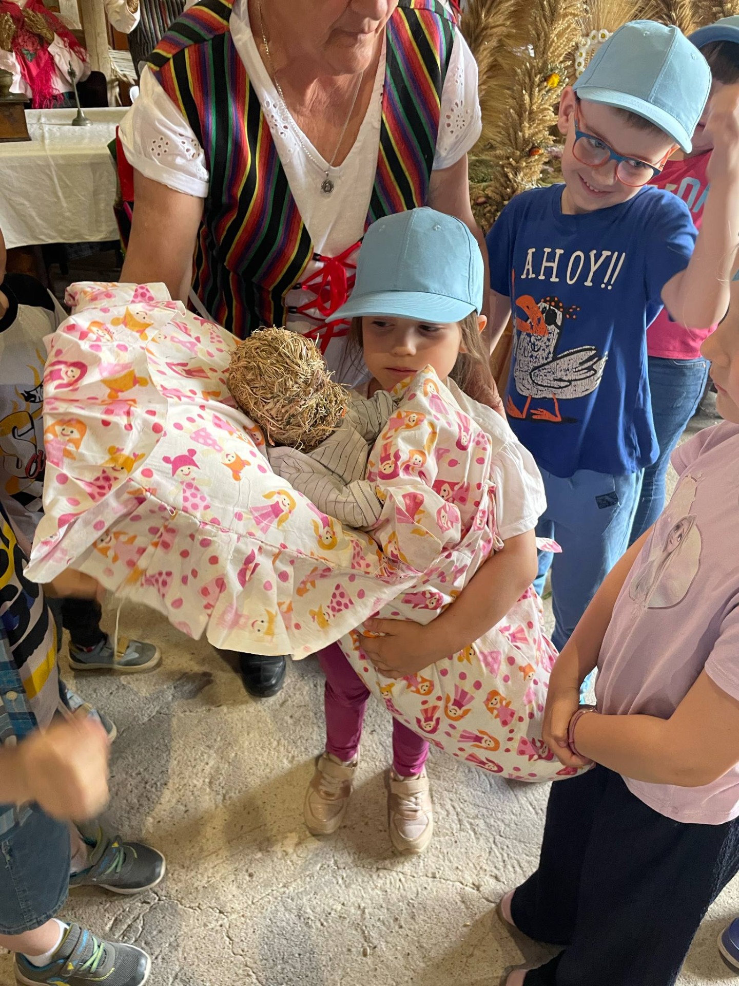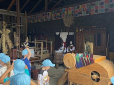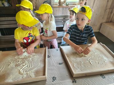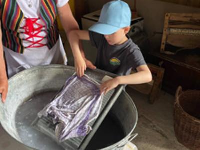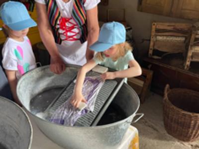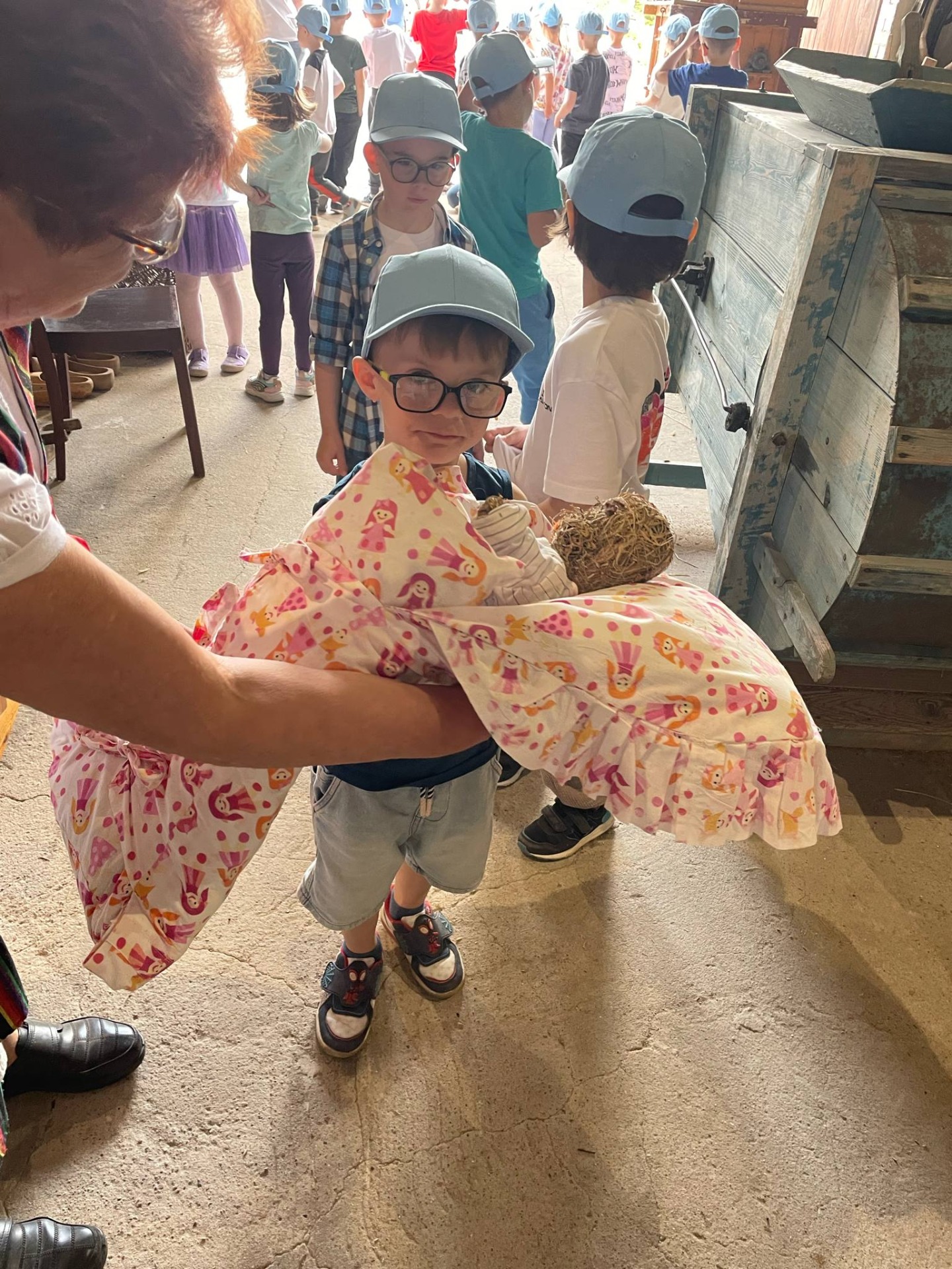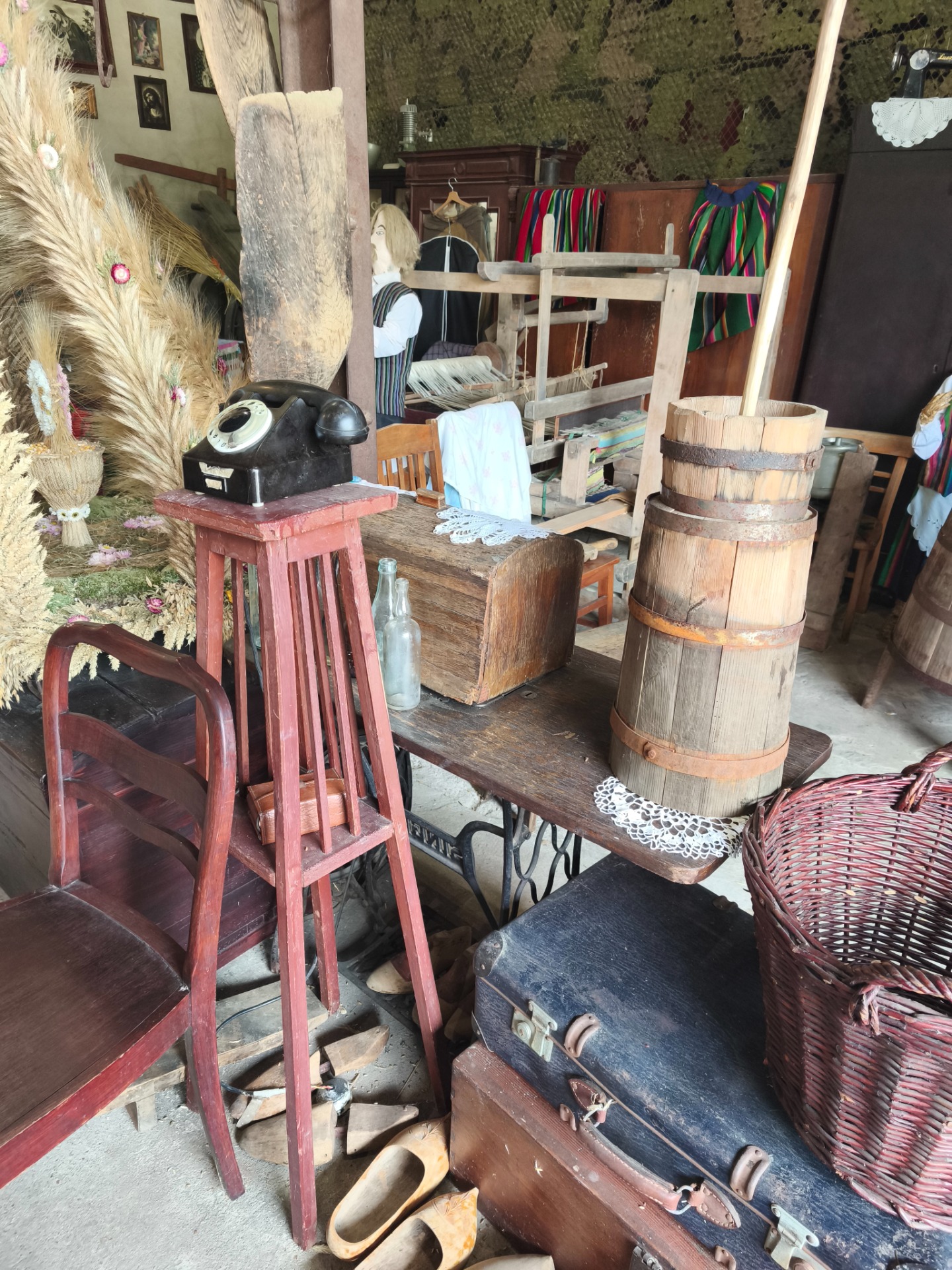 - zobaczyły jak żyli kiedyś rolnicy i mieszkańcy wsi, zwiedzając stodołę z maszynami i urządzeniami rolniczymi i wyposażeniem dawnej chałupy. Poznały sposoby zastosowania maszyn i upraw zboża ich rodzaje,, młocka cepami, warsztat tkacki - przędzenie na kołowrotku i tkanie na krosnach, pranie na tarze.