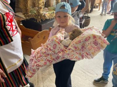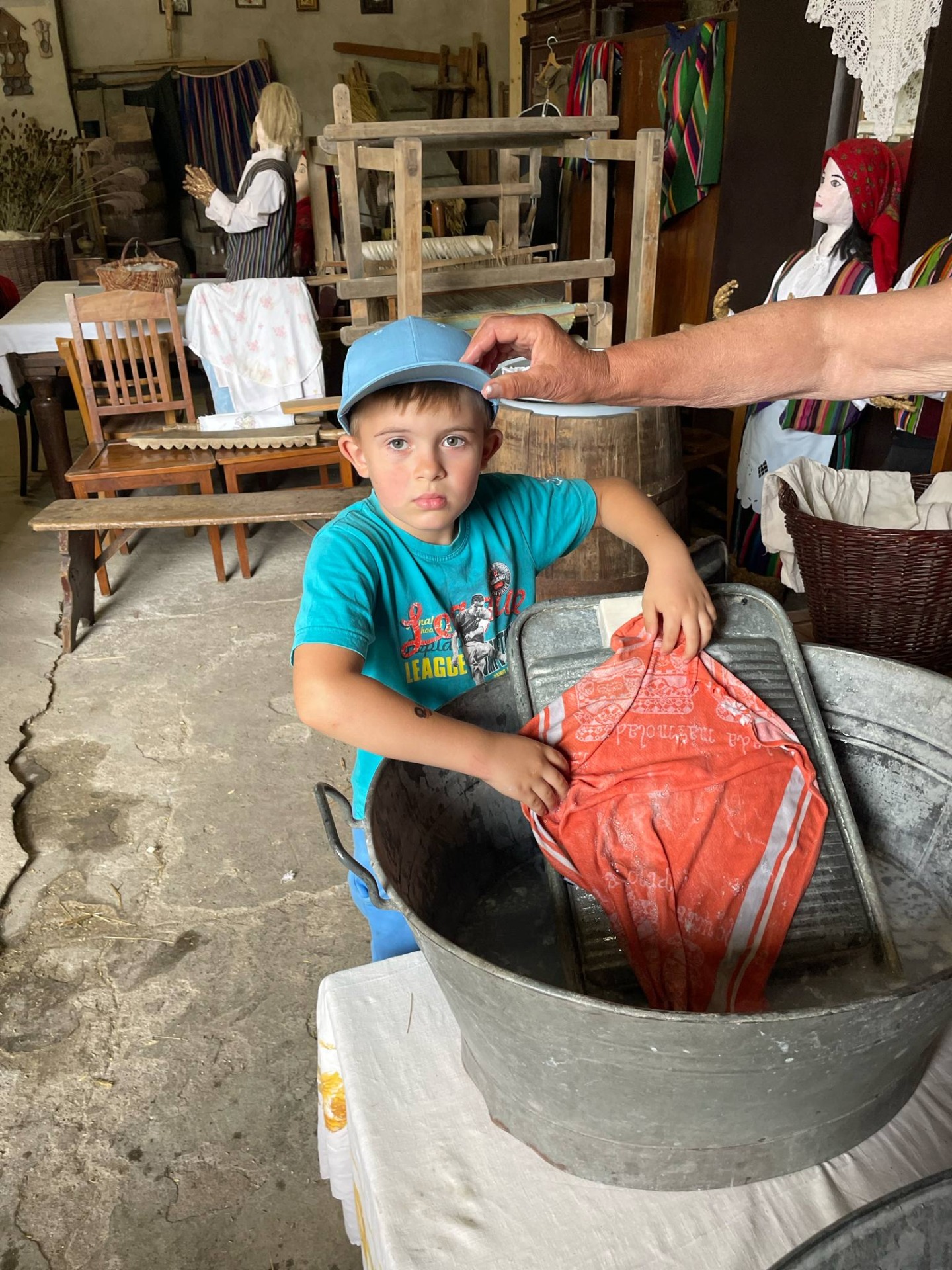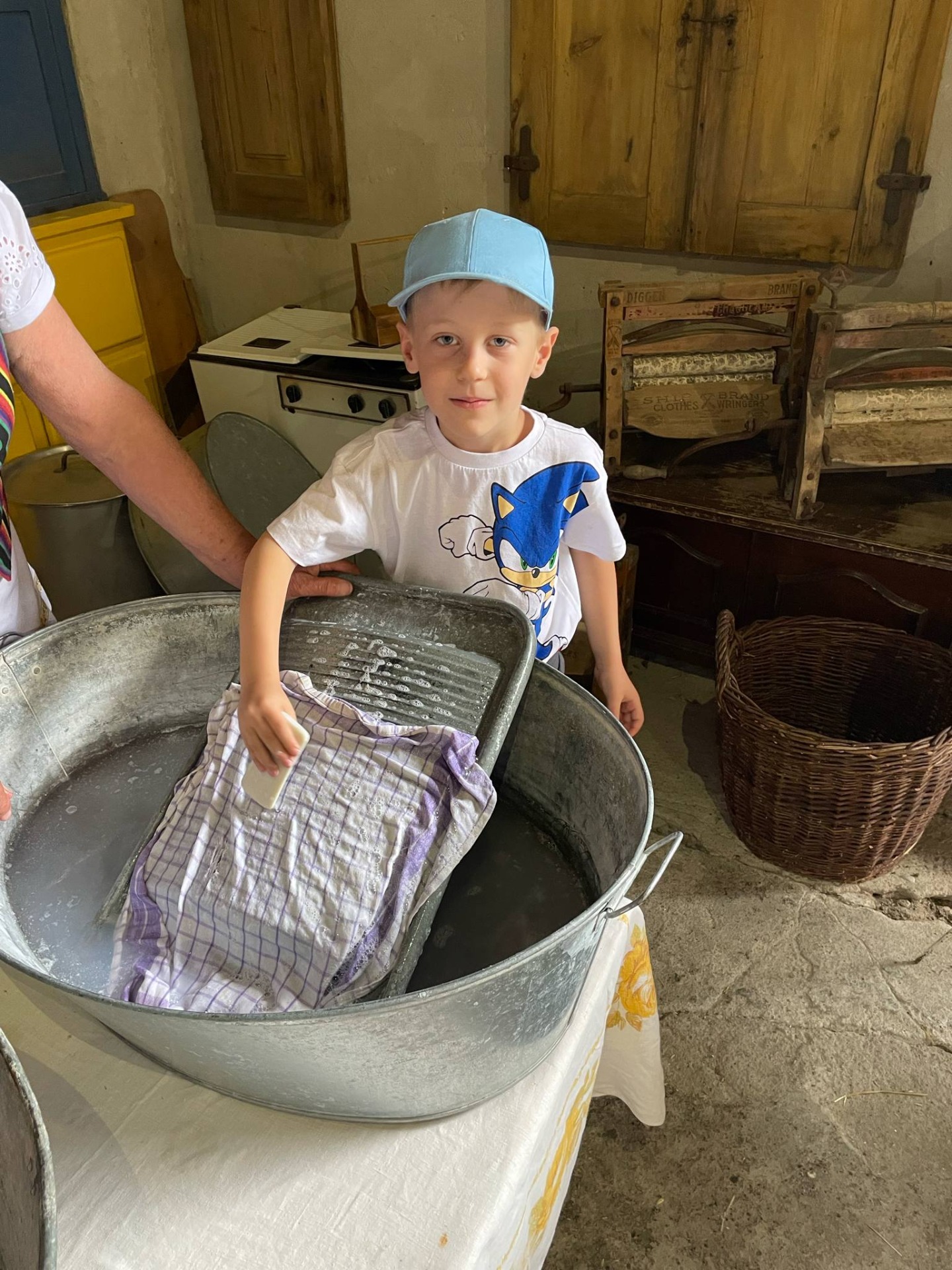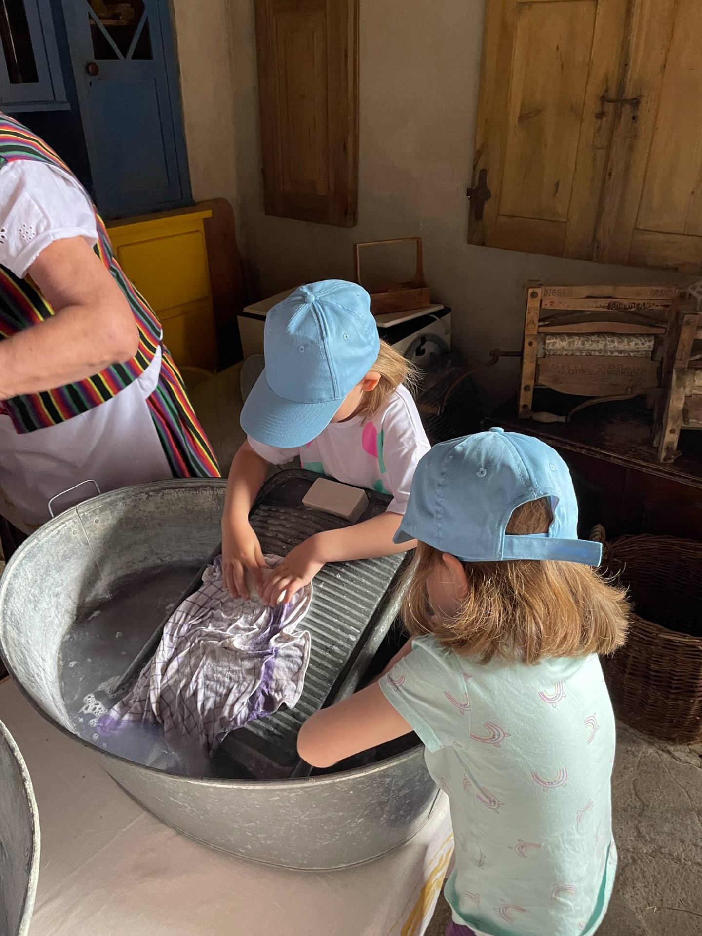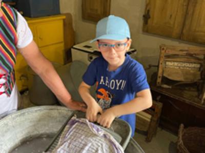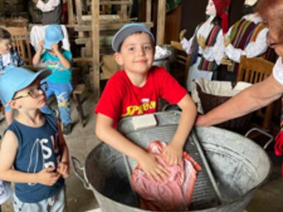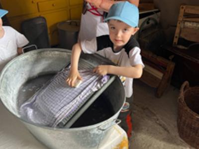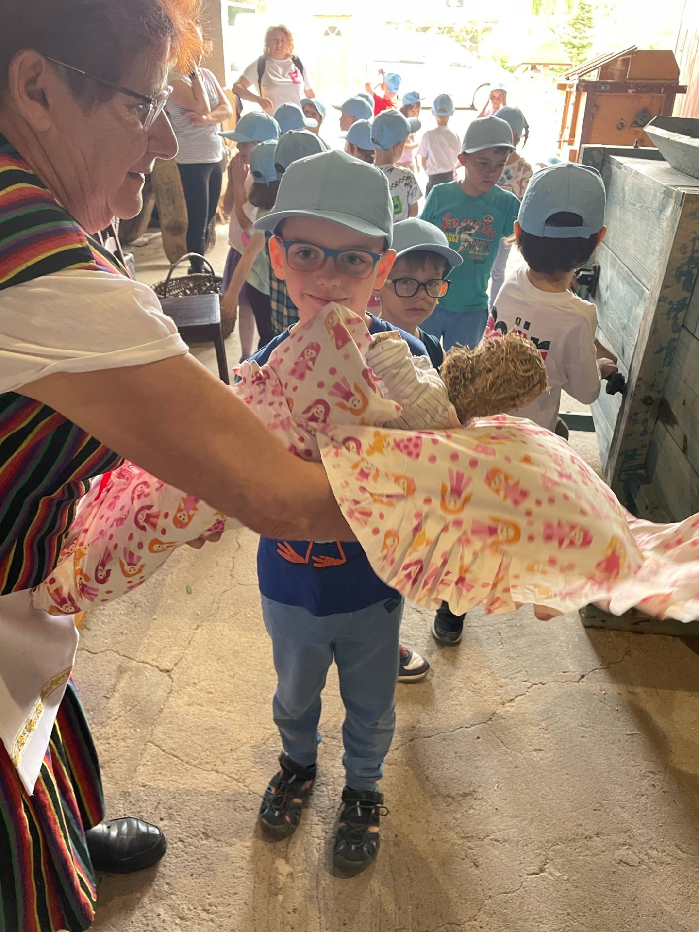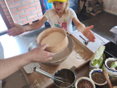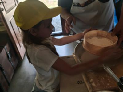 - zobaczyły jak żyli kiedyś rolnicy i mieszkańcy wsi, zwiedzając stodołę z maszynami i urządzeniami rolniczymi i wyposażeniem dawnej chałupy. Poznały sposoby zastosowania maszyn i upraw zboża ich rodzaje,, młocka cepami, warsztat tkacki - przędzenie na kołowrotku i tkanie na krosnach, pranie na tarze.