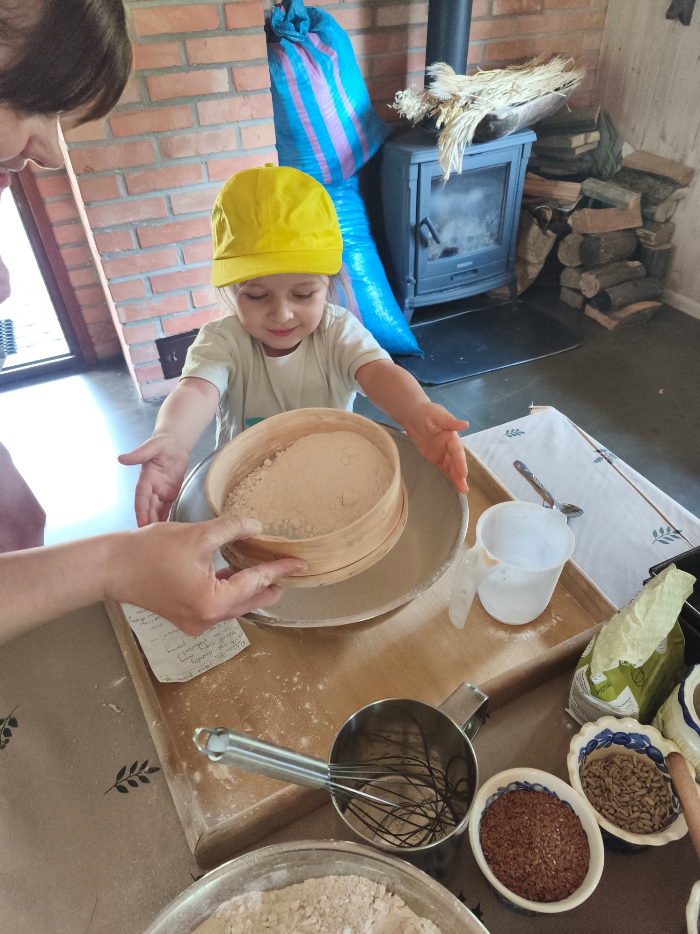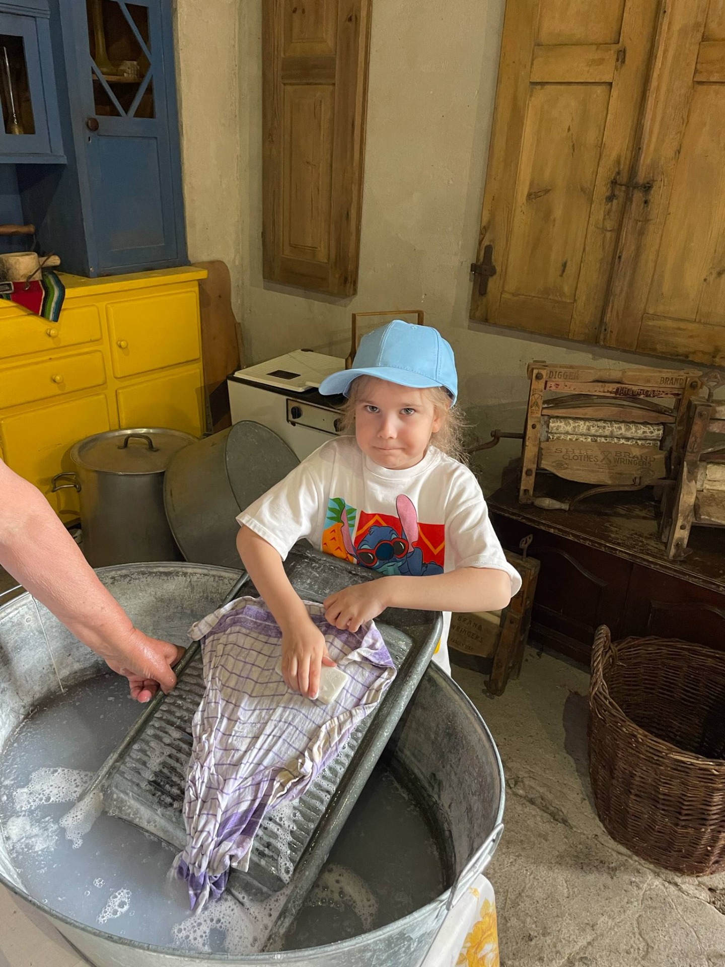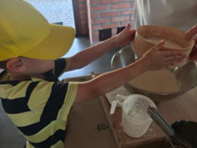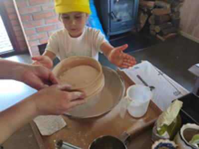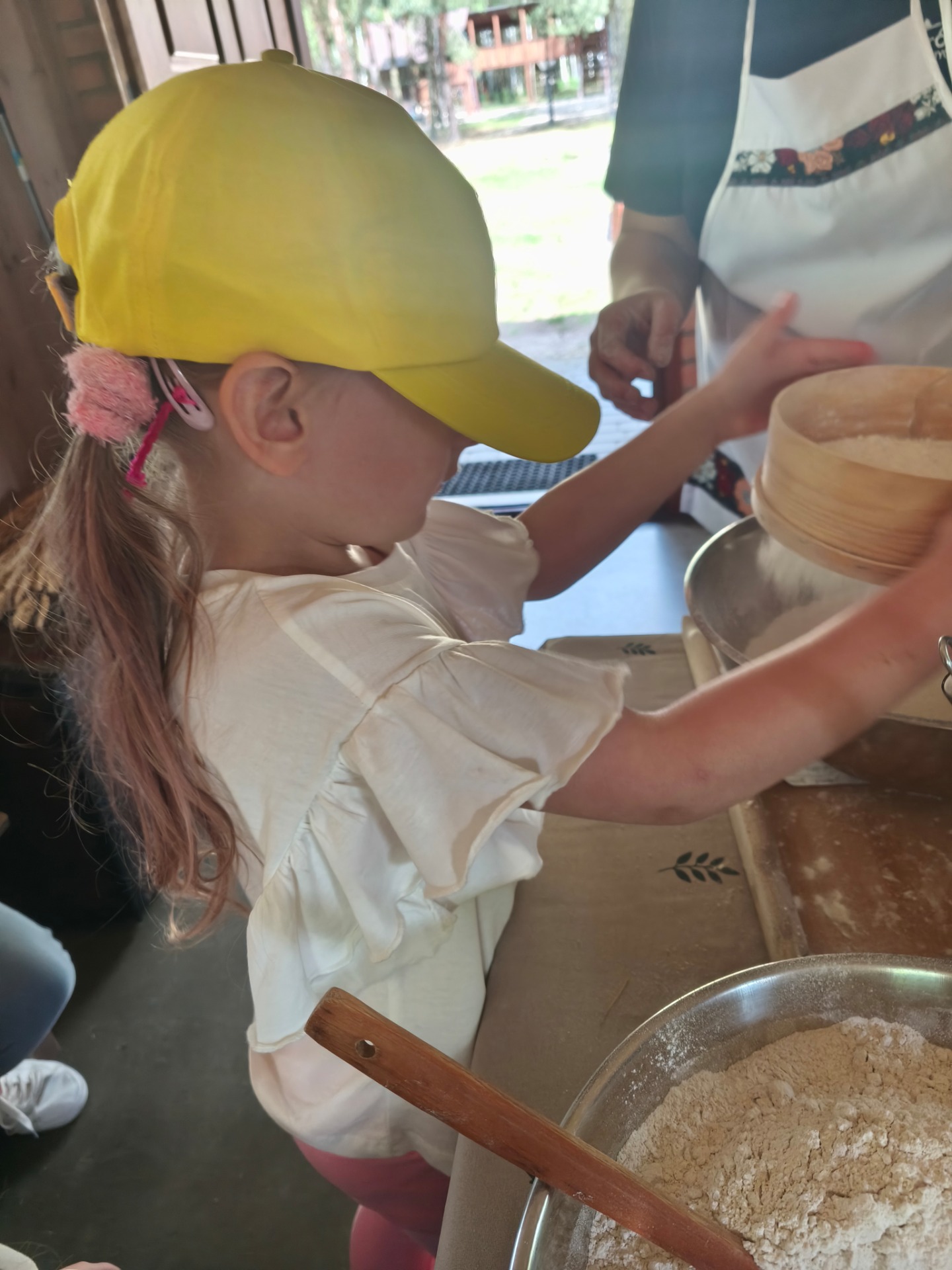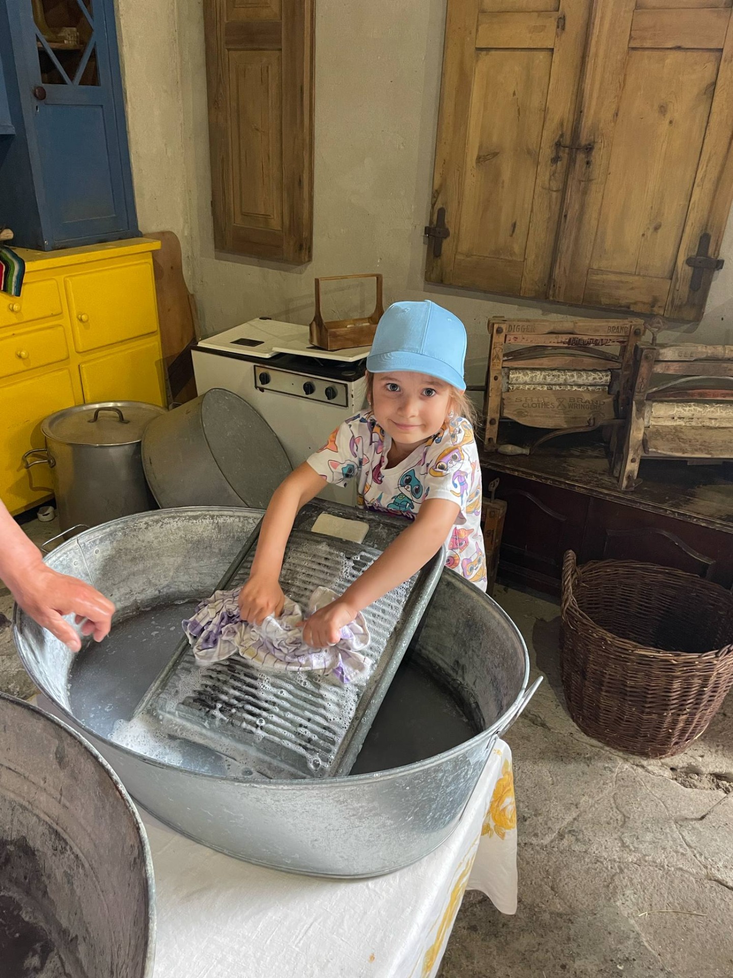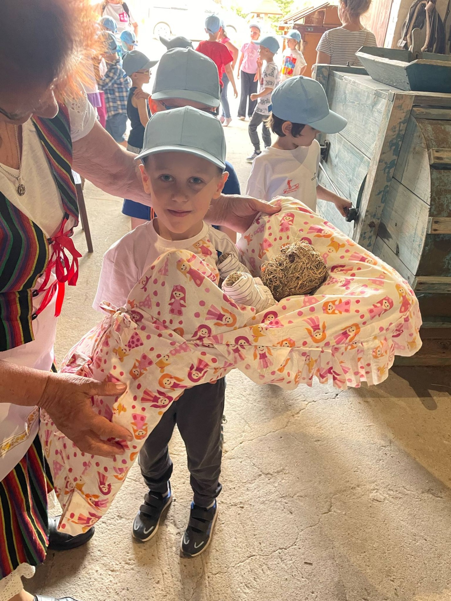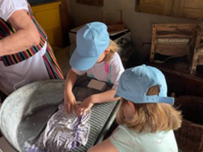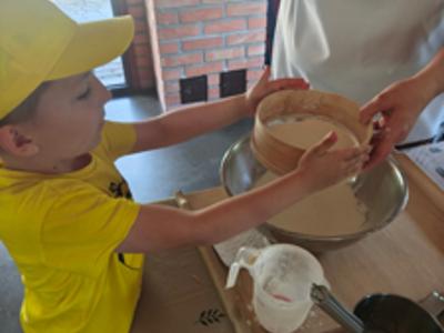 - zobaczyły jak żyli kiedyś rolnicy i mieszkańcy wsi, zwiedzając stodołę z maszynami i urządzeniami rolniczymi i wyposażeniem dawnej chałupy. Poznały sposoby zastosowania maszyn i upraw zboża ich rodzaje,, młocka cepami, warsztat tkacki - przędzenie na kołowrotku i tkanie na krosnach, pranie na tarze.