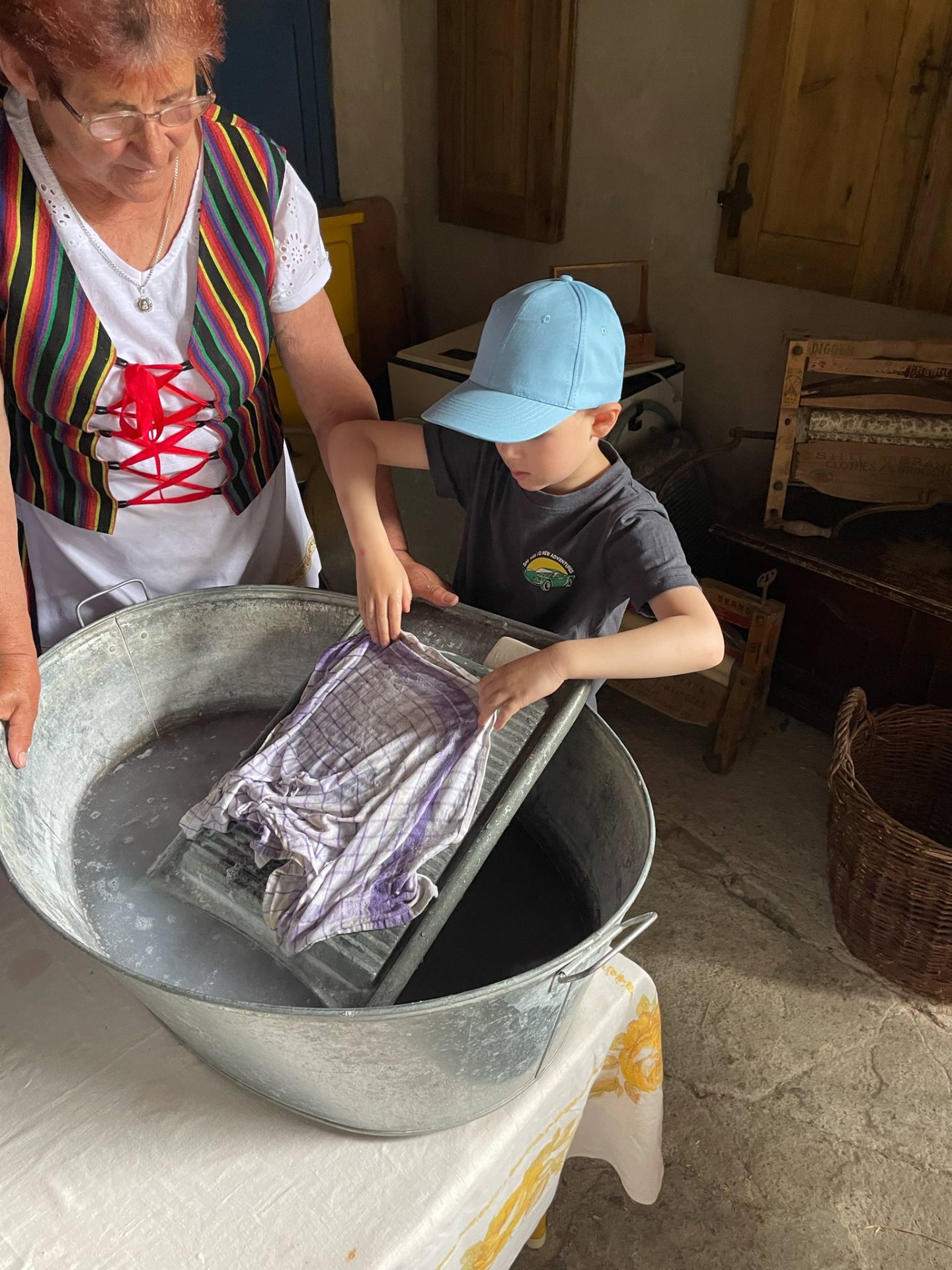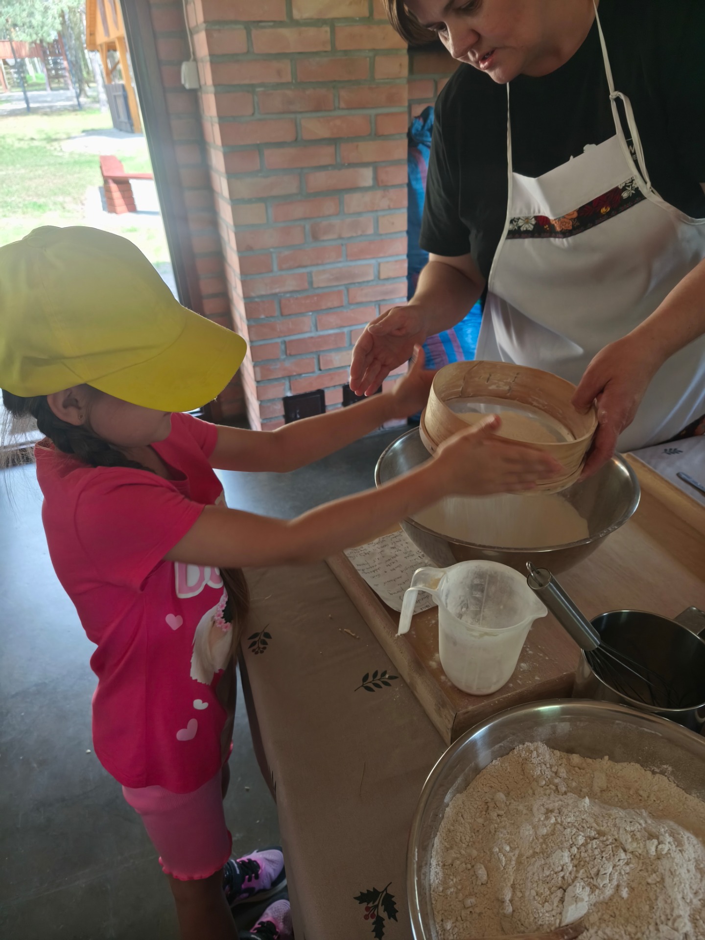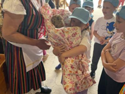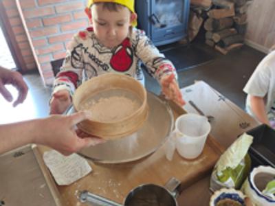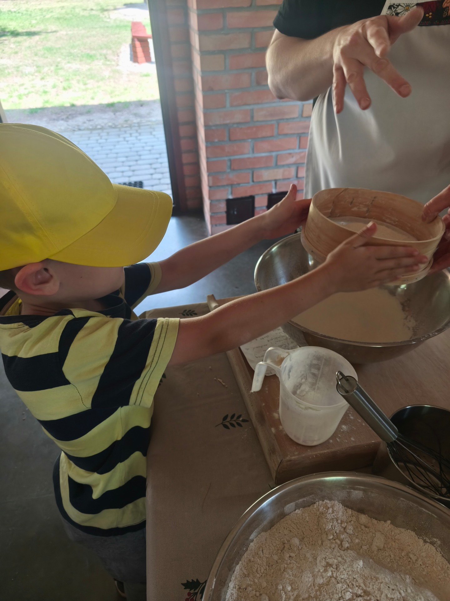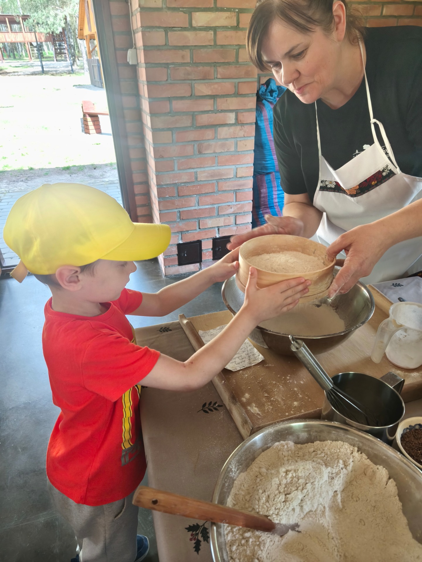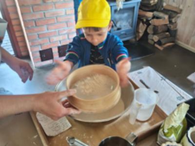 - zobaczyły jak żyli kiedyś rolnicy i mieszkańcy wsi, zwiedzając stodołę z maszynami i urządzeniami rolniczymi i wyposażeniem dawnej chałupy. Poznały sposoby zastosowania maszyn i upraw zboża ich rodzaje,, młocka cepami, warsztat tkacki - przędzenie na kołowrotku i tkanie na krosnach, pranie na tarze.