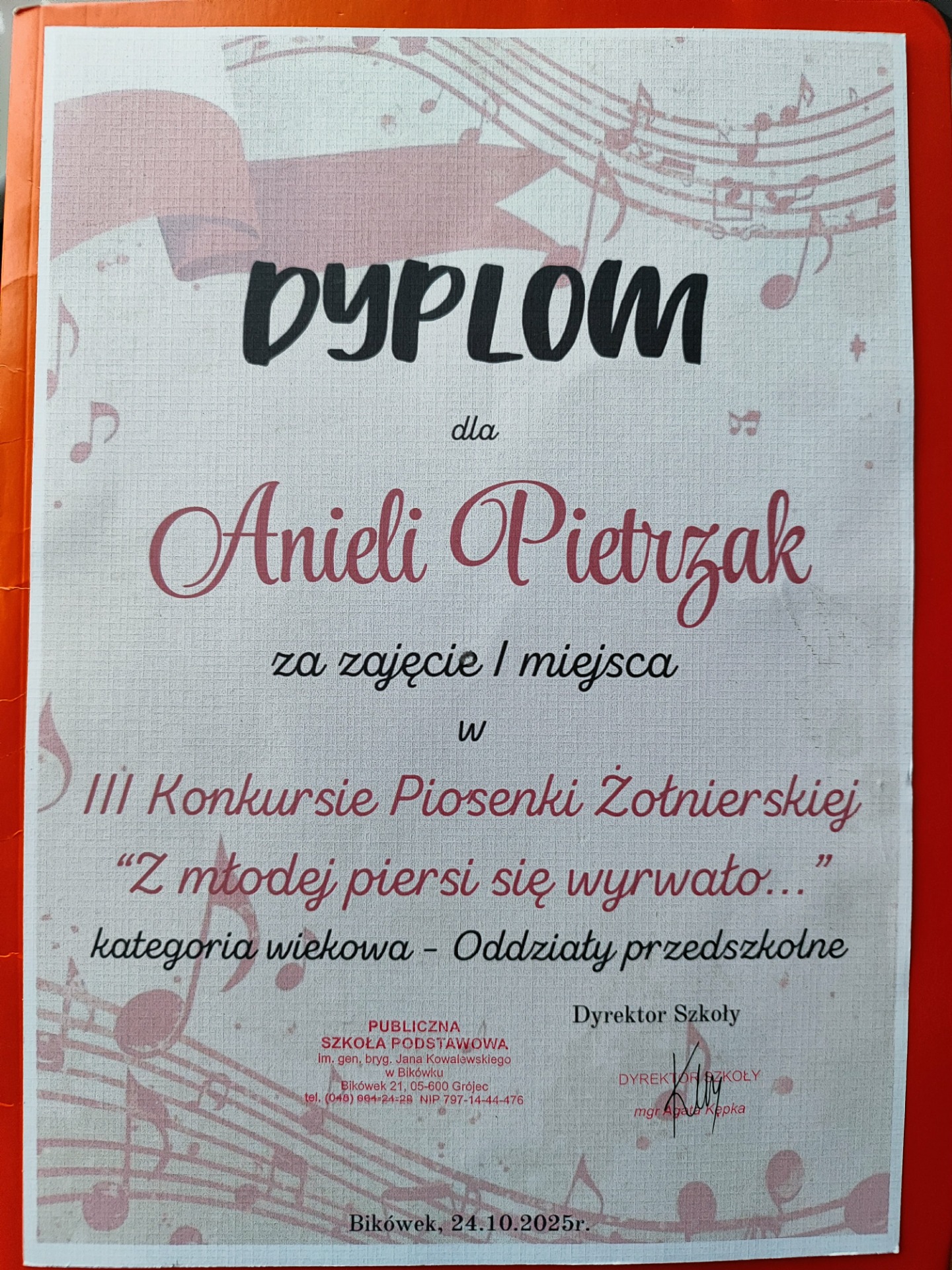 24 października 2025r. Aniela Pietrzak z grupy Myszki wzięła udział w koncercie laureatów III Konkursu Piosenki Żołnierskiej w PSP im. Generała Jana Kowalewskiego w Bikówku. Uroczystość ta była połączona ze świętem szkoły i patrona.
