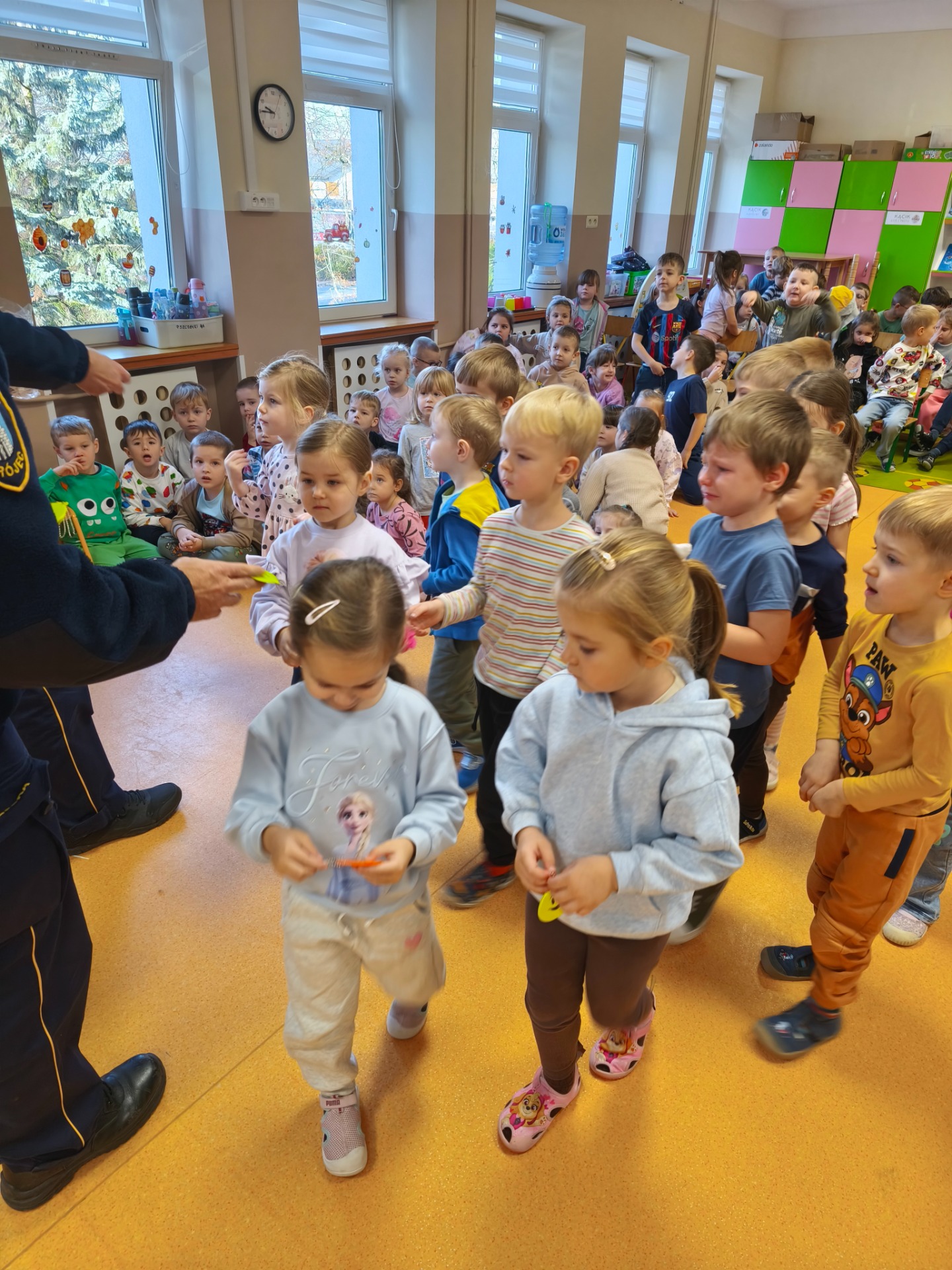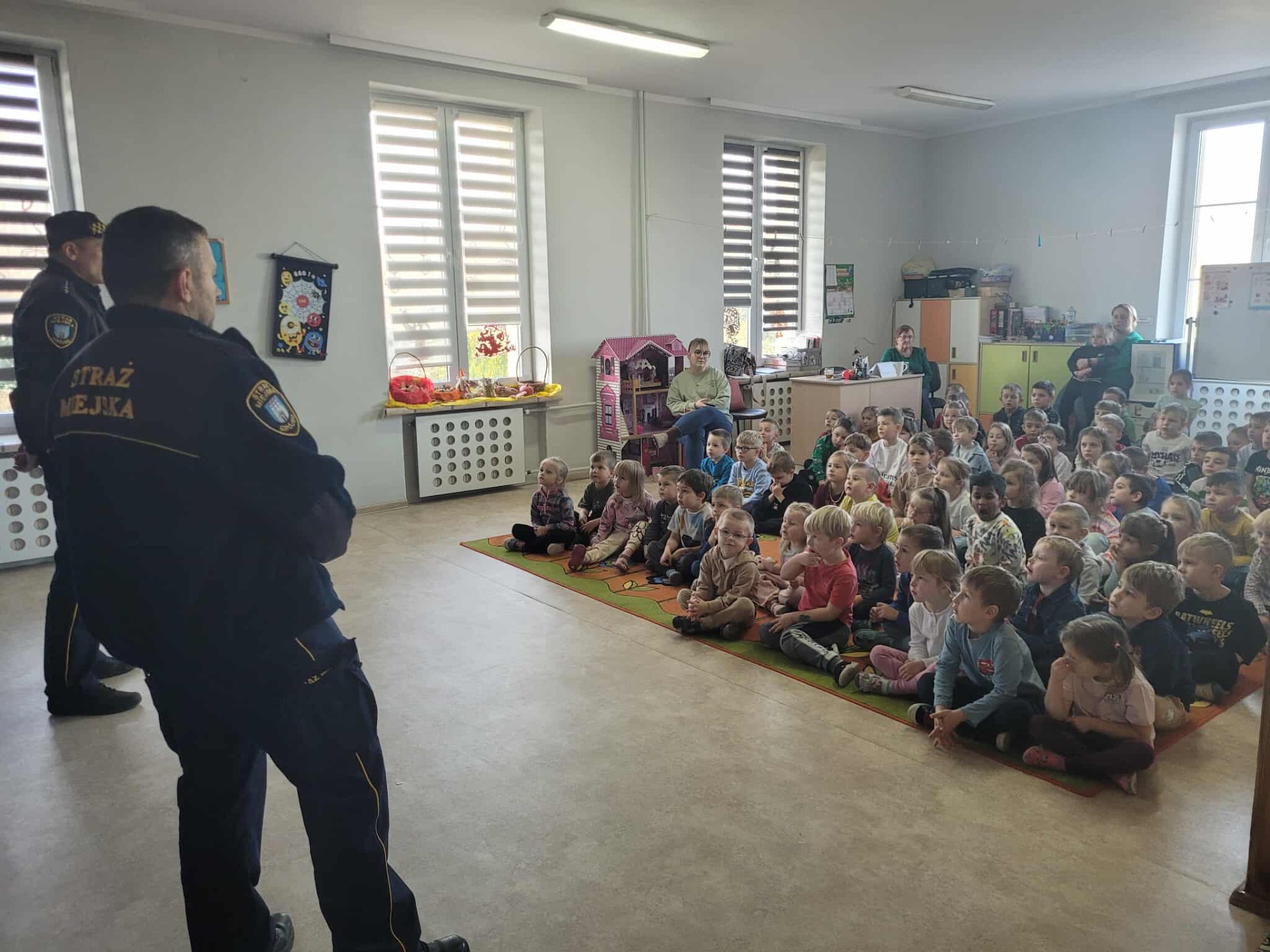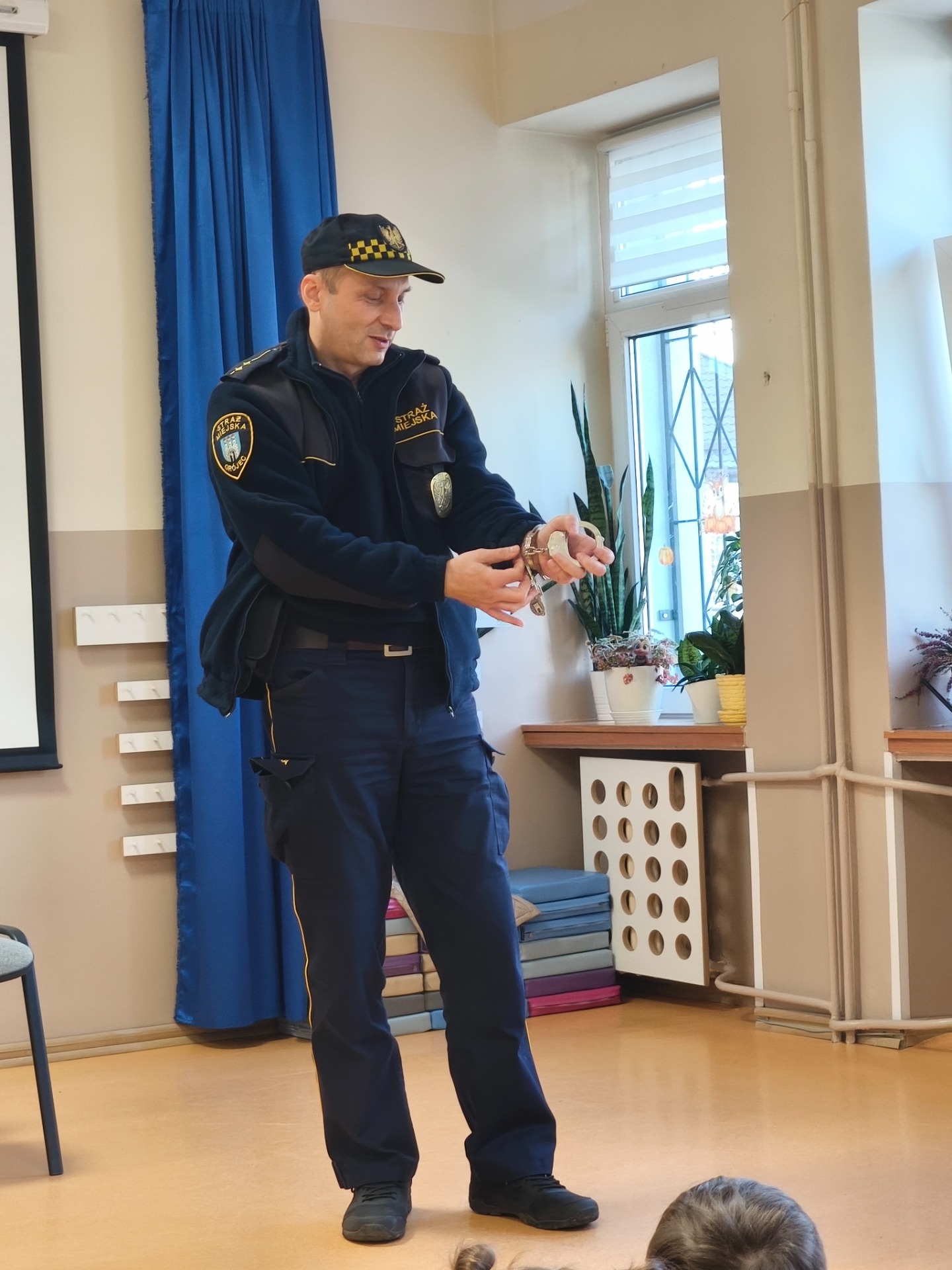 W dniu 13 listopada 2025 r. patrol Straży Miejskiej w Grójcu odwiedził nasze przedszkole . W ramach zajęć edukacyjnych przedszkolakom przybliżono zawód Strażnika Miejskiego. Tematem spotkania były również sprawy bezpiecznego poruszania się po drodze, jak ważny jest odblask na tornistrze lub odzieży. Omówiono zasady postępowania w przypadku spotkania obcego psa lub innych zwierząt. Przypomniane zostały numery alarmowe do poszczególnych służb. Przeprowadzona pogadanka cieszyła się dużym zainteresowaniem i zaangażowaniem dzieci.