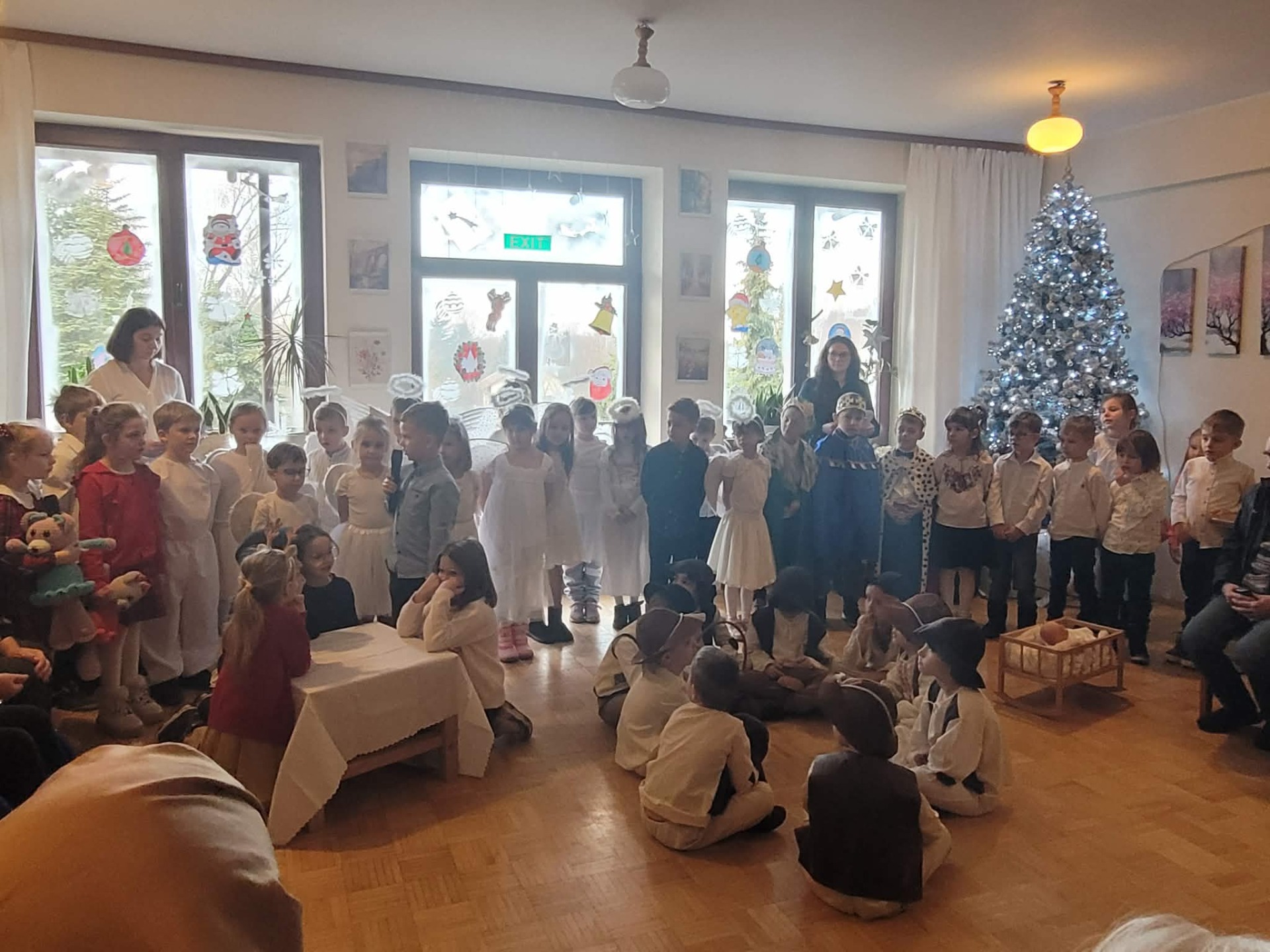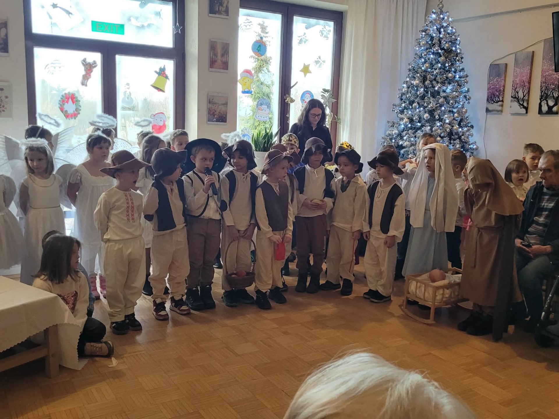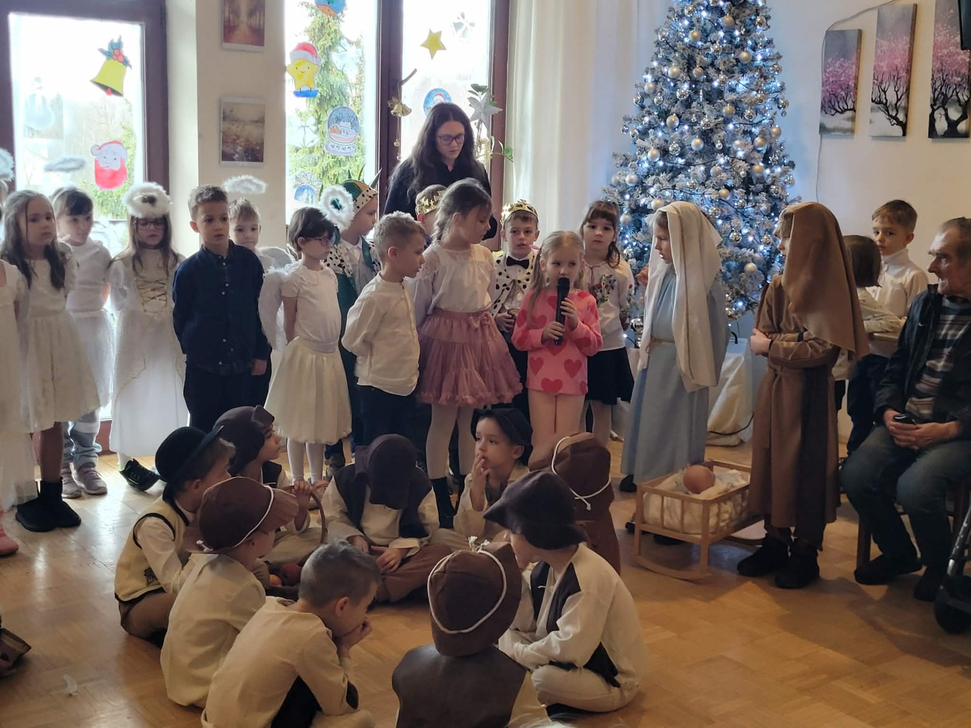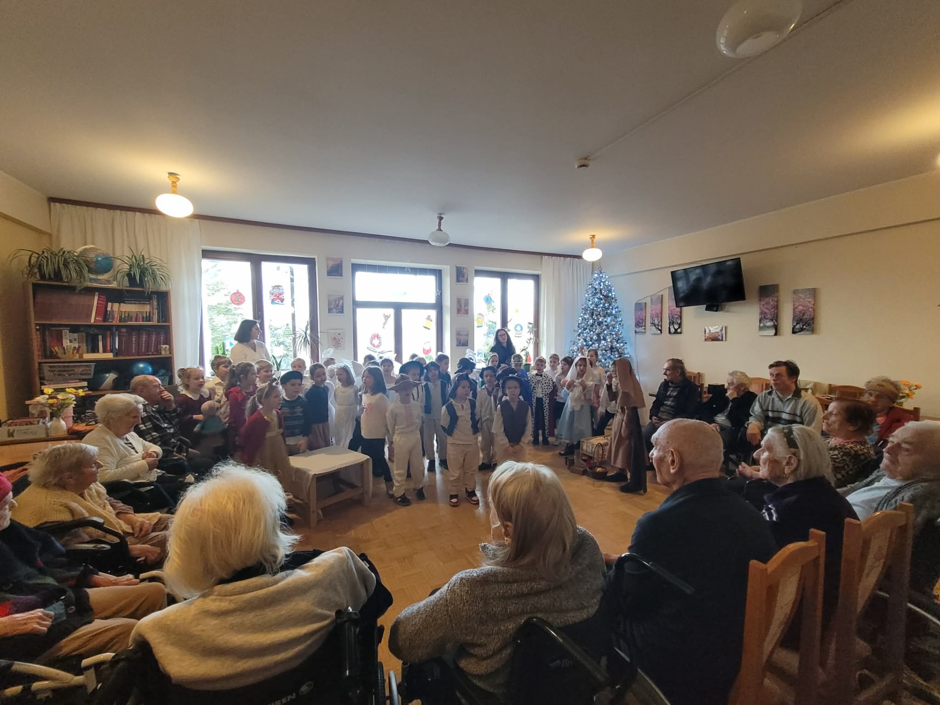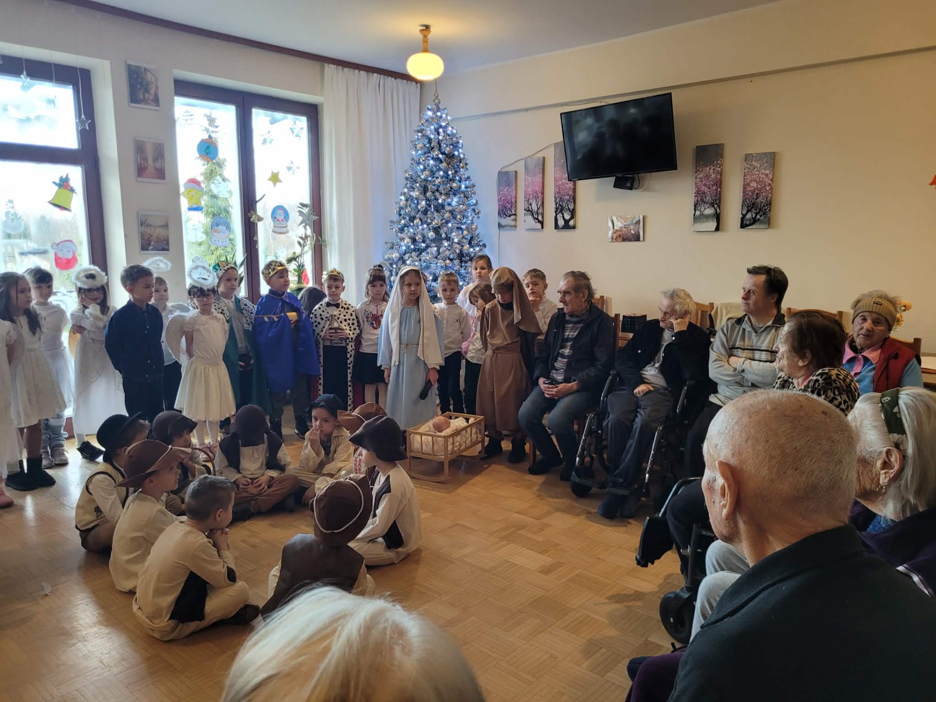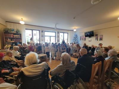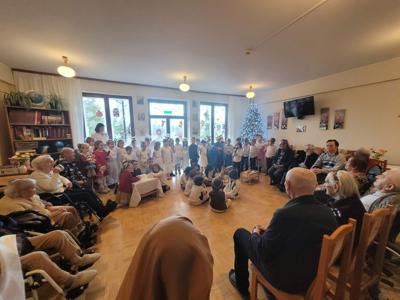 „W dniu dzisiejszym grupa Myszek i Słoneczek zaprezentowała jasełka dla pensjonariuszy Domu Opieki. Występ był pełen wzruszeń i świątecznej atmosfery, a mali artyści zostali nagrodzeni ciepłym przyjęciem i uśmiechami publiczności.”