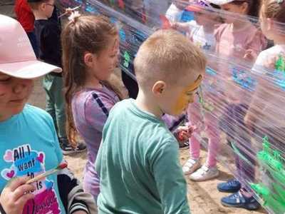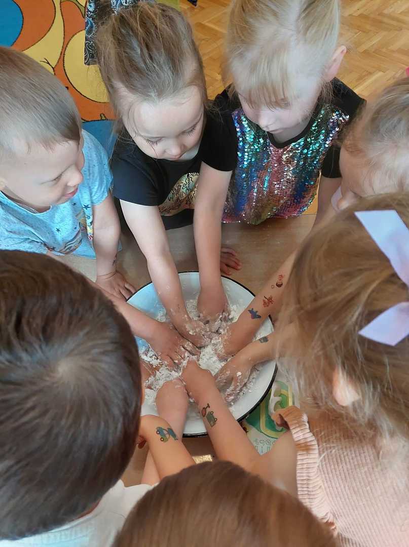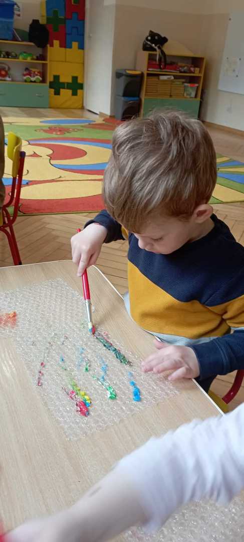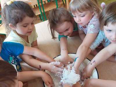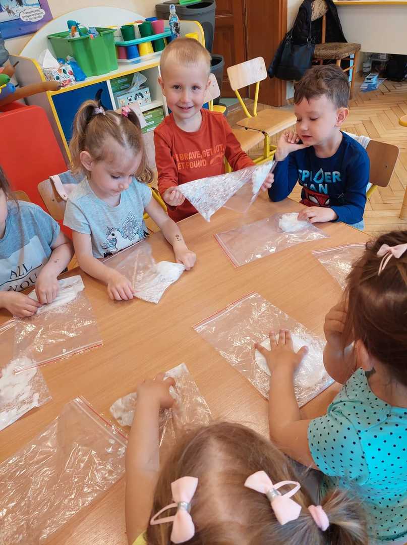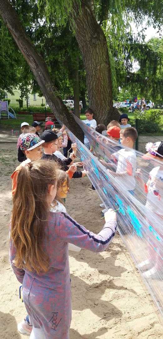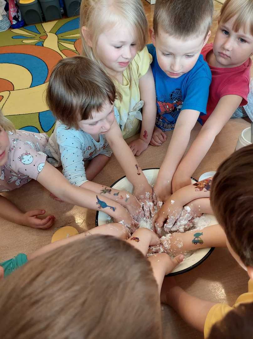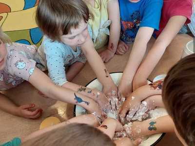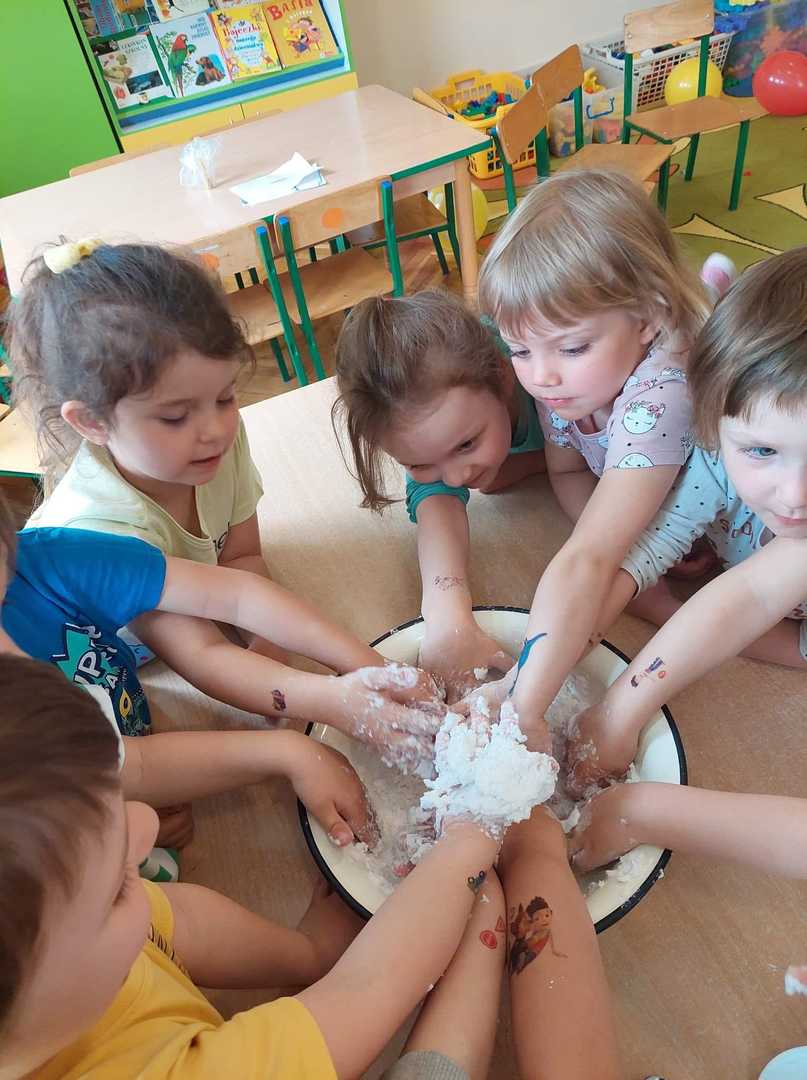 Dzieci bawiły się różnymi masami plastycznymi, tworzyły gniotki, biżuterię, jadły watę cukrową, bawiły się przy muzyce w sali, malowali buziaki, a jak pogoda pozwoliła malowali farbami na placu przedszkolnym i wiele innych