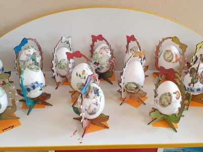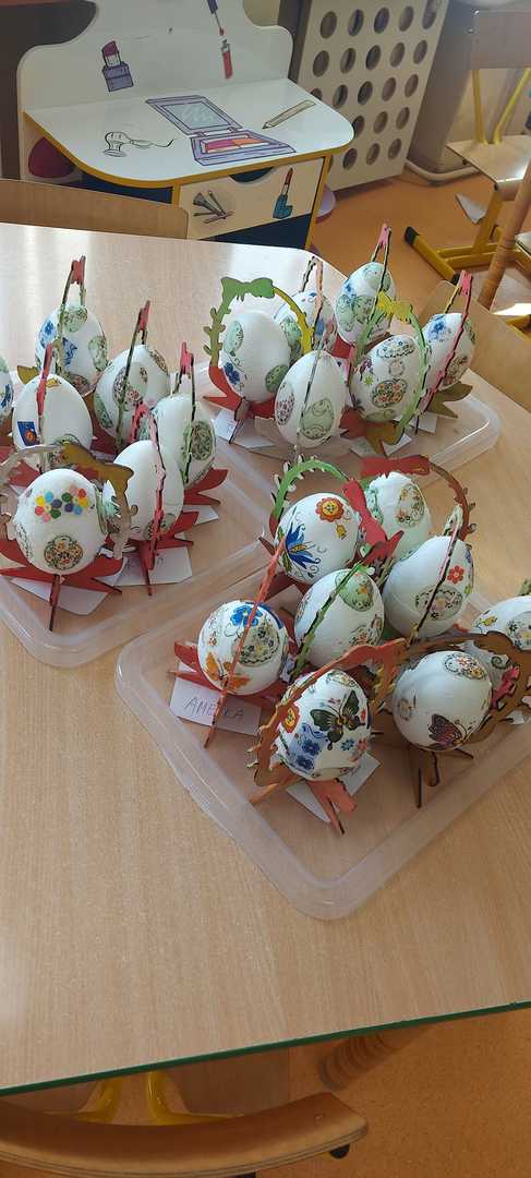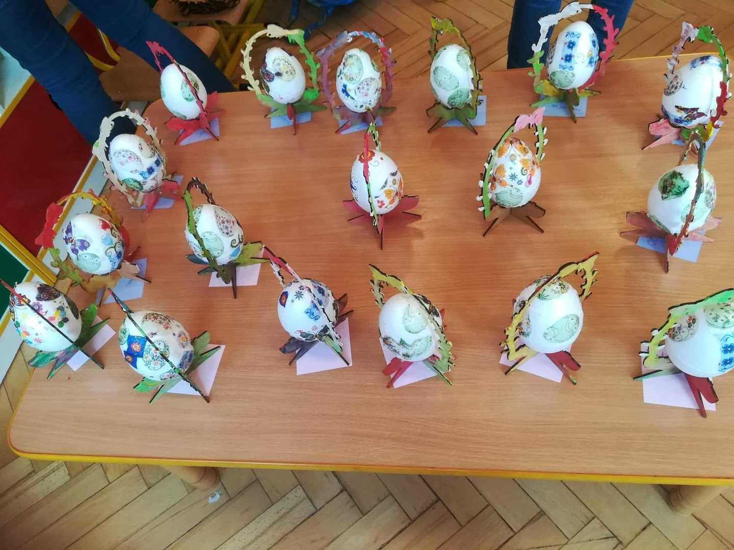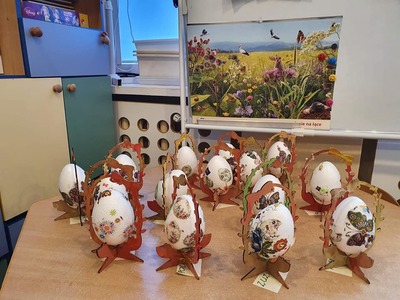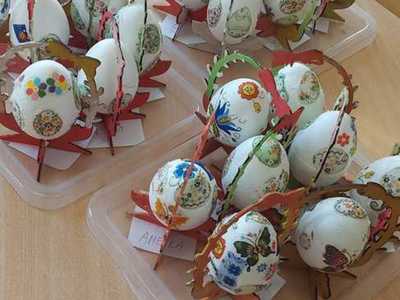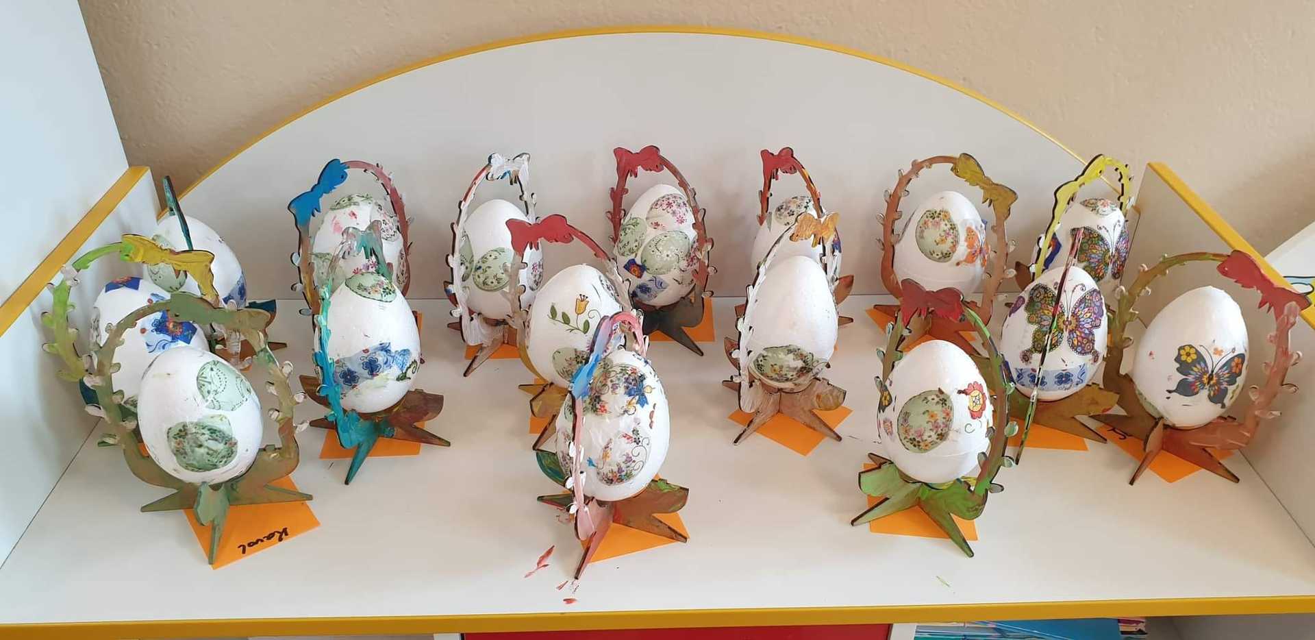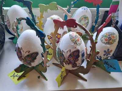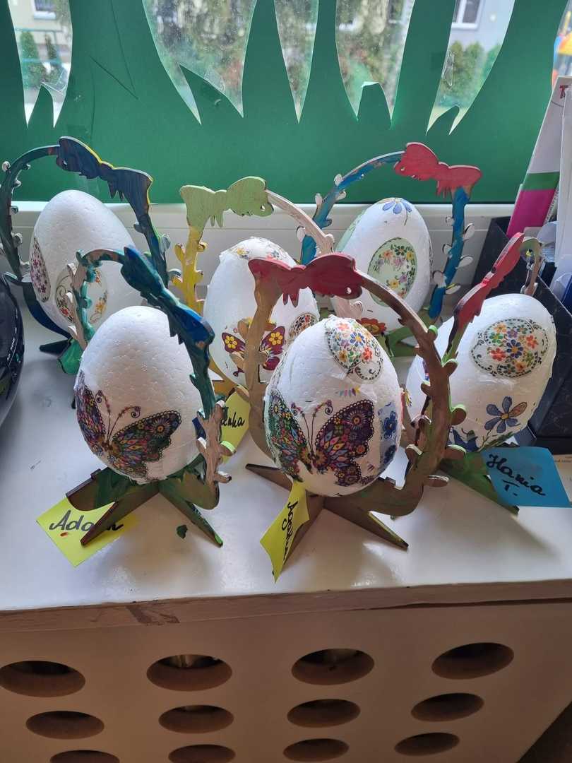 Powsta艂y pi臋knie pomalowane drewniane stela偶e na pisanki, które dzieci ozdobi艂y technik膮 decoupage