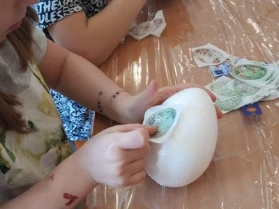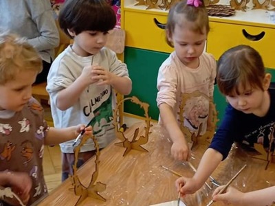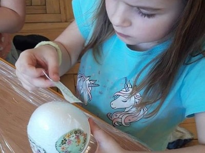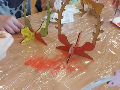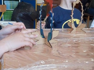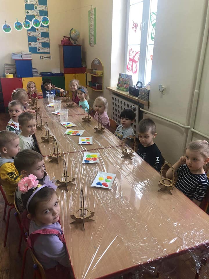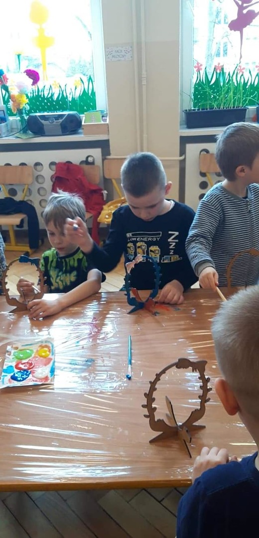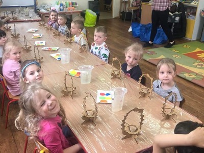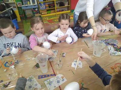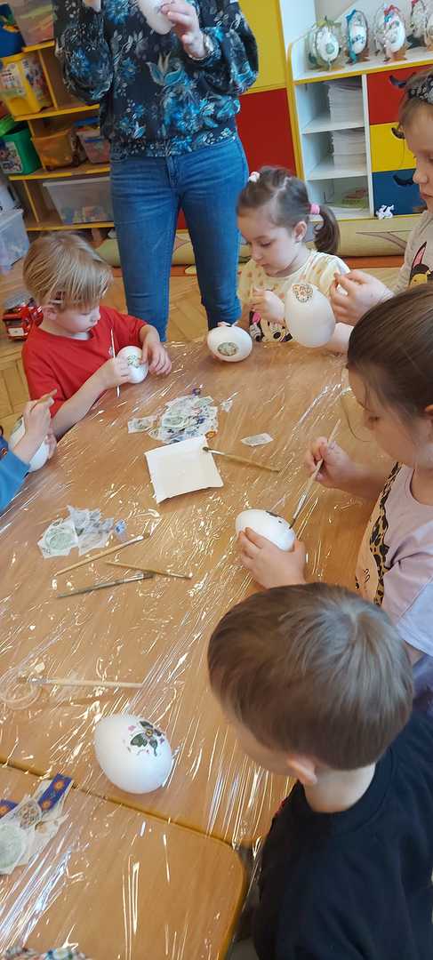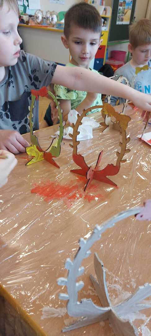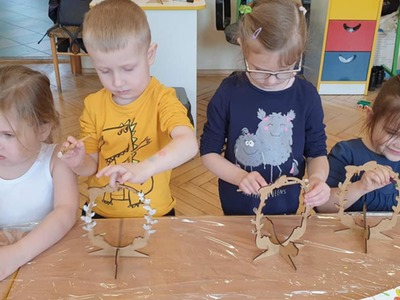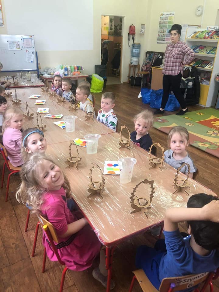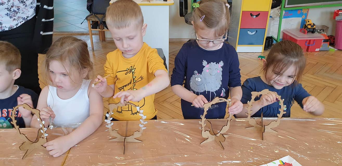 Powsta艂y pi臋knie pomalowane drewniane stela偶e na pisanki, które dzieci ozdobi艂y technik膮 decoupage