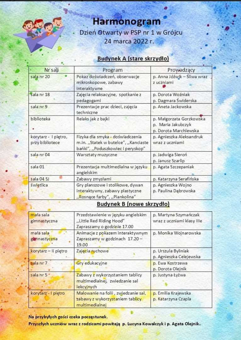 Harmonogram Dnia Otwartego w Publicznej Szkole Podstawowej nr1.