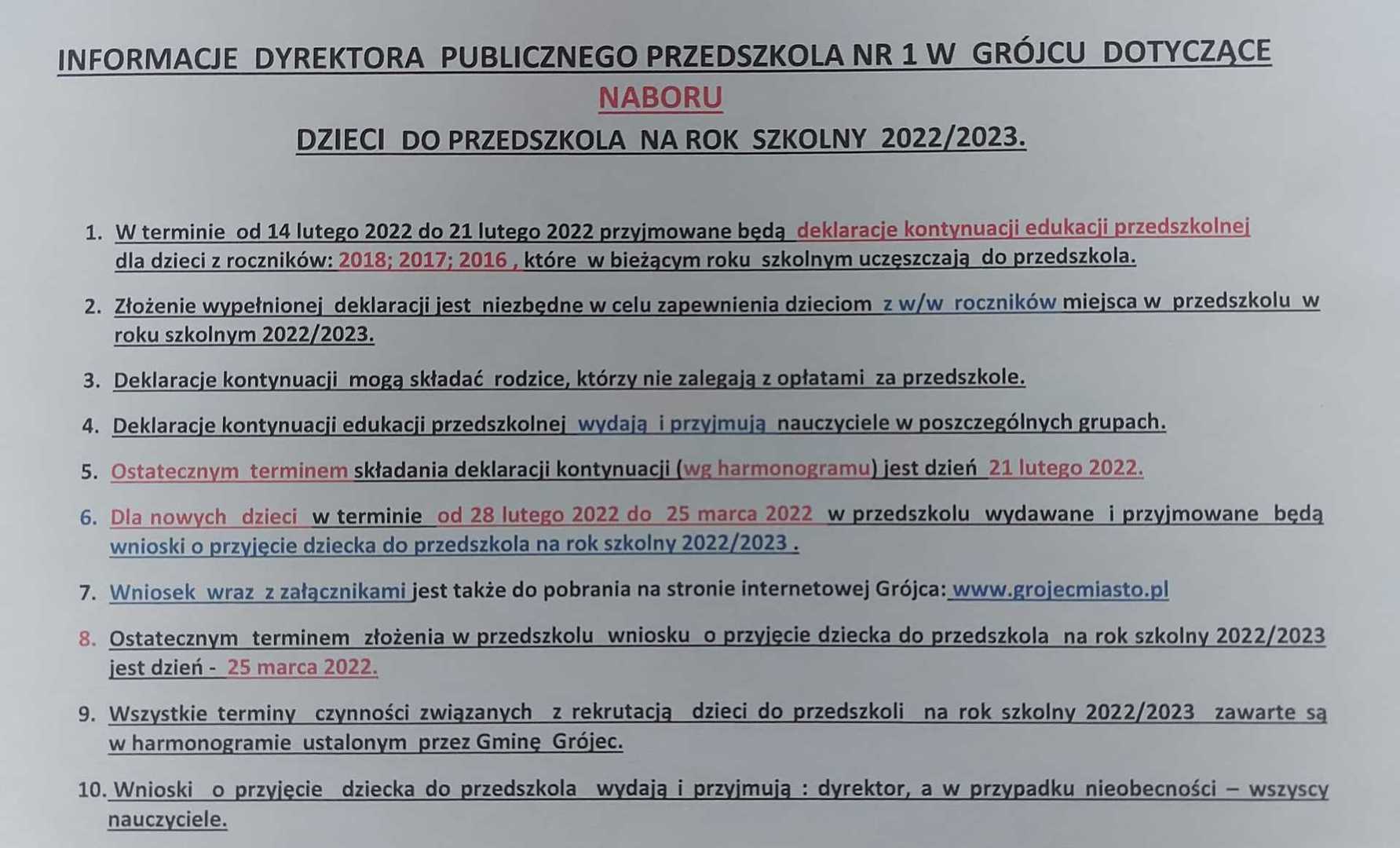 INFORMACJA DYREKTORA DOTYCZĄCA REKRUTACJI NA ROK SZKOLNY 2022/2023
