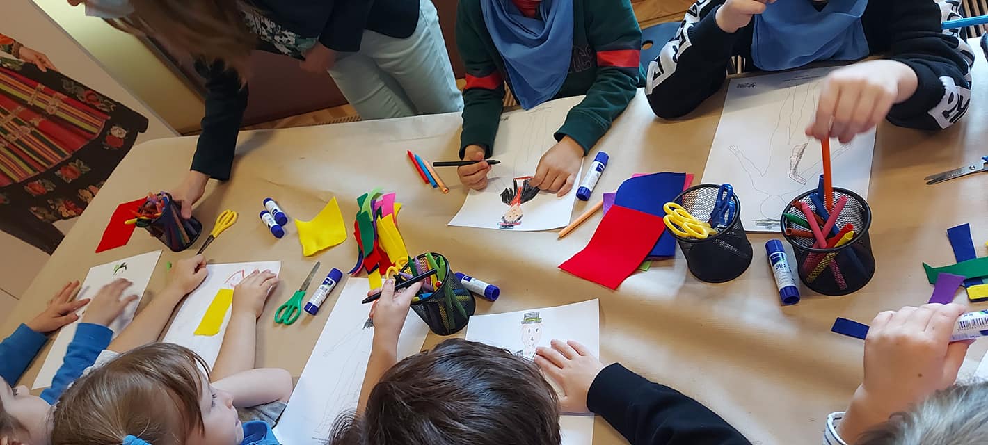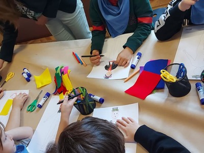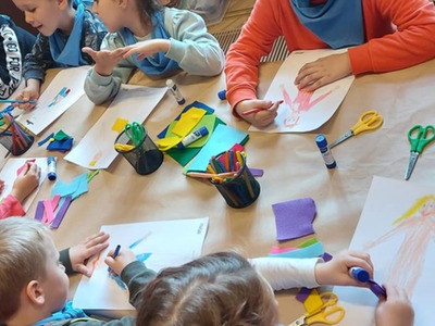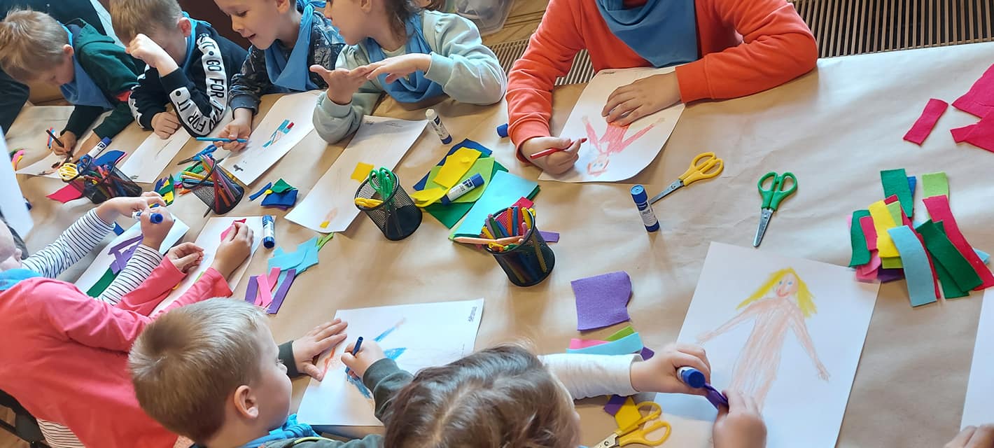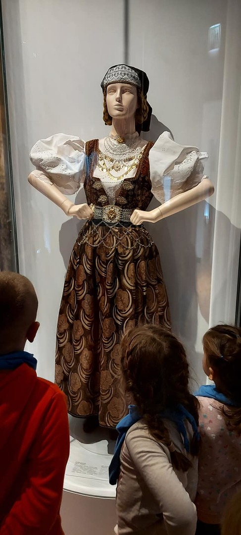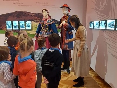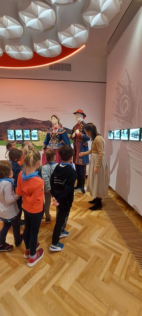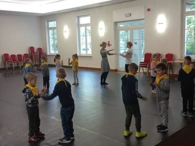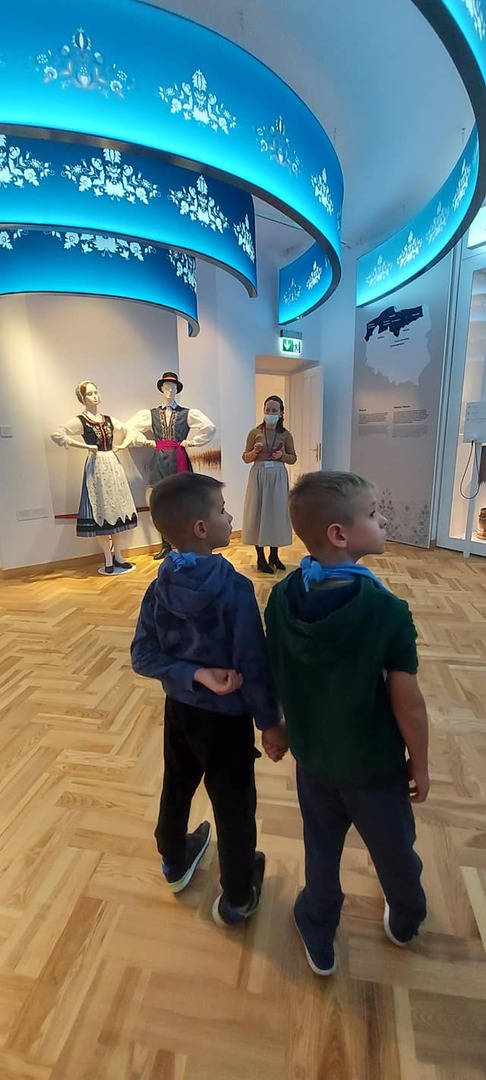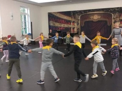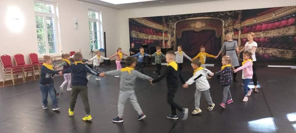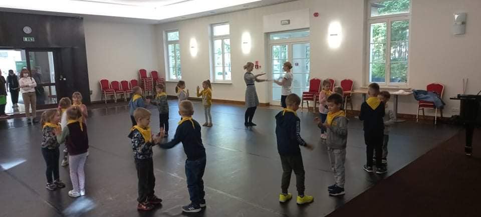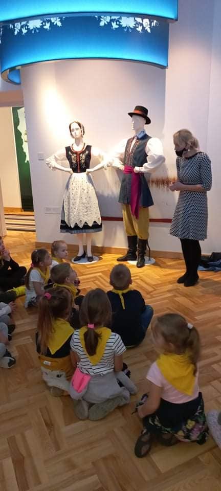 Dzieci z zafascynowaniem podziwiały przepiękne stroje ludowe z różnych regionów Polski. Następnie wszyscy brali udział w warsztatach tanecznych