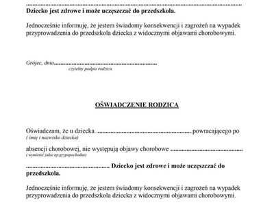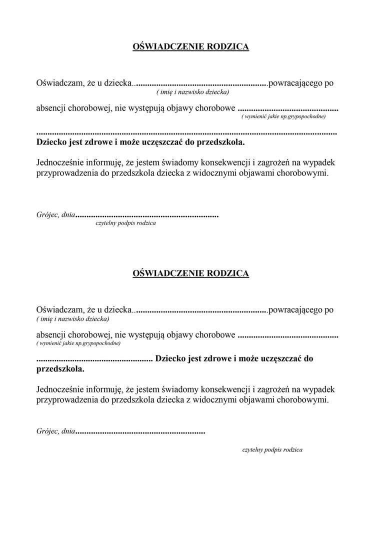 Drodzy Rodzice, oświadczenie dotyczące przyprowadzania zdrowego dziecka do przedszkola wypełniamy codziennie i przynosimy rano. Drugi dokument przynosimy po nieobecności dziecka z powodu choroby.