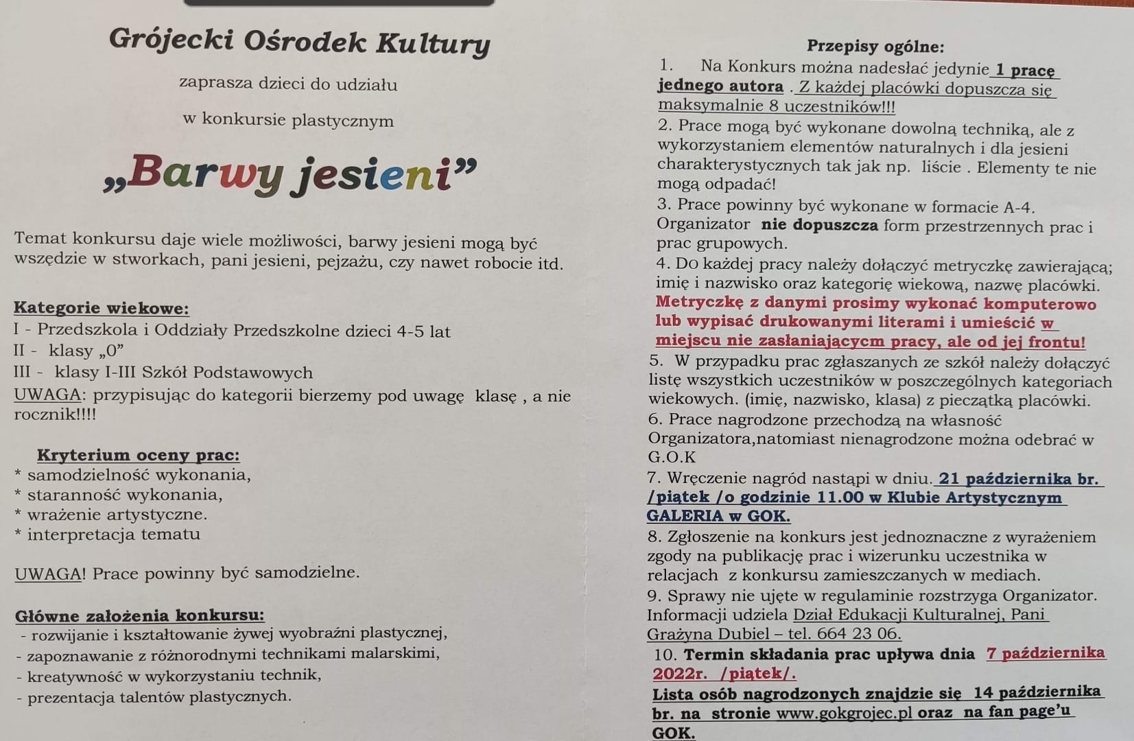 Informacje o konkursie plastycznym "Barwy Jesieni"